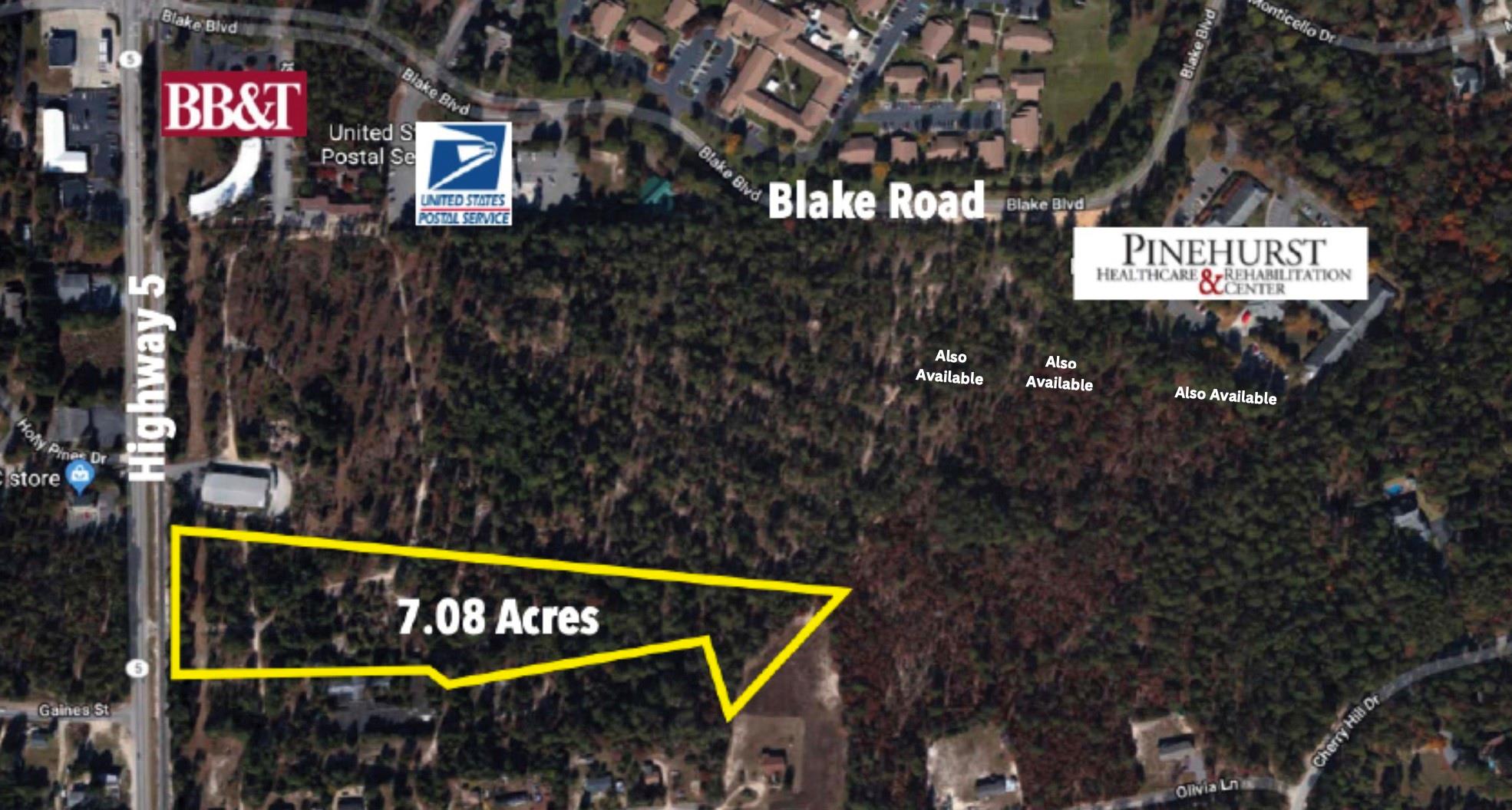 +/- 7 ACRES Hwy 5 South and Blake Blvd. Zoned OP- Office Professional. Concept plan for 150 Unit Senior Apartment Development. Water and Sewer Available. Jurisdiction, EJT Pinehurst. One mile from Pinehurst Resort and close to the "Village of Pinehurst". Pinehurst is home to the US Open Championship golf tournament and major equestrian events and has been ranked among the Top 5 Best Places to Retire in NC.