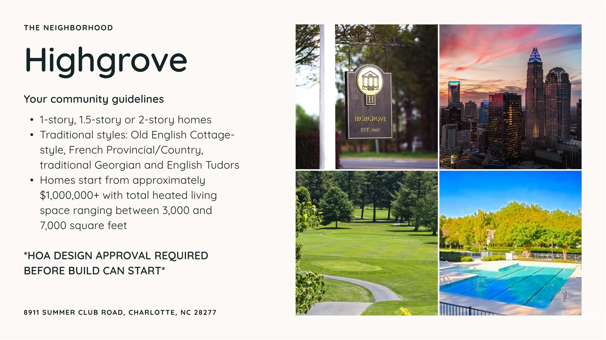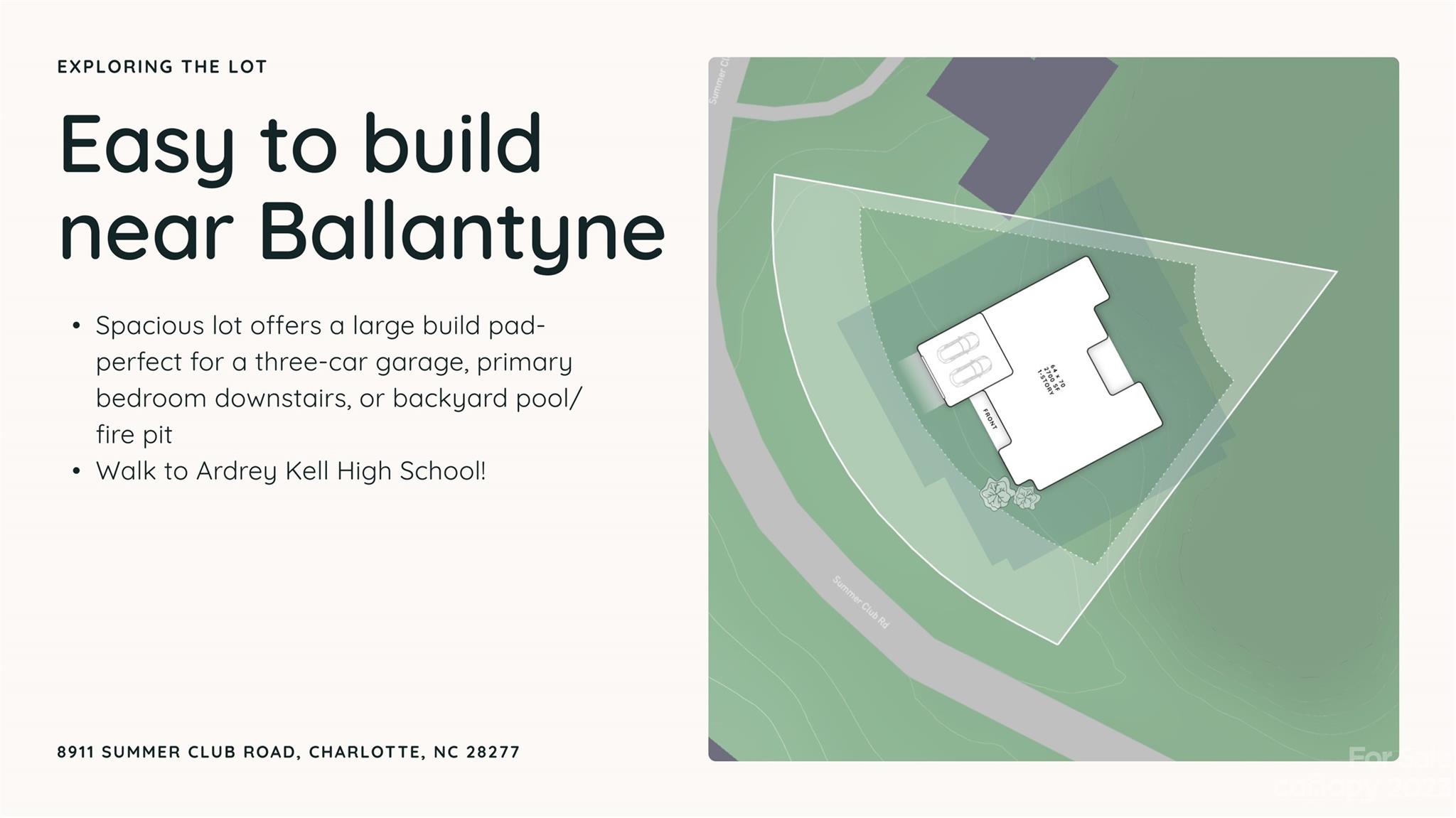 Once in a lifetime opportunity to design your custom-build on this spacious .41 acre lot in desirable Highgrove! You will love the convenience of Ballantyne living–walk to Ardrey Kell High School. Pie-shaped corner lot offers a large build box with plenty of usable backyard. Our schematic Design Process allows you to create a fully custom floor plan to your exact needs, taking into account the lot-specific constraints and HOA architectural guidelines. Your floor plan and selections will determine final pricing. Buyer will need to purchase the lot and use a construction to perm loan during the build. Estimated project time is approx. 18 months. *All elevations & plans must be approved by ARC. Elevation photo is for inspiration purposes only.*