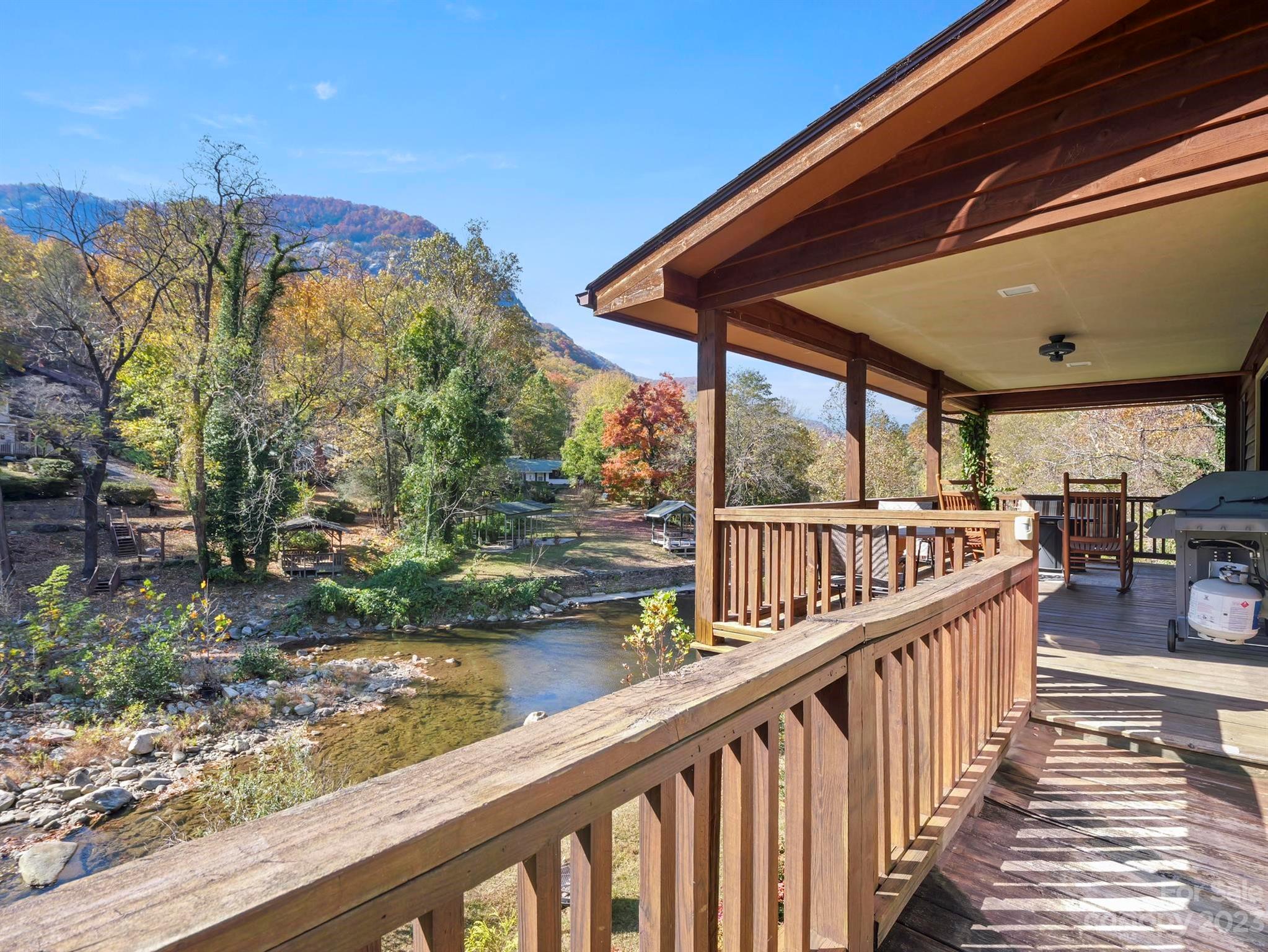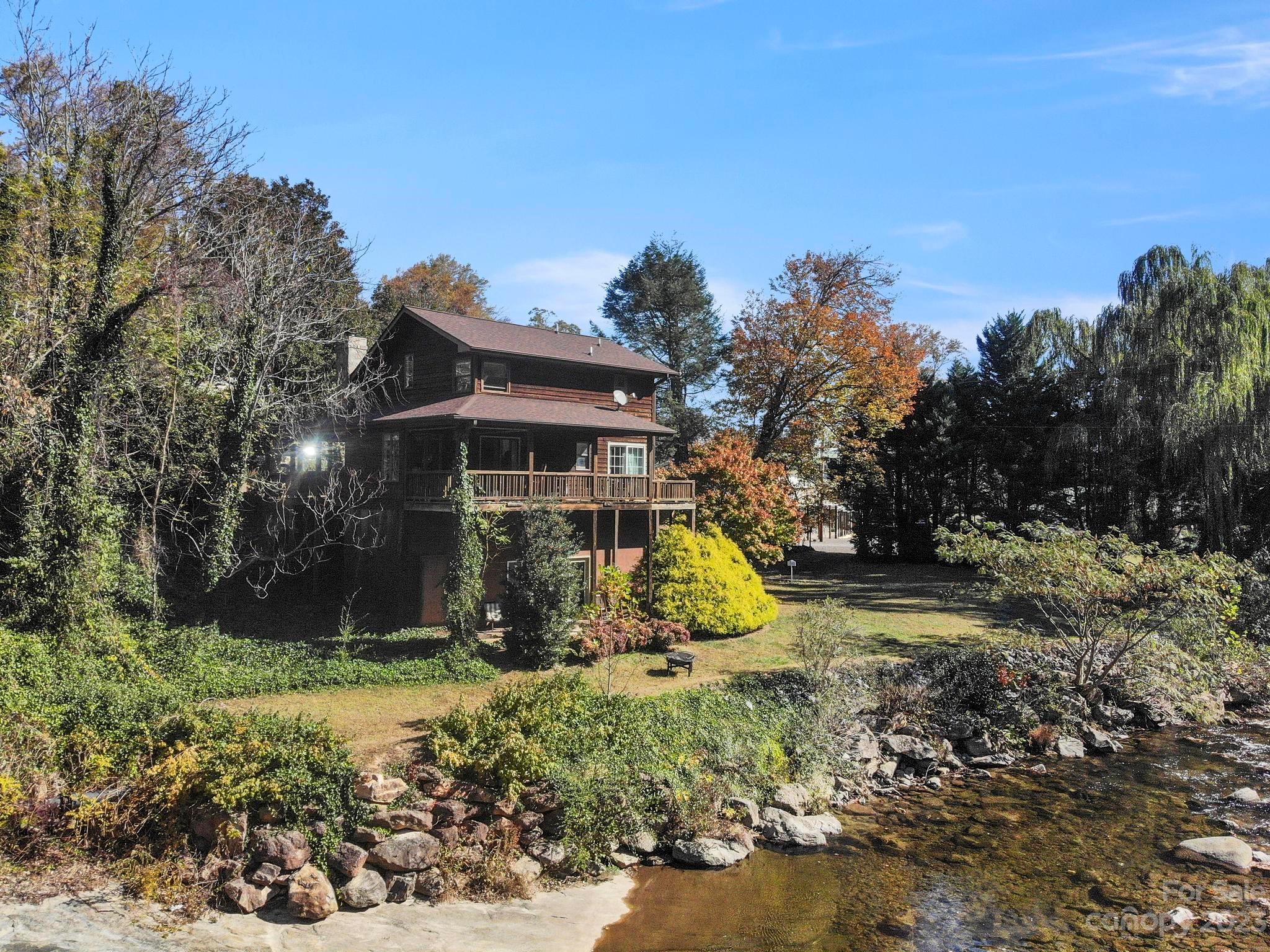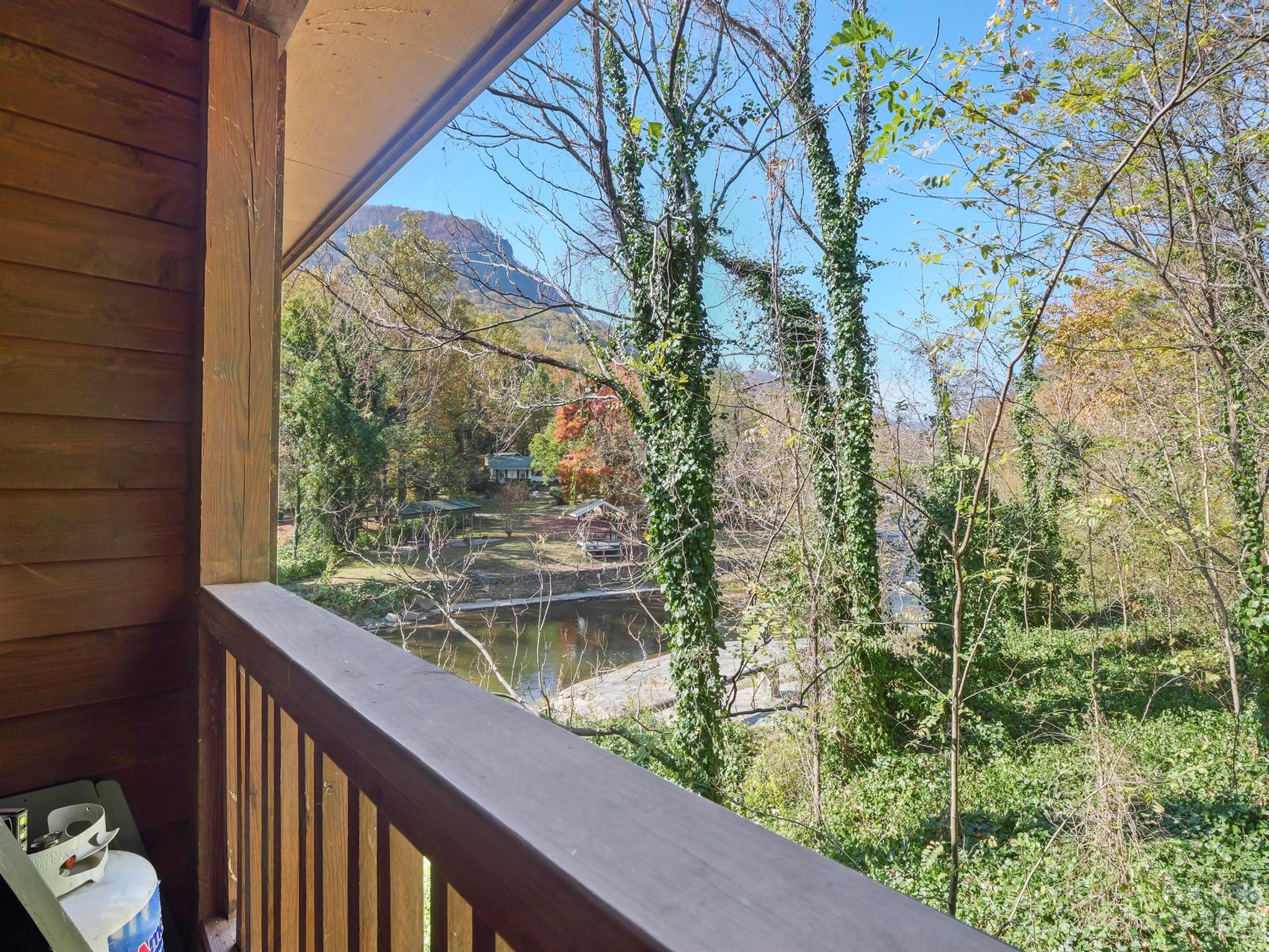 Income producing property w/ 300 feet on the Rocky Broad River. Commercial or residential opportunities. Beautiful year-round views of Chimney Rock State Park on .74-acre with room on level ground for expansion or additional structures and parking. The main level has a primary BR, BA, kitchen, dining area, and 2-story great room w/ a wood burning stove. Upstairs is another BR and full BA, + a large office or flex space overlooking the living area. A lovely front porch wraps around the side of the home, and the expansive back deck overlooks the river. Separate living quarters in the finished basement is utilized as a short-term vacation rental with a family room, kitchenette, bedroom & full bathroom (gross income 2021 $38,672.50; 2022 $39,600.89; 2023 $34,985.38; 2024 to date $22,506.30). This property is in Lake Lure, and borders Chimney Rock Village. Right in the middle of all the action! By appointment only. Ample space for parking.