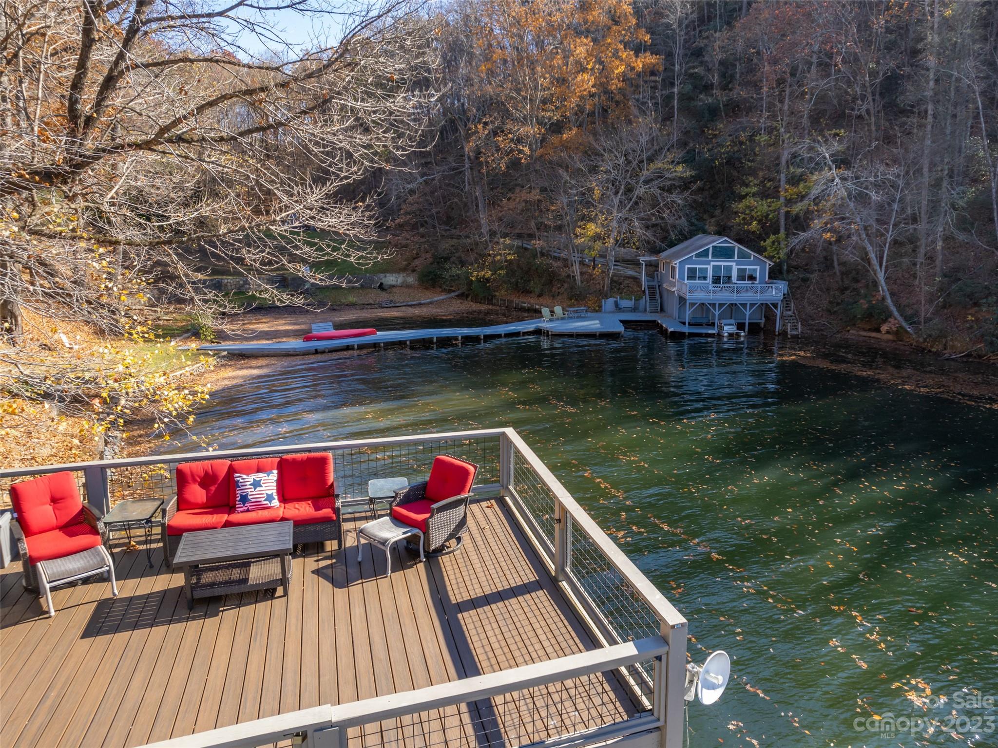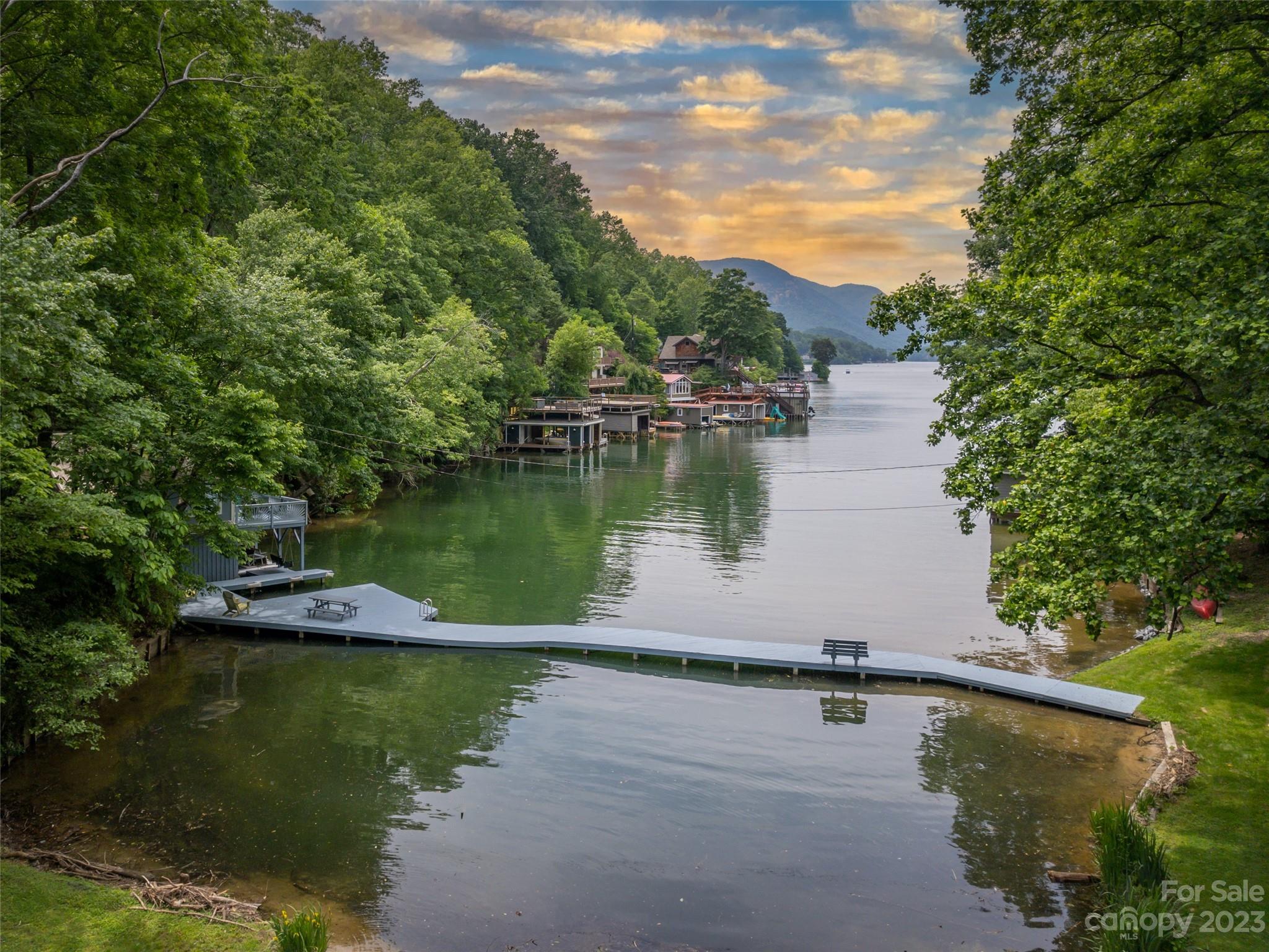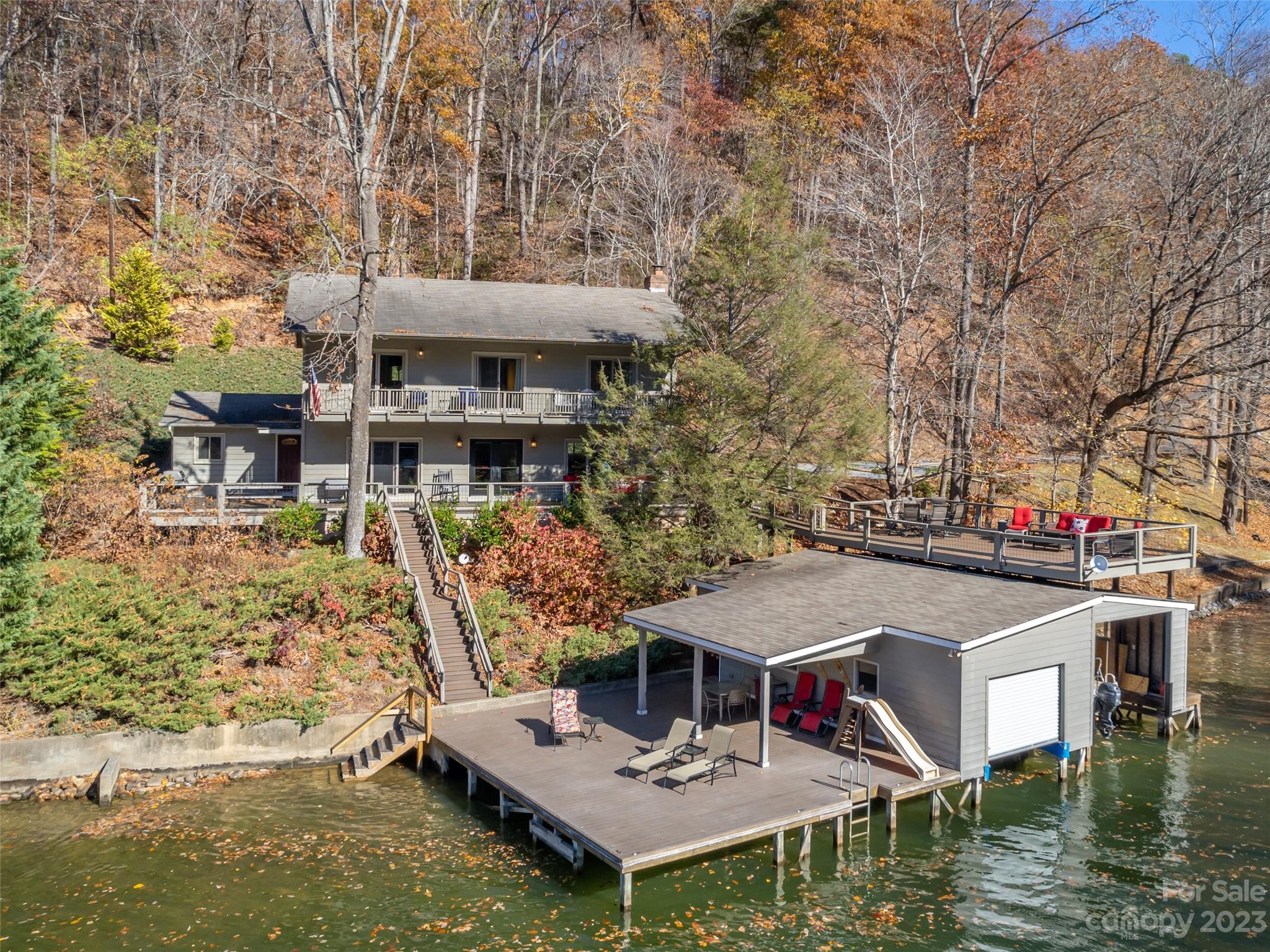 Once in a lifetime opportunity to own this lakefront LEGACY property in Sunset Cove in Lake Lure with stunning westerly views. Approximately 575ft of water frontage and a total of 13.73 acres, the main home offers the perfect living space with 5BR/3BA. Level entry into the home with small yard and tons of parking. Open floor plan with stunning upgraded kitchen, hardwood floors, wood burning fireplace and expansive decks and balcony to enjoy the views. Head down to the double stall boat house with rooftop deck, and massive sundeck complete with a slide! Around the cove is the cozy 1BR/1BA cottage for a great rental opportunity. Many potential building sites in the lower level portion and on top of the property off of Buffalo Shoals. A must see in person to truly appreciate this one-of-a-kind estate!