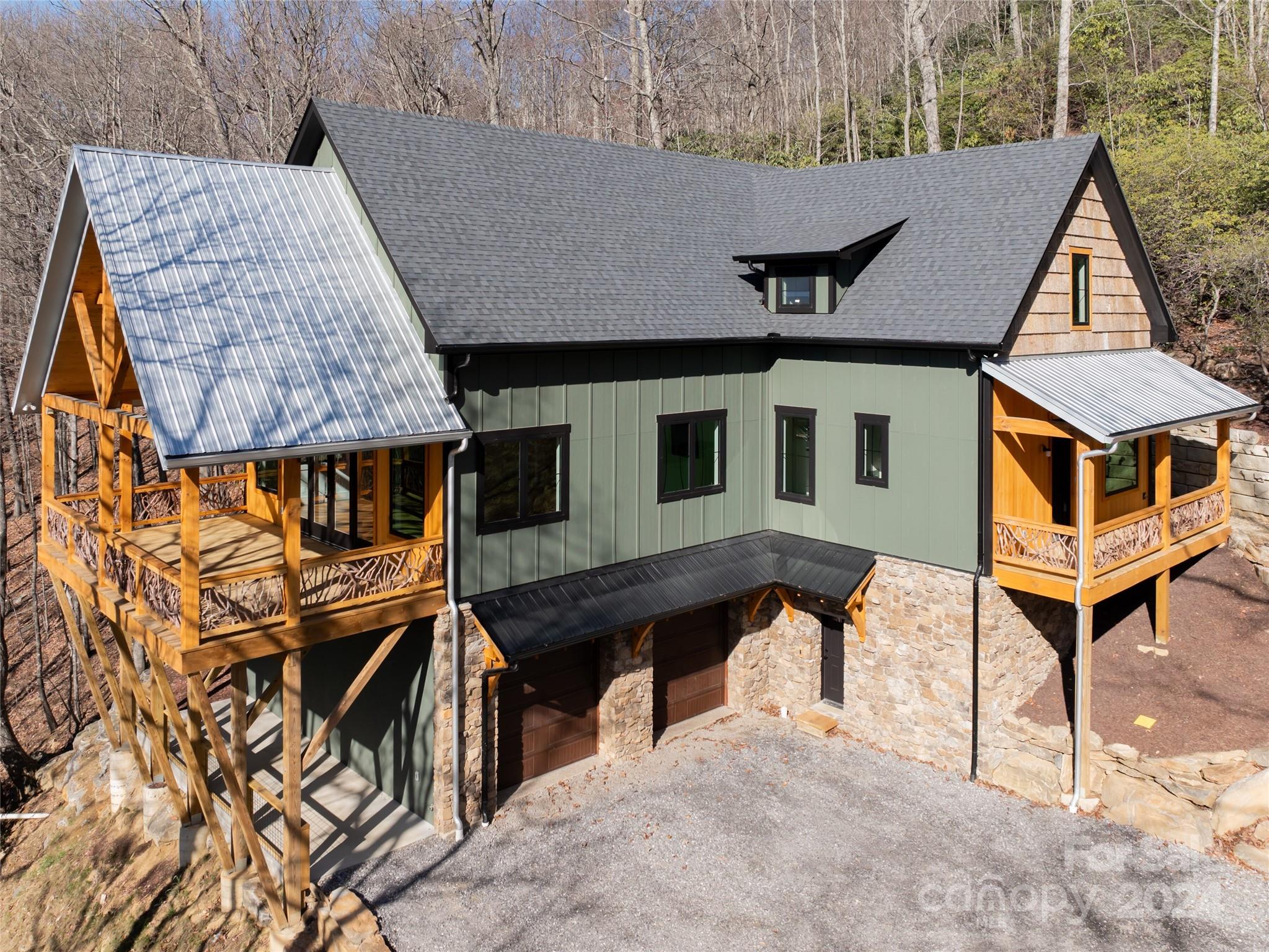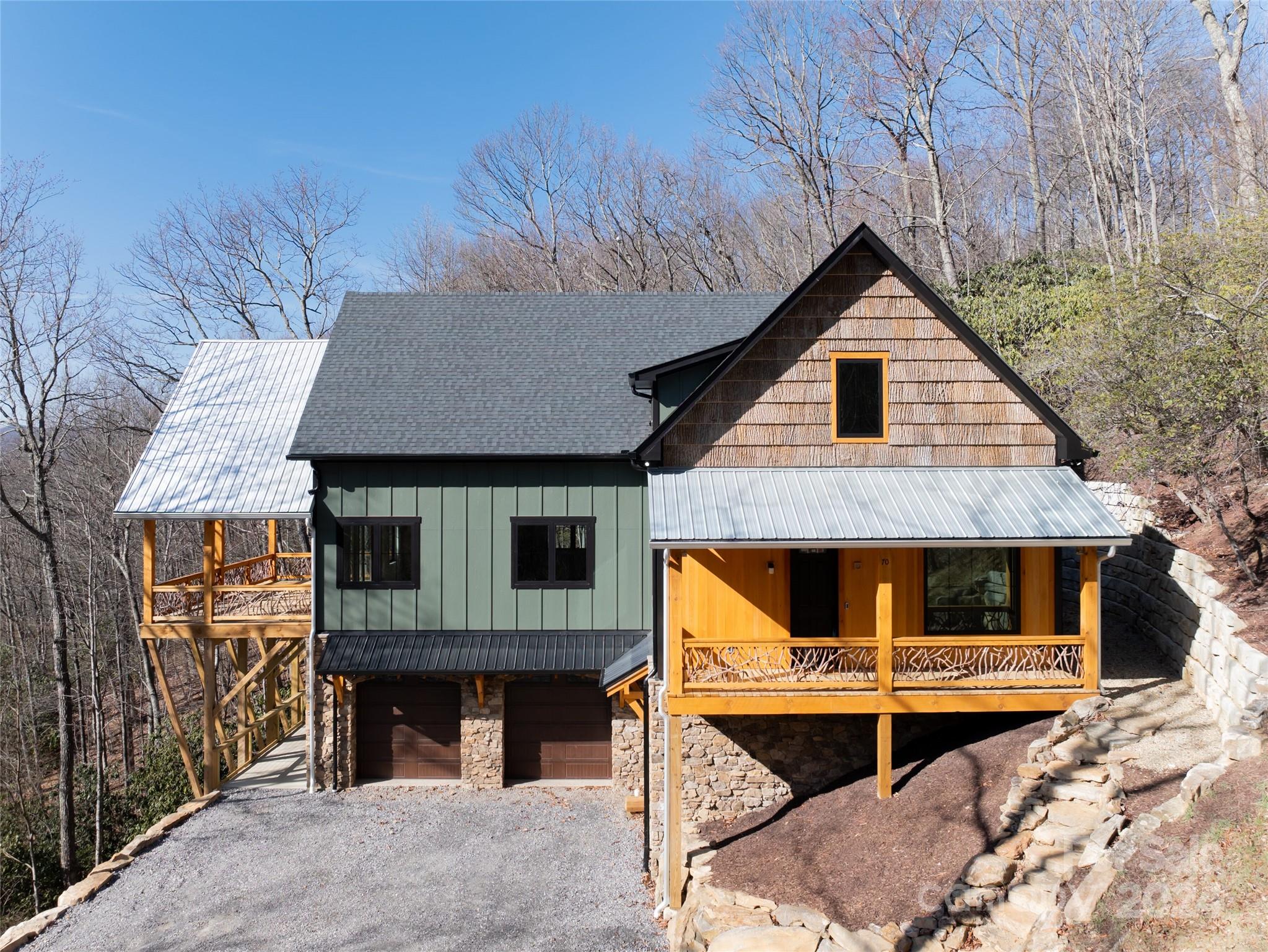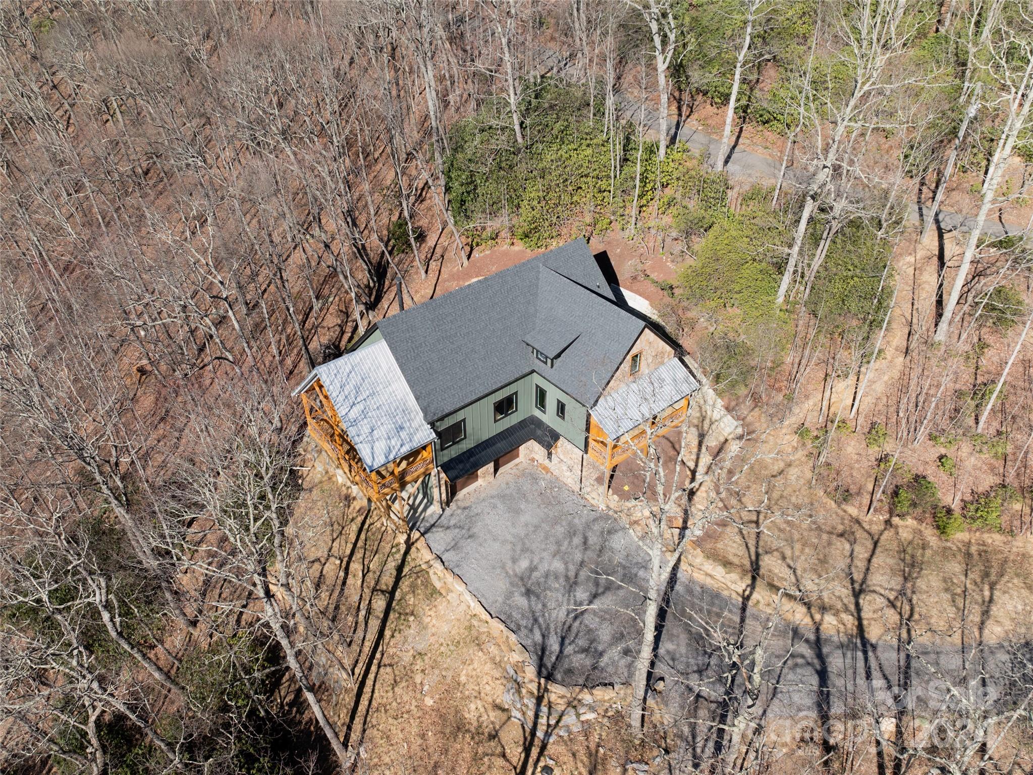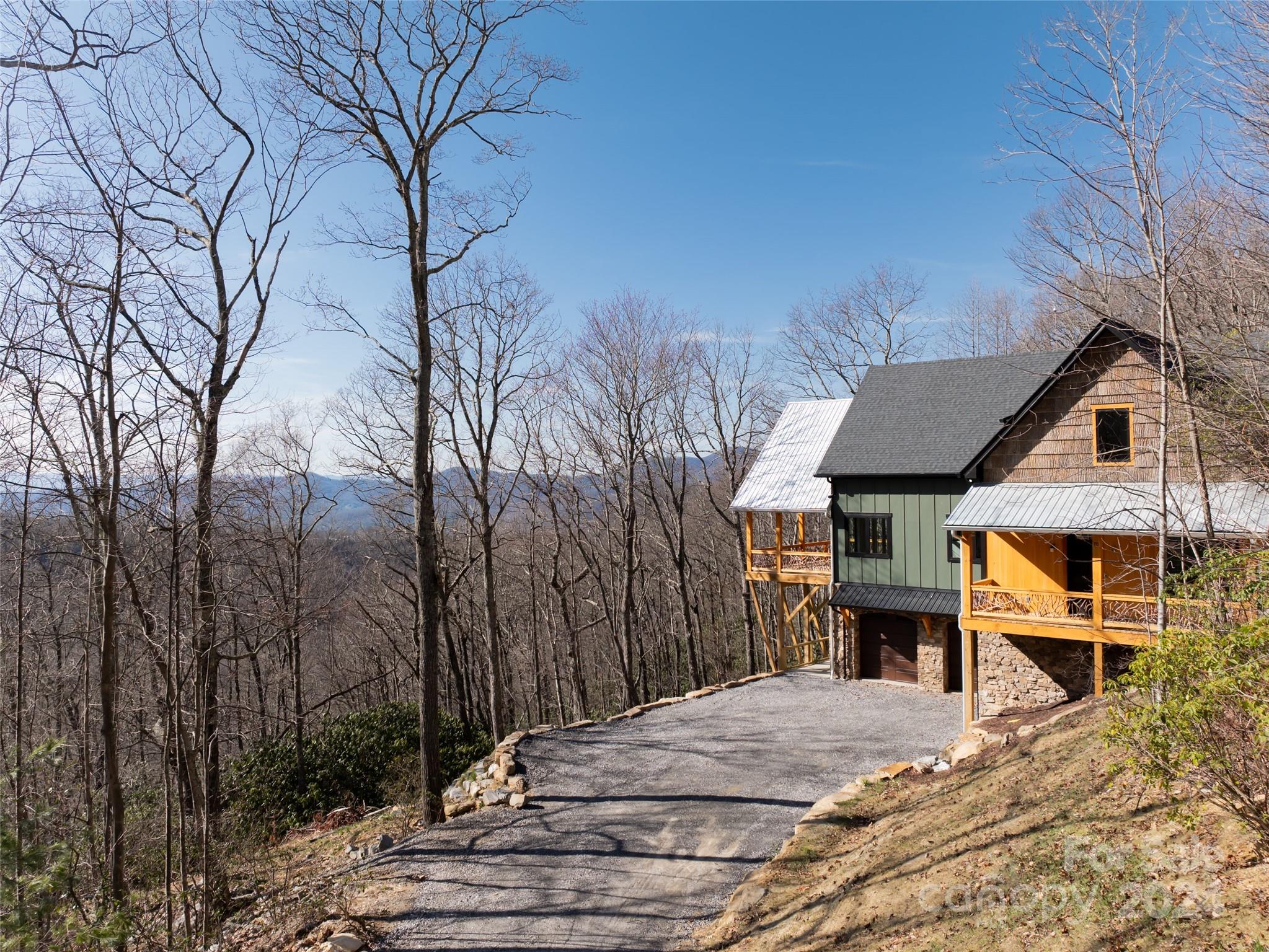 New custom quality construction on 8.2 acres in a gated community 15 minutes from downtown Asheville. Rarely does the combination of long range western views from a private location get offered for sale in the Asheville region. Interior features include an elevator, vaulted ceilings, exposed beams with tongue and groove ceilings, two story stone fireplace, The main level has a gourmet kitchen overlooking the great room and the covered porch that faces towards the sunset with the master bedroom and bath and an additional half bathroom. The upper floor has one bedroom and a bathroom with a gorgeous living area/game room that also has the long range views to the west. The lower level has two more rooms for guests, a laundry room, and bathroom with an all purpose room that makes a great transition from the garage to living area. The landscaping is extensive with beautiful stone retaining walls and walkways. This home is perfect for both year round living and a second home retreat.