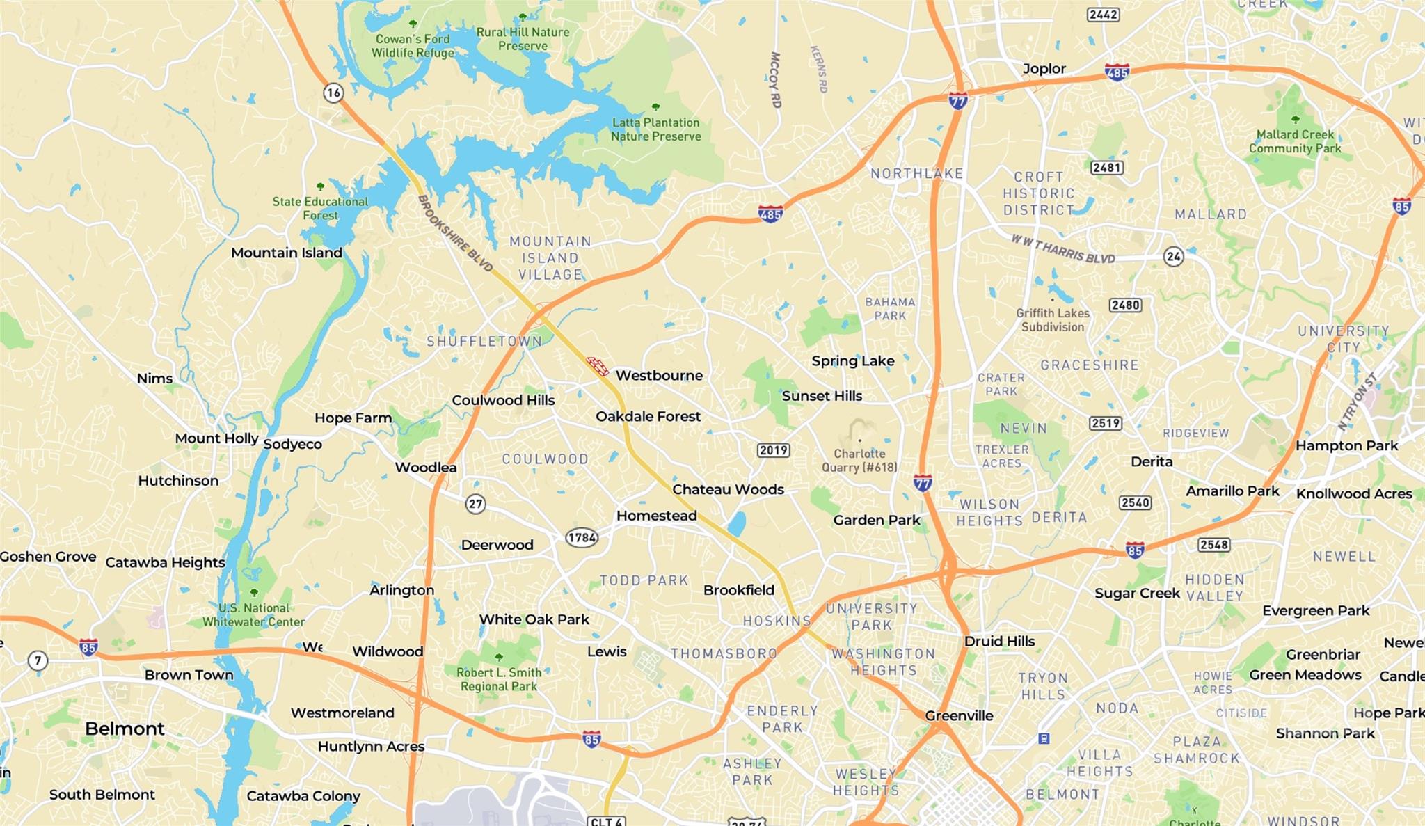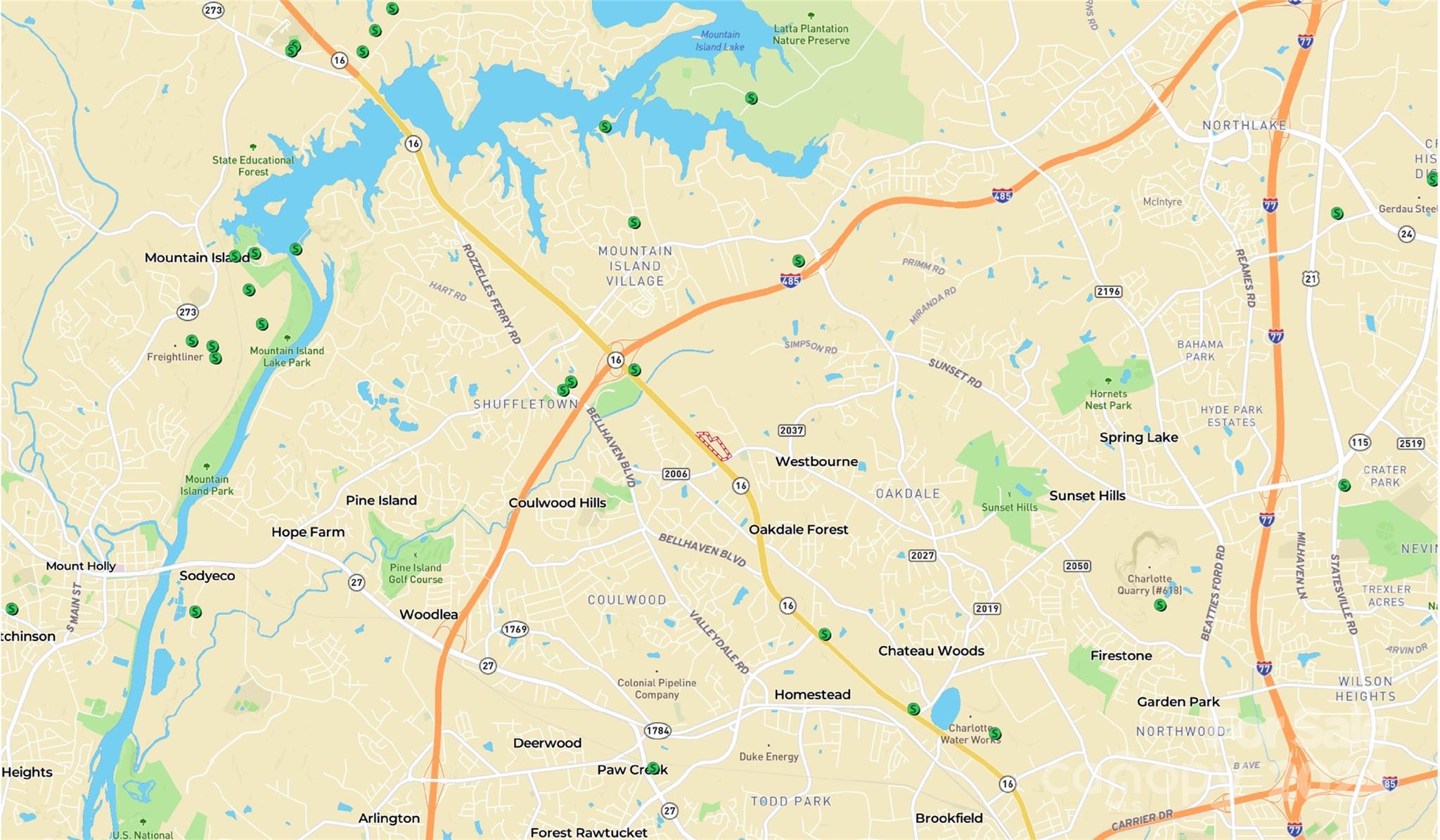 Development site on fast growing Hwy 16 Brookshire Blvd. in the NW corridor that connects uptown Charlotte with Mountain Island Lake and Lincoln County area. The listing contains multiple parcels to be sold together. Property has paved road frontage (870+/- ft) on Hwy 16 / Brookshire Blvd and (368+/- ft) on Pleasant Grove Rd. This is a strategic corner with great visibility from signaled intersection. Area under Duke Power utility easement can be used for open space, parking, rain gardens and low growing landscaping per Mecklenburg County. Utilities are available, with sewer and water close by, the site is located 1 mile south of I-485. Subject to rezoning to potential commercial corner.