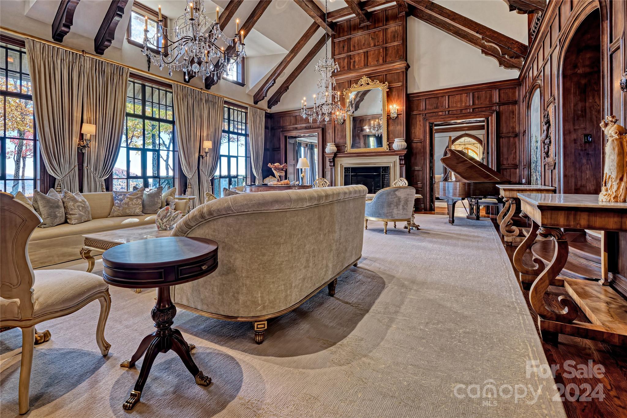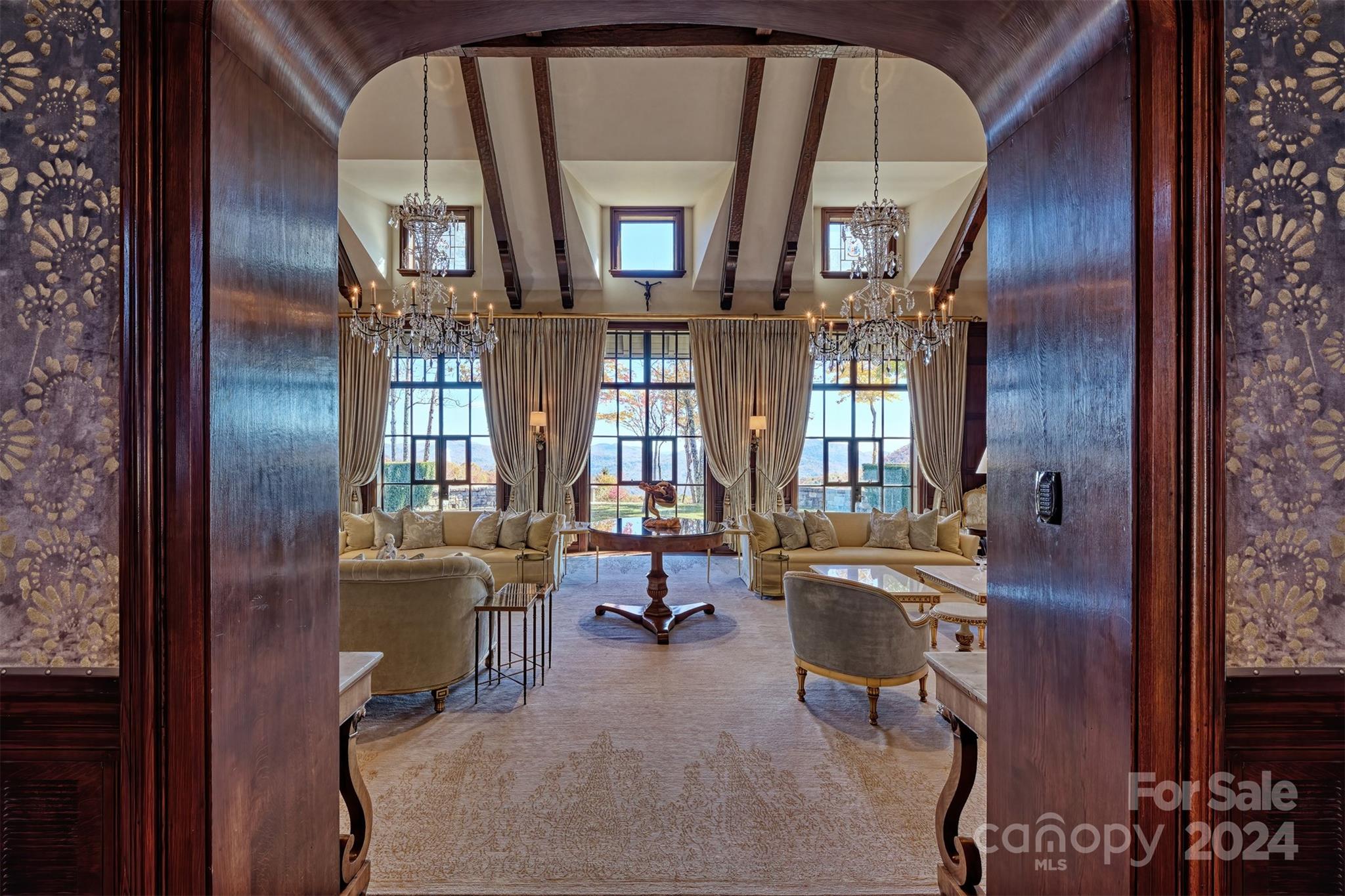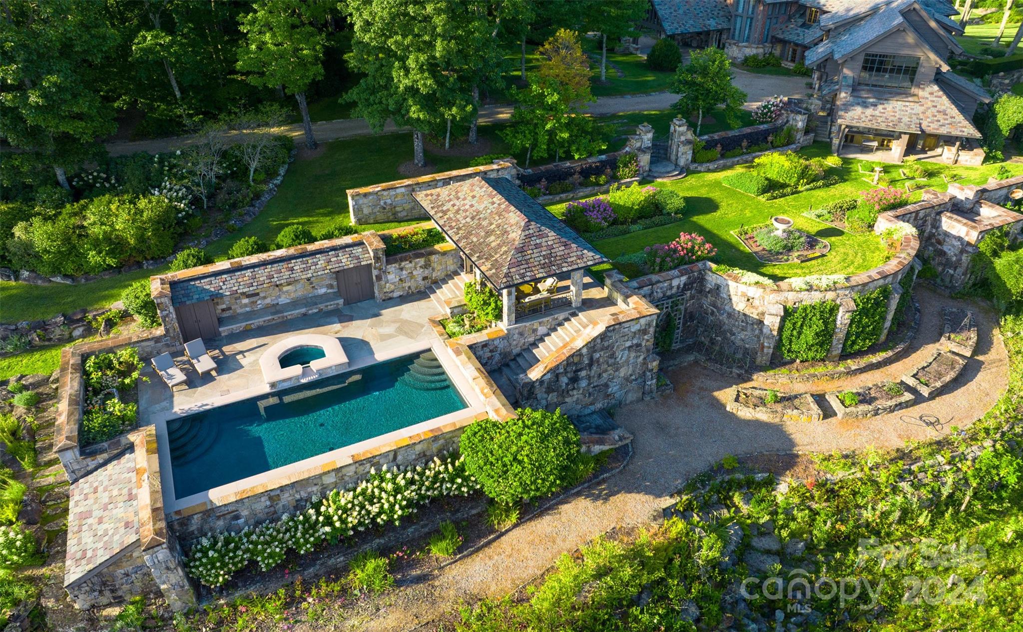 Awe-inspiring and perched majestically at 4000 feet above exclusive Highlands, NC, recently named America's Best Mountain Town by Travel and Leisure, Sagee Manor emerges for consideration from a decade-long eight figure enhancement to its grounds, manor home, and guest lodge. Centered among 40+ acres of pristine gated mountaintop enclave, Sagee's panoramic vistas take in long range views of three states, yet position her just 7 minutes from dynamic Highlands and its thriving arts and cultural scene. For outdoor enthusiasts, the region boasts world class golf, hiking, and 2000+ miles of trophy fly fishing streams. Recently enhanced and expanded, the Manor's primary residence offers unrivaled appointments, a grand two-story great hall, imported design selections and millwork, an exquisite owners sitting room and salon served by a private elevator, classic dining, kitchen, and Library areas complimented by covered outdoor pavilions, a helipad, infinity pool, English gardens & guest lodge.