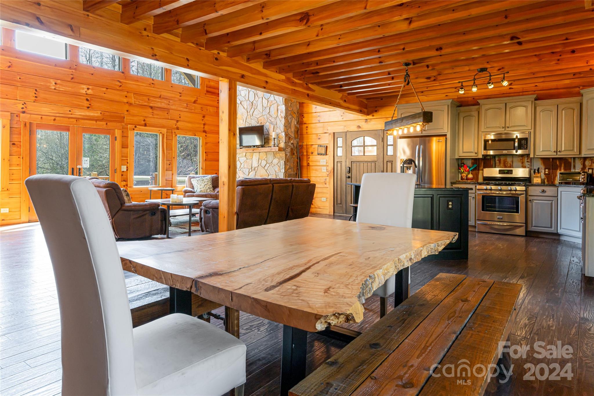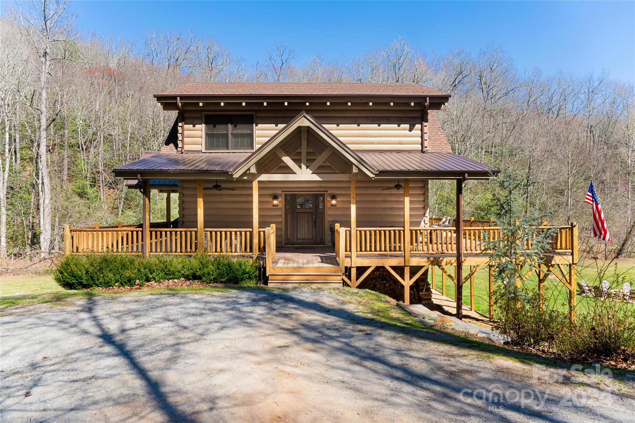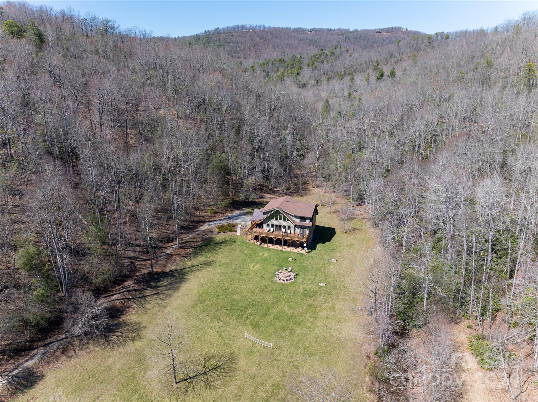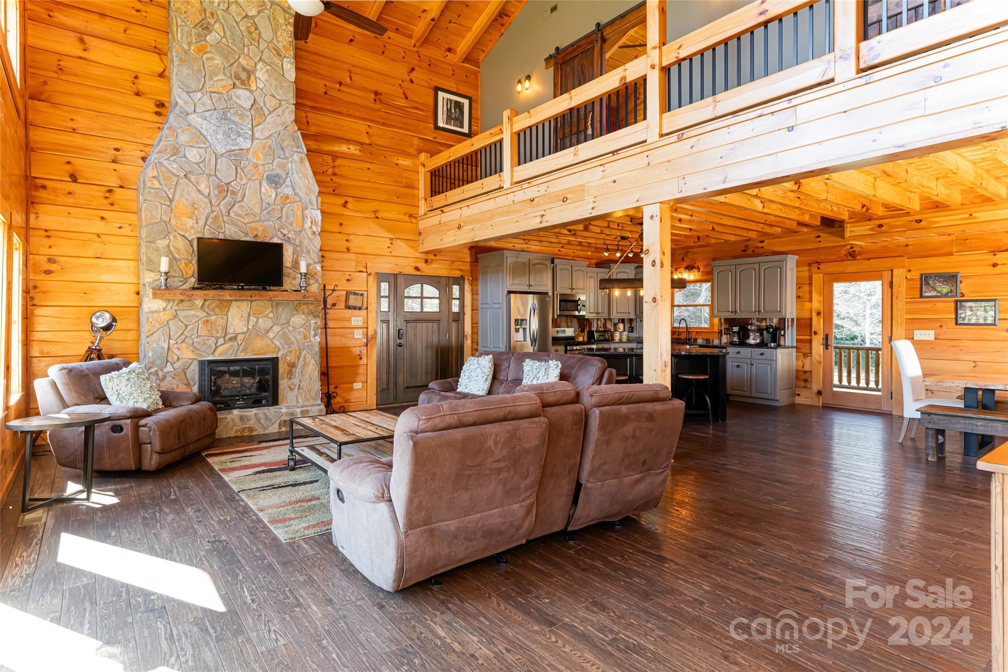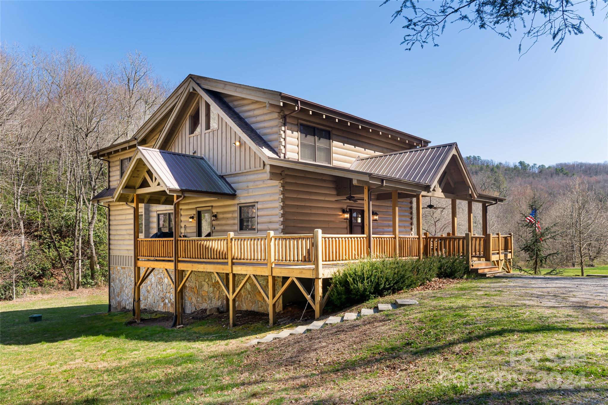 Quintessential log cabin situated on 14+, private acres with a sprawling, flat meadow, a bold creek that runs the property line, and a wooded hillside that offers endless possibilities for outdoor recreation or additional building sites. A large, wraparound porch welcomes you to this inviting cabin with a rich, log interior that features an open floor plan, hardwood floors, a vaulted ceiling in the living room and stone fireplace. The large kitchen includes stainless steel appliances, granite countertops, and an oversized eat-in island. The spacious, main level primary suite features a stone fireplace, exterior deck access, a large walk-in closet, and a luxurious ensuite with double vanities and a walk-in tile shower. The upper level includes two guest suites and a generous loft area. The basement comprises an ample family room, recreation area, fourth bedroom, a bonus/bedroom, laundry room, and ample storage. Please no drive-bys.