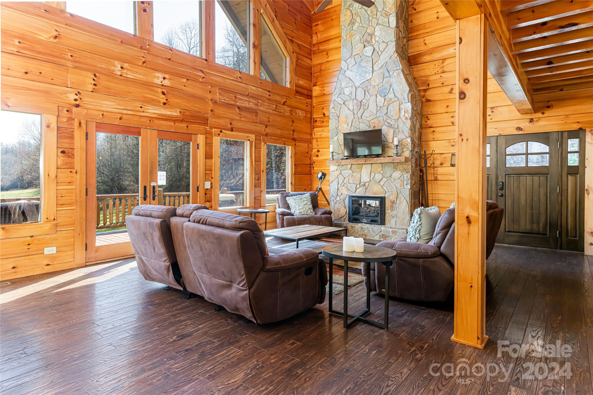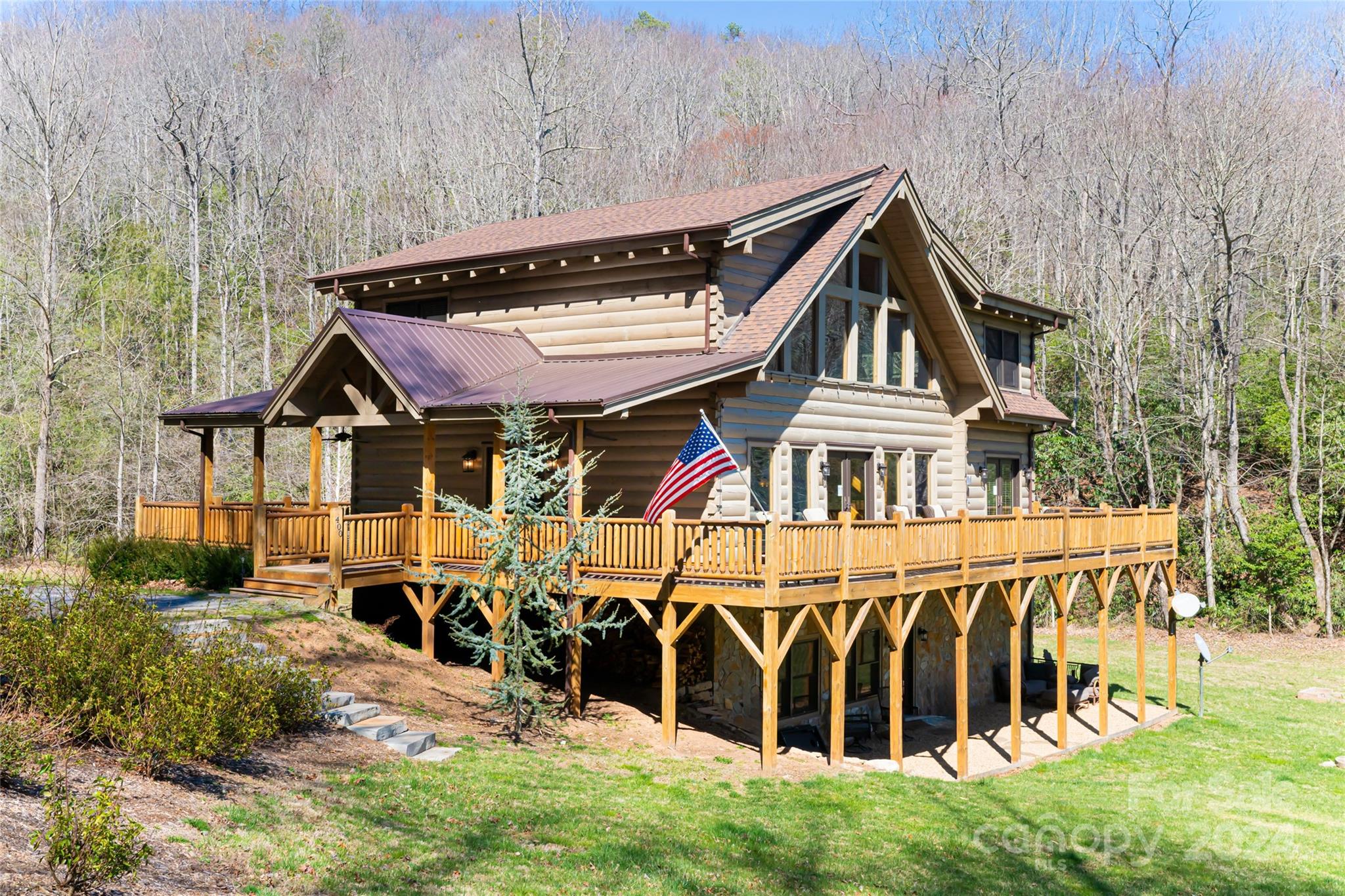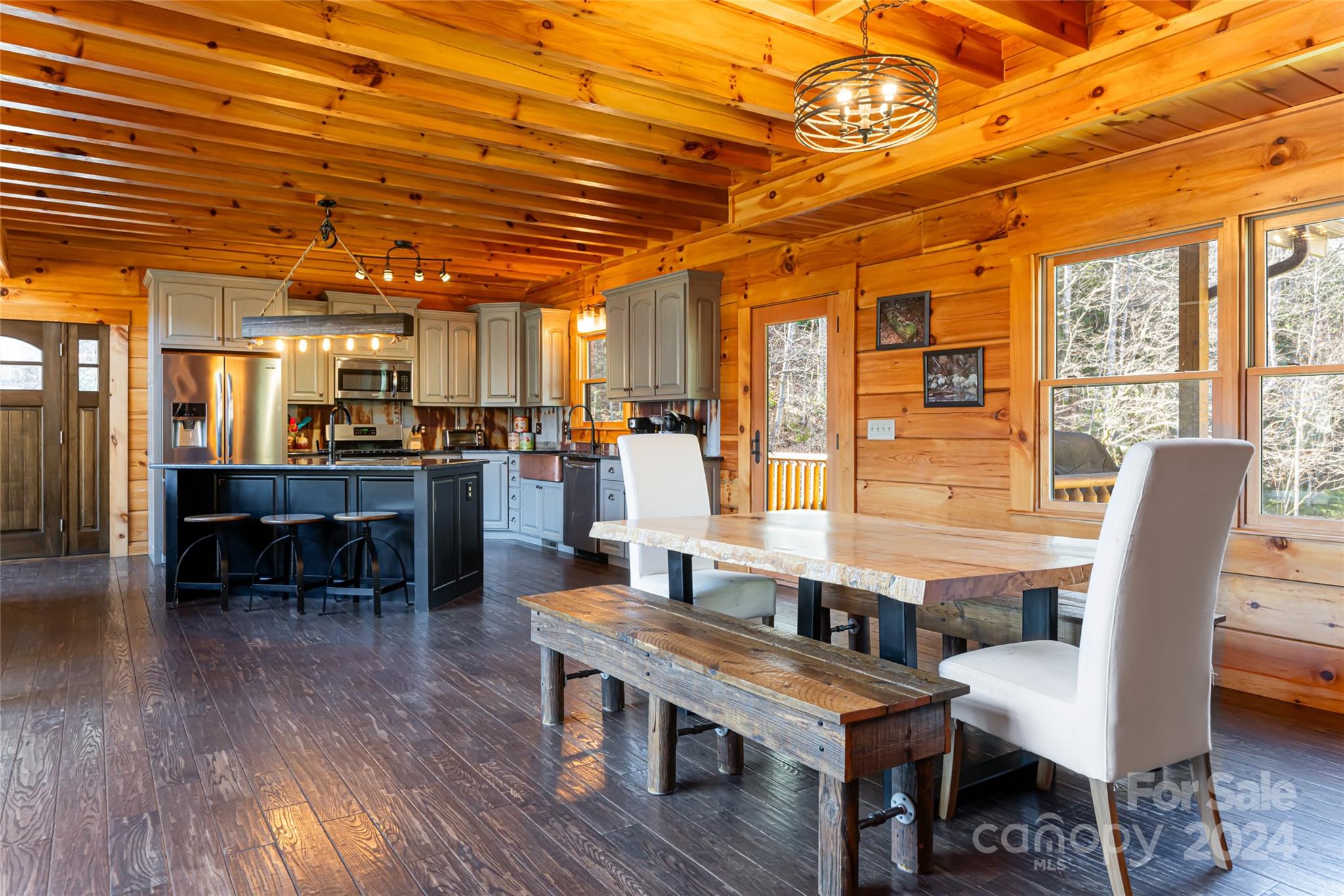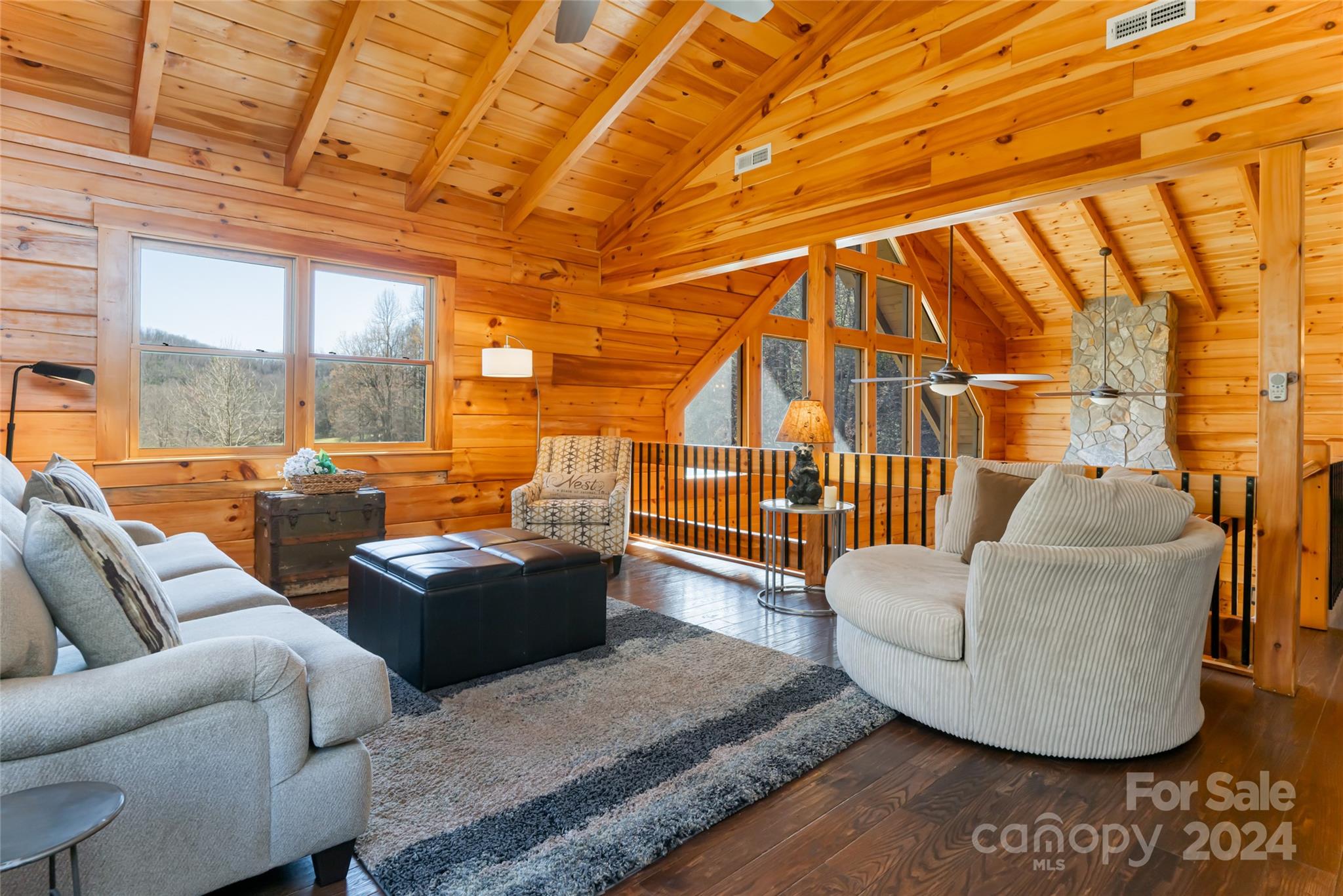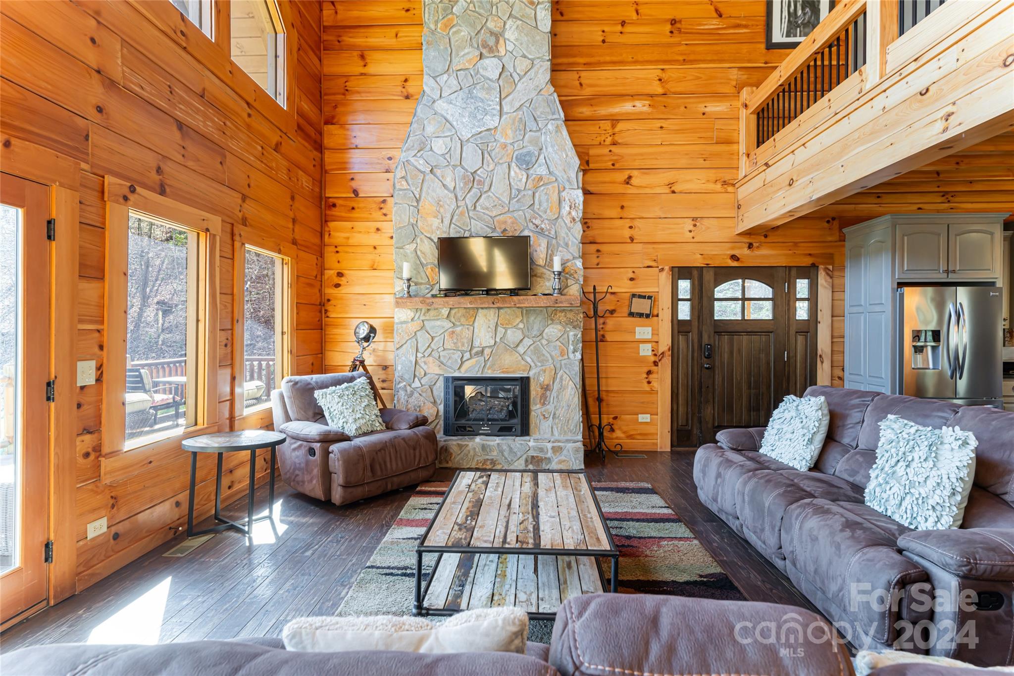 Quintessential log cabin situated on 14+, private acres with a sprawling, flat meadow, a bold creek that runs the property line, and a wooded hillside that offers endless possibilities for outdoor recreation or additional building sites. A large, wraparound porch welcomes you to this inviting cabin with a rich, log interior that features an open floor plan, hardwood floors, a vaulted ceiling in the living room and stone fireplace. The large kitchen includes stainless steel appliances, granite countertops, and an oversized eat-in island. The spacious, main level primary suite features a stone fireplace, exterior deck access, a large walk-in closet, and a luxurious ensuite with double vanities and a walk-in tile shower. The upper level includes two guest suites and a generous loft area. The basement comprises an ample family room, recreation area, fourth bedroom, a bonus/bedroom, laundry room, and ample storage. Please no drive-bys.