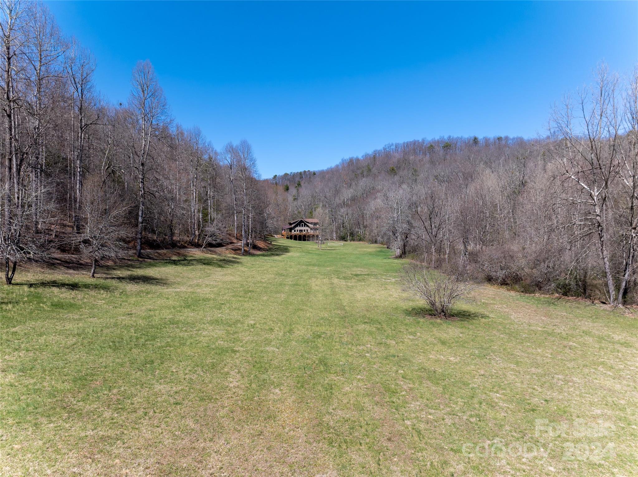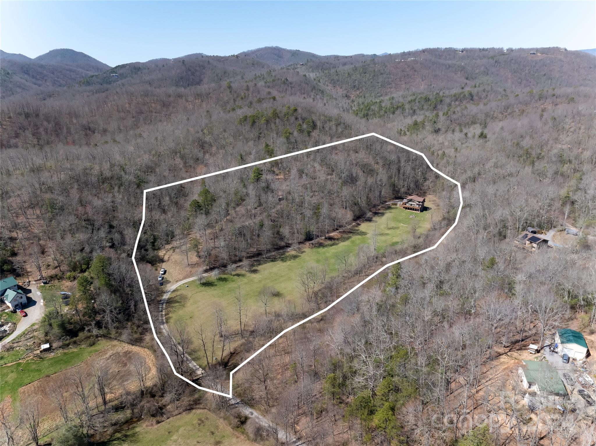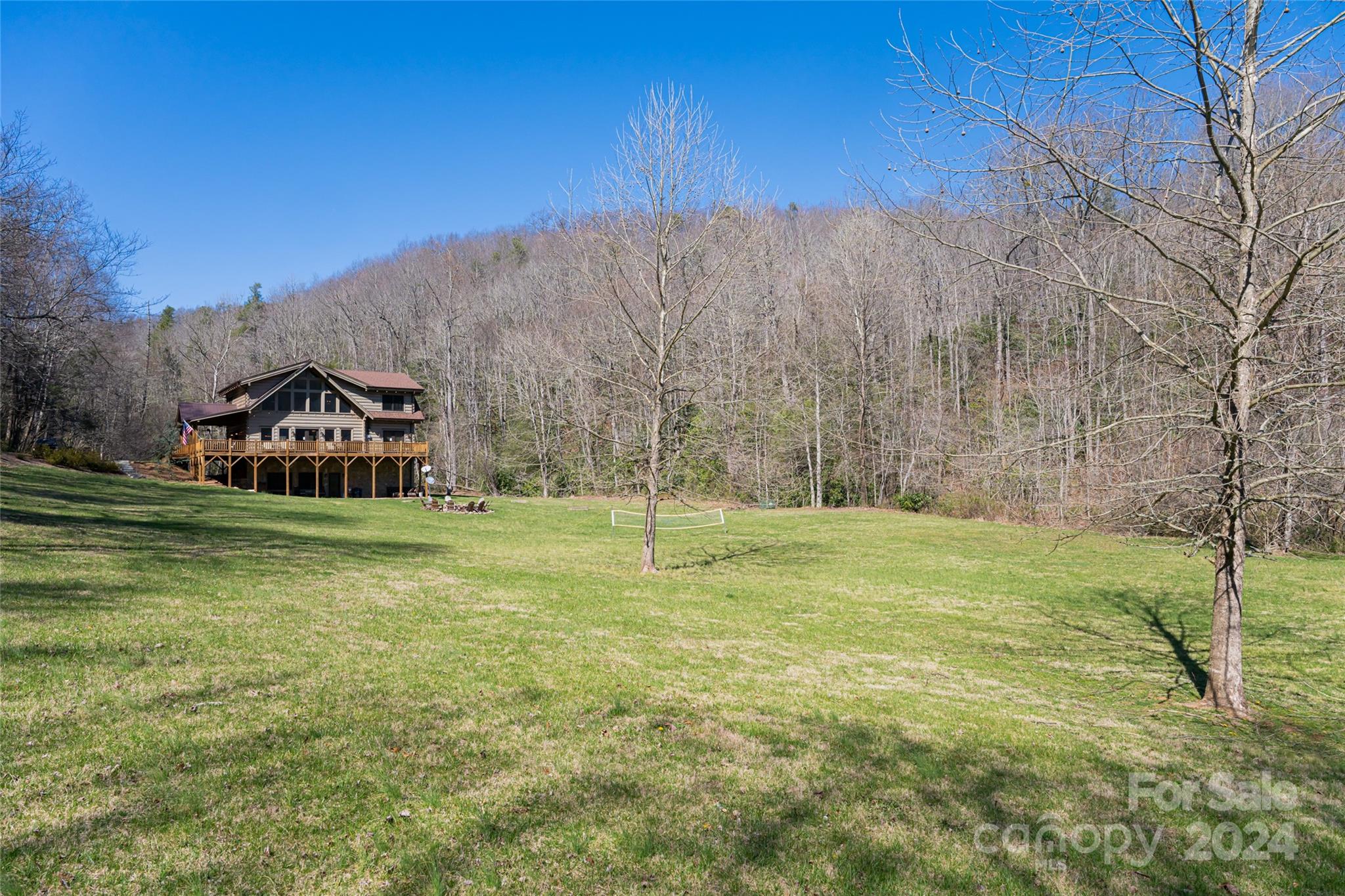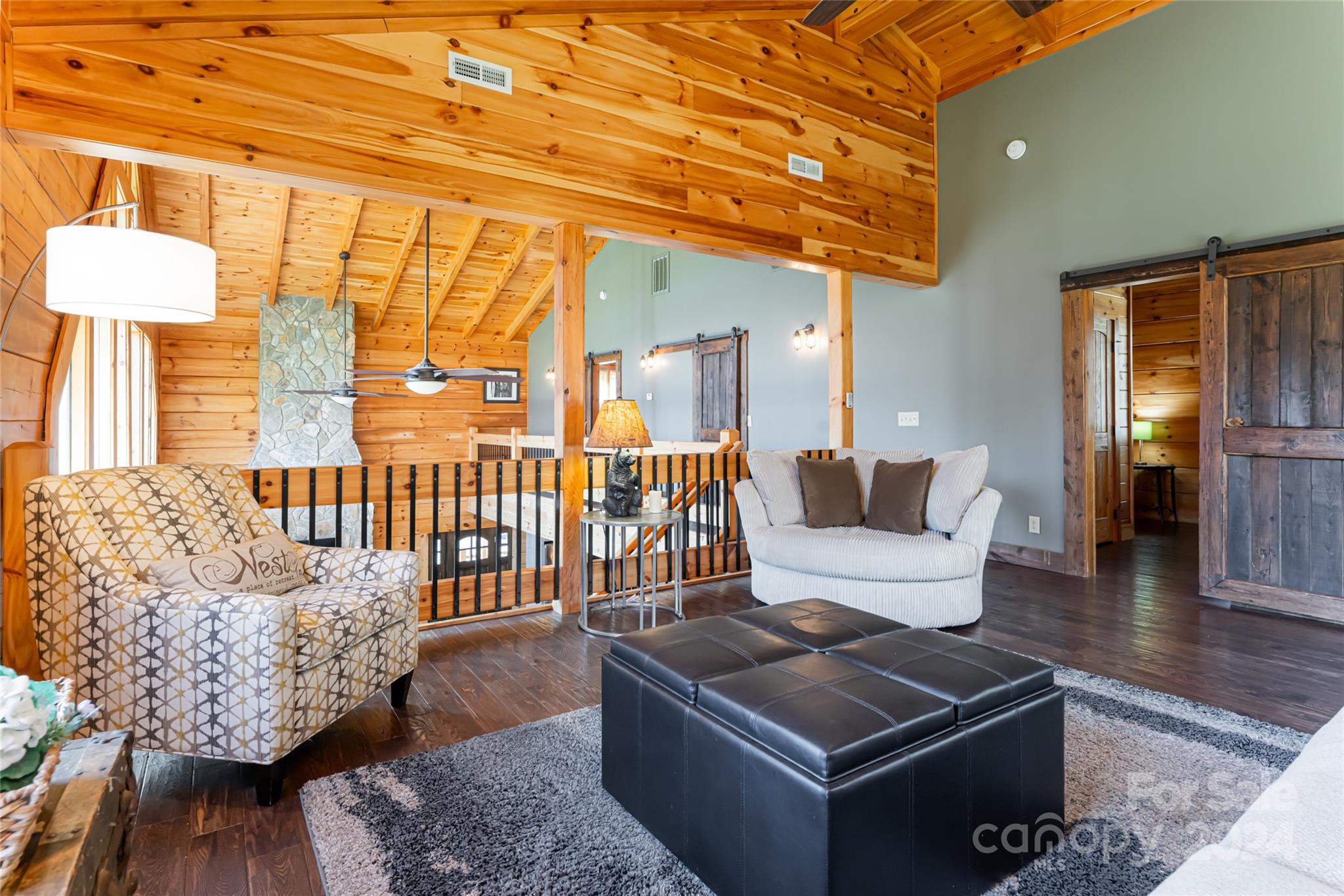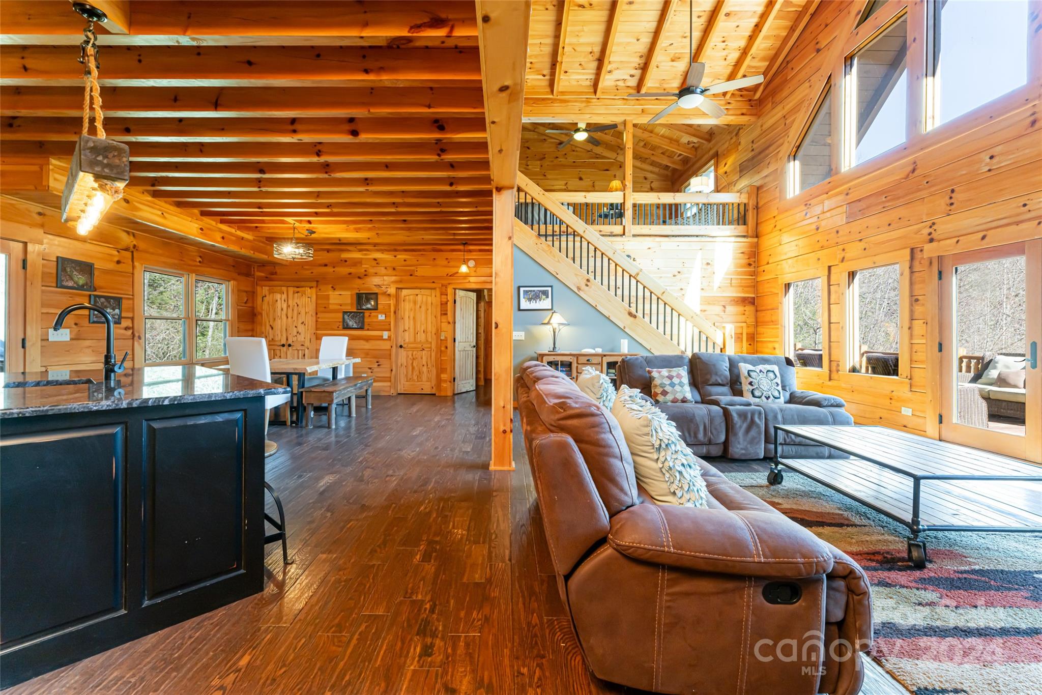 Quintessential log cabin situated on 14+, private acres with a sprawling, flat meadow, a bold creek that runs the property line, and a wooded hillside that offers endless possibilities for outdoor recreation or additional building sites. A large, wraparound porch welcomes you to this inviting cabin with a rich, log interior that features an open floor plan, hardwood floors, a vaulted ceiling in the living room and stone fireplace. The large kitchen includes stainless steel appliances, granite countertops, and an oversized eat-in island. The spacious, main level primary suite features a stone fireplace, exterior deck access, a large walk-in closet, and a luxurious ensuite with double vanities and a walk-in tile shower. The upper level includes two guest suites and a generous loft area. The basement comprises an ample family room, recreation area, fourth bedroom, a bonus/bedroom, laundry room, and ample storage. Please no drive-bys.