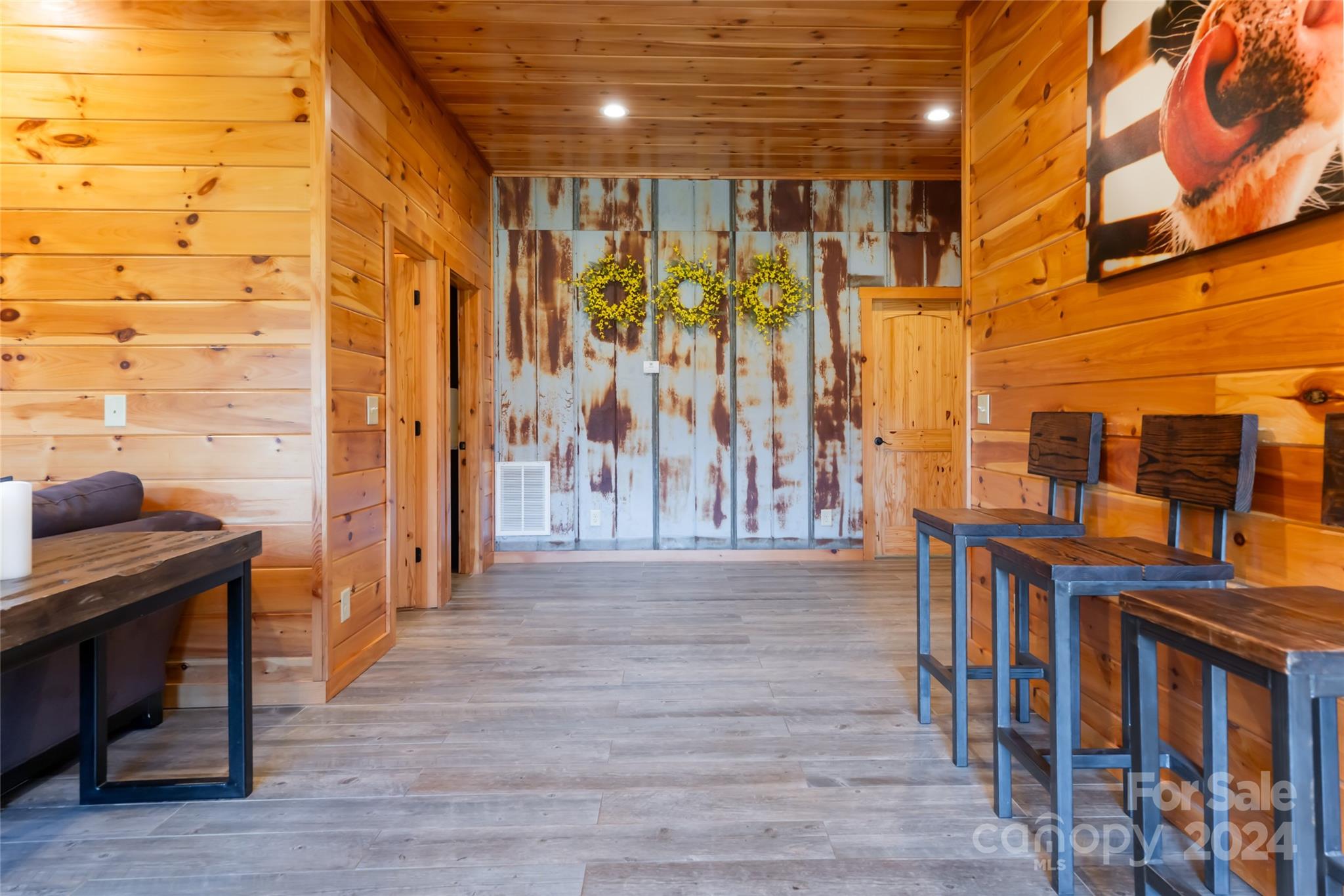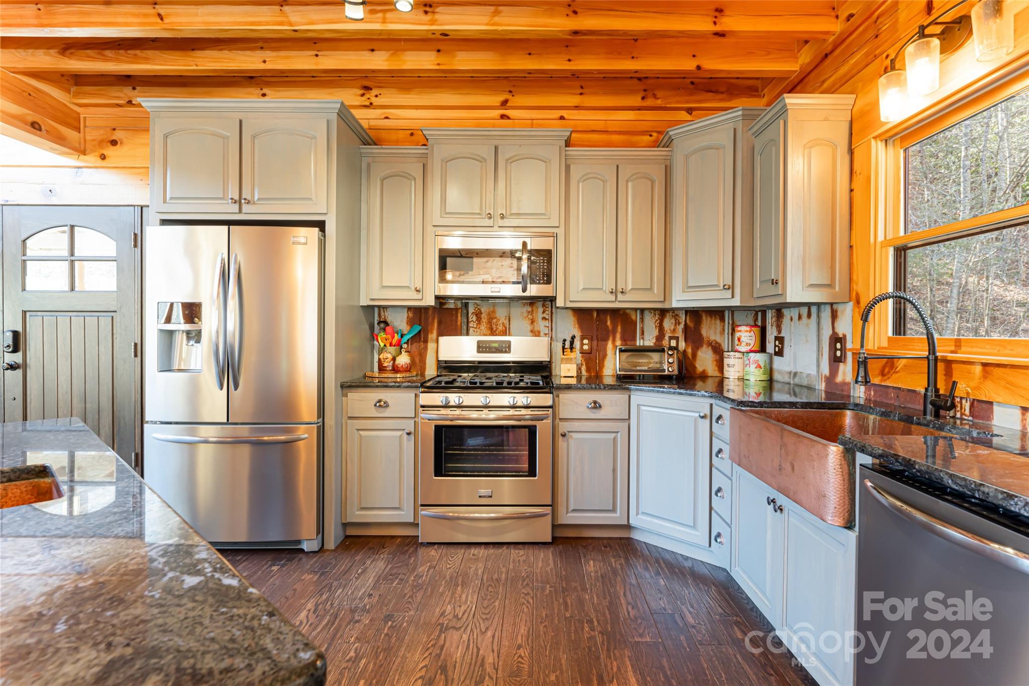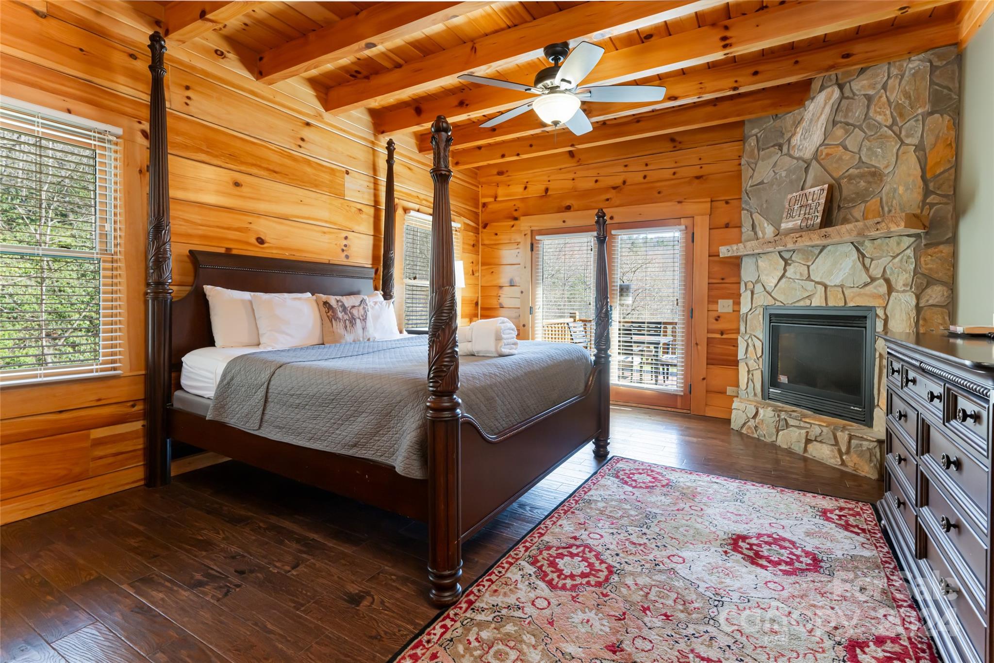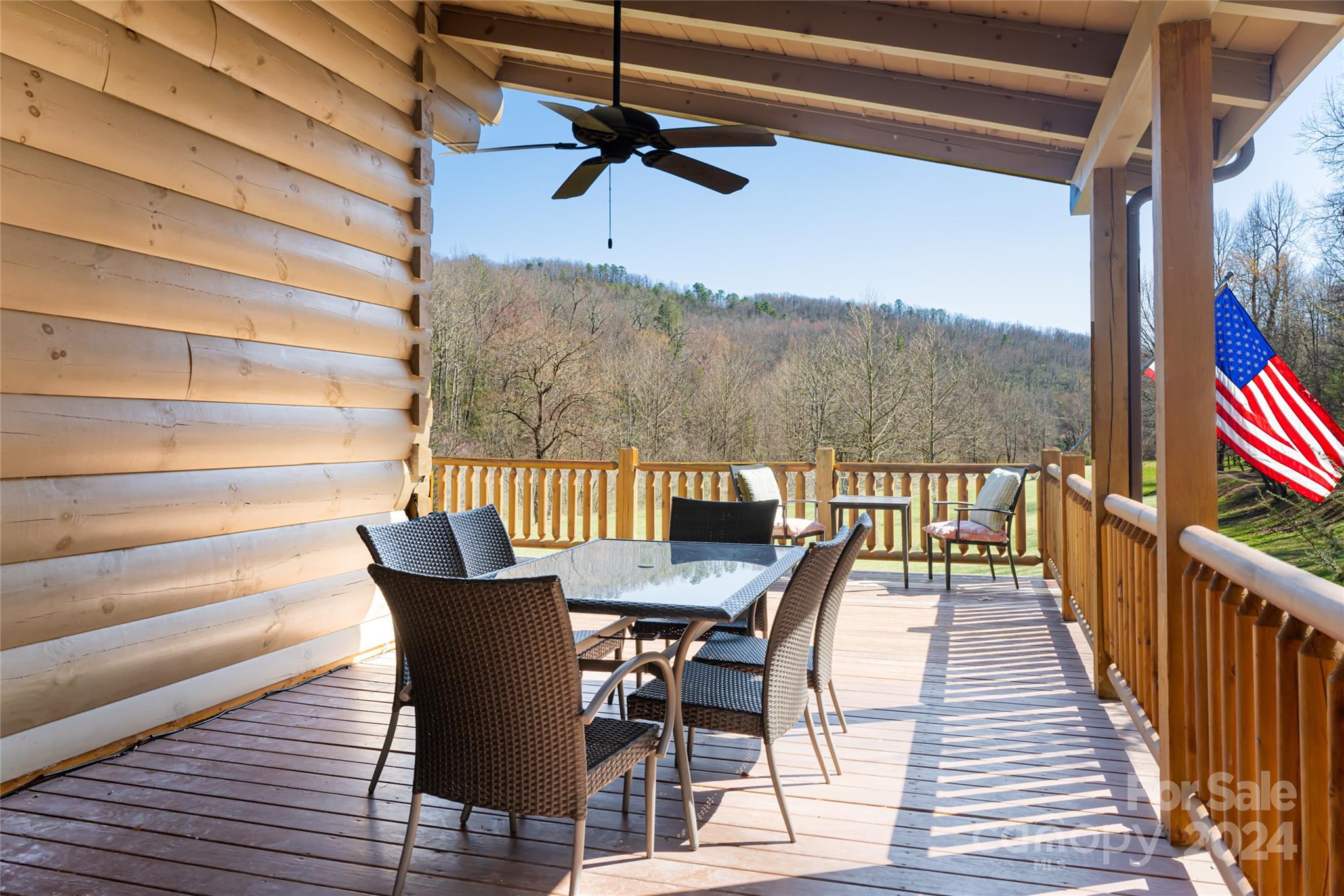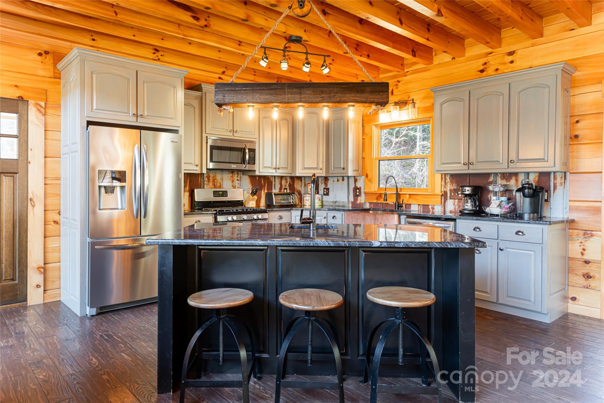 Quintessential log cabin situated on 14+, private acres with a sprawling, flat meadow, a bold creek that runs the property line, and a wooded hillside that offers endless possibilities for outdoor recreation or additional building sites. A large, wraparound porch welcomes you to this inviting cabin with a rich, log interior that features an open floor plan, hardwood floors, a vaulted ceiling in the living room and stone fireplace. The large kitchen includes stainless steel appliances, granite countertops, and an oversized eat-in island. The spacious, main level primary suite features a stone fireplace, exterior deck access, a large walk-in closet, and a luxurious ensuite with double vanities and a walk-in tile shower. The upper level includes two guest suites and a generous loft area. The basement comprises an ample family room, recreation area, fourth bedroom, a bonus/bedroom, laundry room, and ample storage. Please no drive-bys.