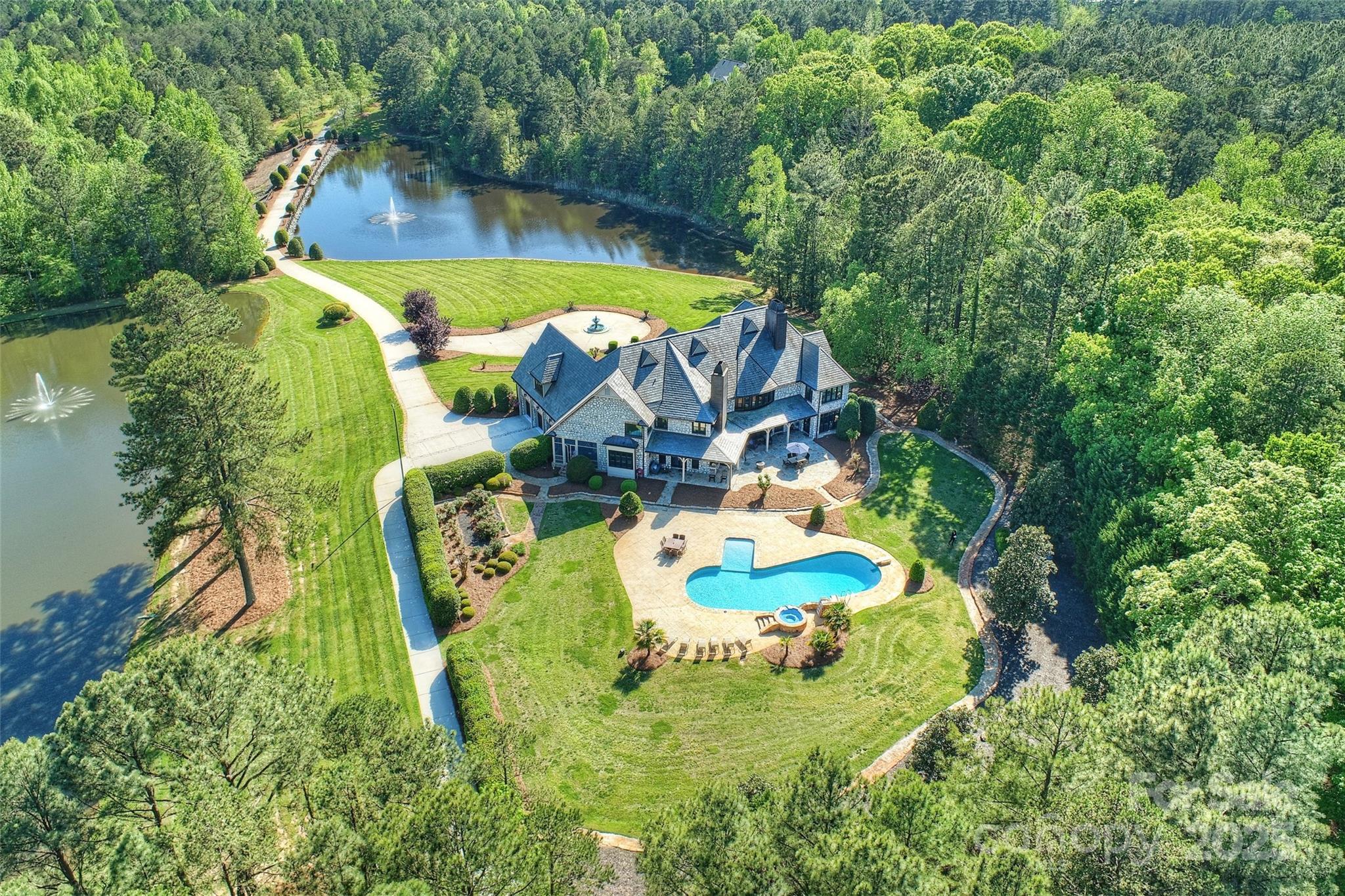 Nestled on over 53 acres of sprawling countryside, this grand estate offers the pinnacle of luxury living. Boasting over 9,200 square feet of meticulously designed space, the home features exquisite craftsmanship and attention to detail at every turn. With its distinguished slate tile roof, copper gutters, and a private gate, the exterior exudes sophistication and charm. Inside, discover five spacious bedrooms and four and a half opulent bathrooms, providing the utmost comfort and privacy. The gourmet kitchen is a chef's dream, while multiple living areas offer ample space for relaxation and entertainment. Outside, two aerated serene ponds add to the scenic beauty of the property, creating an oasis of tranquility. There are two Garages on the property that add over 9000 sq feet and additional garage bays.With a sparkling pool and expansive outdoor living area, this extraordinary residence offers an unparalleled retreat for those seeking a life of luxury and refinement.
