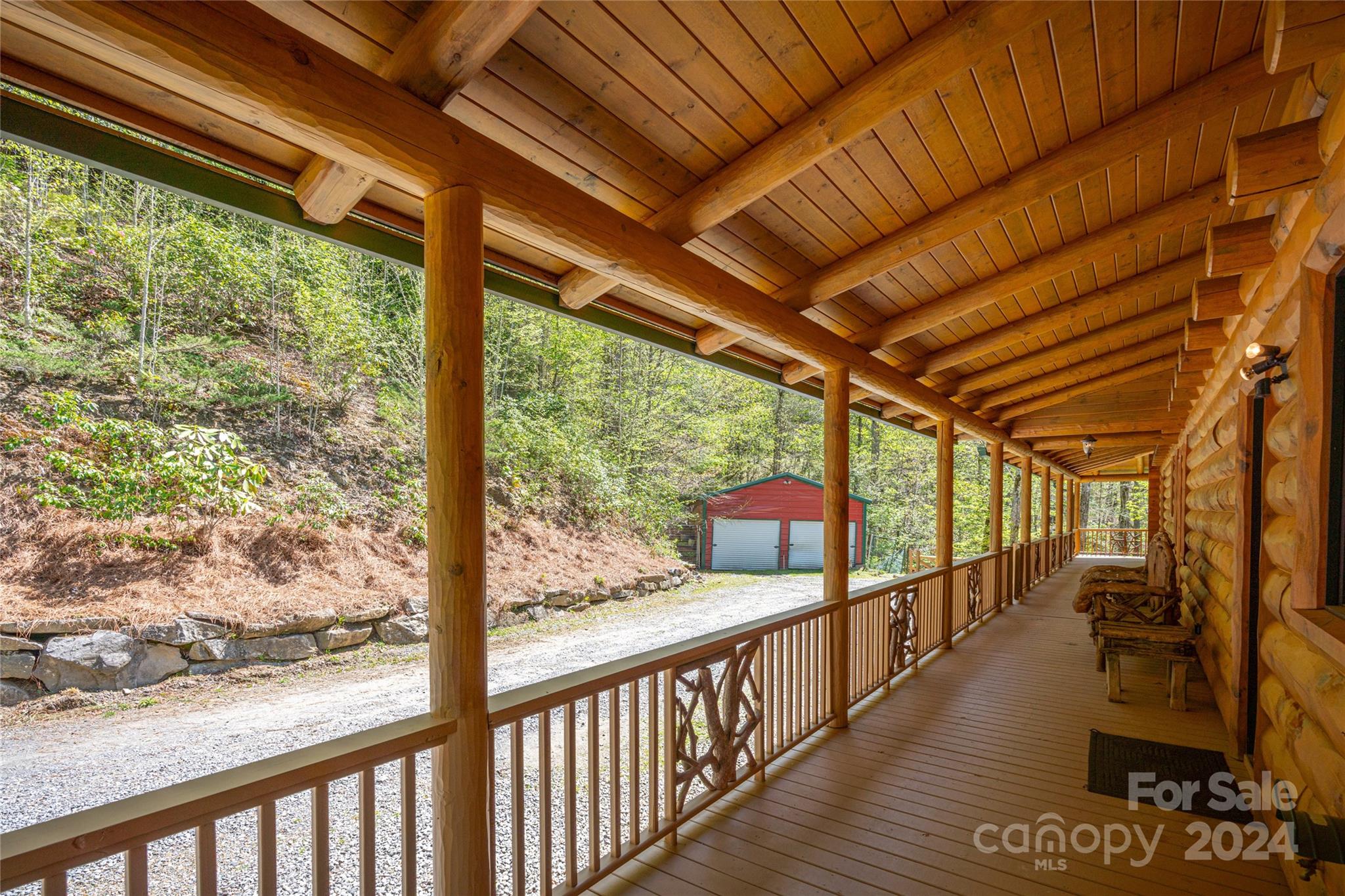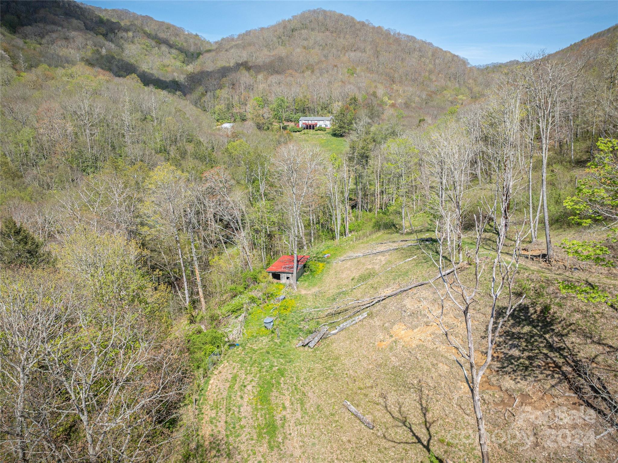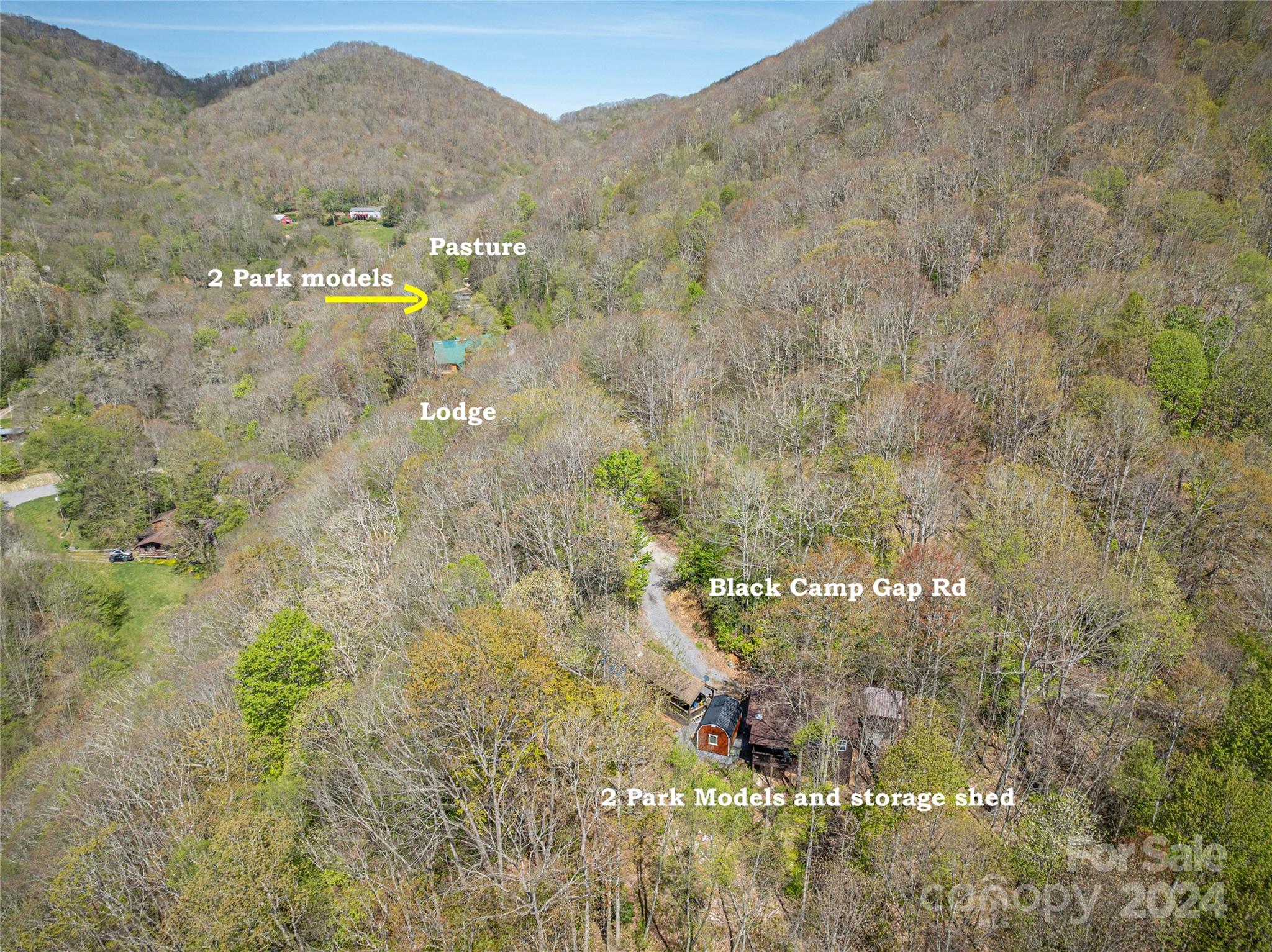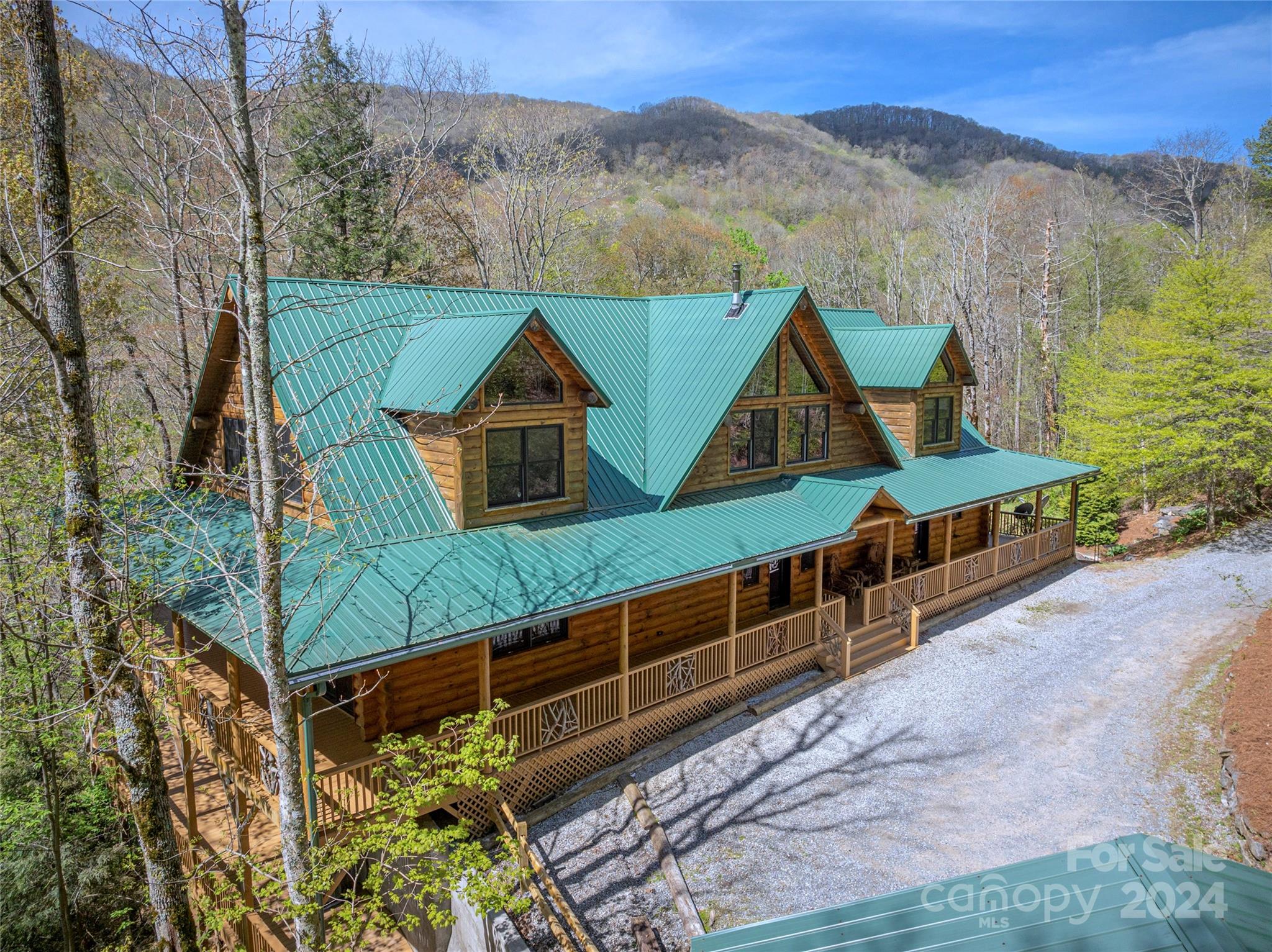 Secluded Compound on 16 Unrestricted Acres.. prepped with a Mountain Log Lodge featuring Large Timber-framing, dramatic architecture, soaring ceiling. 7 sleeping areas/5.5 Baths (on 4 BR Septic) Plus 4 park models could be rentals (w/septic systems). Available ready-to-rent with income averaging $90k. Pasture with sheds.. Two natural creeks, 'Safe Room' Bunker, Mountain Views. Fire pit and man made WATERFALL next to the Hot Tub. The 30'x24' great room can accomodate everyone around the fireplace. Kitchen, Dining, 2 bedrooms with Jack n Jill bath, powder room, laundry on main level. Over 2500 SF of wrap-around porches and decks for outdoor living. The Loft offers 'birds eye view' gathering space or private sanctuary with wood burning stove, Primary bedroom, en-suite bath & tile shower, 2 guest rooms with full bath. Lower level has Billiards, work out and media seating areas, 2 Bunk rooms plus 2 Full baths. Ride 4-wheelers to Great Smokies and Blue Ridge Parkway. Seller's Home Inspection