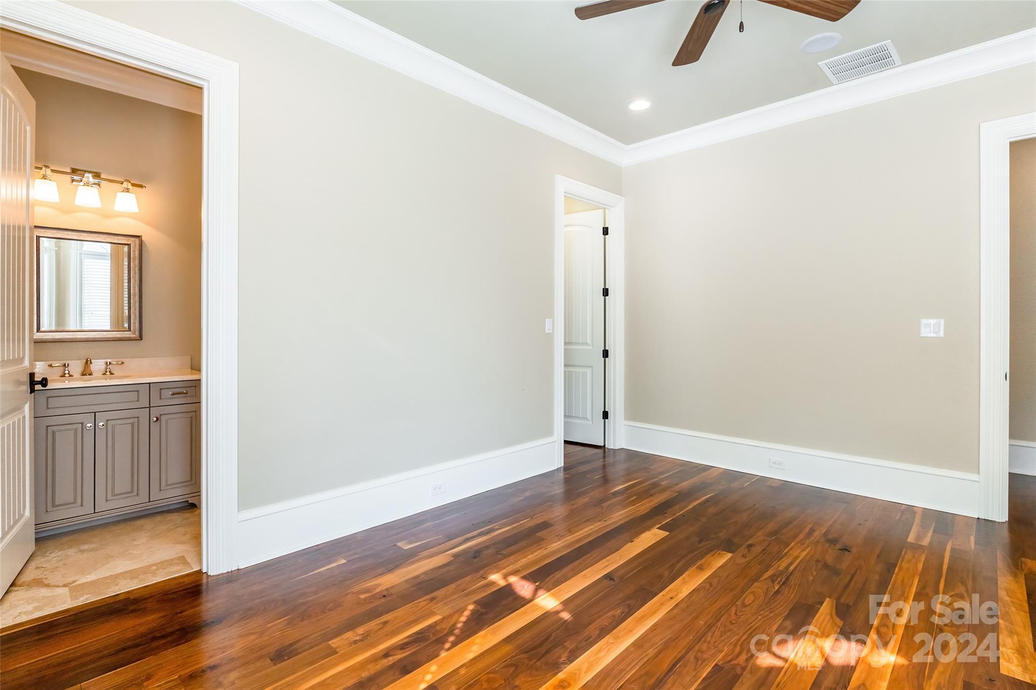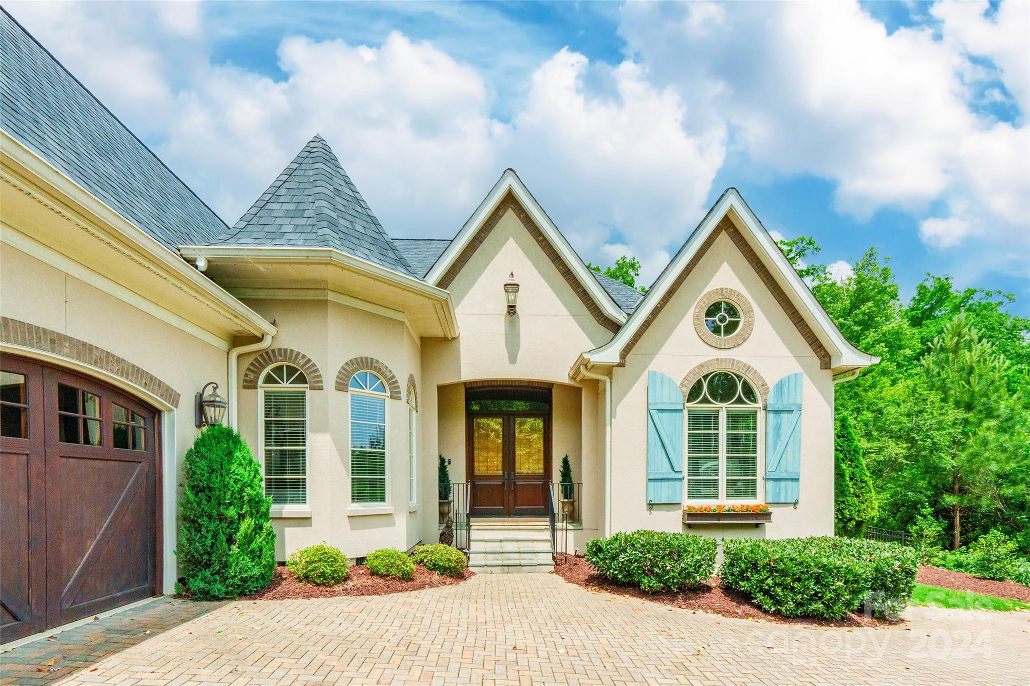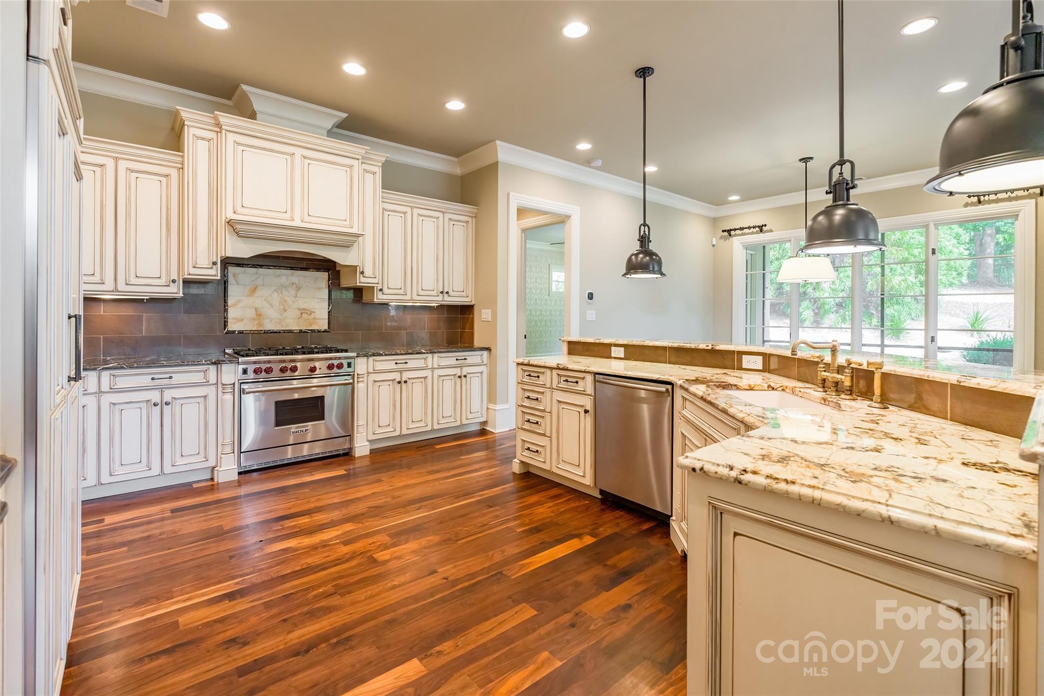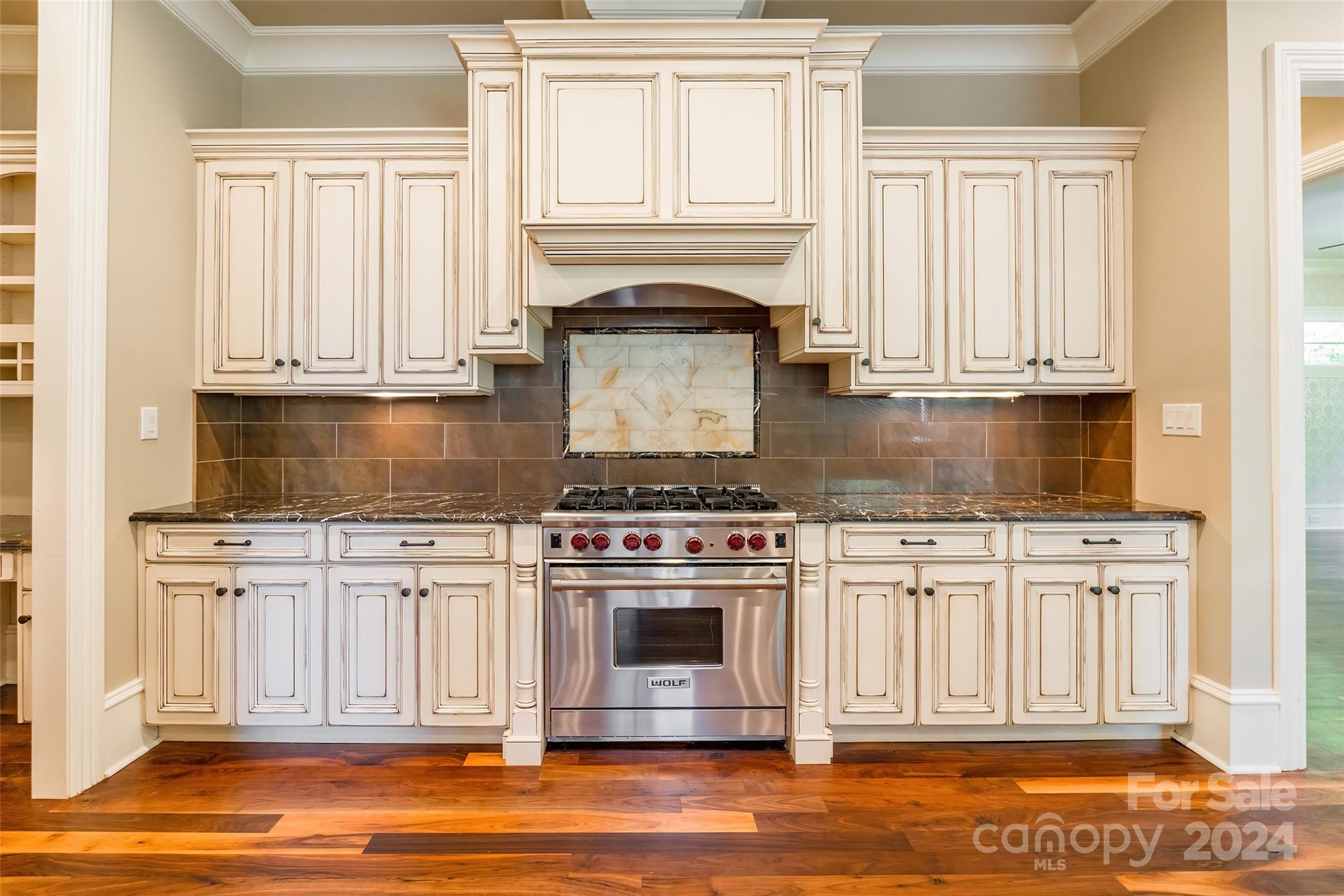 Prepare to be captivated by this extraordinary custom home! Meticulously crafted inside and out, you'll first notice its stunning exterior from the moment you step out onto the brick-paver driveway. As you enter, you'll be greeted by the timeless elegance of walnut floors that flow through the main living areas. The chef's kitchen, with stunning granite/marble countertops, top-of-the-line Wolf 6 burner gas stove, & Sub-Zero built-in refrigerator, is open & airy—effortlessly connecting to the great room & dining room. Retreat to the deluxe owner's suite on the main level with ensuite bathroom, complete with a jetted bathtub. 2nd primary bedroom also awaits with its own ensuite spa! The thoughtful layout was designed with 10ft ceilings to maximize natural lighting as well as emphasize your privacy. Outside discover a lush private oasis: the covered porch overlooking a fenced yard with irrigation system. Nestled within a gated cul-de-sac in a highly desirable, amenity-rich community!