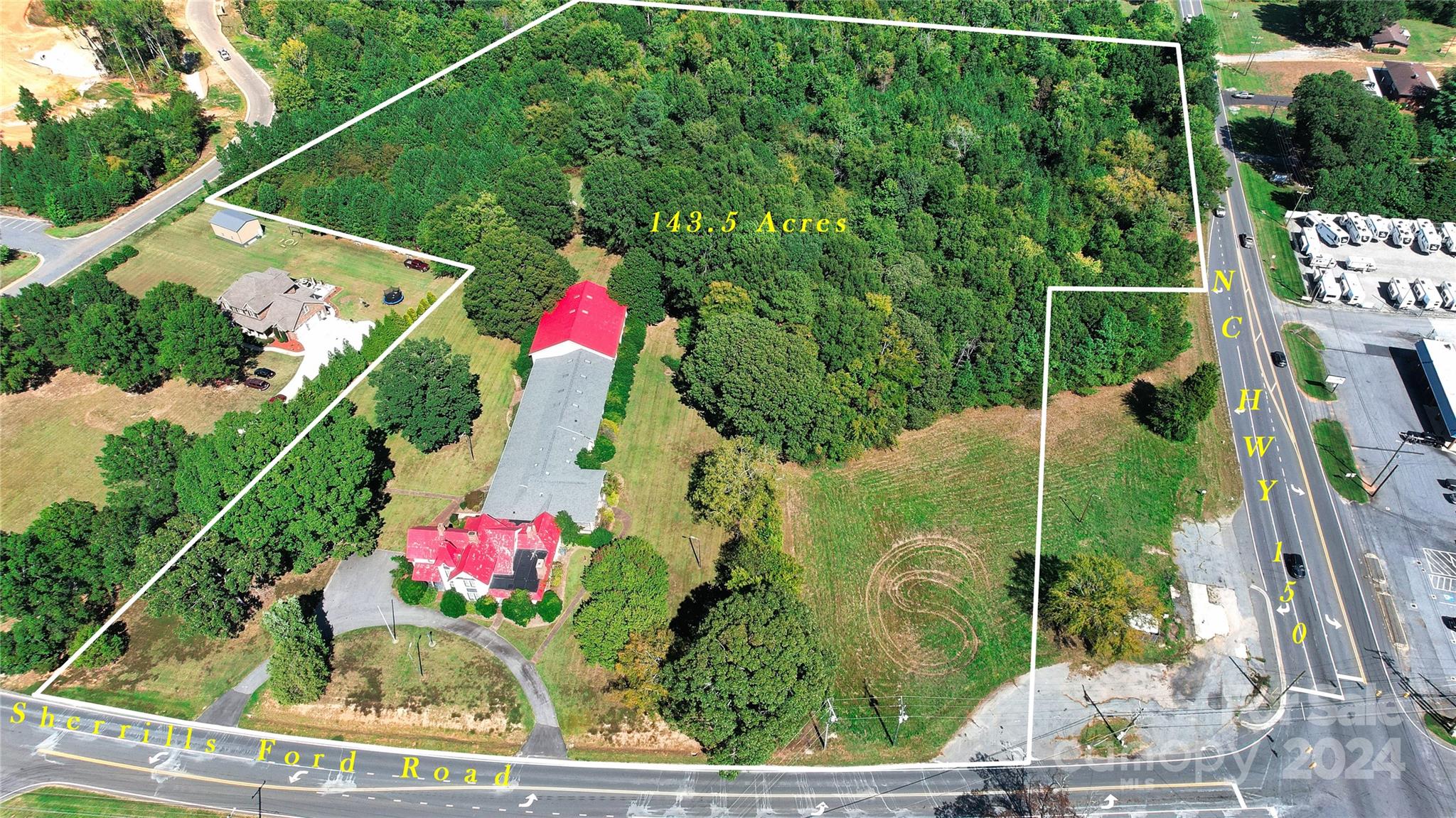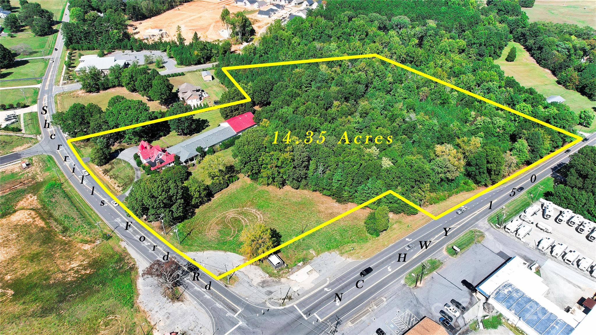 Entitled PUD up to a maximum of 141,000 sq. ft. on ground floor retail/commercial/mixed use. Hard corner at Hwy. 150 and Sherrills Ford Road Red light corner. The front part of a Historic building is located on this property or would require state approval to move, however It would be great to incorporate into the theme of the development. Entitlement reads: A portion of the development meeting the intent of the storefront (Area 2) village center to serve as the core containing a variety of retail shops and services in a manner consistent with a small downtown or central market place in the community. Any other use would need to be rezoned. • Max. 141,000 SF Commercial Space • Max. 400 2nd/3rd Floor Multi-Family Units