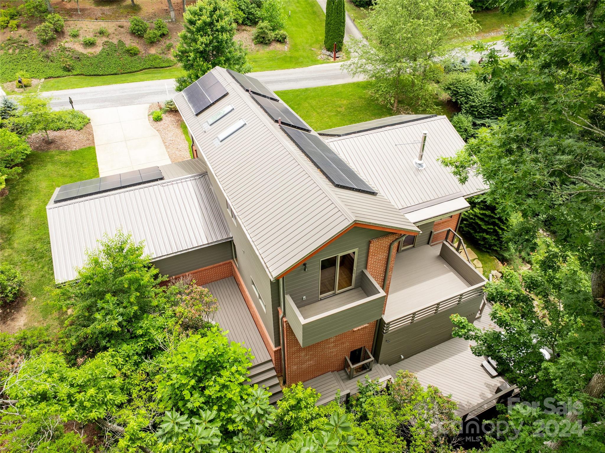 This green built (Pearl Gold Certified) home is Net-Zero Ready due to its roof mounted 14.6 kw solar panel array and two Tesla Powerwalls. Inspired by architect Frank Lloyd Wright, with local pine siding and white oak floating staircase crafted from on-site milled wood, showcasing quality local resources. Custom wood cabinets, trim, lighting, and interior doors enhance the home's minimalist yet warm design. The upper and main level have vaulted ceilings, hard wood floors, and ample natural light. The main level has an open floor plan, kitchen island, wood stove and a multi-level deck with retractable awning, hot tub, and winter mountain views. Primary suite features heated tile floors in the bathroom. Two of three upstairs bedrooms have their own balconies. Walk-out finished basement with guest quarters and gym. Close to Asheville, Blue Ridge Parkway, Bent Creek hiking and biking trails, and Tesla fast-charging EV stations. Agent owned and occupied; some furniture is negotiable.