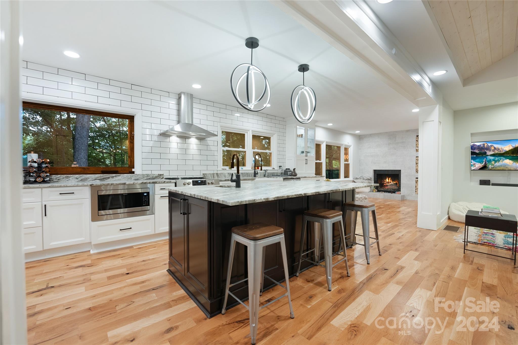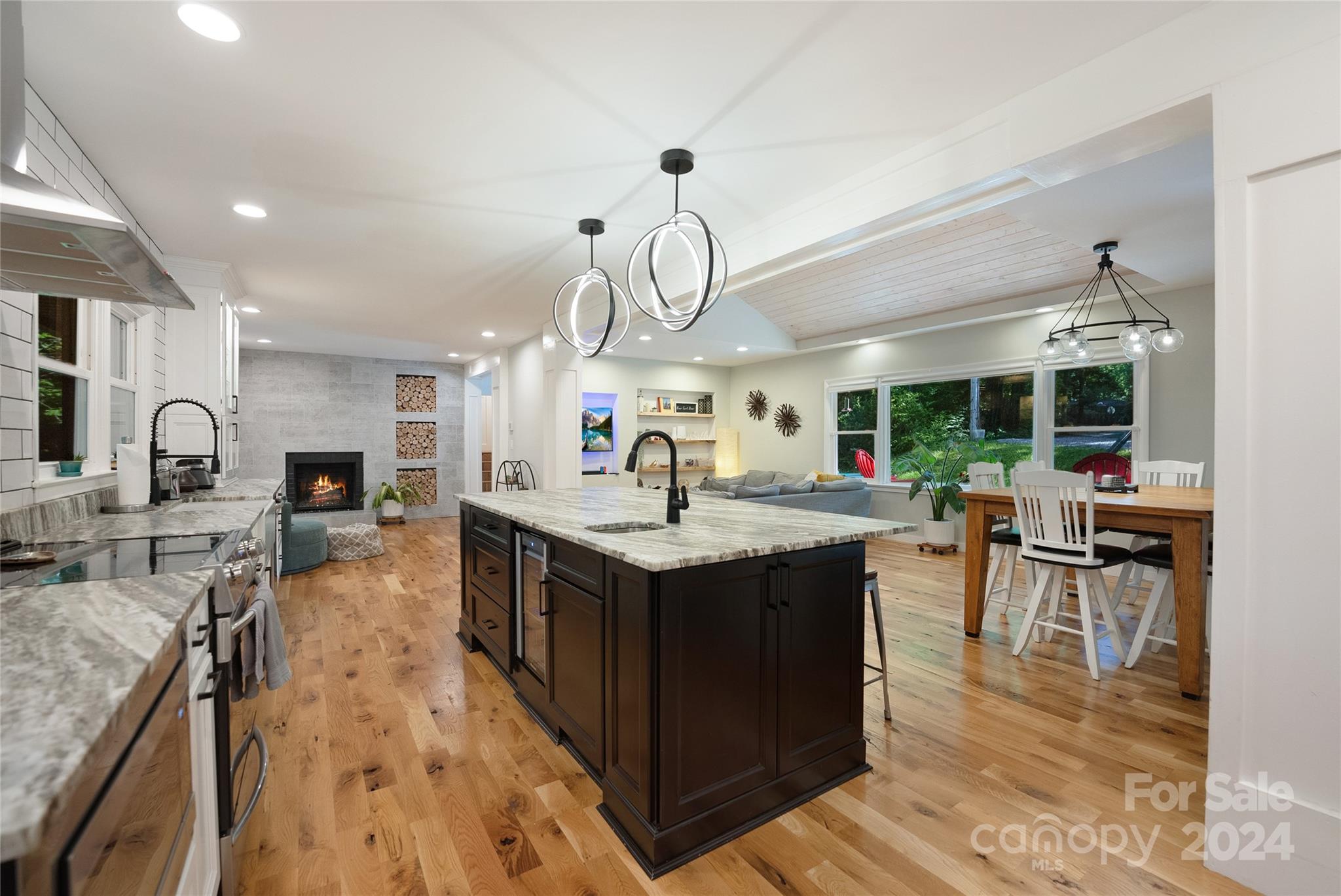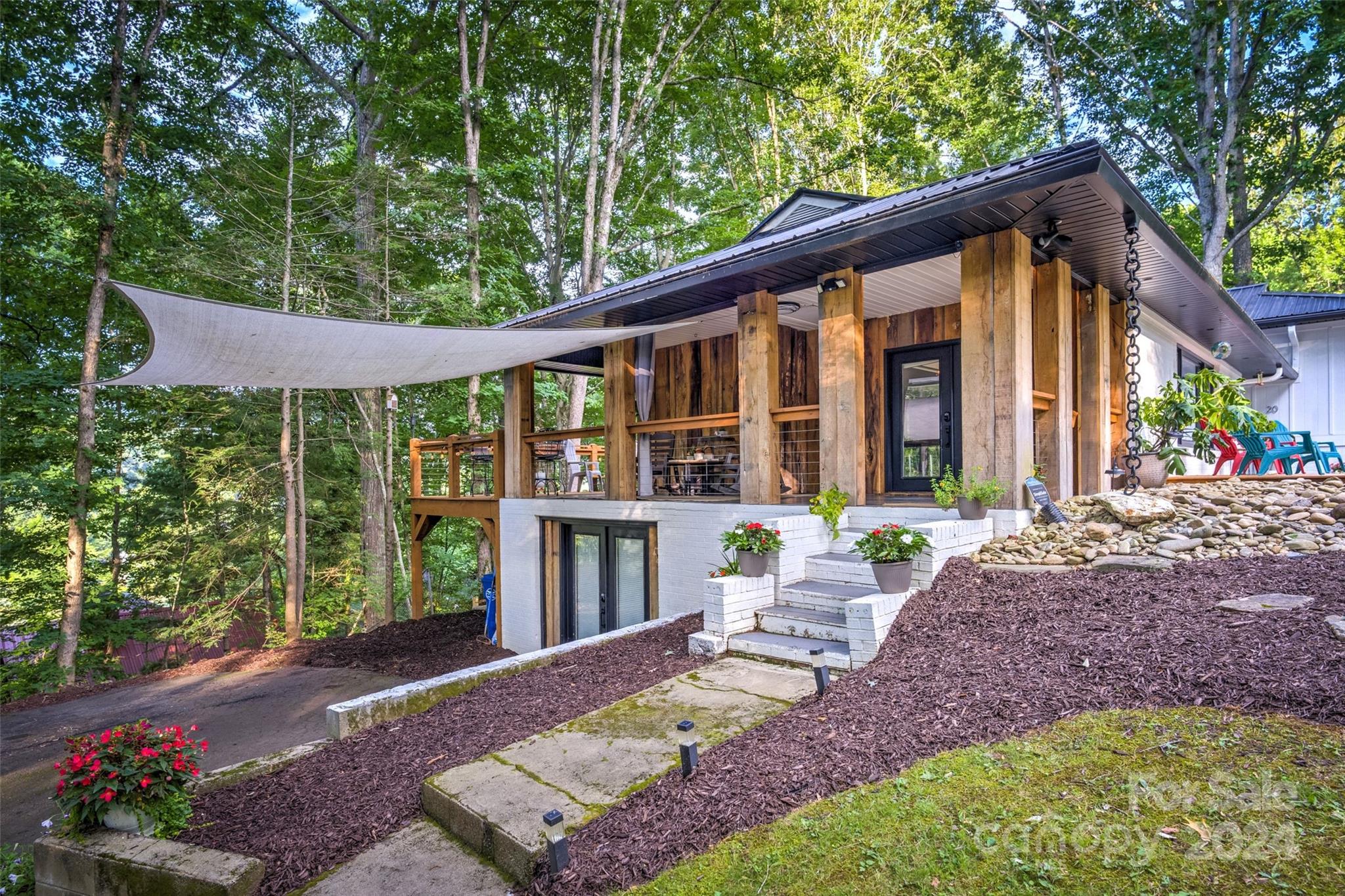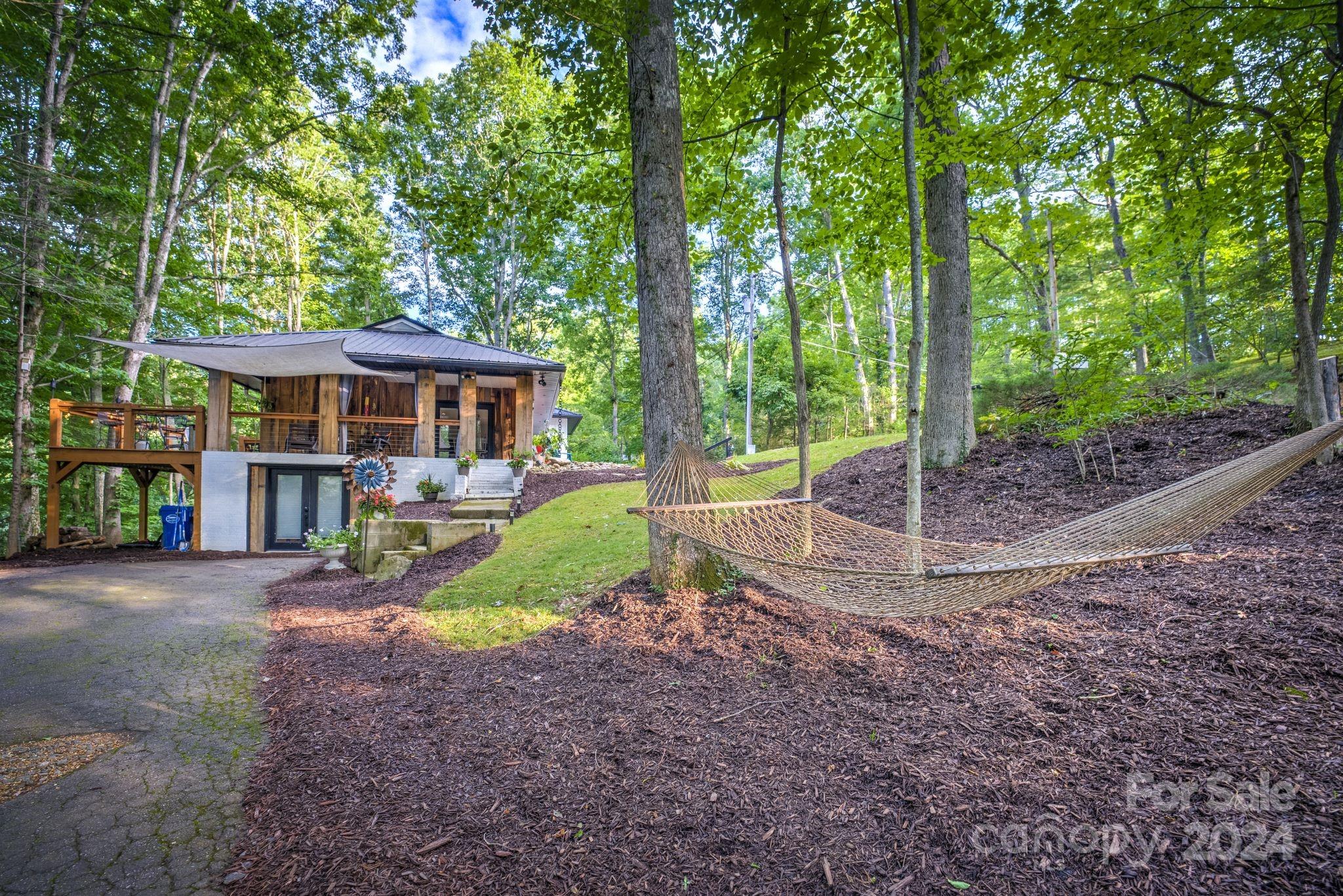 This expertly updated home sits just above the Waynesville Country Club on a wooded lot offering both the feeling of privacy with the convenience of all that Waynesville has to offer. The custom design captures the character you want in the mountains without sacrificing the modern accents / amenities you want. Through the entrance you'll find a light filled great room with a dream kitchen, oversized island with prep sink, built in fridge surrounded by cabinets galore. Cozy living room, dining space, and separate sitting area with fireplace and stunning accent wall. Upstairs there is an incredible primary suite with an oversized shower with Bluetooth speaker system, double shower with additional rain shower-head, free standing tub and coffee bar. Down the stairs find two additional bedrooms and a separate bath and continue down again to a wonderful daylight great room currently utilized as an office / music studio accessible from inside or through a separate entrance to the driveway.