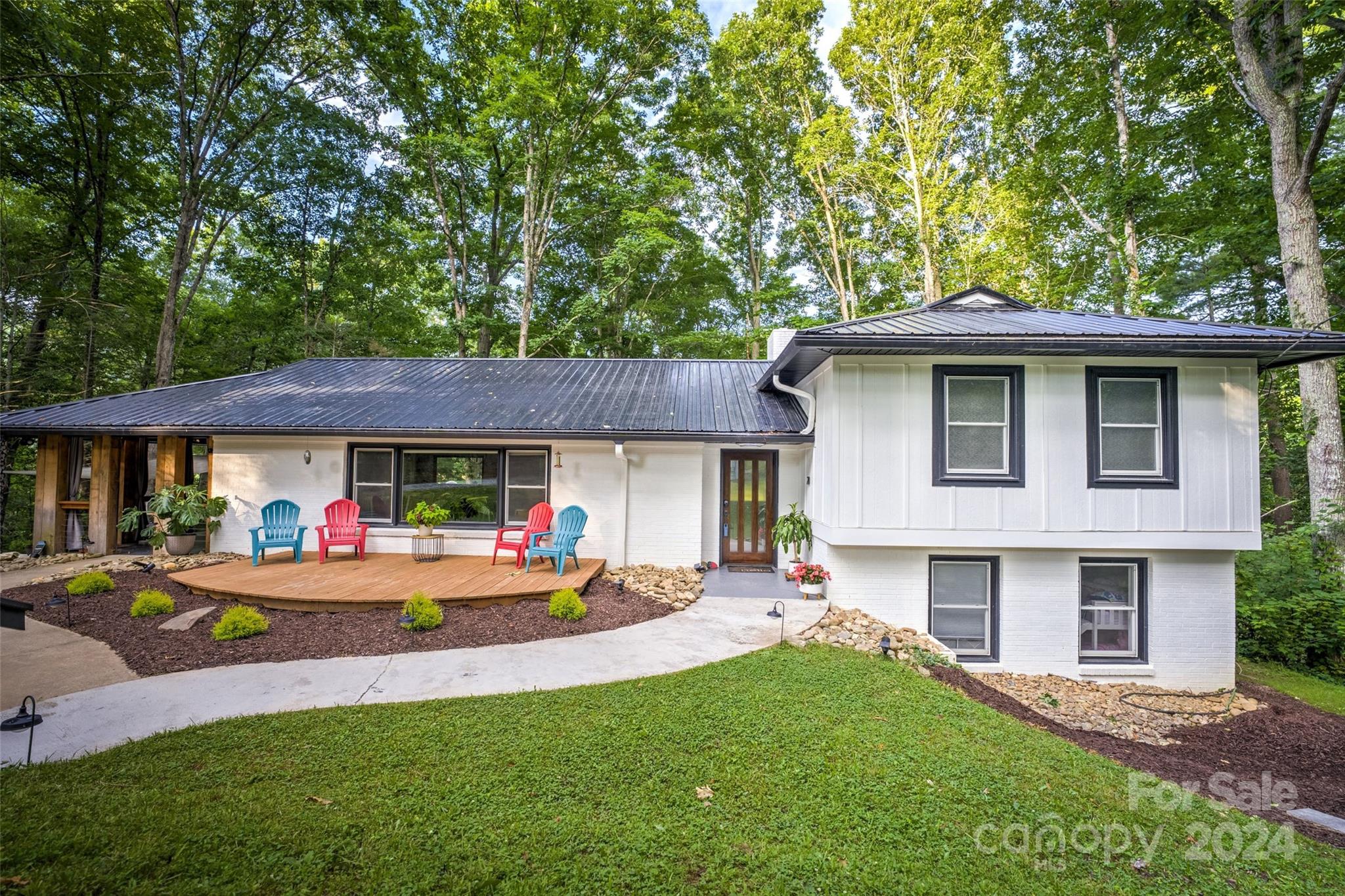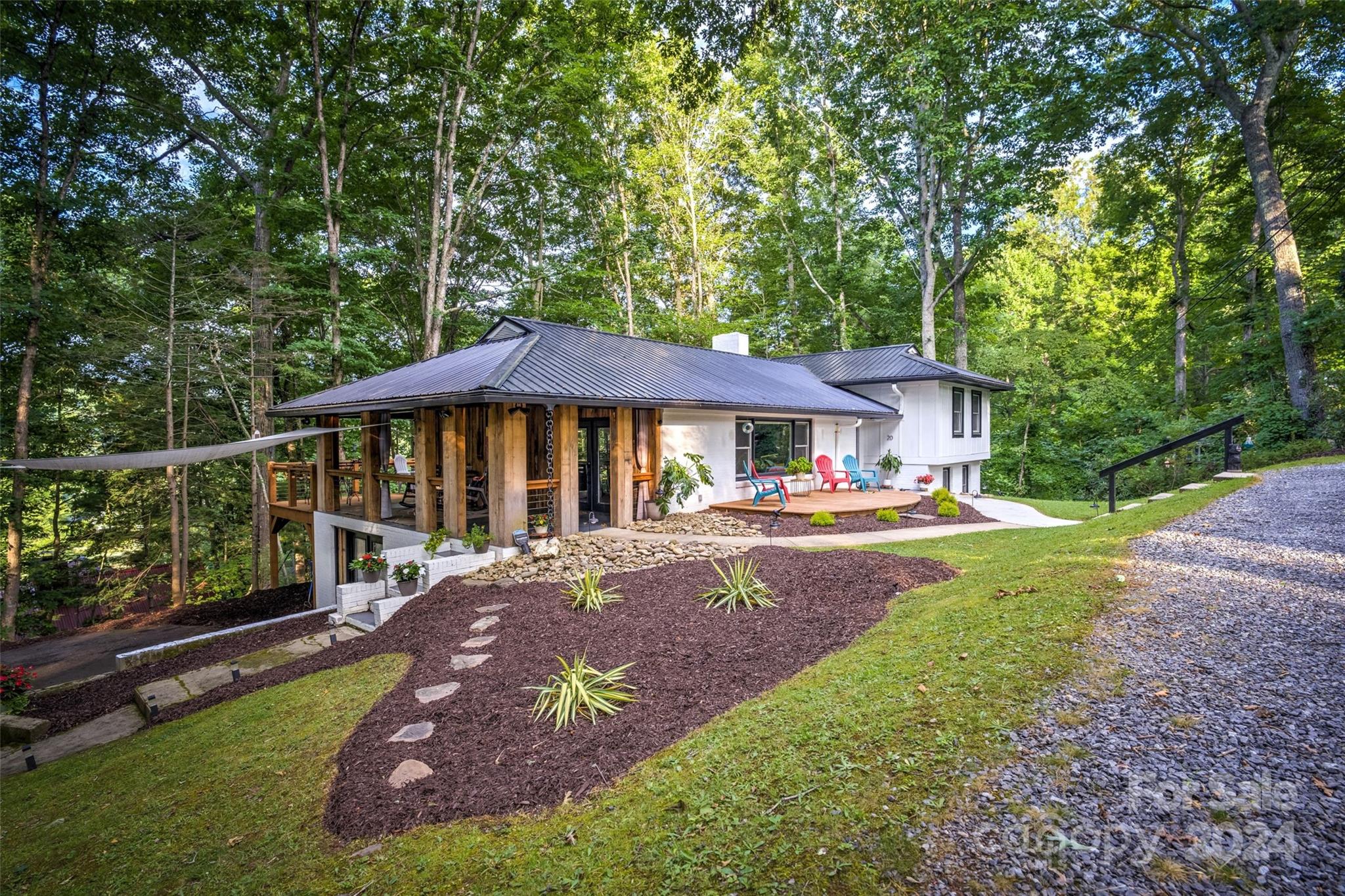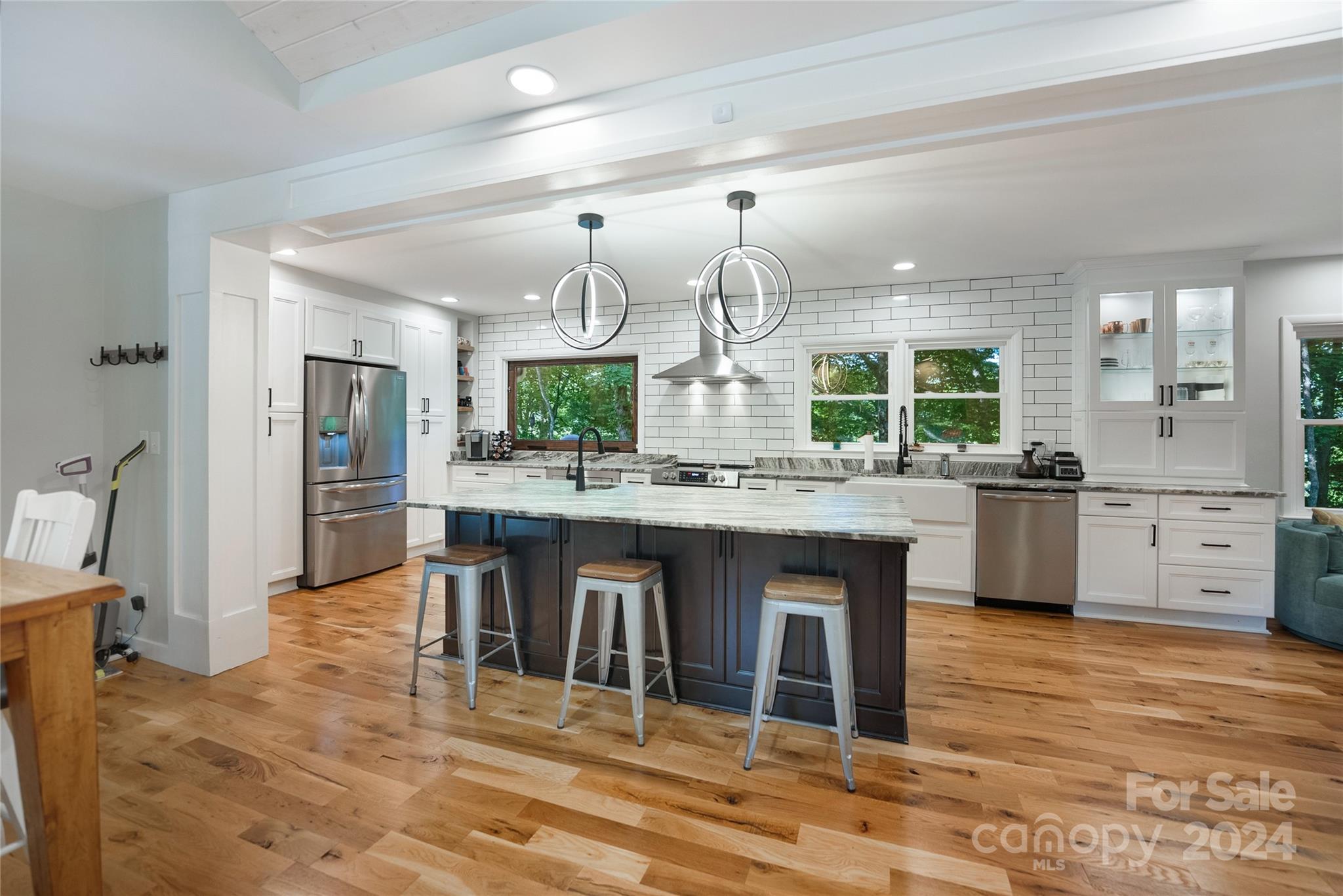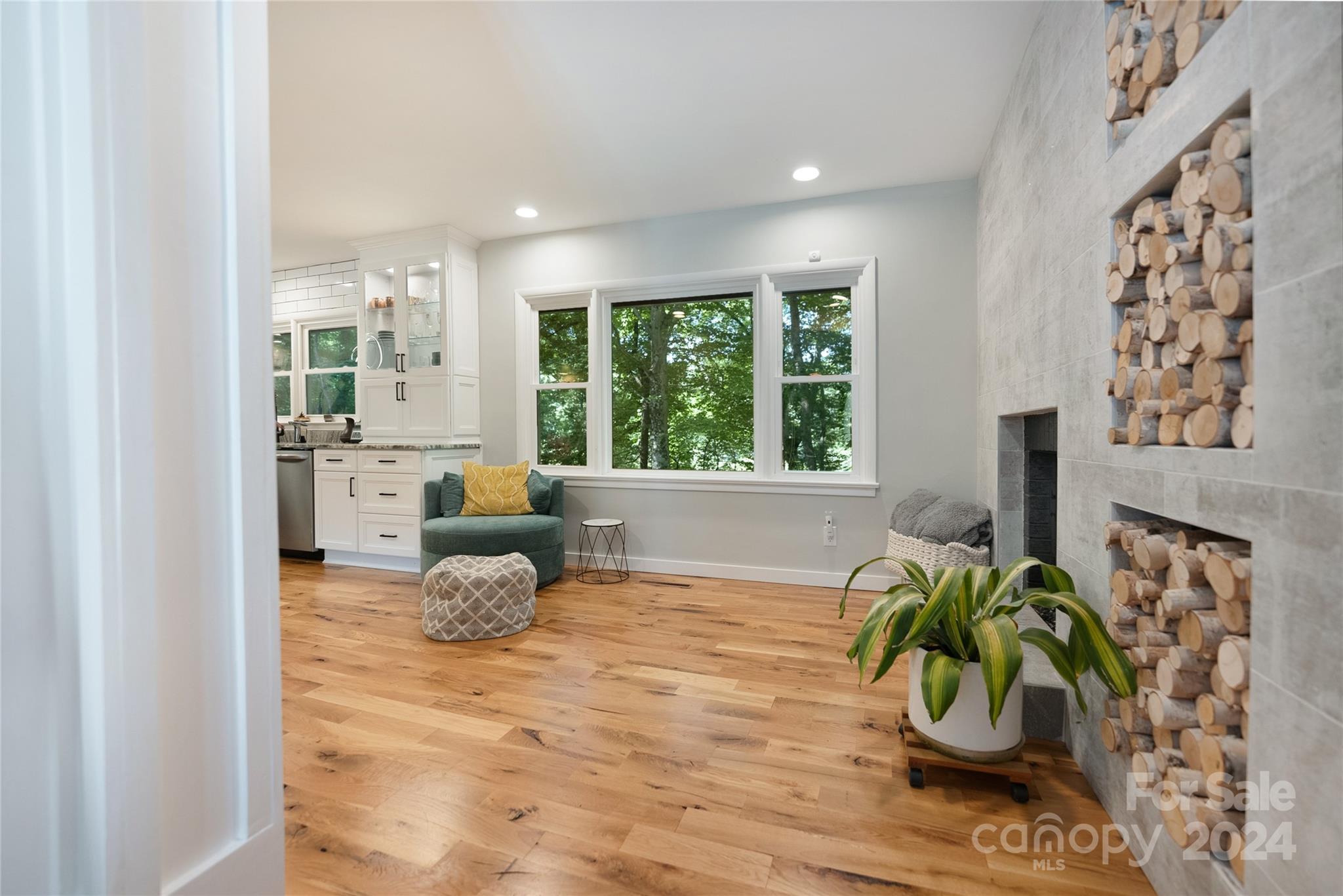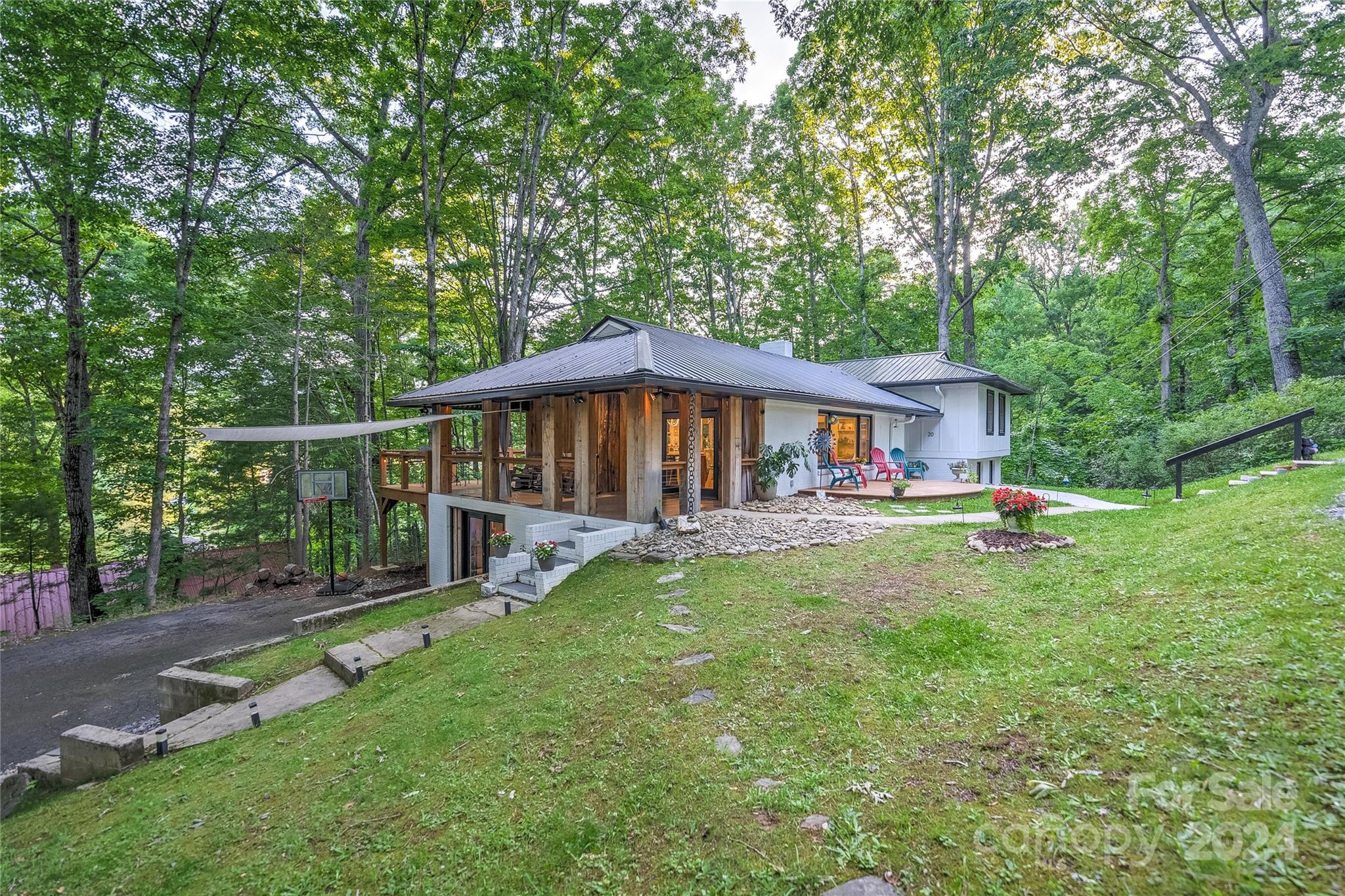 This expertly updated home sits just above the Waynesville Country Club on a wooded lot offering both the feeling of privacy with the convenience of all that Waynesville has to offer. The custom design captures the character you want in the mountains without sacrificing the modern accents / amenities you want. Through the entrance you'll find a light filled great room with a dream kitchen, oversized island with prep sink, built in fridge surrounded by cabinets galore. Cozy living room, dining space, and separate sitting area with fireplace and stunning accent wall. Upstairs there is an incredible primary suite with an oversized shower with Bluetooth speaker system, double shower with additional rain shower-head, free standing tub and coffee bar. Down the stairs find two additional bedrooms and a separate bath and continue down again to a wonderful daylight great room currently utilized as an office / music studio accessible from inside or through a separate entrance to the driveway.