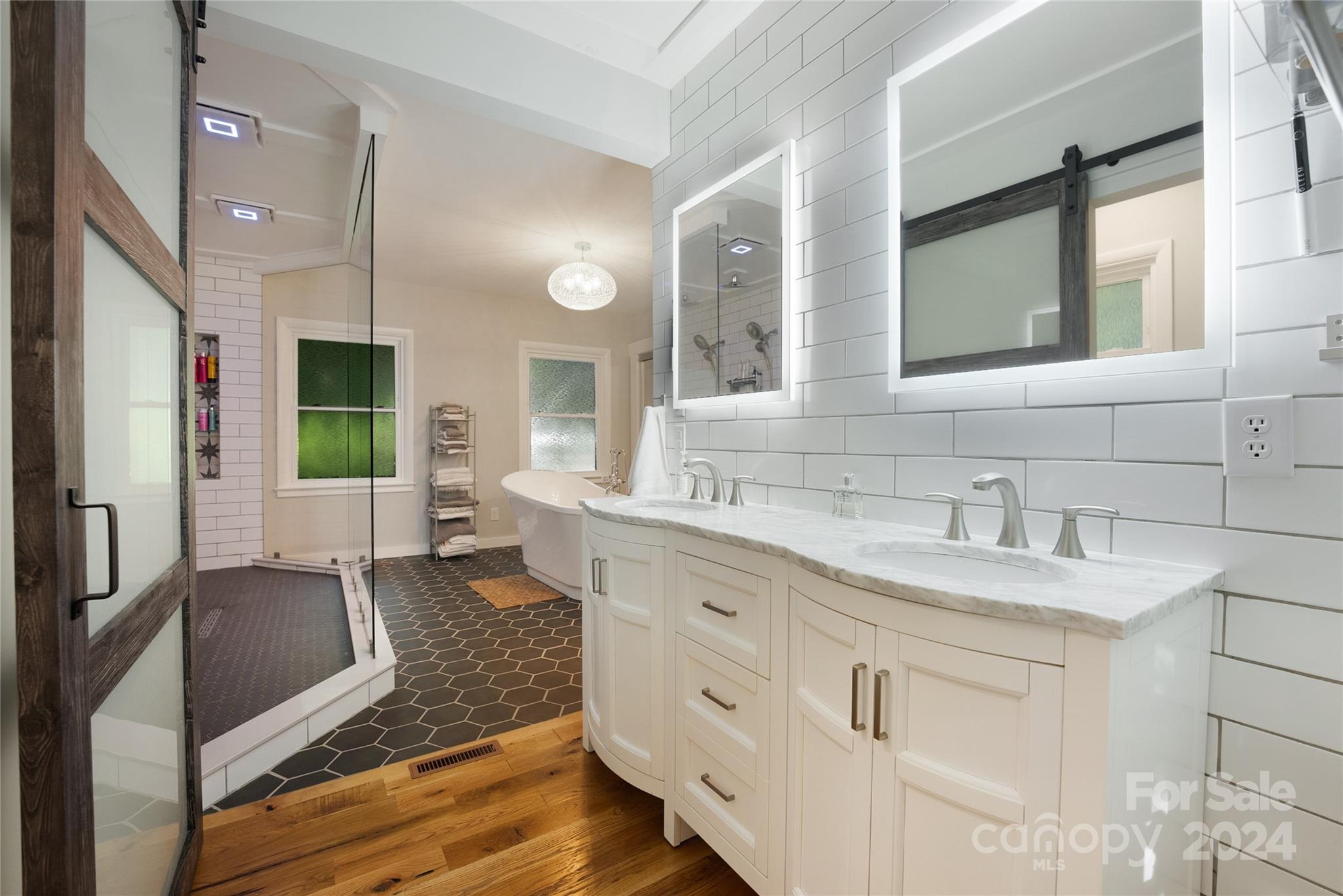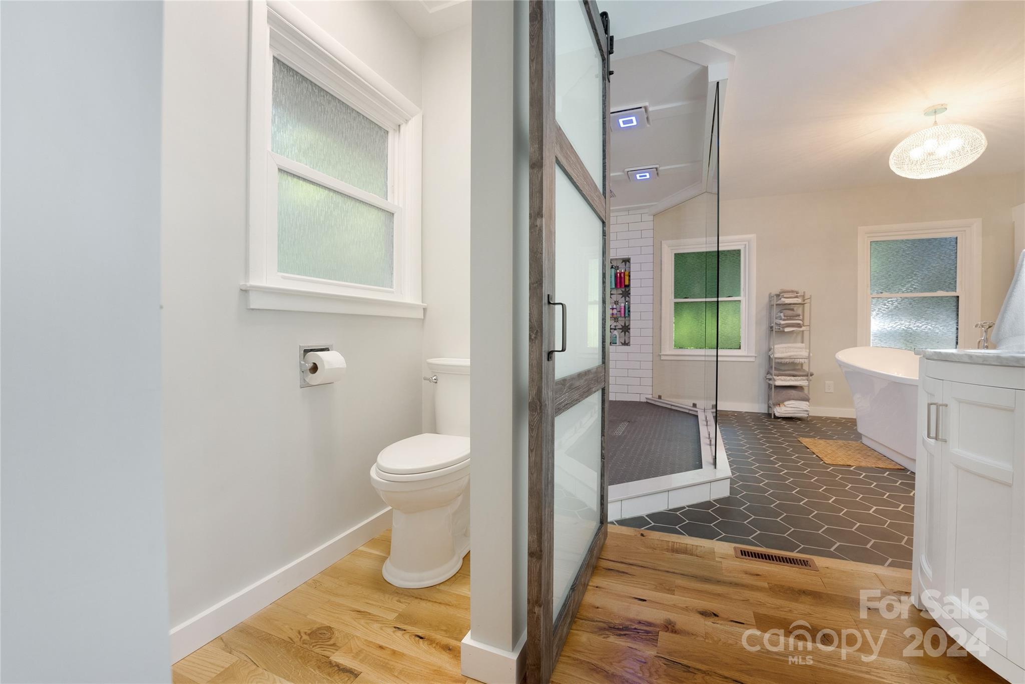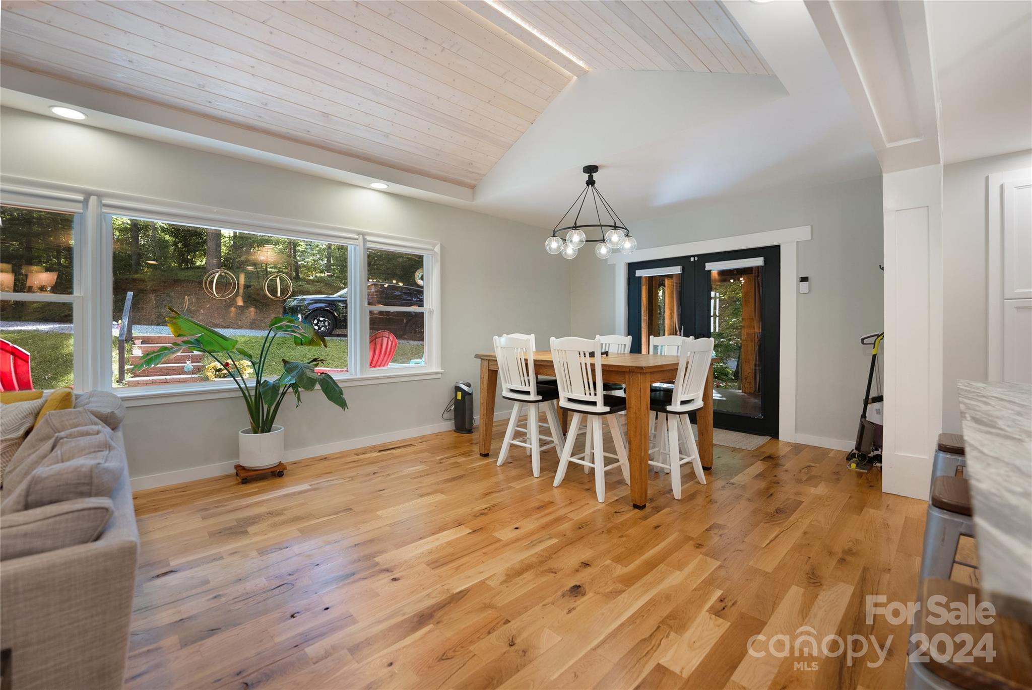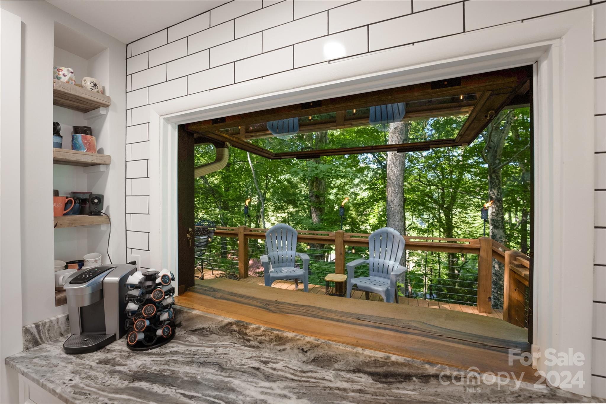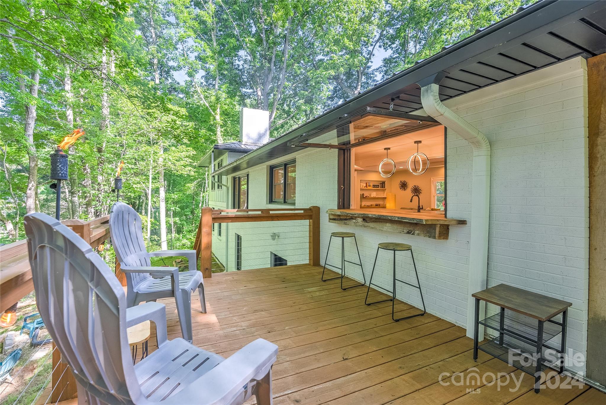 This expertly updated home sits just above the Waynesville Country Club on a wooded lot offering both the feeling of privacy with the convenience of all that Waynesville has to offer. The custom design captures the character you want in the mountains without sacrificing the modern accents / amenities you want. Through the entrance you'll find a light filled great room with a dream kitchen, oversized island with prep sink, built in fridge surrounded by cabinets galore. Cozy living room, dining space, and separate sitting area with fireplace and stunning accent wall. Upstairs there is an incredible primary suite with an oversized shower with Bluetooth speaker system, double shower with additional rain shower-head, free standing tub and coffee bar. Down the stairs find two additional bedrooms and a separate bath and continue down again to a wonderful daylight great room currently utilized as an office / music studio accessible from inside or through a separate entrance to the driveway.
