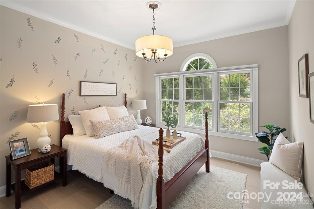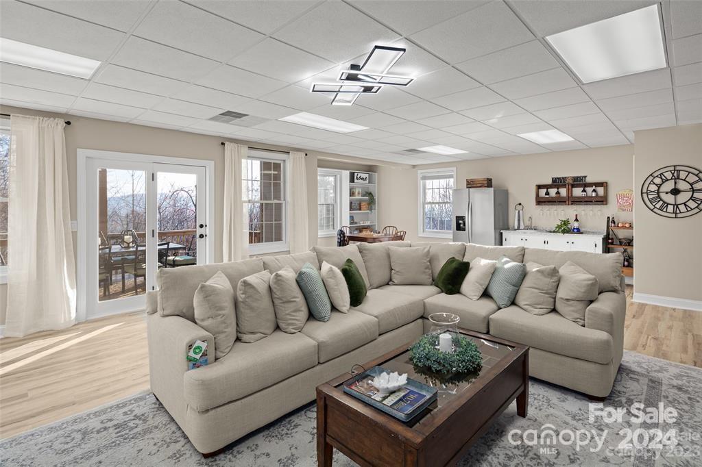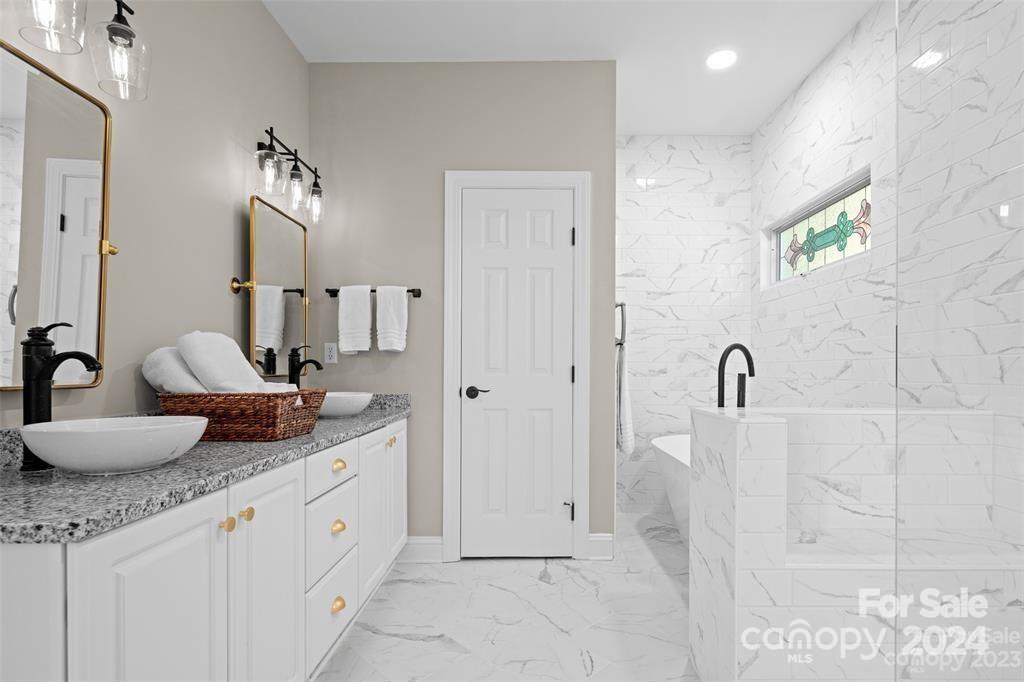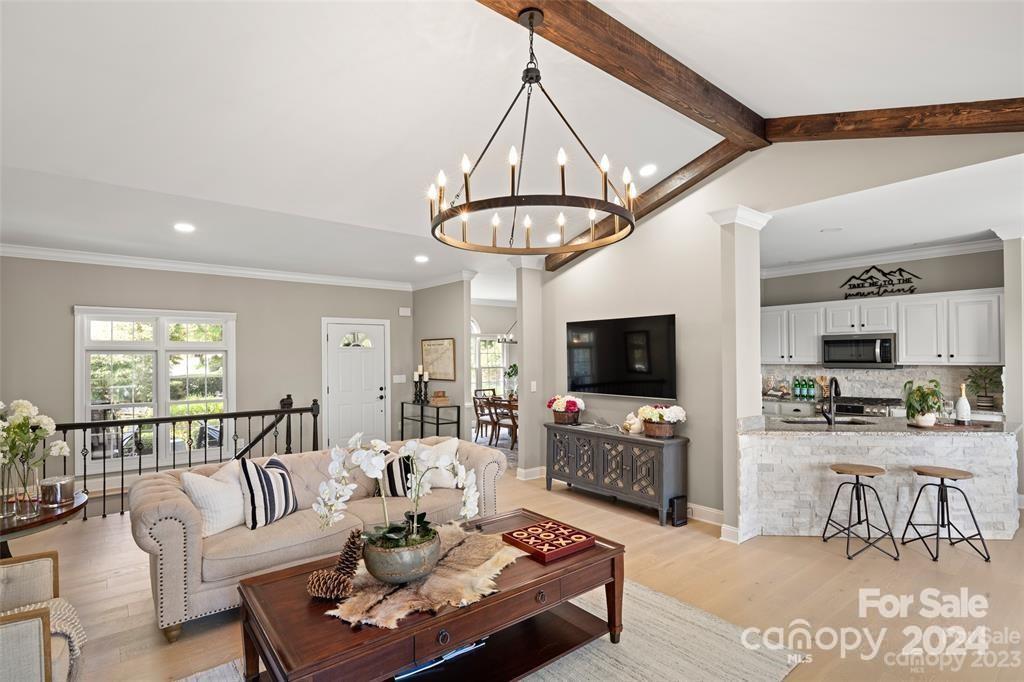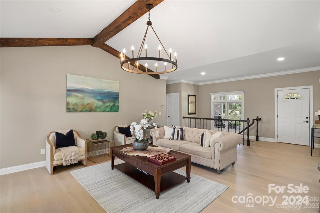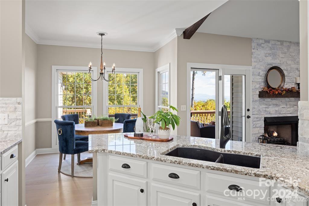 Welcome to 301 Governors Drive located inside the guard-gated subdivision of prestigious Carriage Park! This 4b/3ba luxury home is sited atop one of the highest points in the area offering breathtaking panoramic views. Renovation completed in 2024 - a design of modern mountain chic meets casual flair. Enjoy fresh mountain air from 2 refinished upper and lower-level terraces. Main level exudes easy-living: includes the magnificent great room with marble gas fireplace and custom wooden beams, large dining room, 2 guest rooms and guest bath, laundry room, and luxurious primary suite. Lower level features a large family room, kitchenette, bedroom and full bath, bonus room, and a new wine room behind the "secret" bookcase/door. New roof is being installed Nov 2024. Carriage Park is conveniently located 8 miles from the Asheville Airport and just minutes from charming downtown Hendersonville and offers tennis and pickleball courts, walking trails, ponds, and clubhouse with indoor pool.