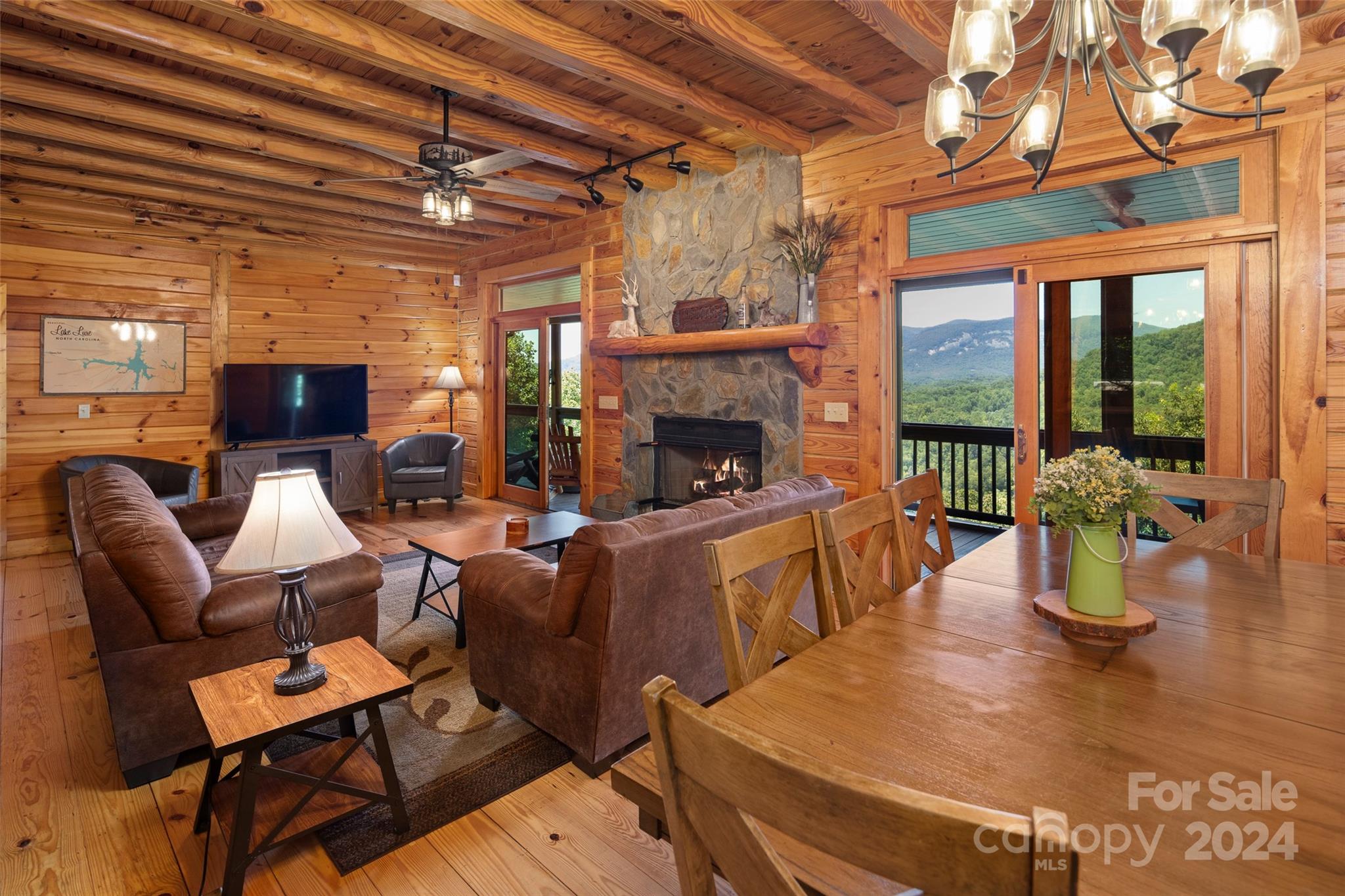 Enjoy the incredible mountain and lake views from this gorgeous 3BR+BONUS log cabin in Rumbling Bald on Lake Lure. TWO primary suites on the main level with attached full bathrooms, stone gas fireplace in the living room and spacious kitchen with stainless steel appliances. Upper level features bedroom & bonus room each with it's own bathroom and massive play or rec room! The basement den features lots of windows for natural light along with the laundry room, unfinished storage and mechanical room. Take in the scenery by the fire pit or sit on the back covered porch or even the screened portion. Plenty of parking and gorgeously landscaped. Successful vacation rental and offered fully furnished! Rumbling Bald amenities include private beach, marina, two golf courses, indoor & outdoor pools, tennis courts, fitness center, spa, & 2 restaurants with outdoor dining. One-time Rumbling Bald POA Initiation fee of $10,00 for new members.