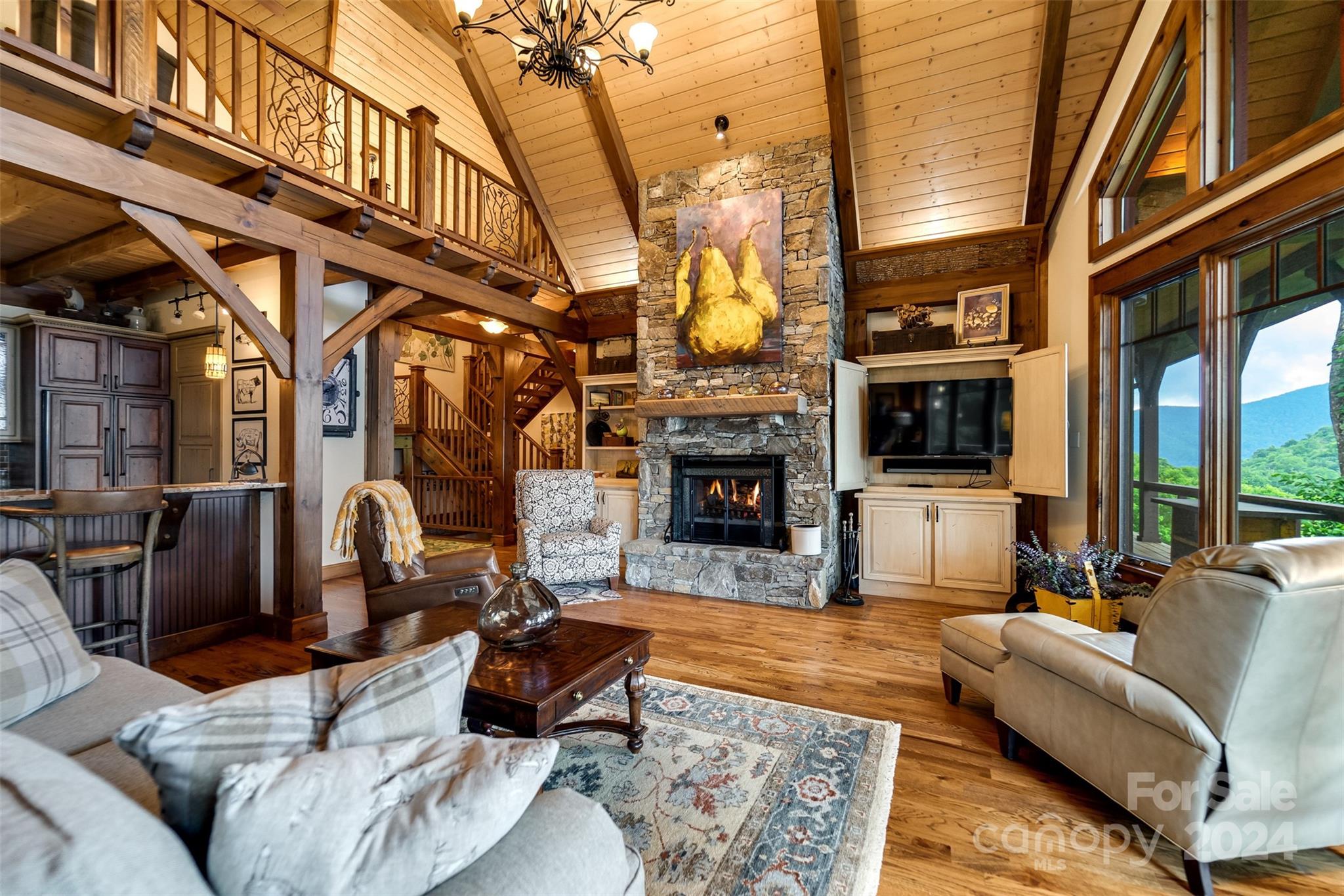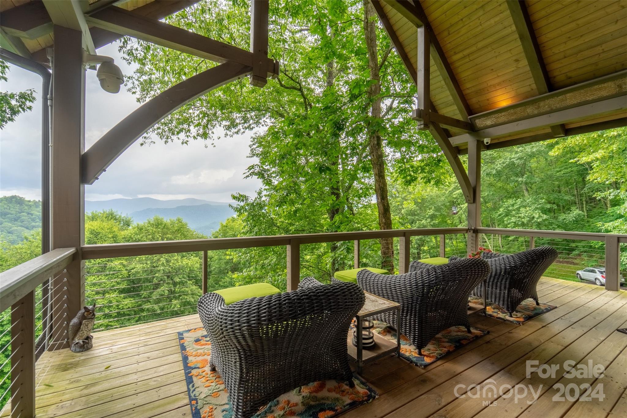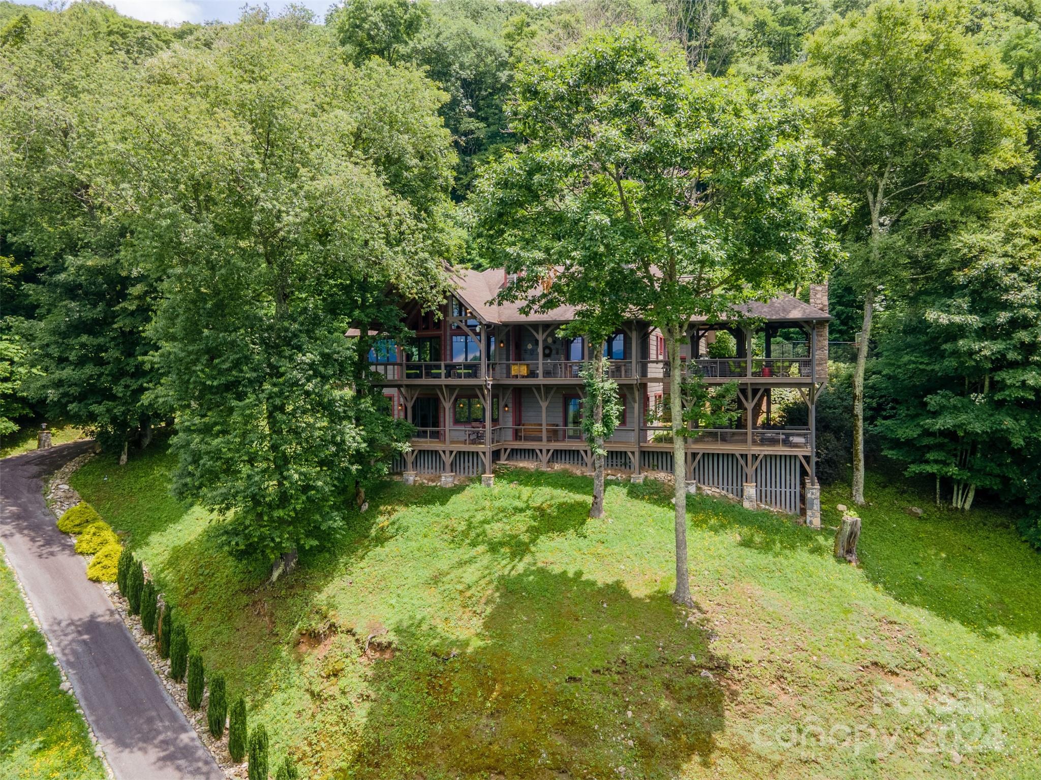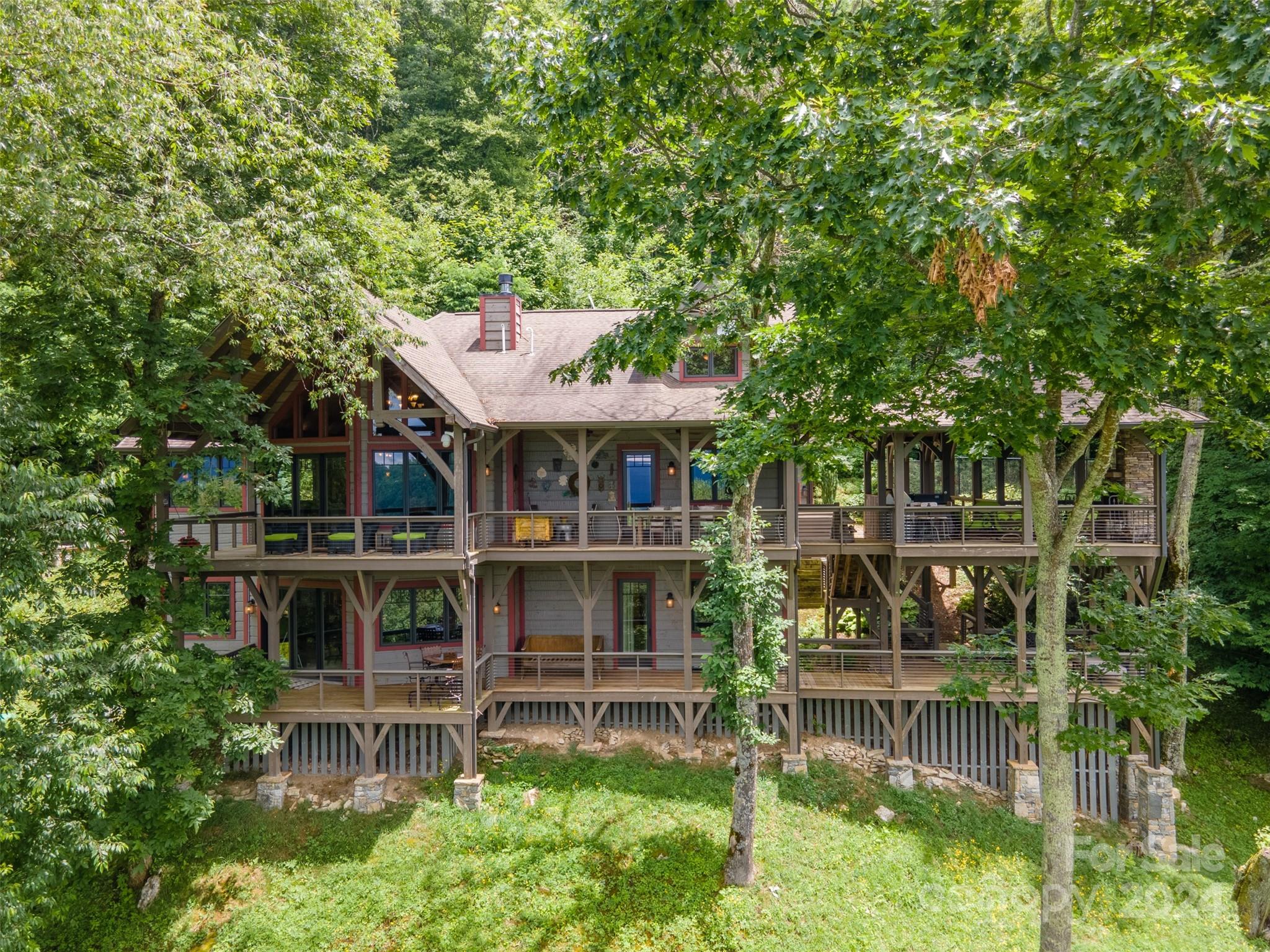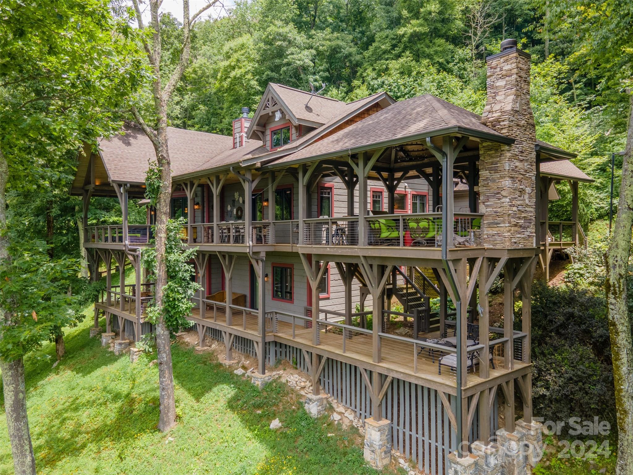 Nestled in the Smoky Mountains between Waynesville and Maggie Valley, this Smoky Mountain Retreat at Eagles Nest residence is a custom-built post and beam home. Enjoy year-round crisp mountain air and stunning 180-degree mountain views in this four-bedroom, 4.5-bath residence. The home features custom lighting, two expansive decks (one with an outdoor wood-burning fireplace and Viking gas grill), and a gourmet kitchen with knotty alder cabinets and granite countertops. It includes three primary bedrooms with walk-in closets, a five-bed bunk room, two living areas with fireplaces, a whole-home generator and alarm system. Partially furnished and move-in ready. This home ensures a serene escape with well-maintained private roads and captivating natural beauty.