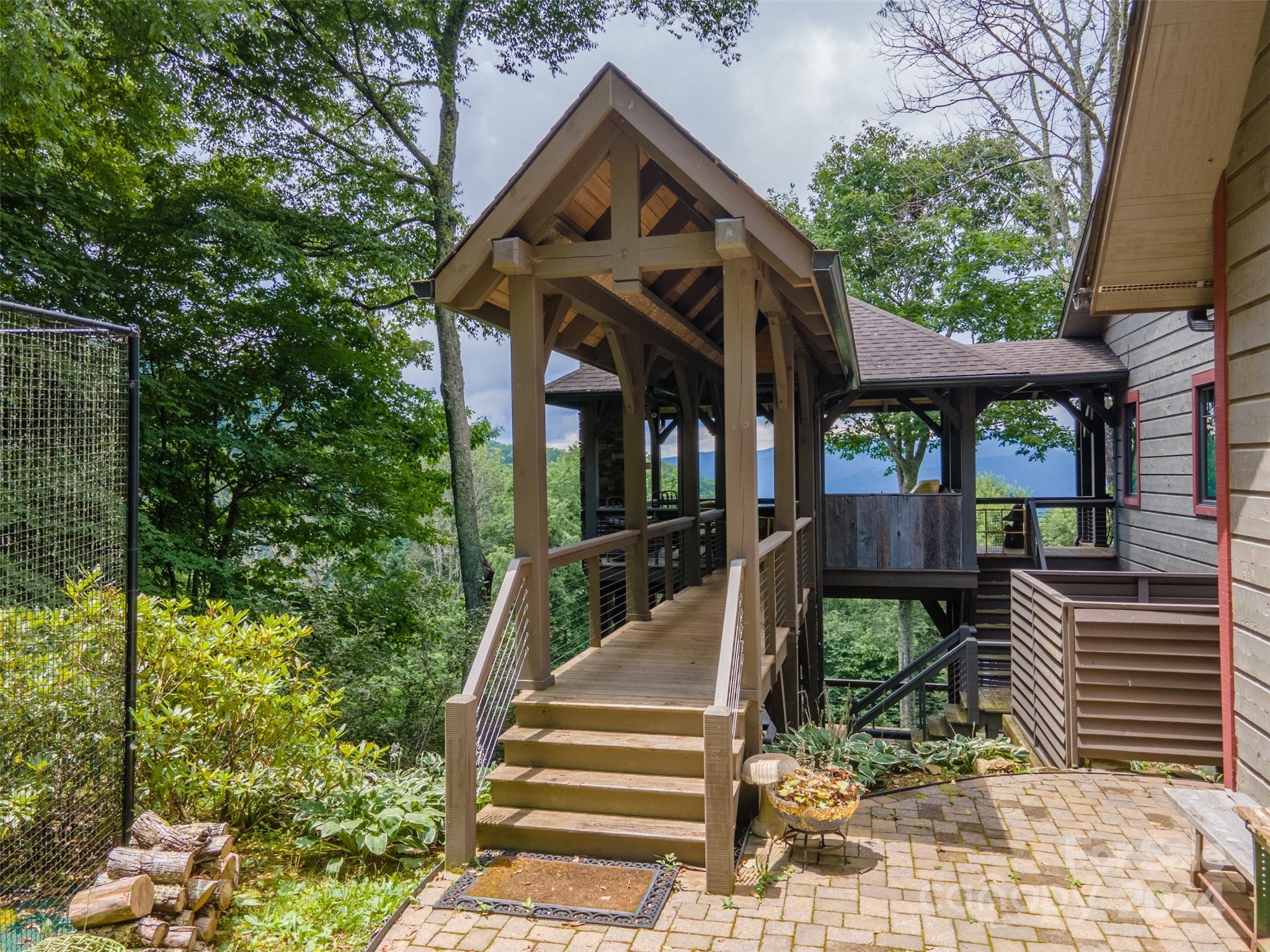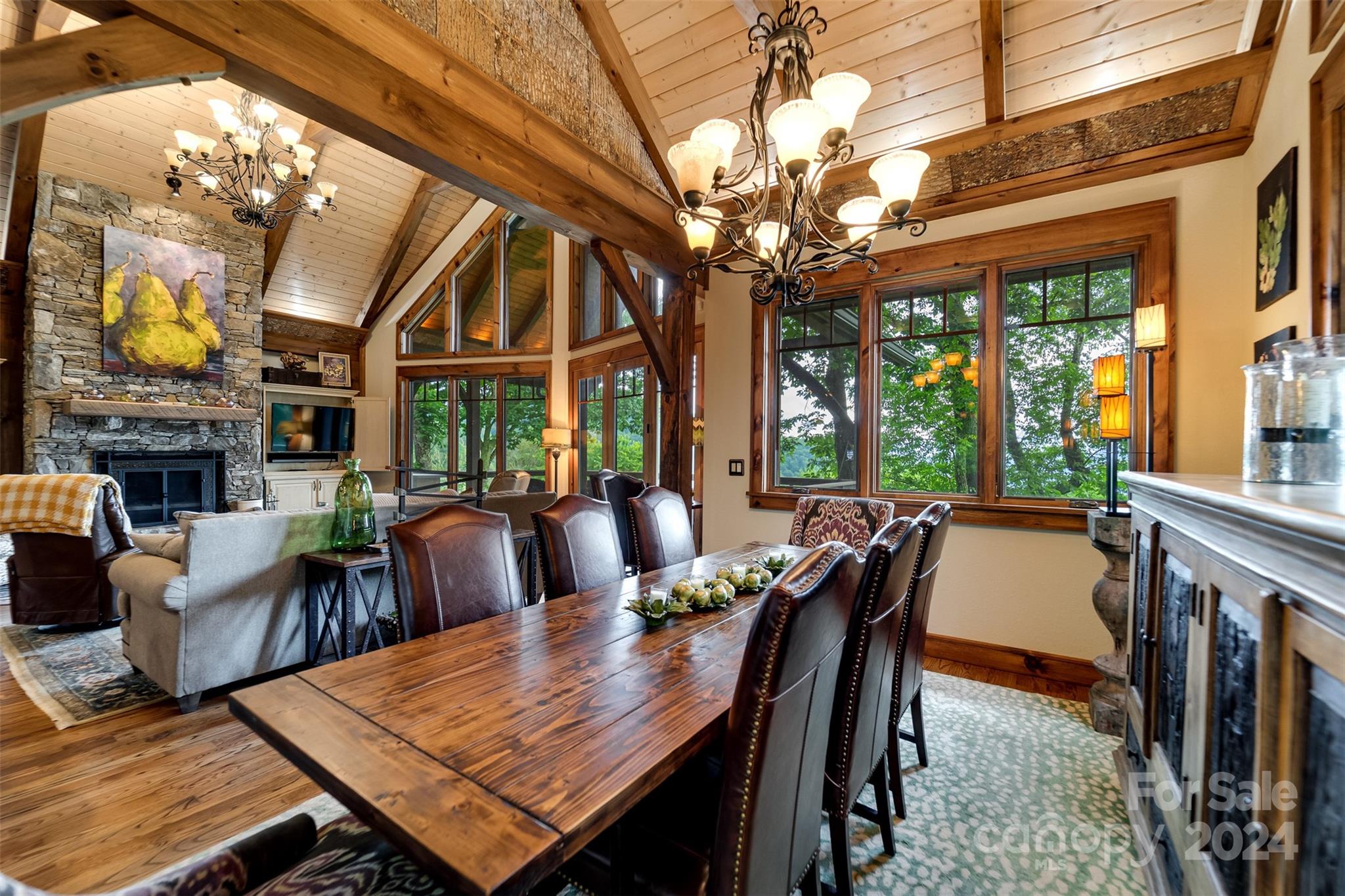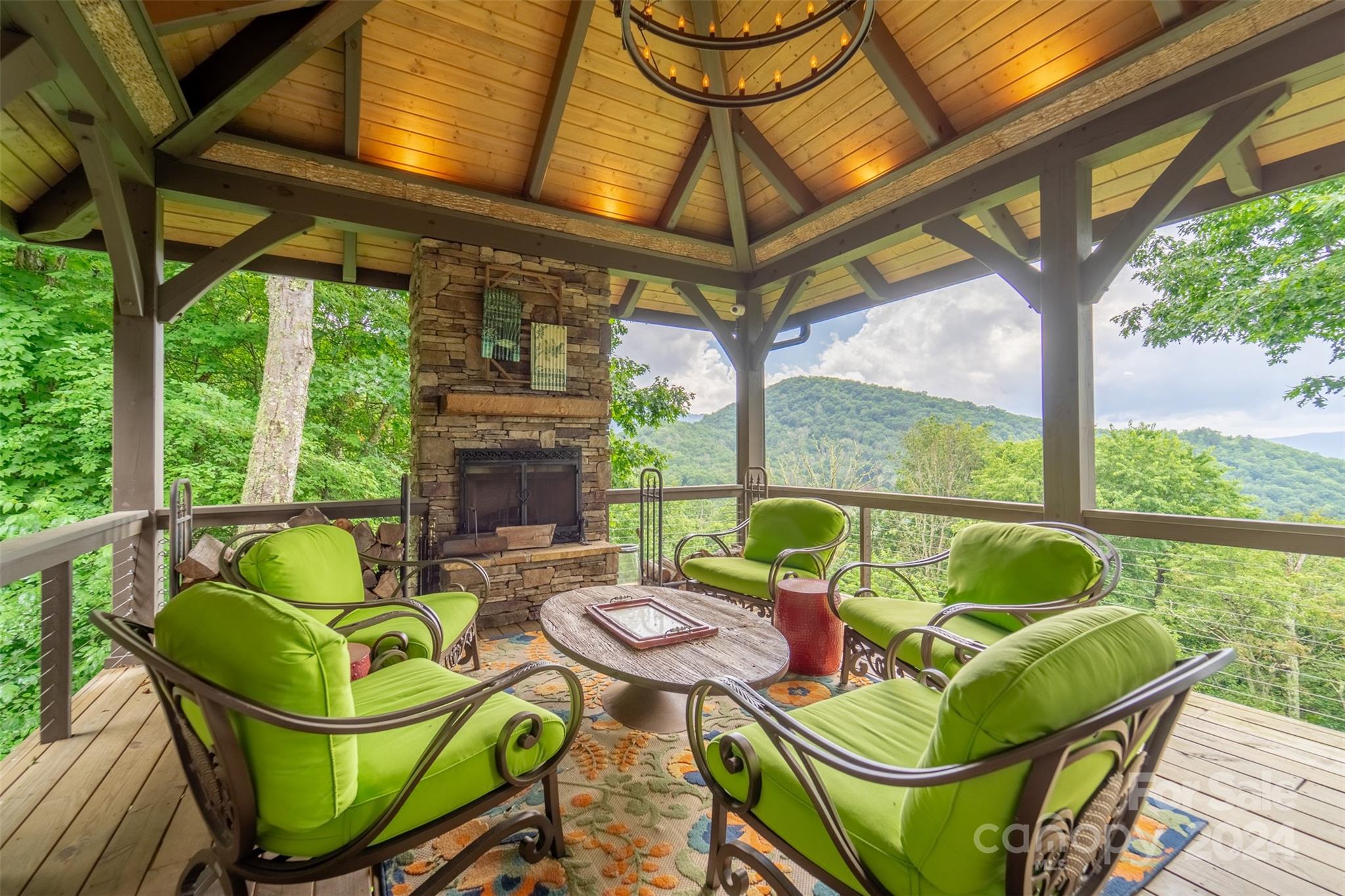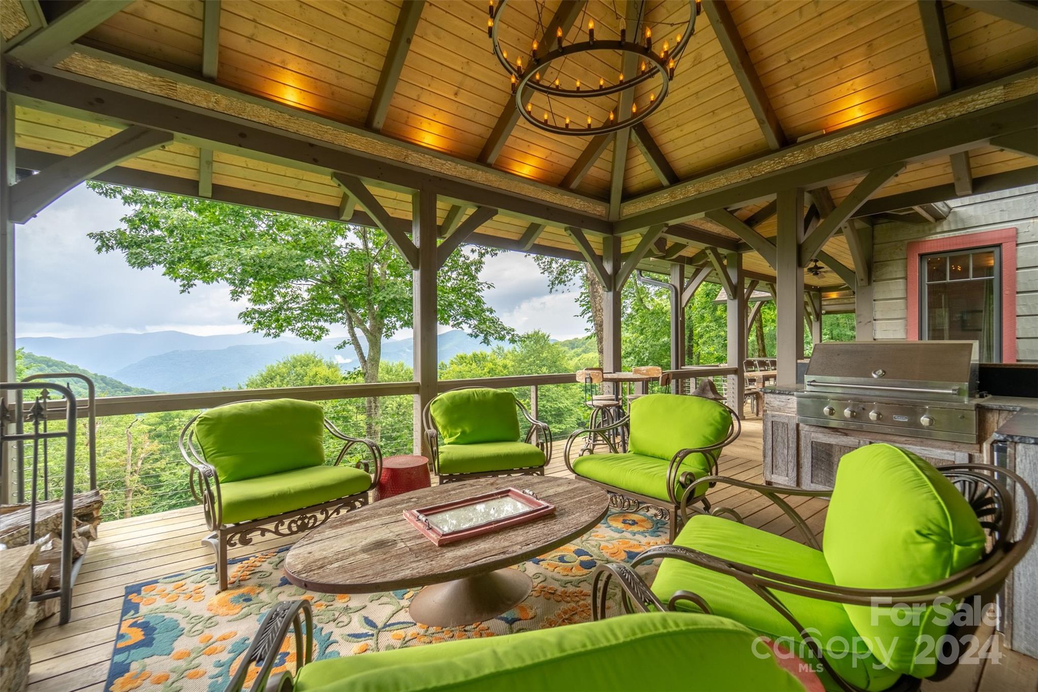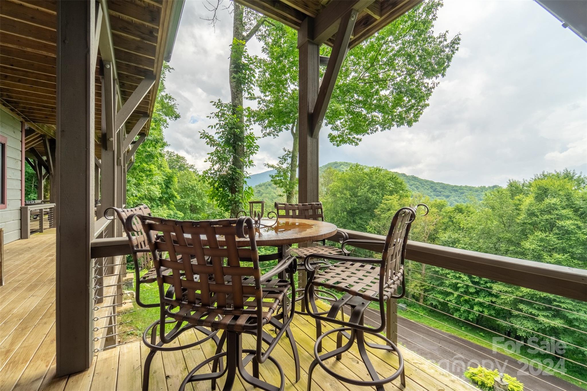 Nestled in the Smoky Mountains between Waynesville and Maggie Valley, this Smoky Mountain Retreat at Eagles Nest residence is a custom-built post and beam home. Enjoy year-round crisp mountain air and stunning 180-degree mountain views in this four-bedroom, 4.5-bath residence. The home features custom lighting, two expansive decks (one with an outdoor wood-burning fireplace and Viking gas grill), and a gourmet kitchen with knotty alder cabinets and granite countertops. It includes three primary bedrooms with walk-in closets, a five-bed bunk room, two living areas with fireplaces, a whole-home generator and alarm system. Partially furnished and move-in ready. This home ensures a serene escape with well-maintained private roads and captivating natural beauty.