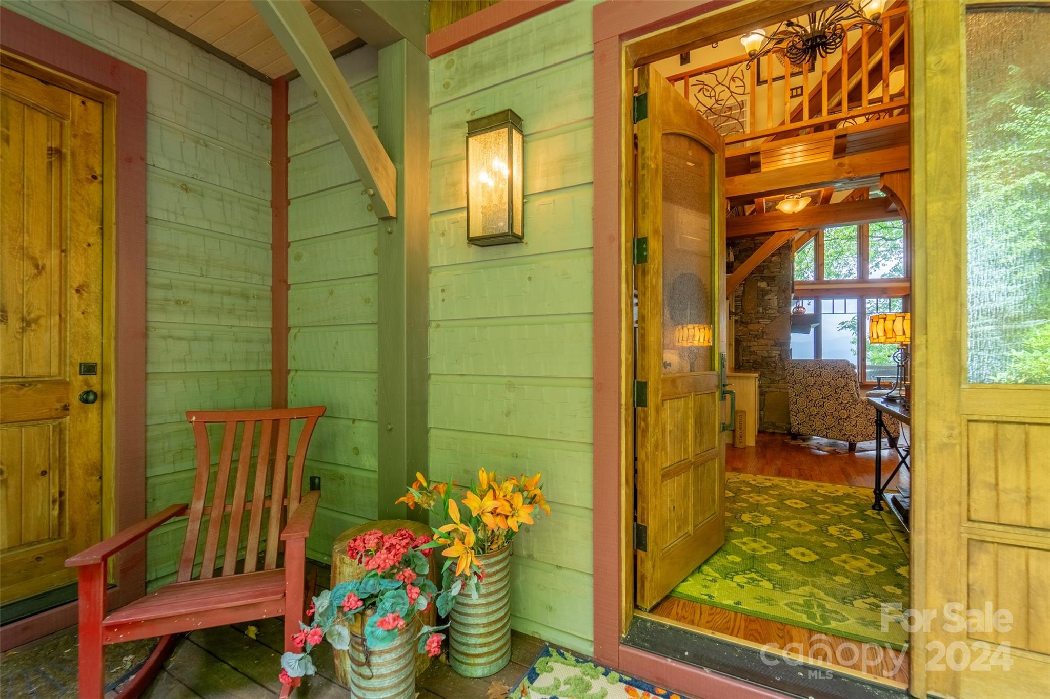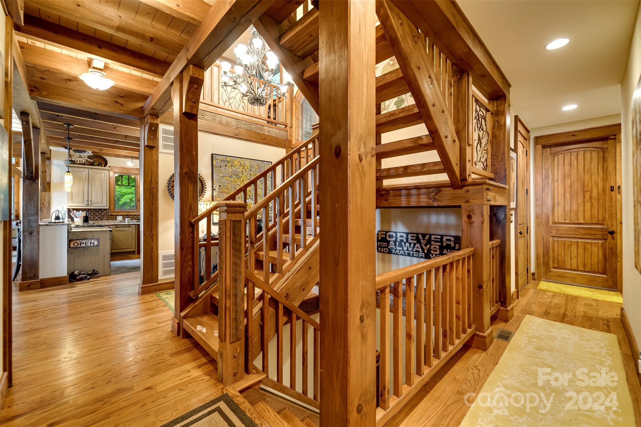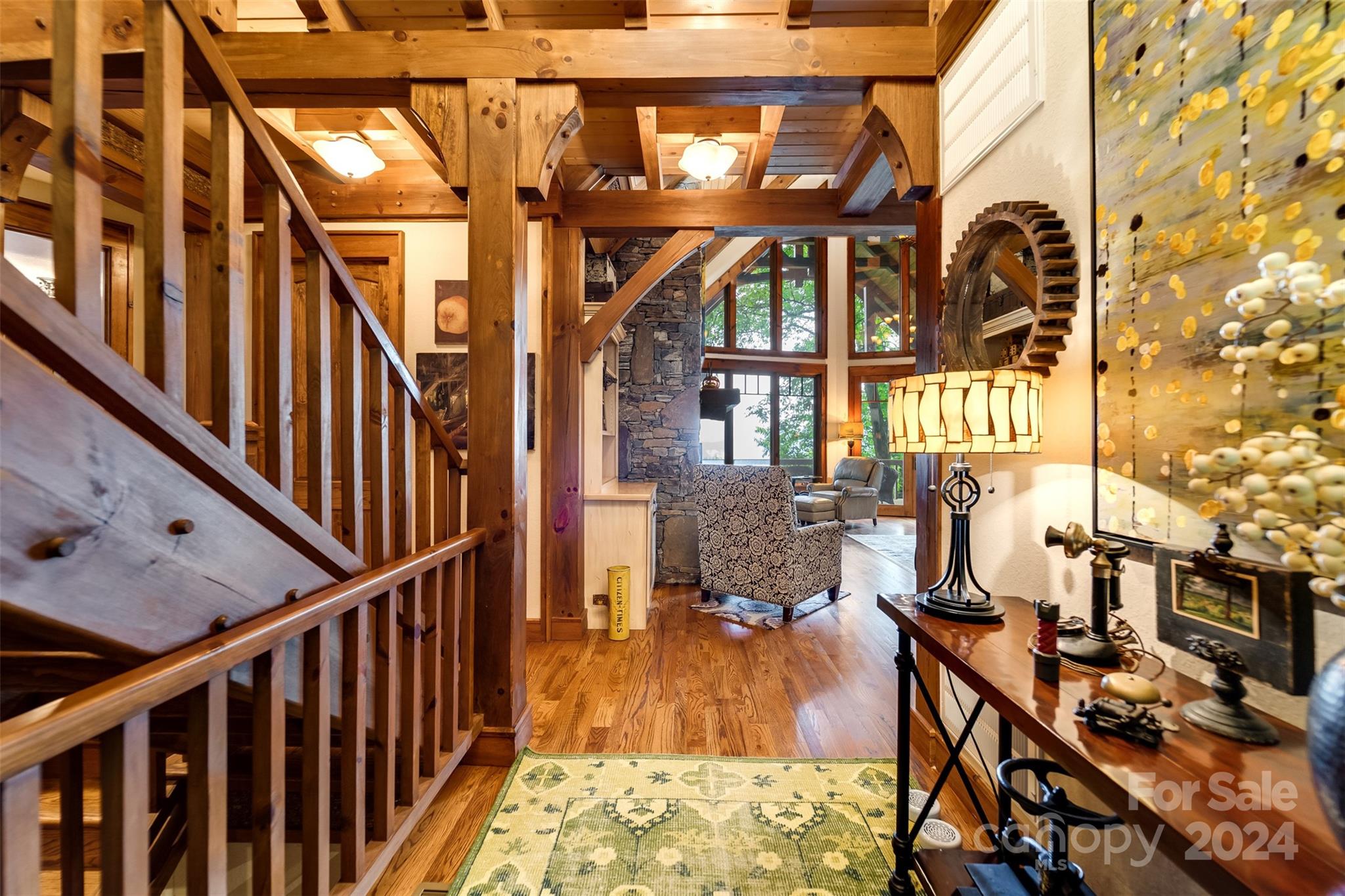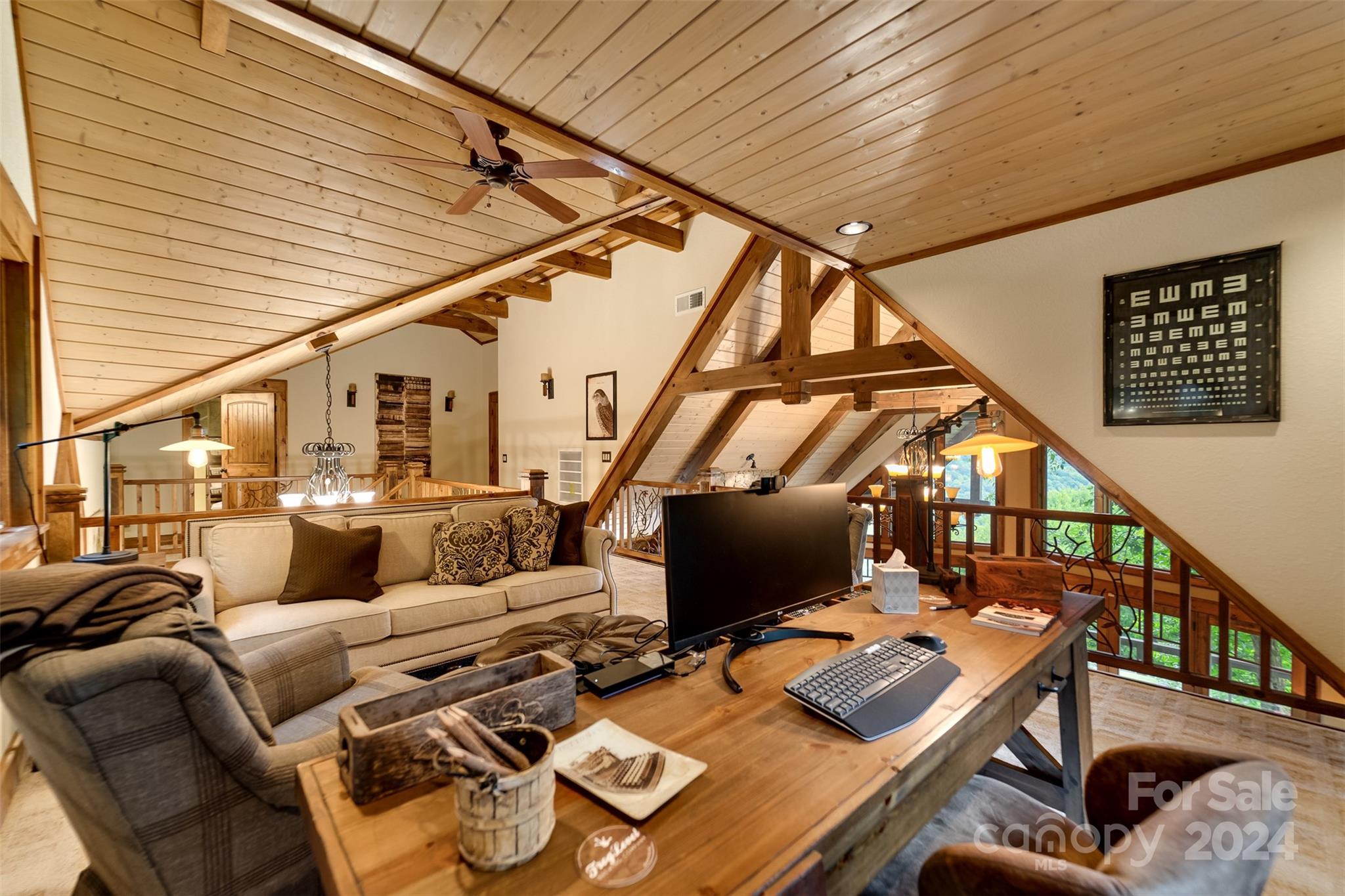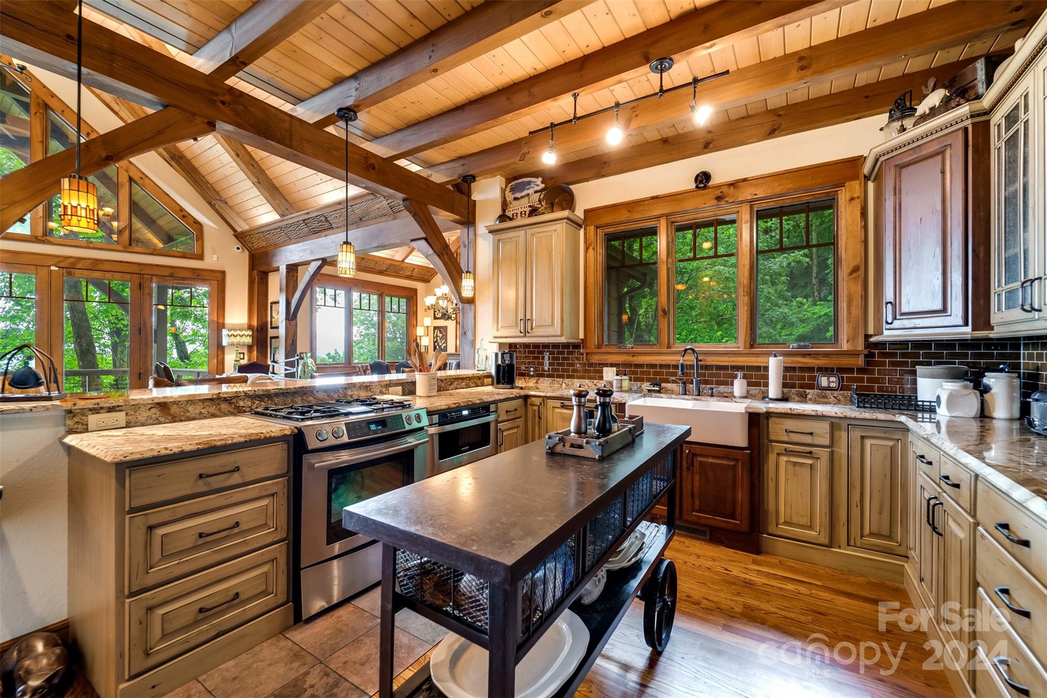Nestled in the Smoky Mountains between Waynesville and Maggie Valley, this Smoky Mountain Retreat at Eagles Nest residence is a custom-built post and beam home. Enjoy year-round crisp mountain air and stunning 180-degree mountain views in this four-bedroom, 4.5-bath residence. The home features custom lighting, two expansive decks (one with an outdoor wood-burning fireplace and Viking gas grill), and a gourmet kitchen with knotty alder cabinets and granite countertops. It includes three primary bedrooms with walk-in closets, a five-bed bunk room, two living areas with fireplaces, a whole-home generator and alarm system. Partially furnished and move-in ready. This home ensures a serene escape with well-maintained private roads and captivating natural beauty.