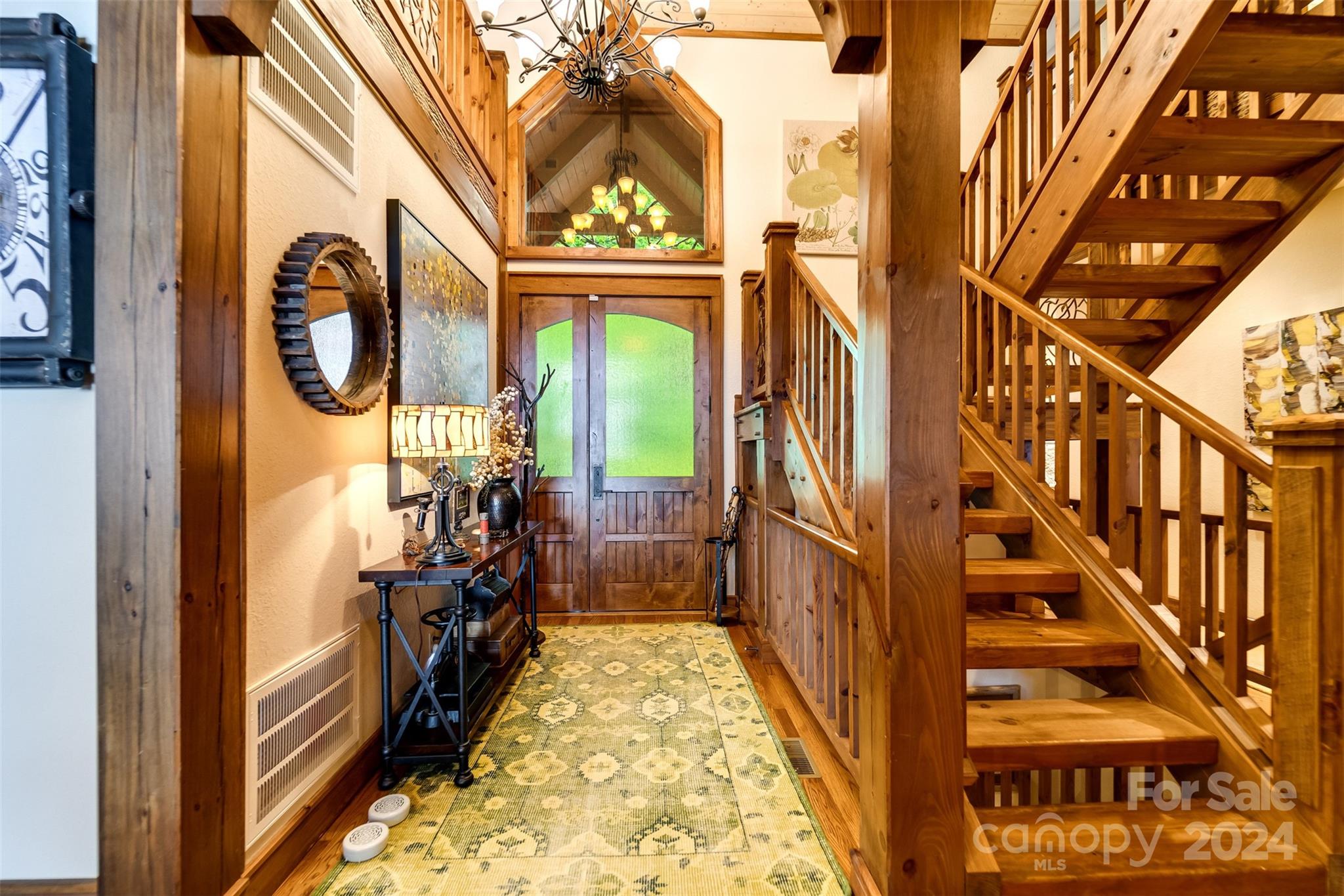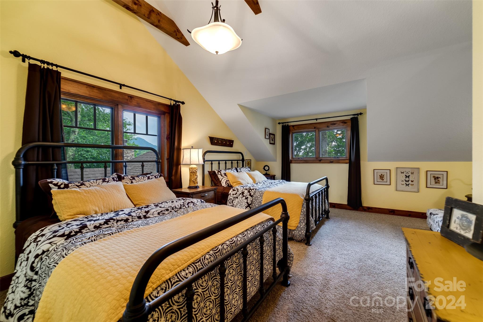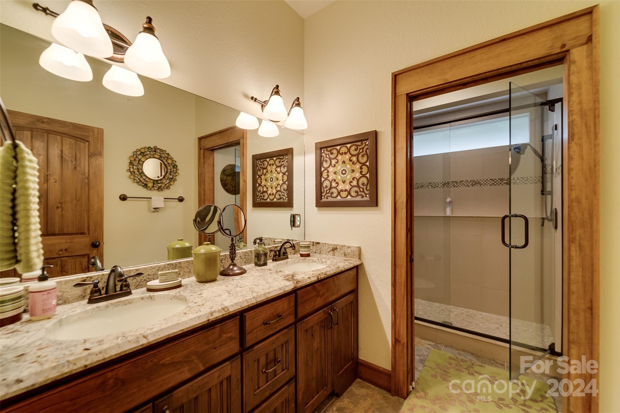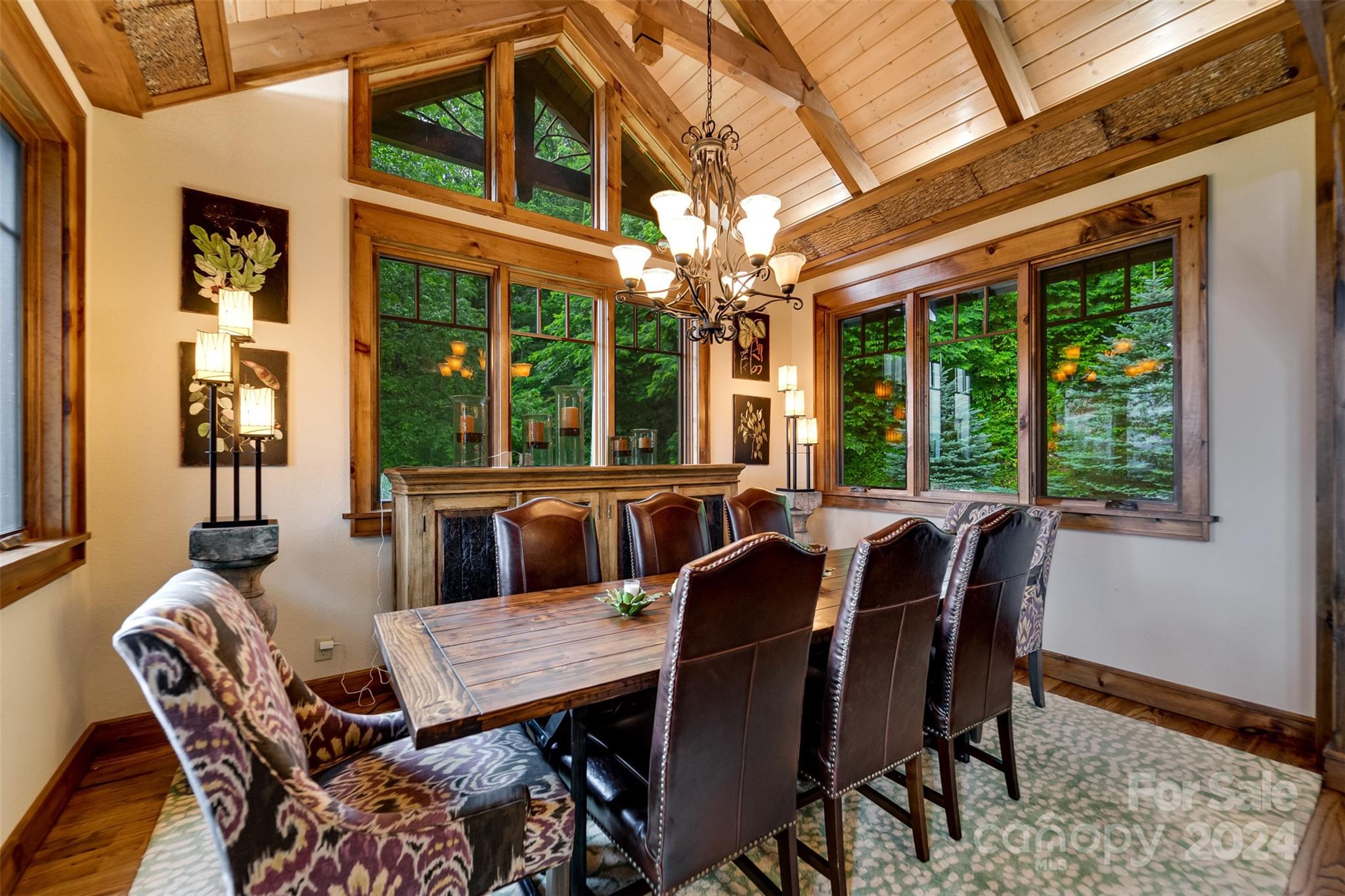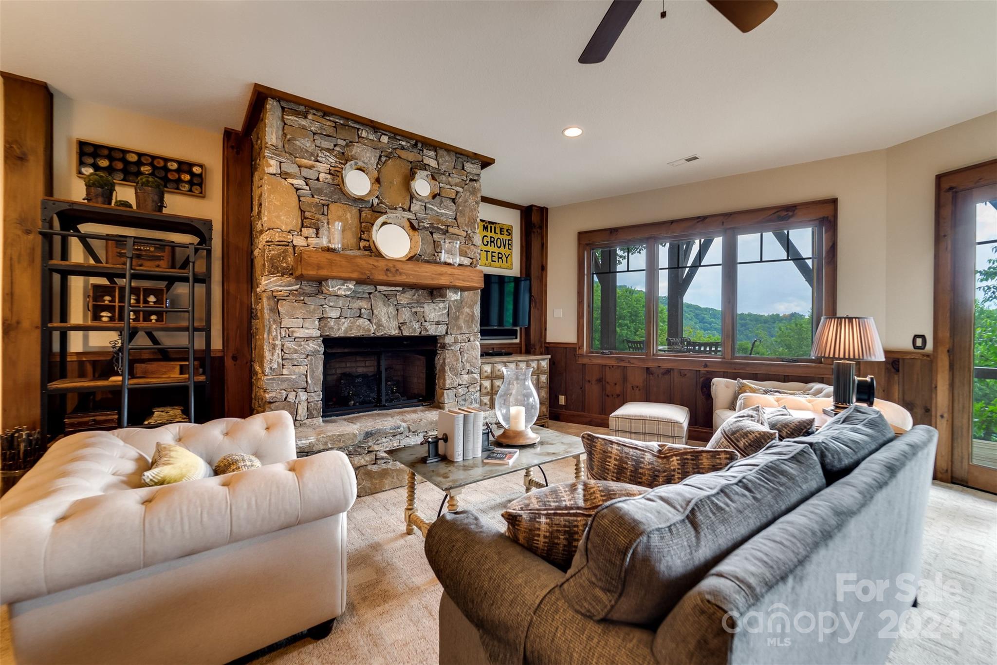 Nestled in the Smoky Mountains between Waynesville and Maggie Valley, this Smoky Mountain Retreat at Eagles Nest residence is a custom-built post and beam home. Enjoy year-round crisp mountain air and stunning 180-degree mountain views in this four-bedroom, 4.5-bath residence. The home features custom lighting, two expansive decks (one with an outdoor wood-burning fireplace and Viking gas grill), and a gourmet kitchen with knotty alder cabinets and granite countertops. It includes three primary bedrooms with walk-in closets, a five-bed bunk room, two living areas with fireplaces, a whole-home generator and alarm system. Partially furnished and move-in ready. This home ensures a serene escape with well-maintained private roads and captivating natural beauty.