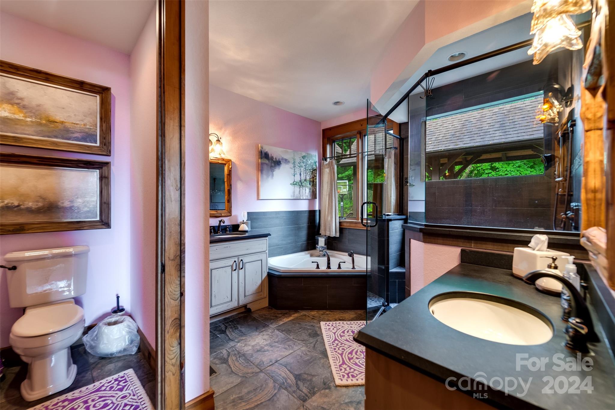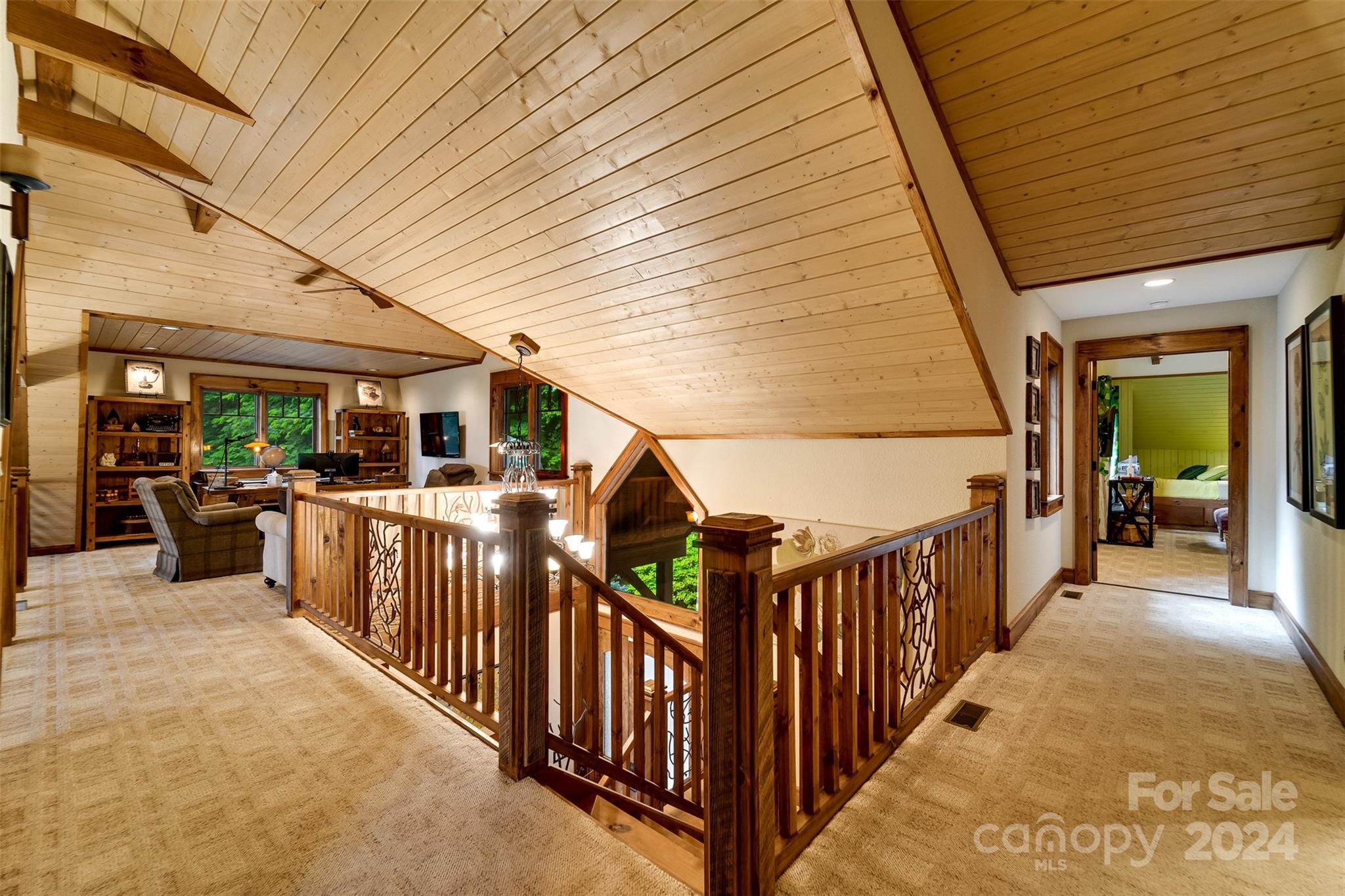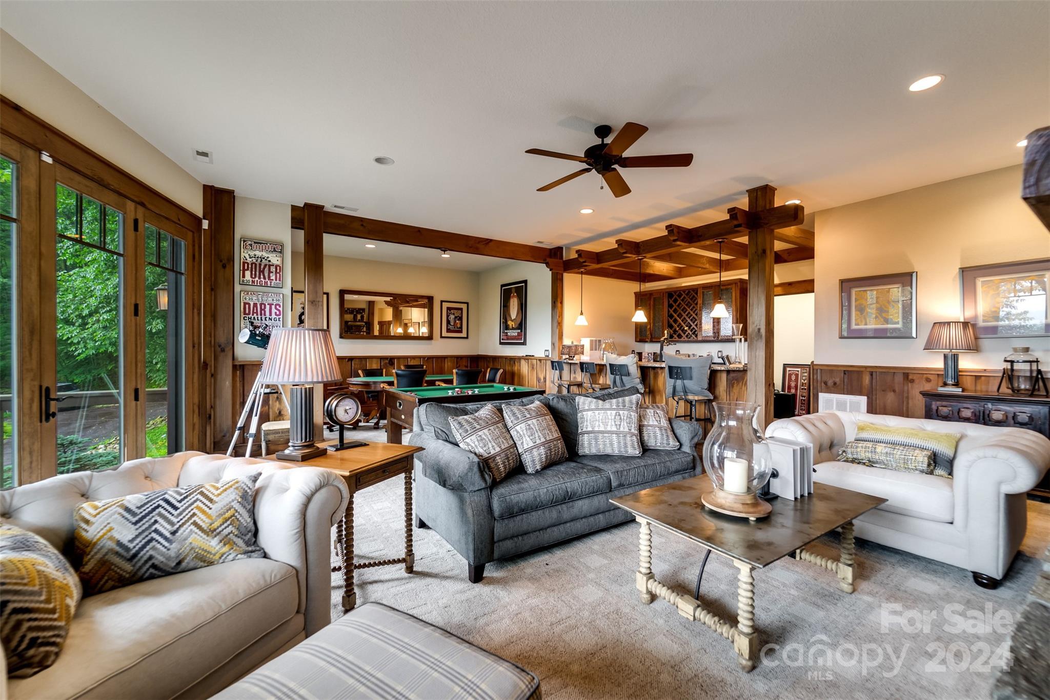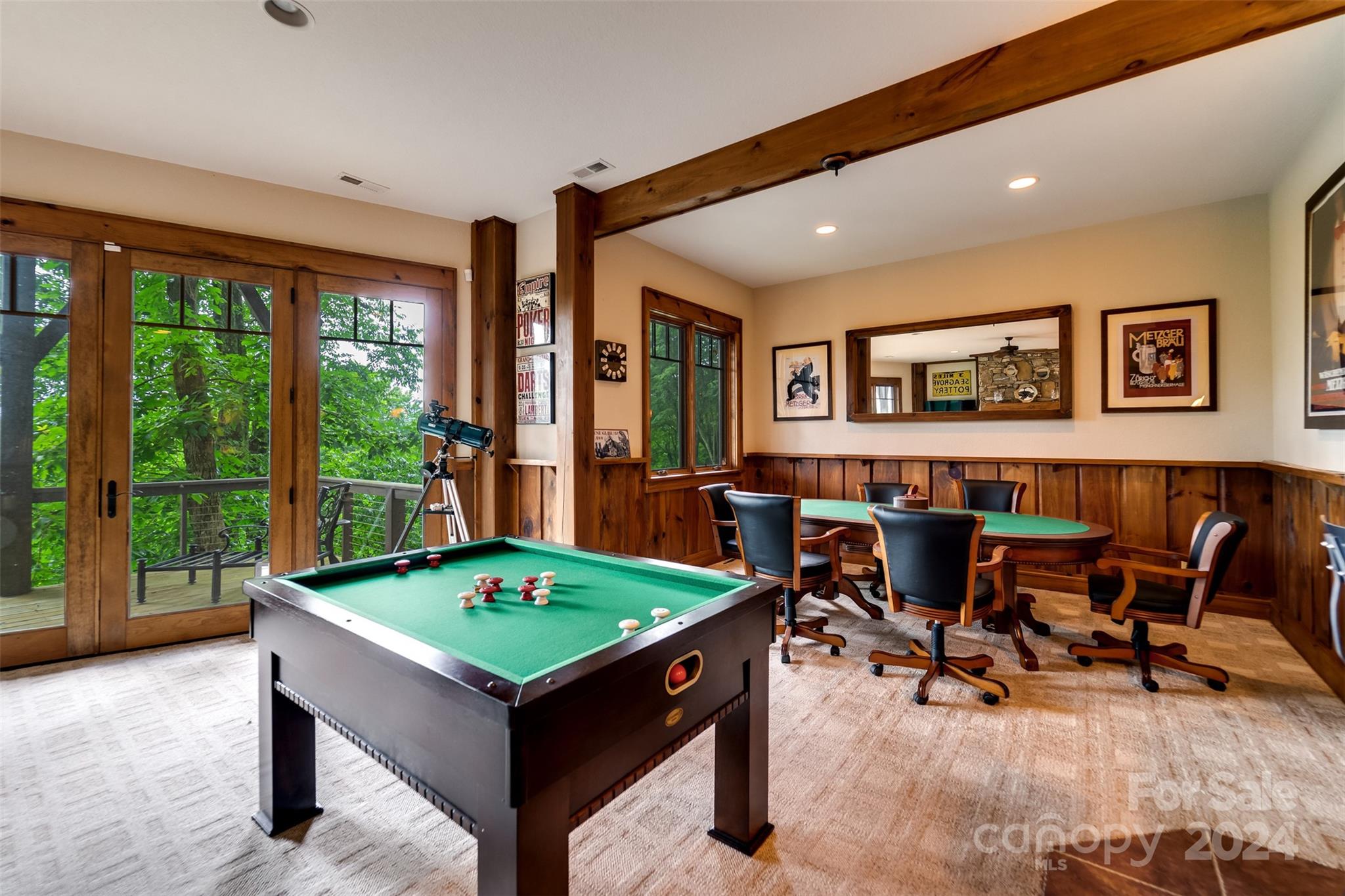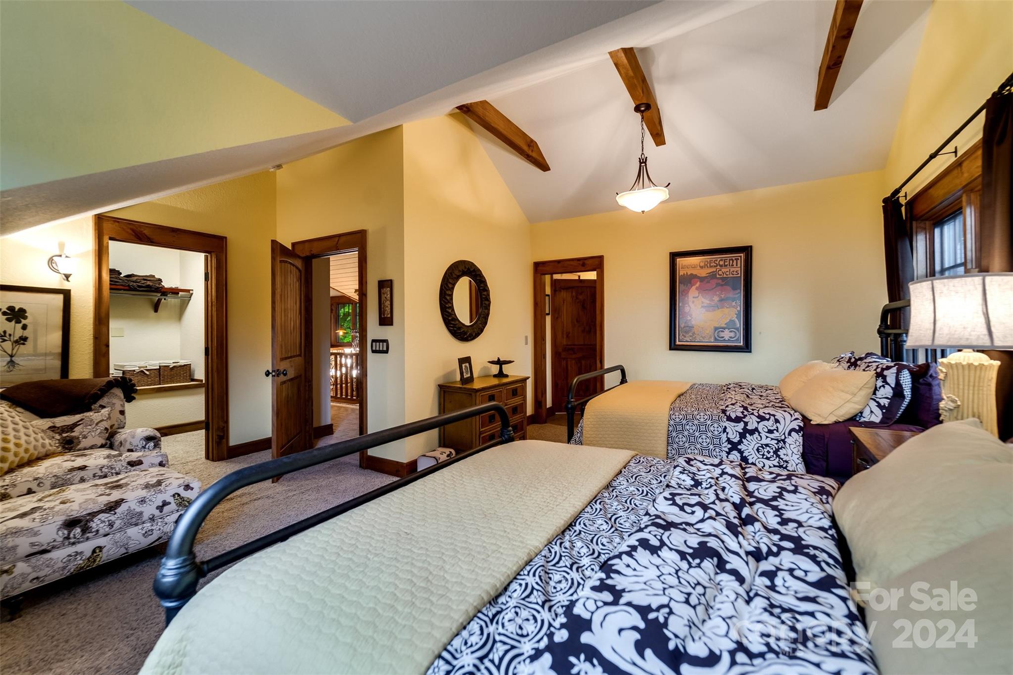 Nestled in the Smoky Mountains between Waynesville and Maggie Valley, this Smoky Mountain Retreat at Eagles Nest residence is a custom-built post and beam home. Enjoy year-round crisp mountain air and stunning 180-degree mountain views in this four-bedroom, 4.5-bath residence. The home features custom lighting, two expansive decks (one with an outdoor wood-burning fireplace and Viking gas grill), and a gourmet kitchen with knotty alder cabinets and granite countertops. It includes three primary bedrooms with walk-in closets, a five-bed bunk room, two living areas with fireplaces, a whole-home generator and alarm system. Partially furnished and move-in ready. This home ensures a serene escape with well-maintained private roads and captivating natural beauty.