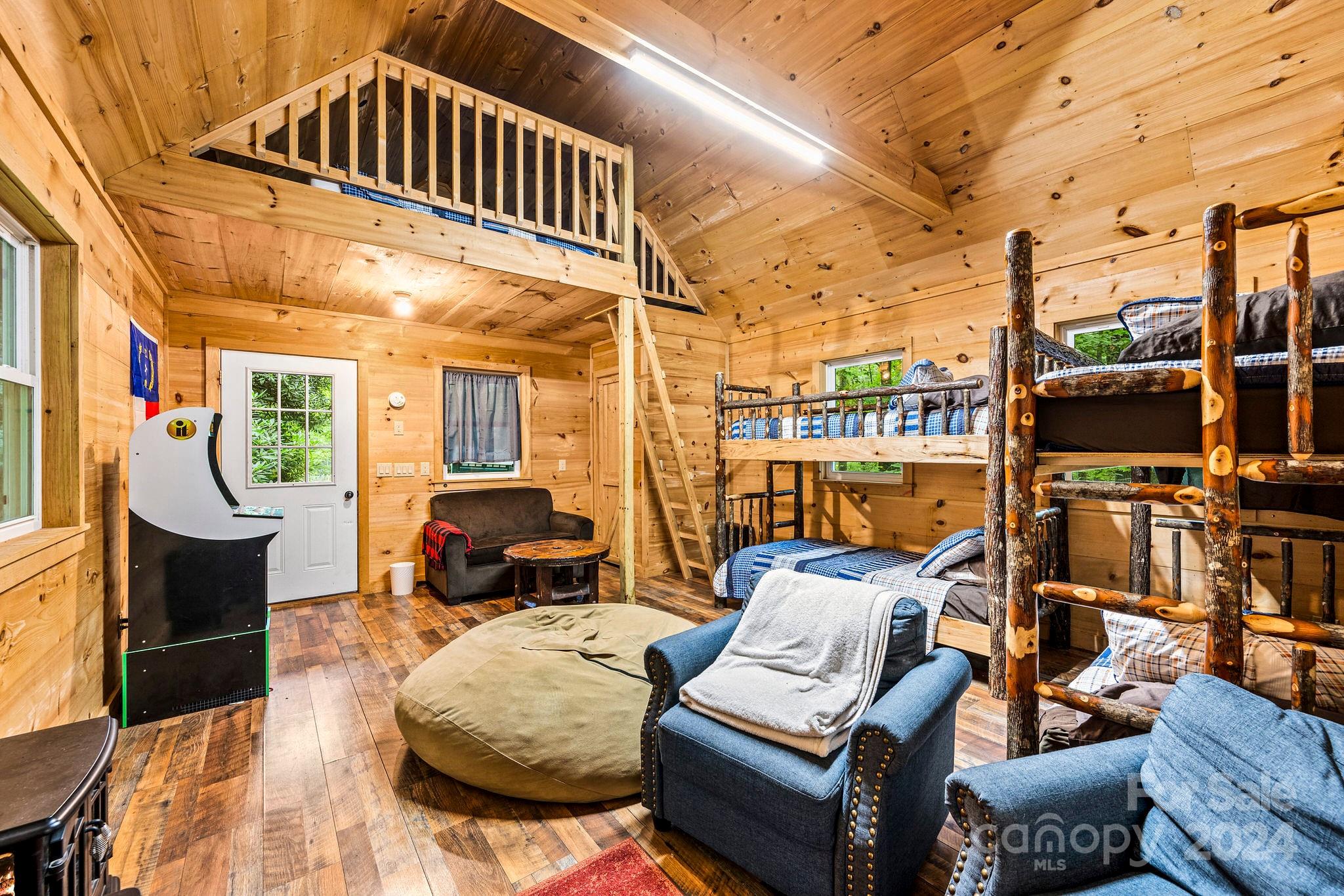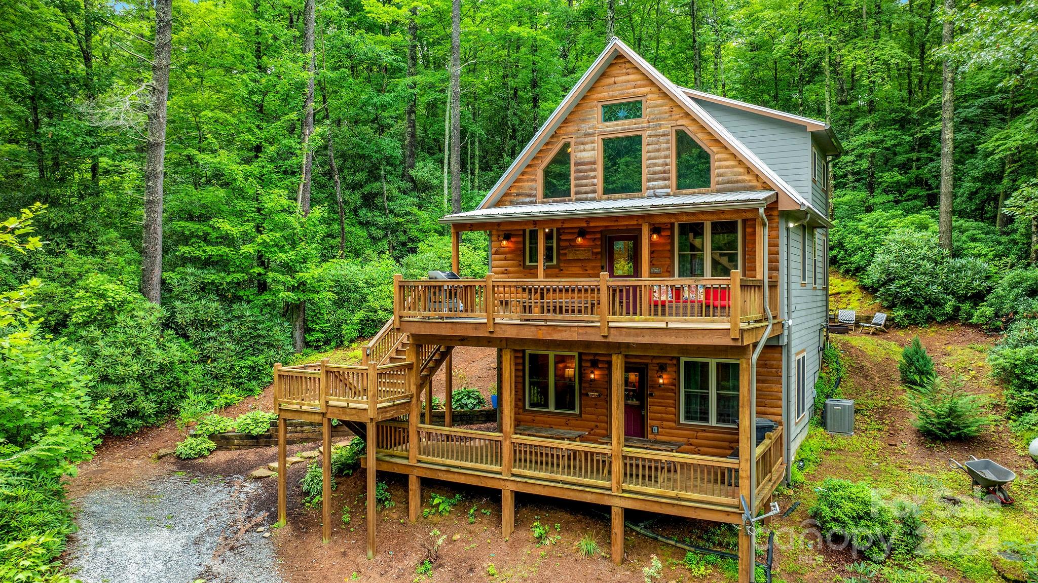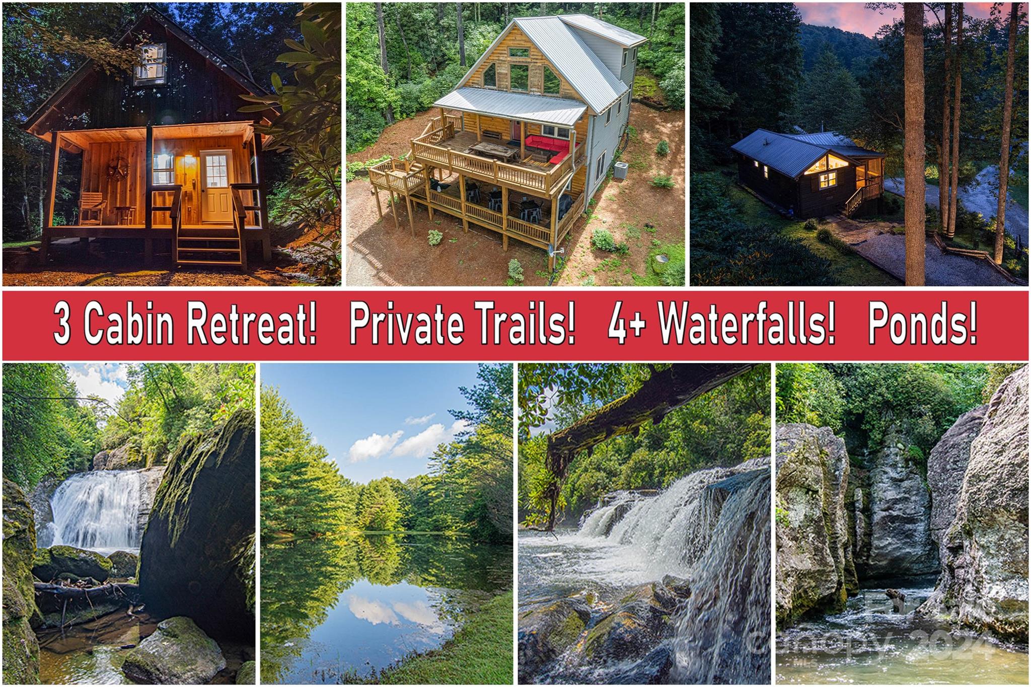 Discover this retreat for up to 17 guests, featuring a large pond, two fire pits, two cabins, a kid's bunkhouse, three kitchens, and a BRAND NEW HOT TUB. On almost 8 acres and only 6 miles from downtown Cashiers, this retreat offers convenient access to vibrant dining, local shops, and outdoor activities. With an abundance of waterfalls, fly-fishing spots, tubing adventures, and hiking trails at your doorstep, the possibilities are endless. An expansive deck with a large gas grill offers breathtaking views. Currently a highly successful short-term rental. Lot has the potential to build additional units with new septic installation. Buyers to confirm. Sold Furnished. Assumable 4.25% mortgage! (Buyers to verify with the bank)