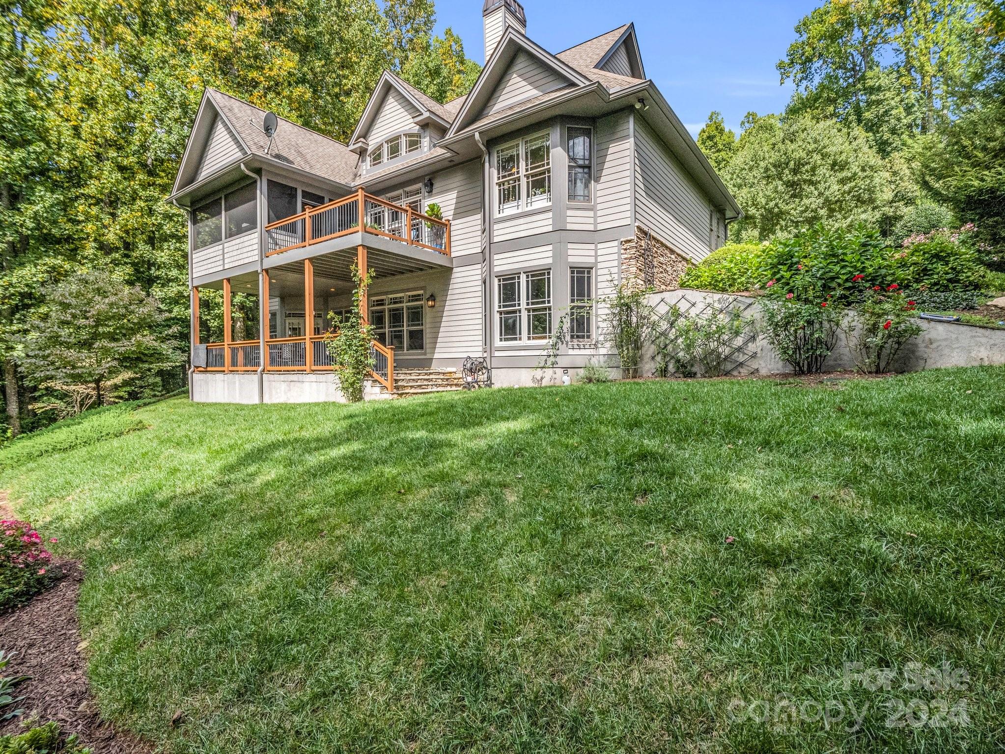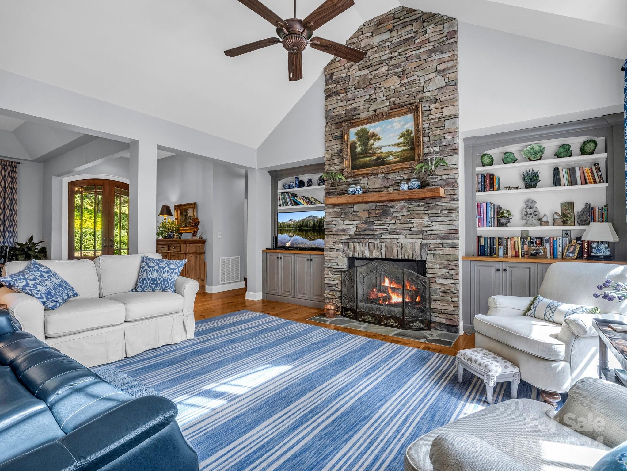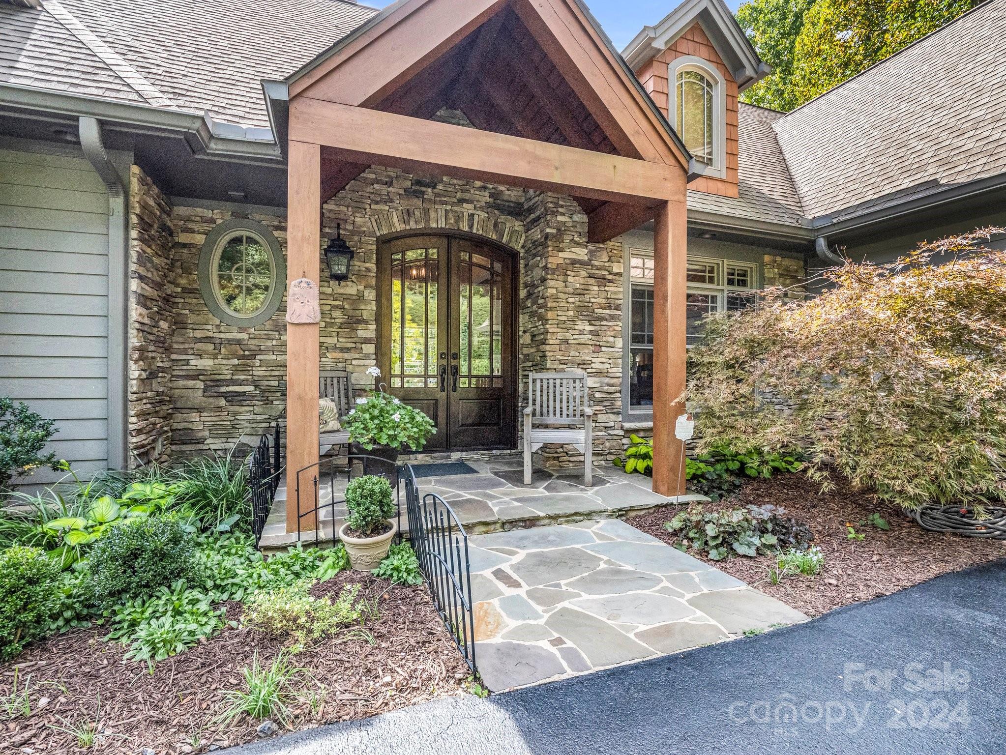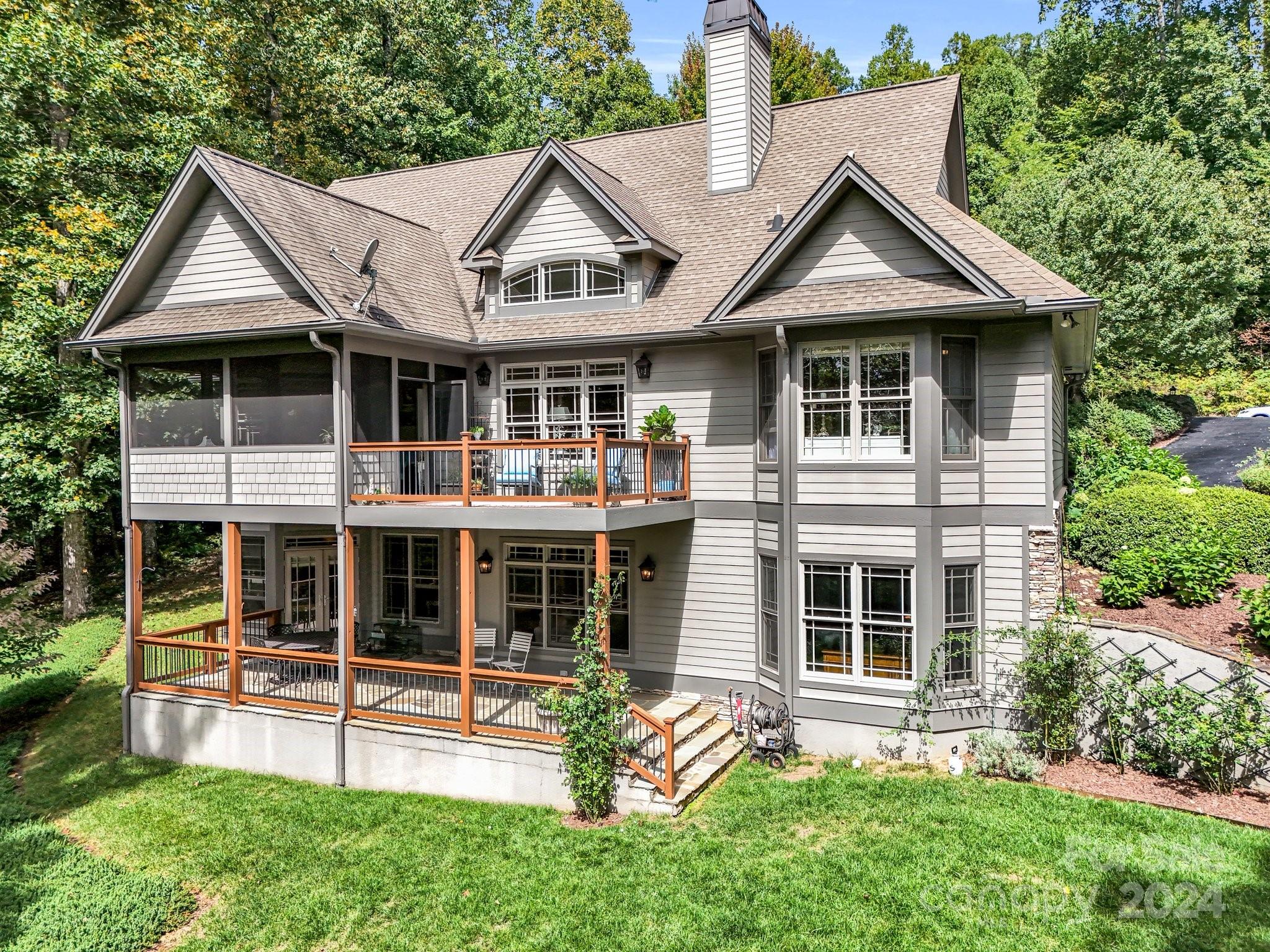Welcome to Cobblestone Village, an exclusive communitv bordering Flat Rock. This elegant home exudes upscale finishes and undeniable charm. The main floor has all you need for a one level lifestyle. There is a cozy living room with a stone fireplace, ample dining area, & a stunning eat-in kitchen with upscale cabinetry, refined appliances, & quartz tops. The split plan layout assures privacy in the Primary Suite. There are both screened & open-air porches to take in the stunning landscaped garden. The main floor has direct access to an ample laundry room and oversized garage. A super light & bright bonus room over the garage is perfect for a hobby or play. The finished basement is ideal for guests or in-laws, offering a large den with a stone fireplace, wet bar, an additional bedroom w/ bath, office, & TV room with surround sound. The lower level opens to a covered porch to fully enjoy the surroundings. Luxury and comfort await you in every corner of this exceptional home.
