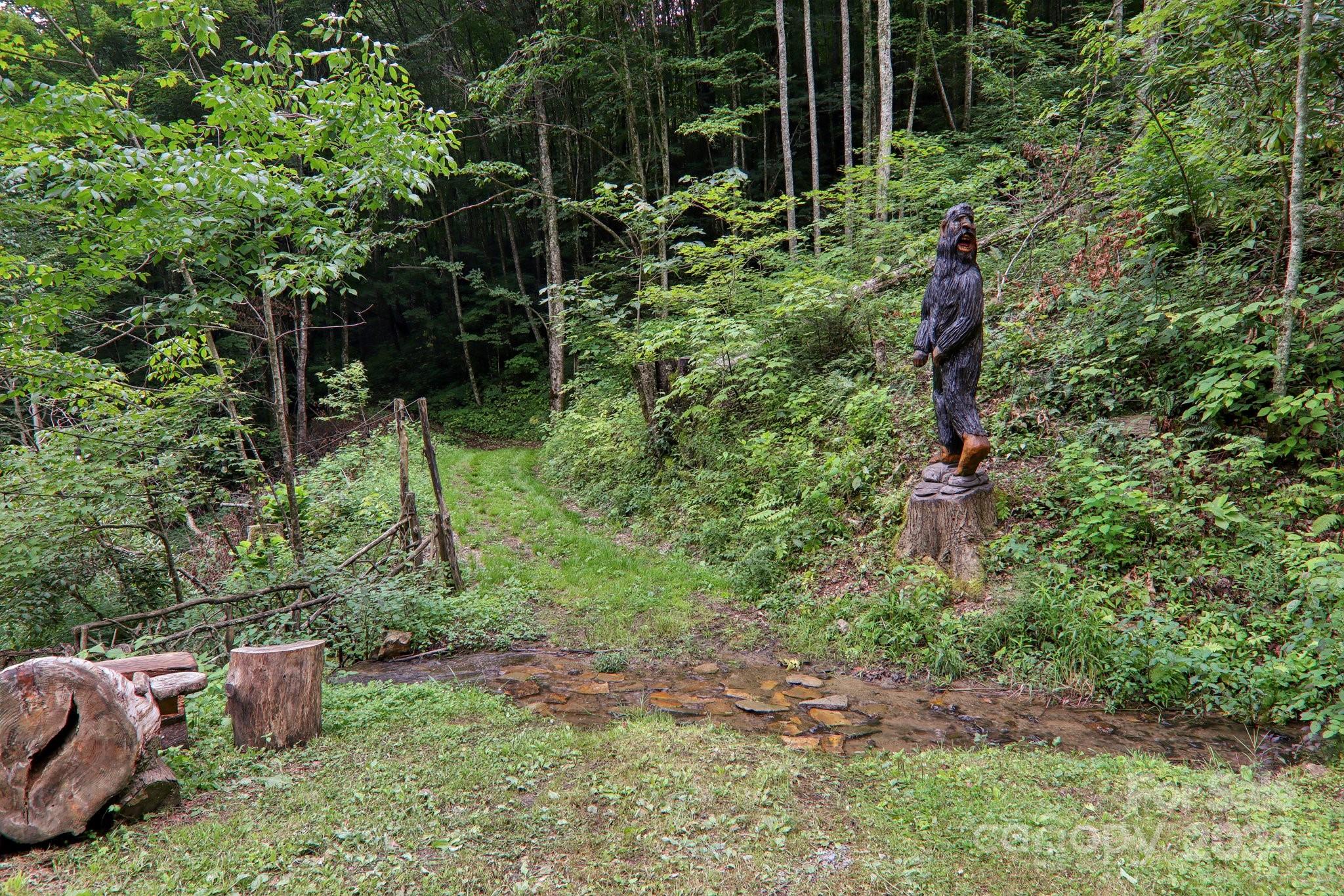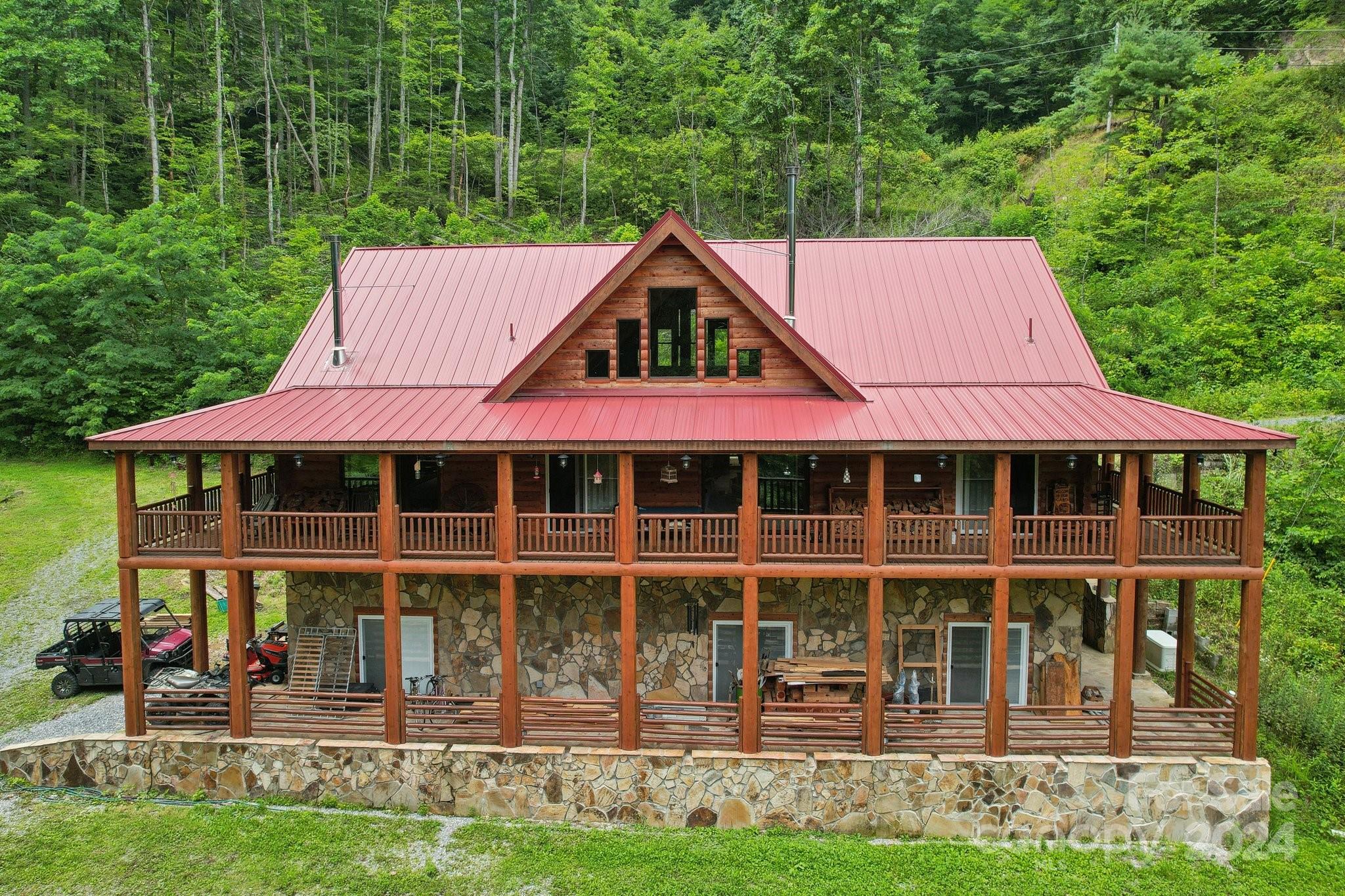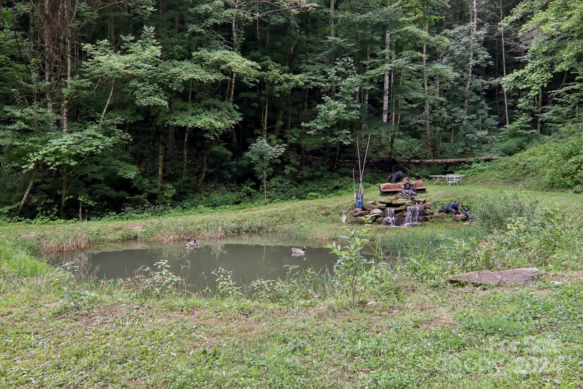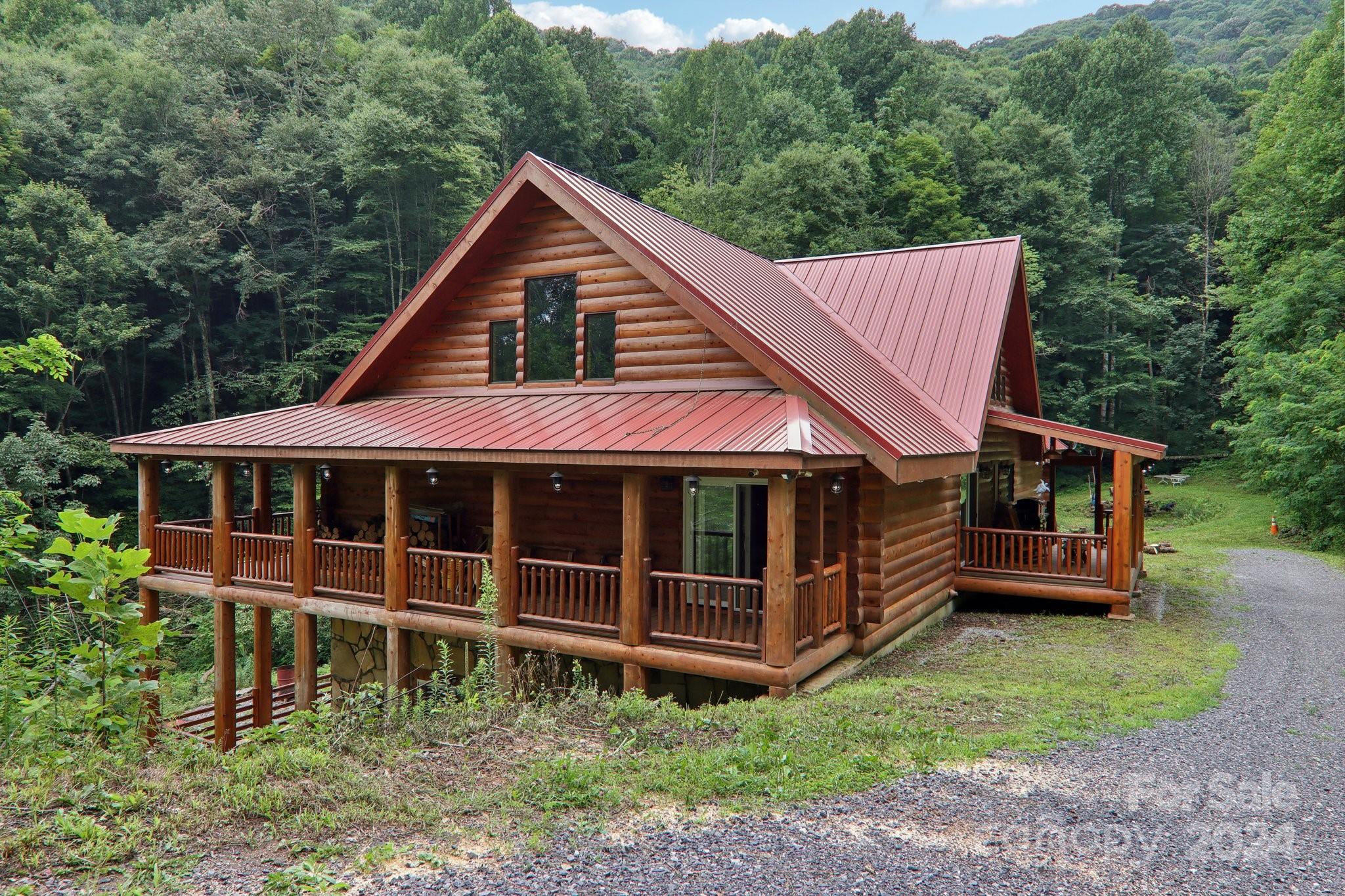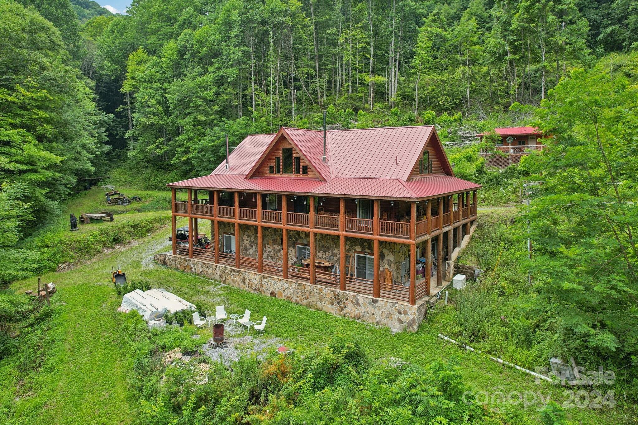 Welcome to Big Foot Trail! This extraordinary property features an over 4000 sq ft Red Cedar Log Home on 44 acres off State Rd! The stunning great room has 23 ft ceilings! The home is highly energy-efficient w/spray foam insulation poured concrete walls, & 2 Soapstone woodstoves! The primary BR on main opens to the covered deck overlooking the pond & waterfalls. A lrg primary BA includes an oversized tile shower & open closet/changing room. Guest BR & 2BA as well as bonus room on main. Open kitchen concept w/breakfast bar perfect for entertaining. The lower level is finished & perfect for a rec room, crafts, bonus sleeping space, etc. Much of the land has a gentle topo for additional cabins, tree houses, etc. There are 2 pasture areas (some fenced), creek through the property, & old barn. 10 minutes to I-40, & located just outside Cataloochee Valley & GSMNP. Freshwater spring! There is a bonus cabin for caretaker or office. Satellite internet. Furniture, tools, & 4 wheelers negotiable.