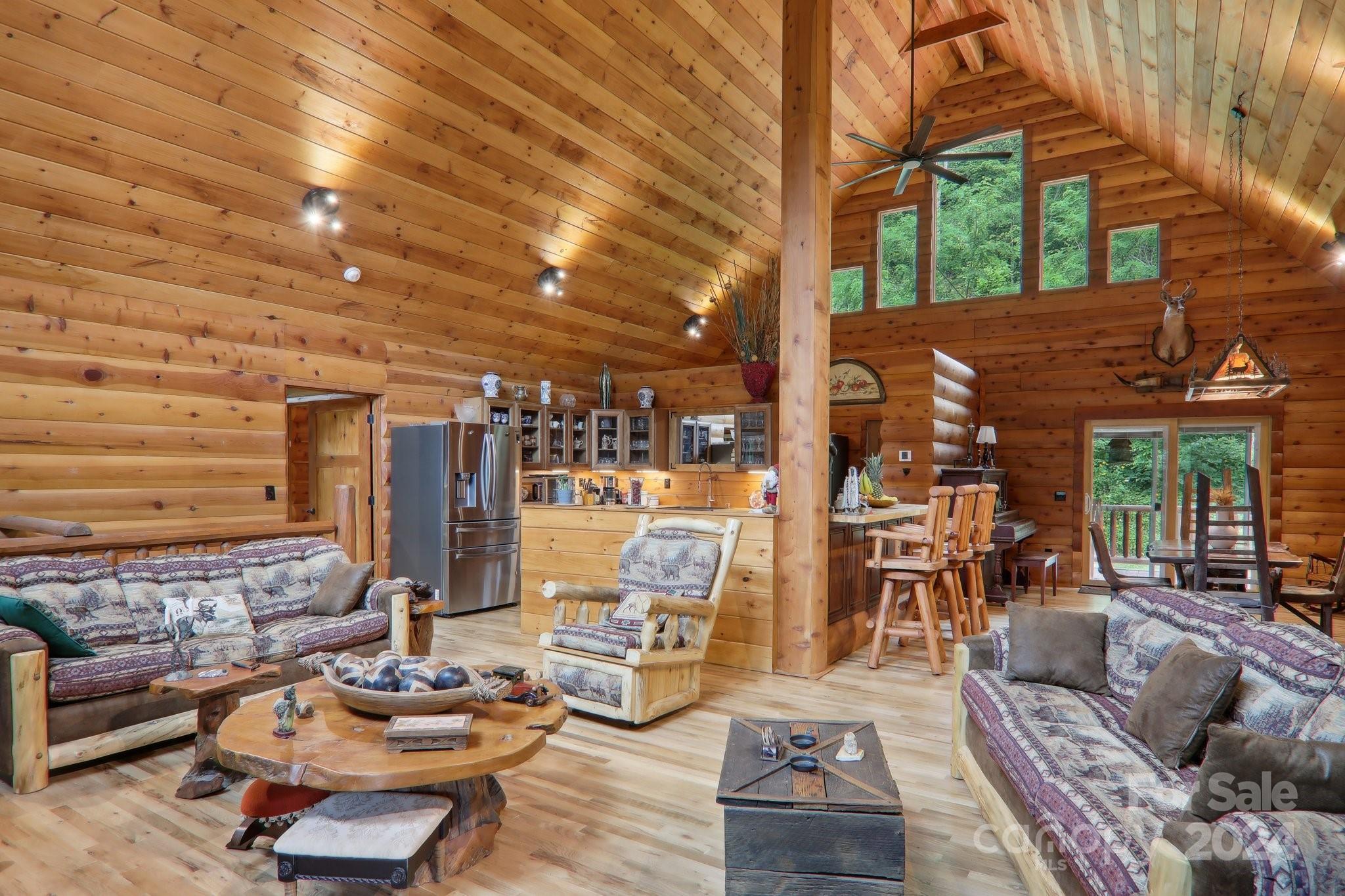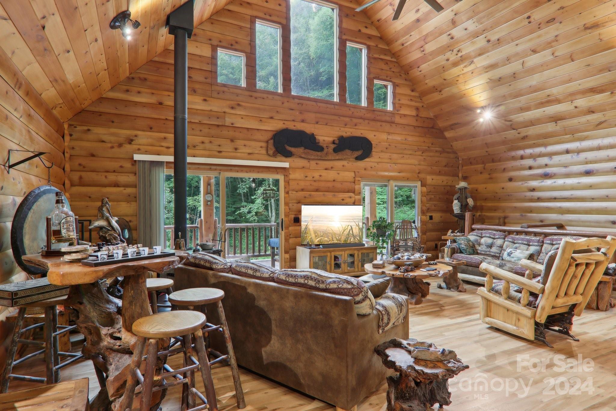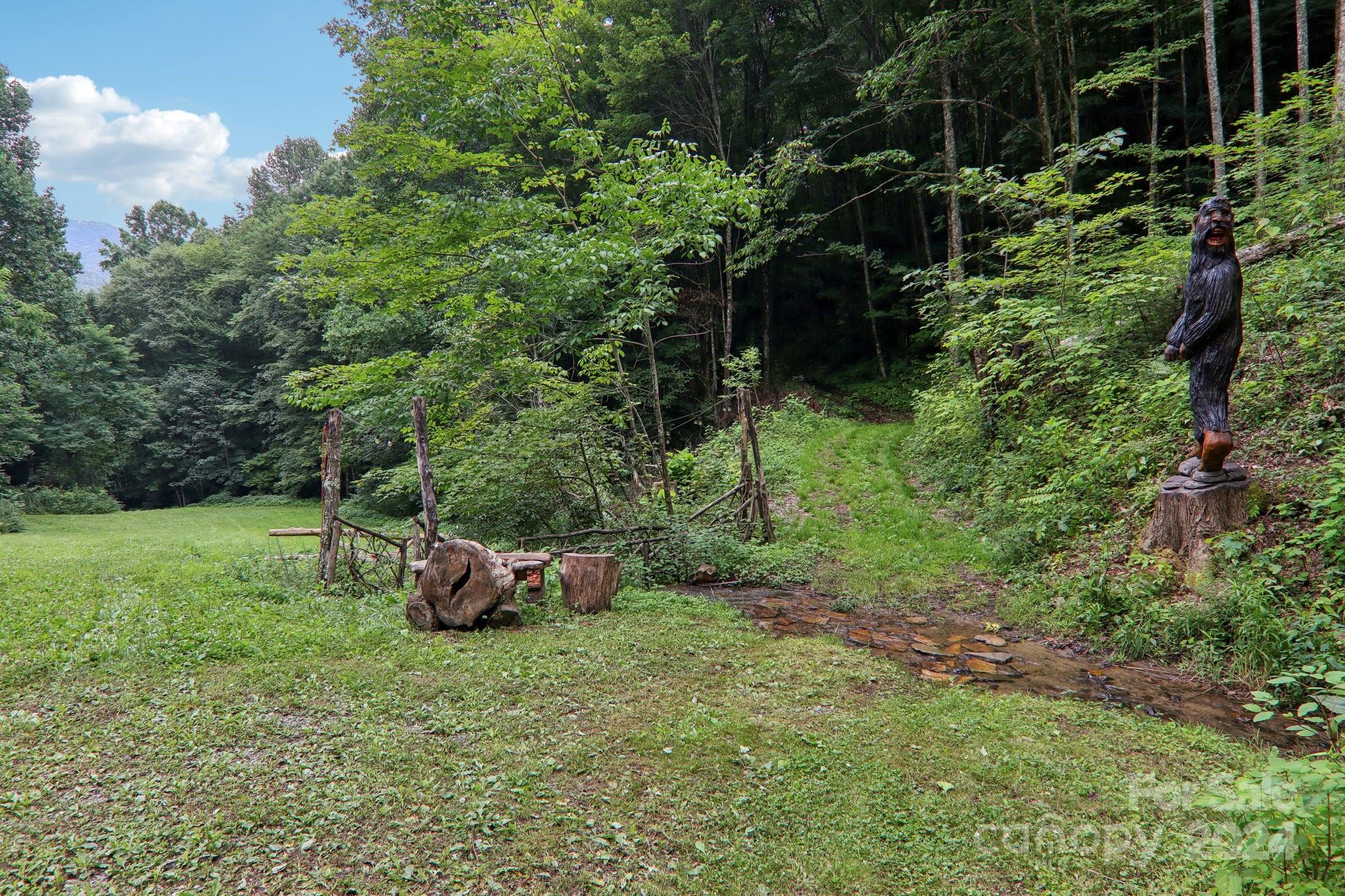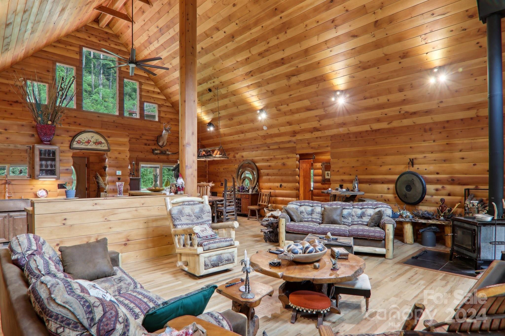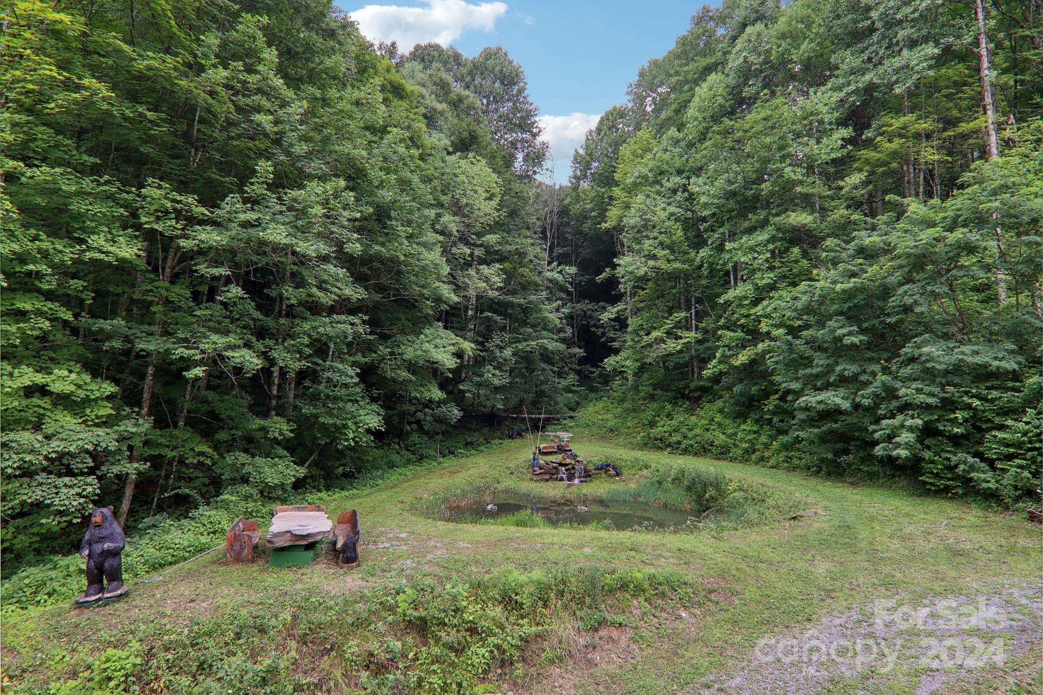 Welcome to Big Foot Trail! This extraordinary property features an over 4000 sq ft Red Cedar Log Home on 44 acres off State Rd! The stunning great room has 23 ft ceilings! The home is highly energy-efficient w/spray foam insulation poured concrete walls, & 2 Soapstone woodstoves! The primary BR on main opens to the covered deck overlooking the pond & waterfalls. A lrg primary BA includes an oversized tile shower & open closet/changing room. Guest BR & 2BA as well as bonus room on main. Open kitchen concept w/breakfast bar perfect for entertaining. The lower level is finished & perfect for a rec room, crafts, bonus sleeping space, etc. Much of the land has a gentle topo for additional cabins, tree houses, etc. There are 2 pasture areas (some fenced), creek through the property, & old barn. 10 minutes to I-40, & located just outside Cataloochee Valley & GSMNP. Freshwater spring! There is a bonus cabin for caretaker or office. Satellite internet. Furniture, tools, & 4 wheelers negotiable.