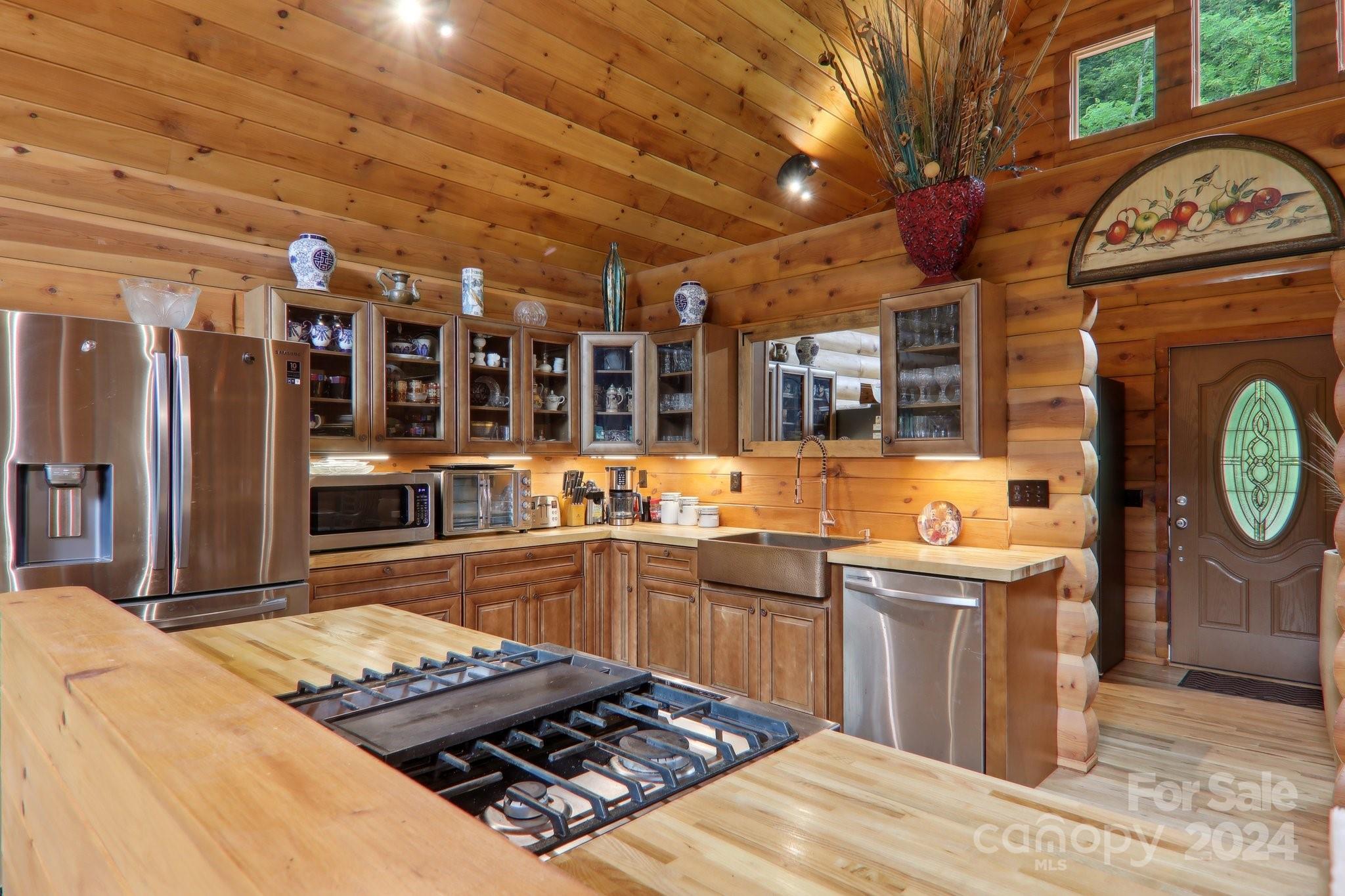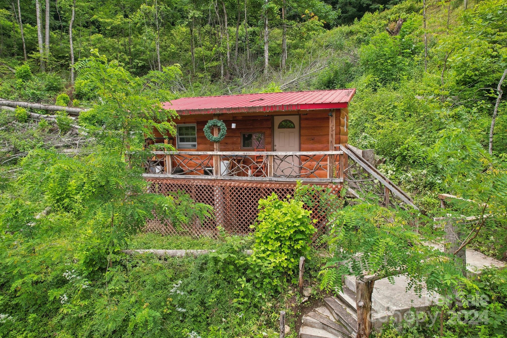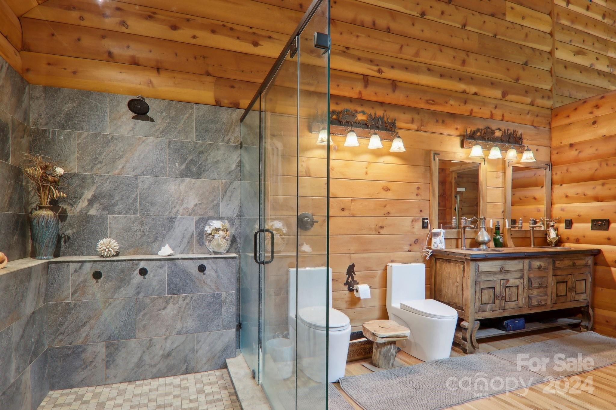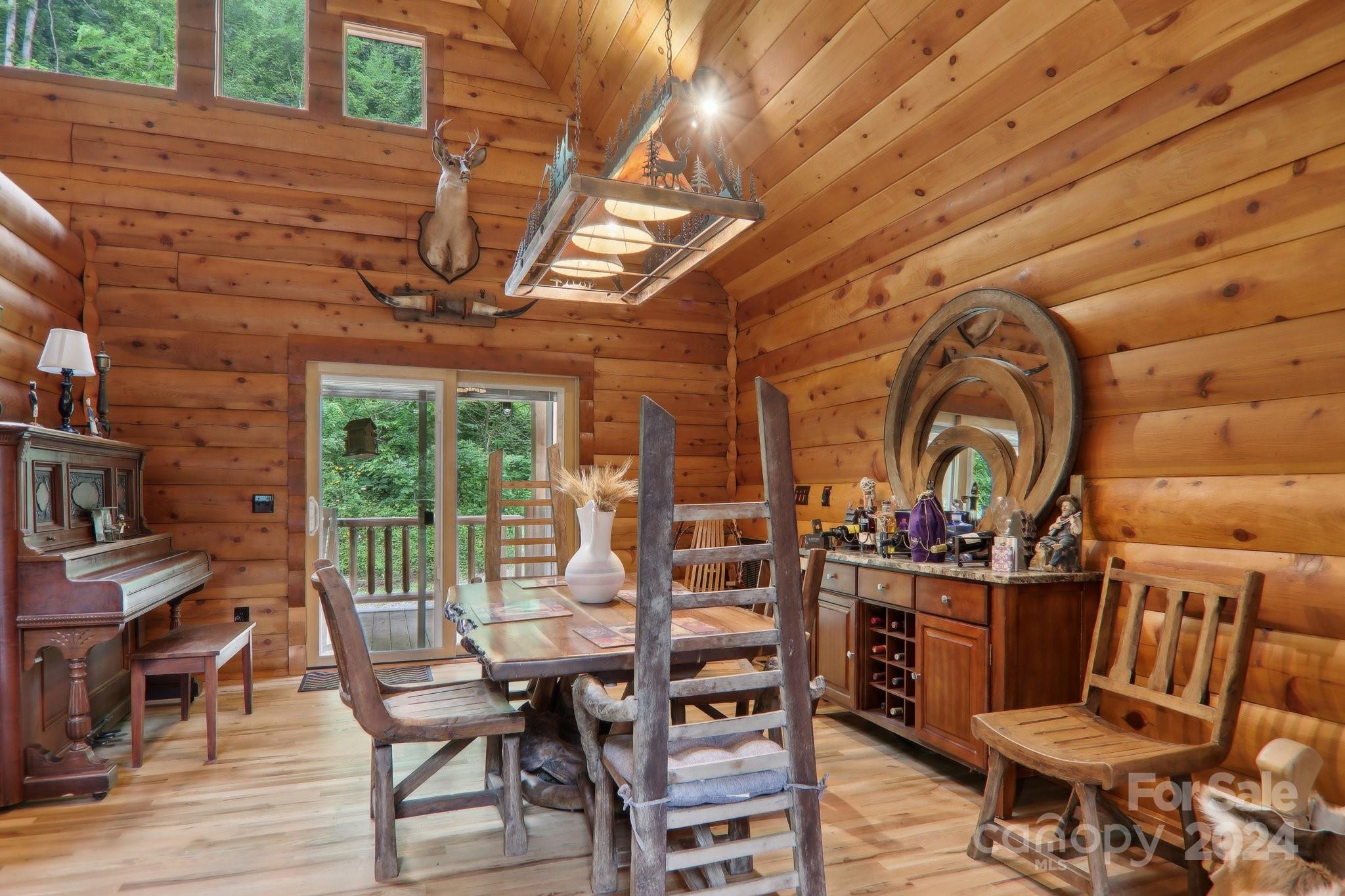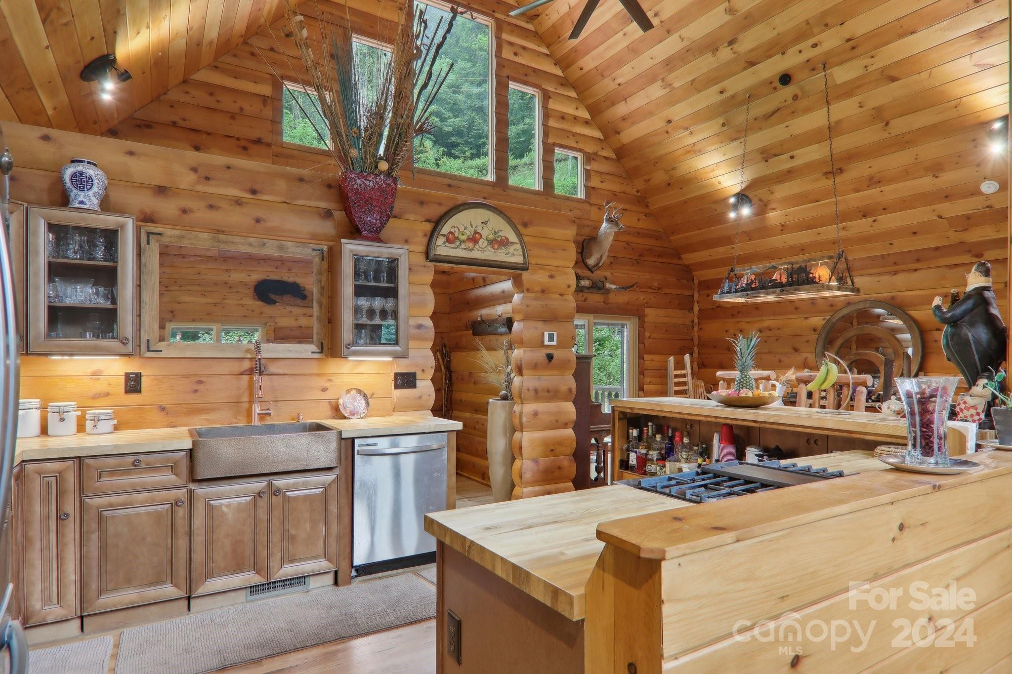 Welcome to Big Foot Trail! This extraordinary property features an over 4000 sq ft Red Cedar Log Home on 44 acres off State Rd! The stunning great room has 23 ft ceilings! The home is highly energy-efficient w/spray foam insulation poured concrete walls, & 2 Soapstone woodstoves! The primary BR on main opens to the covered deck overlooking the pond & waterfalls. A lrg primary BA includes an oversized tile shower & open closet/changing room. Guest BR & 2BA as well as bonus room on main. Open kitchen concept w/breakfast bar perfect for entertaining. The lower level is finished & perfect for a rec room, crafts, bonus sleeping space, etc. Much of the land has a gentle topo for additional cabins, tree houses, etc. There are 2 pasture areas (some fenced), creek through the property, & old barn. 10 minutes to I-40, & located just outside Cataloochee Valley & GSMNP. Freshwater spring! There is a bonus cabin for caretaker or office. Satellite internet. Furniture, tools, & 4 wheelers negotiable.