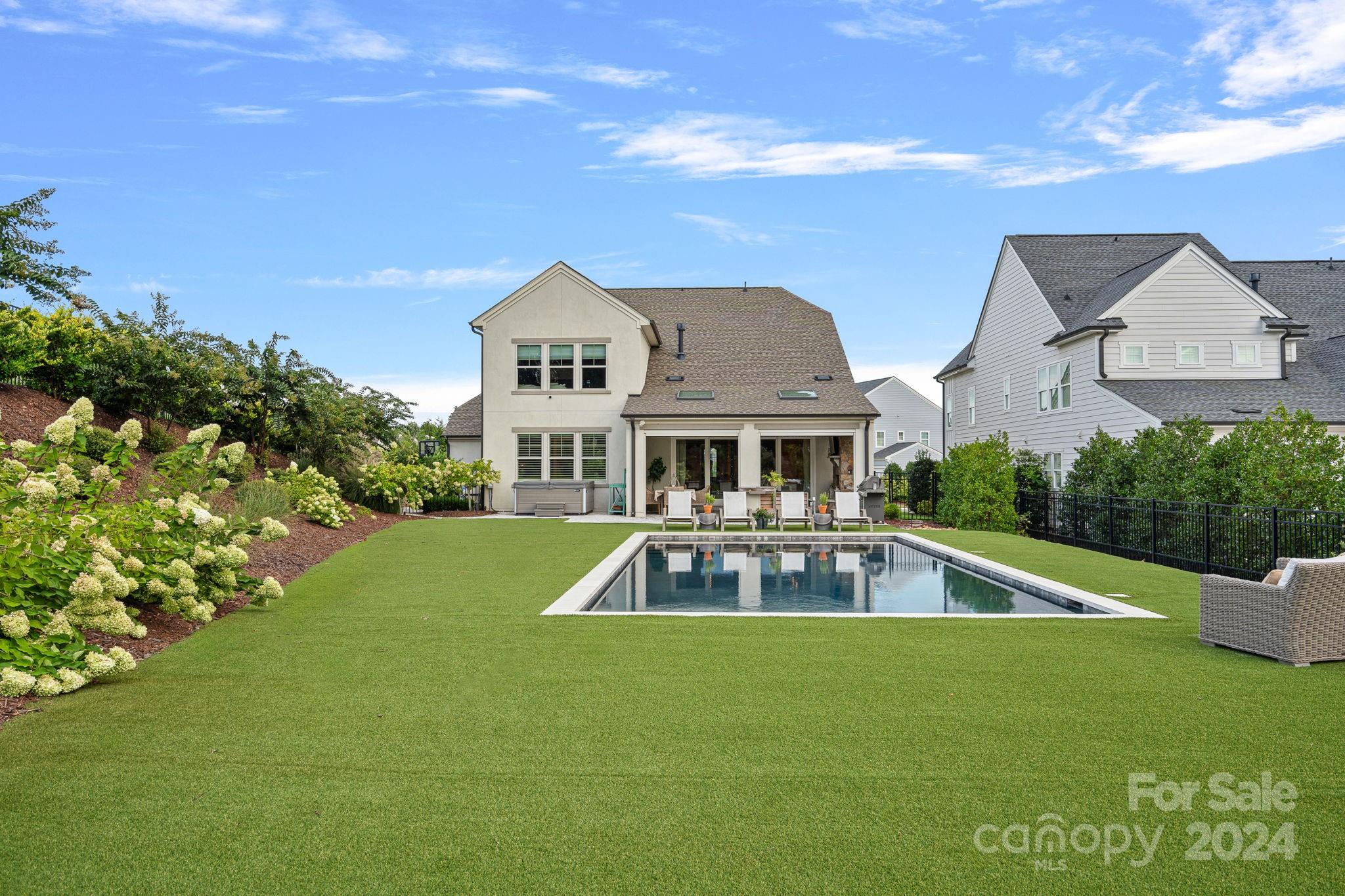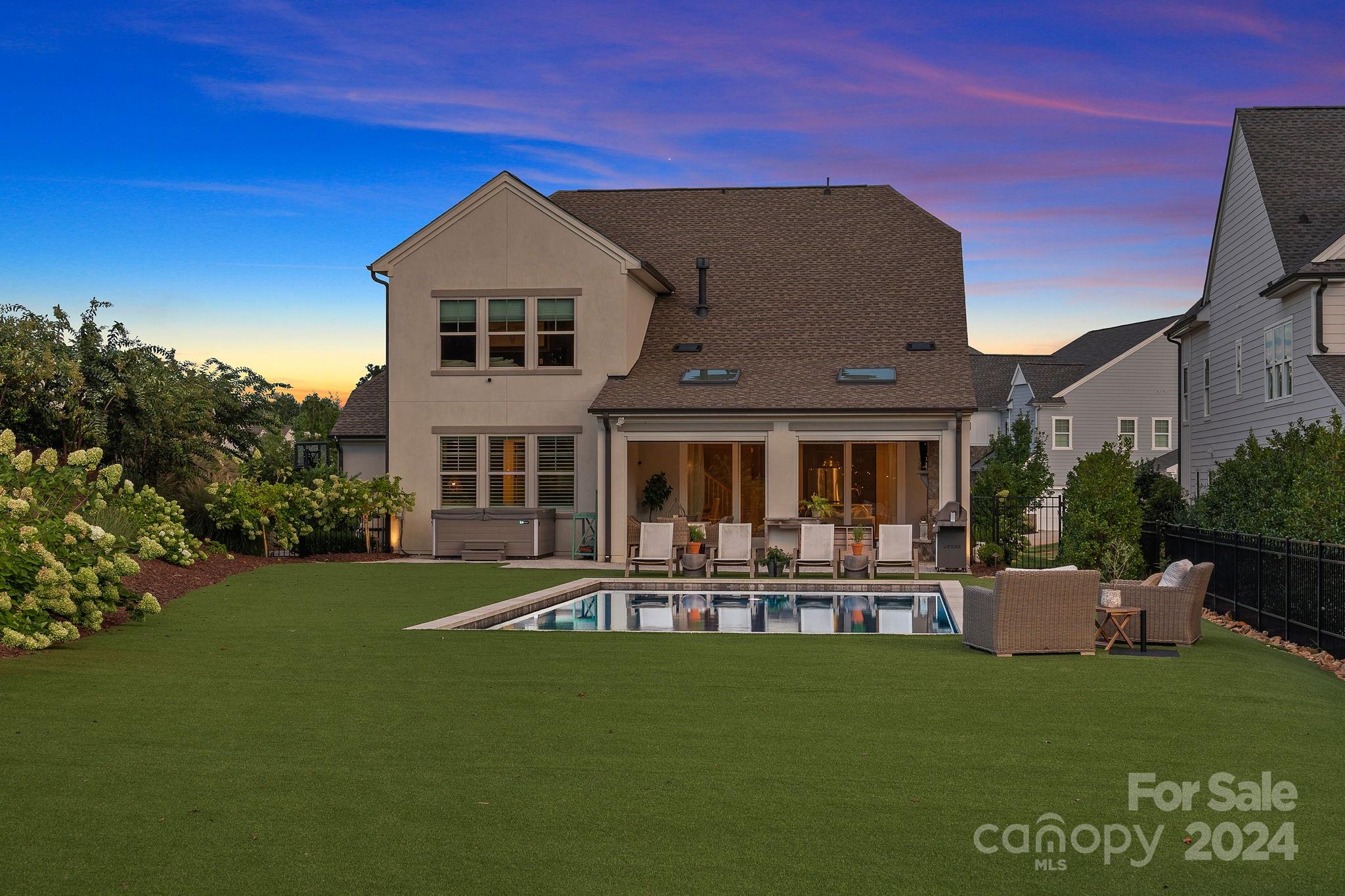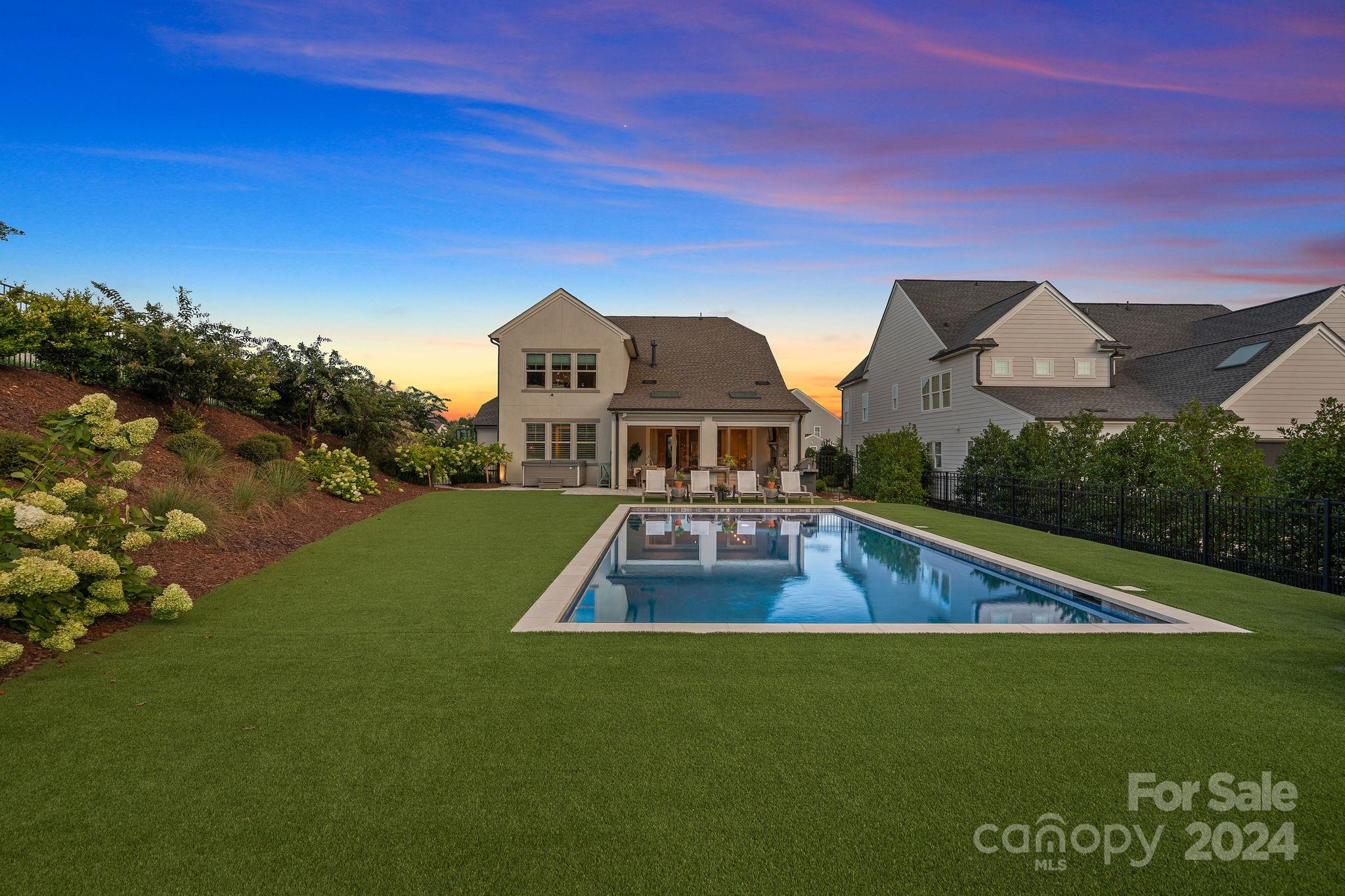 Welcome home to this stunning modern English farmhouse! Prepare to be wowed by the luxurious designer finishes and impeccable attention to detail from the moment you walk in the door. White oak floors lead you through this bright & airy open floor plan featuring a gourmet chef's kitchen with 6 burner gas range, quartz countertops, upgraded soft close cabinets & sizable island which opens into your dining area and spacious yet cozy living room with a striking white brick fireplace. Glass doors open to your outdoor living retreat complete with stone gas fireplace, skylights, automated screens & heaters and overlooks your remarkable oasis with a heated salt water pool, lush landscaping, fire pit & garden and features all premium turf for low maintenance living. Primary suite, office & private guest room with ensuite on main level. Upstairs hosts 2 add bedrooms, 2 baths, flex room, bonus & media room. 3 car garage for added storage. Prime location close to schools, shopping & restaurants.