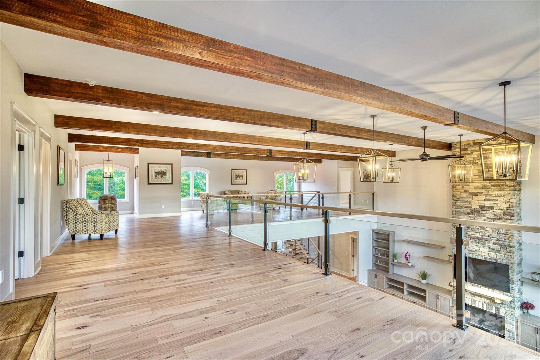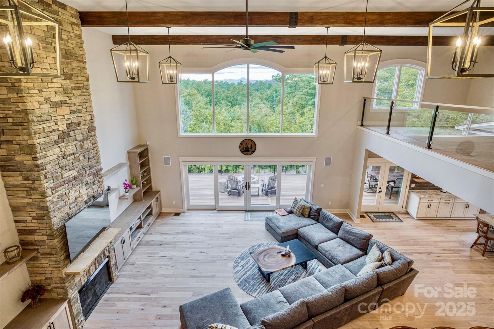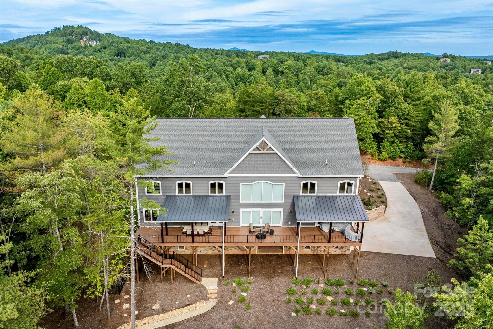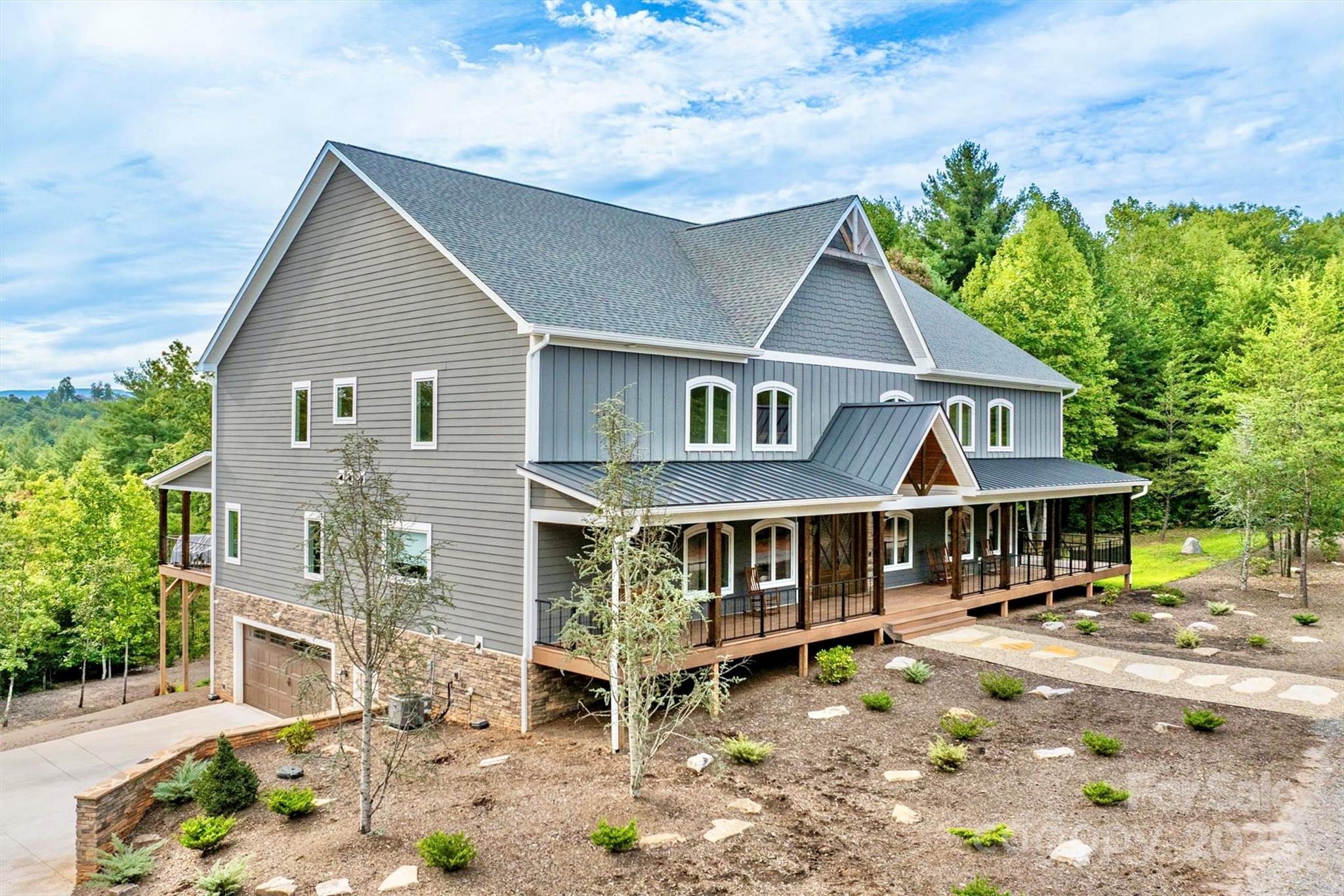On a 25 acre Blue Ridge Mountain private sanctuary is a stunning modern home, meticulously planned and built for luxury living and memory making. Beamed ceilings soar over floating oak stairs and 2 story stone fireplace. Walls of windows and mahogany French doors frame views of surrounding landscape, including Table Rock Mtn. Barely lived in, available furnished w/top of the line appliances, furnishings, linens, etc. Front and back porches and decks. Kitchen, butler pantry, and wet bar are an epicurean dream. Primary BR w/luxury Spa Bath, wet room, steam shower, soaking tub, heated floors + towel racks, 2 WICs, laundry room. Upstairs: 2nd primary BR, 3rd BR, 2nd laundry and full BA. Multiple bonus rooms. Elevator. Poured concrete foundation. 3,756 sq ft walkout basement with 1/2 bath is heated and cooled and is not counted in Heated Living Area. At The Coves Mountain River Club, a 3,200 acre active lifestyle gated community. See home’s website for details of home and community.