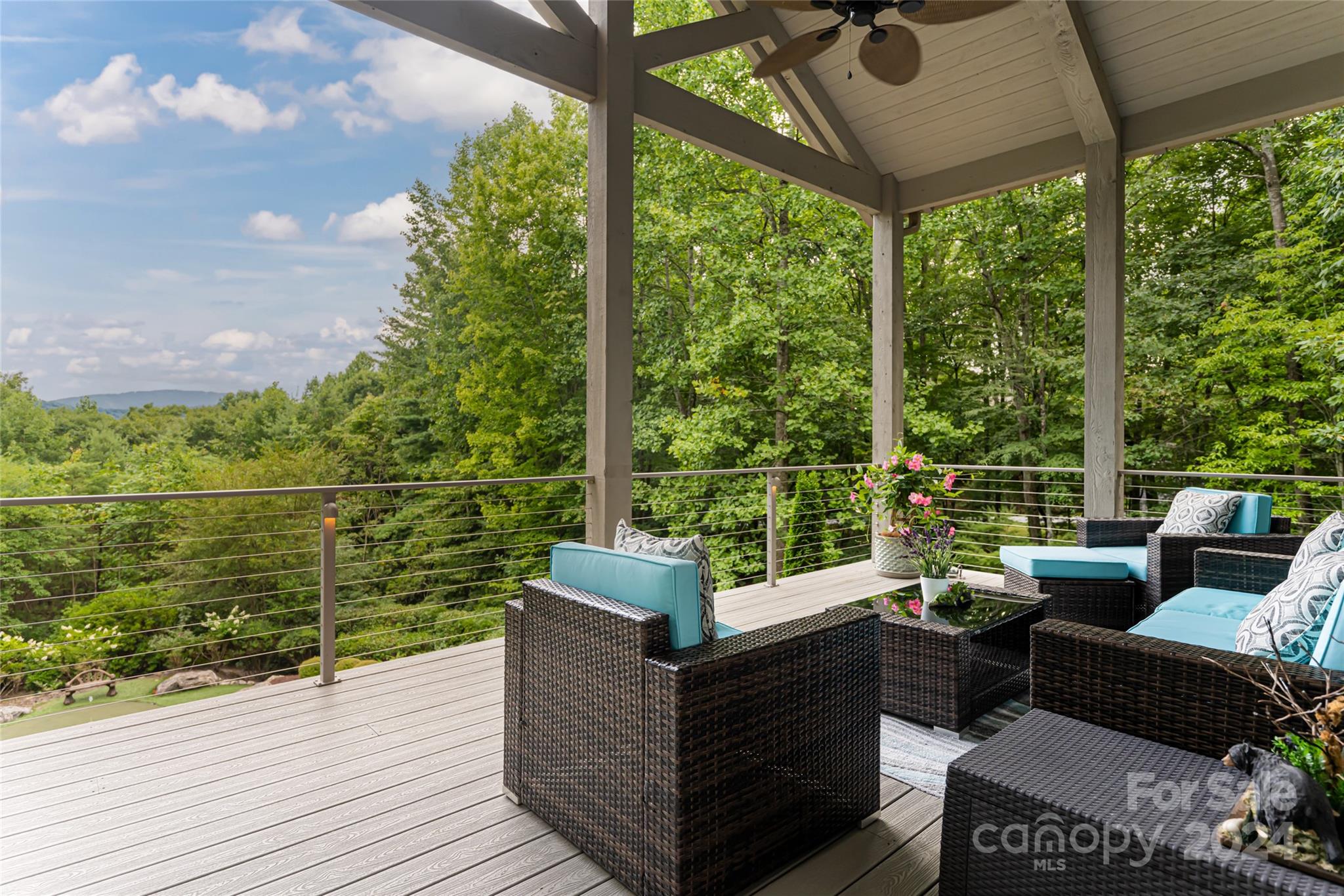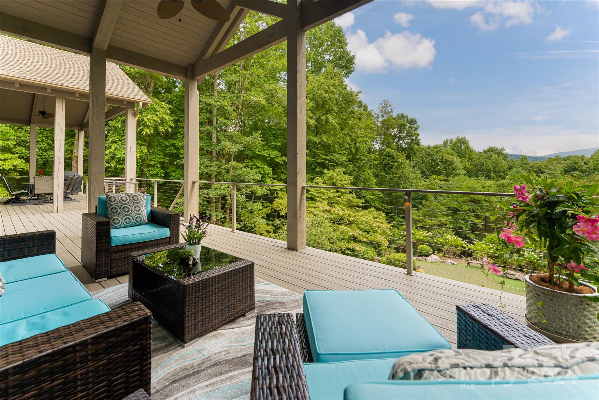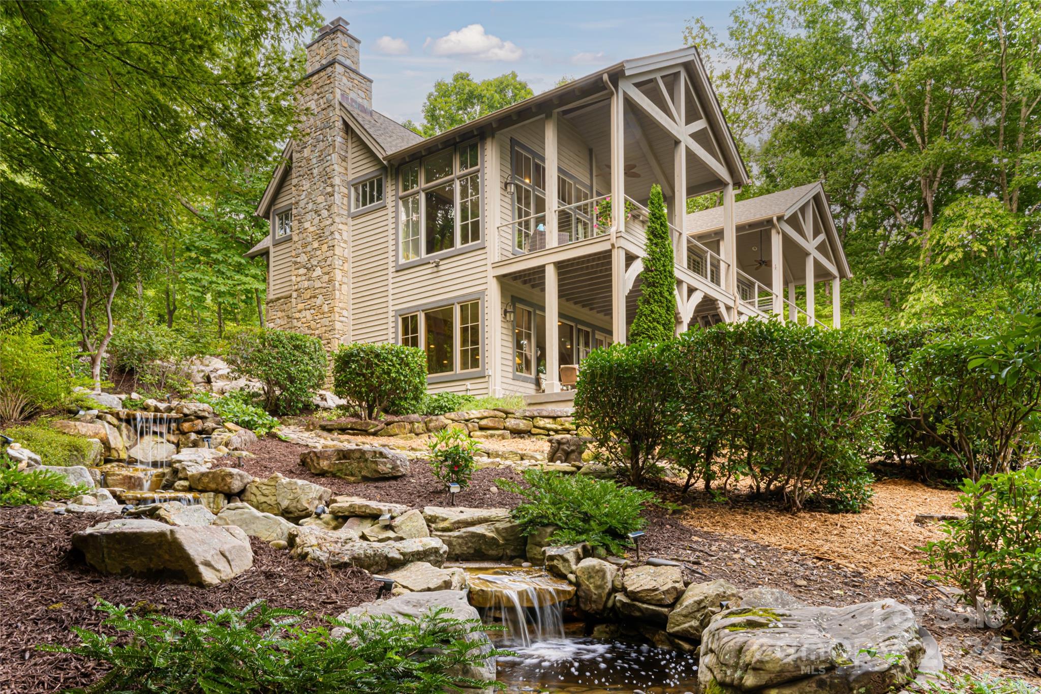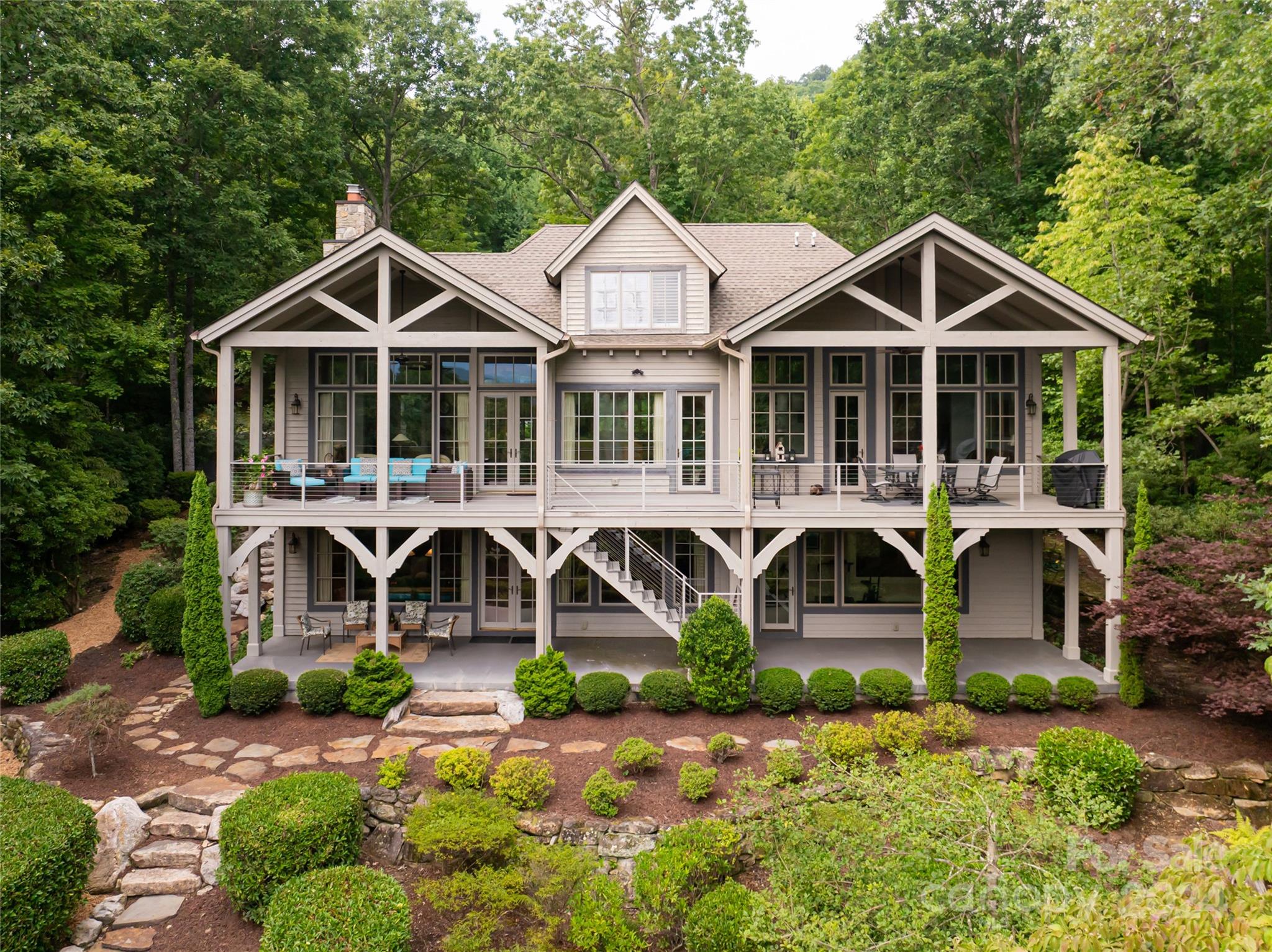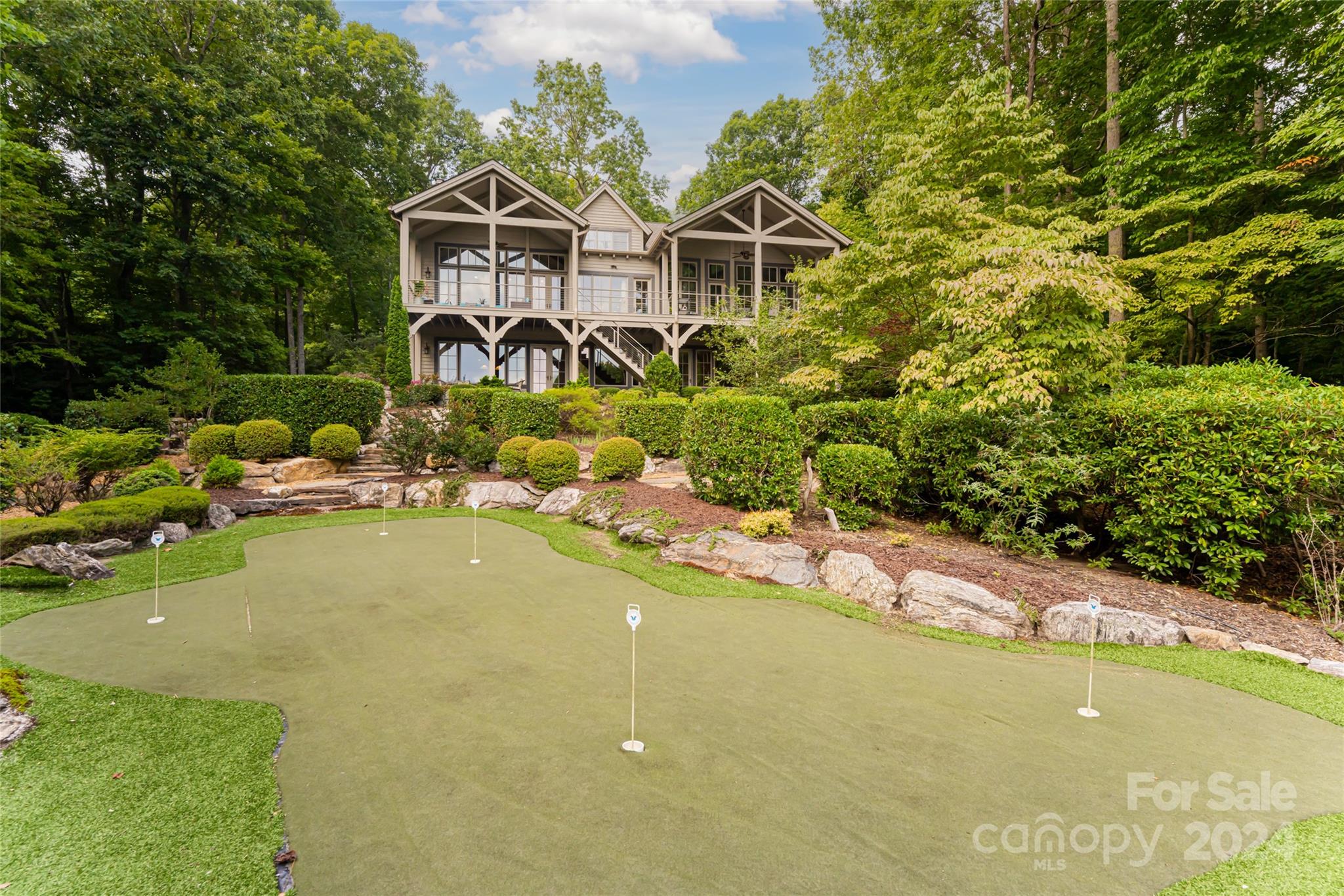 Set in the Champion Hills golf course community, 296 Cedar Rock Trail spans two homesites, offering unparalleled privacy and breathtaking long-range views. Carefully expanded in 2014, the light filled, open floorplan seamlessly blends the kitchen, dining, and living spaces together highlighted by a vaulted ceiling and stone fireplace. A full-length deck offers a perfect vantage point to enjoy stunning vistas and the soothing sounds of a private waterfall. The primary suite, located on the main level, is a serene retreat with a spa-like bath that includes a steam shower. Upstairs, two spacious en-suite bedrooms and a sitting room provide ample space for guests. The terrace level boasts a family room with fireplace and wet bar, a home gym, an additional en-suite bedroom, and versatile bonus room. A private putting green is perfect for golf enthusiasts. Champion Hills membership opportunities provide access to amenities including golf, fitness, dining, tennis, hiking, and more.