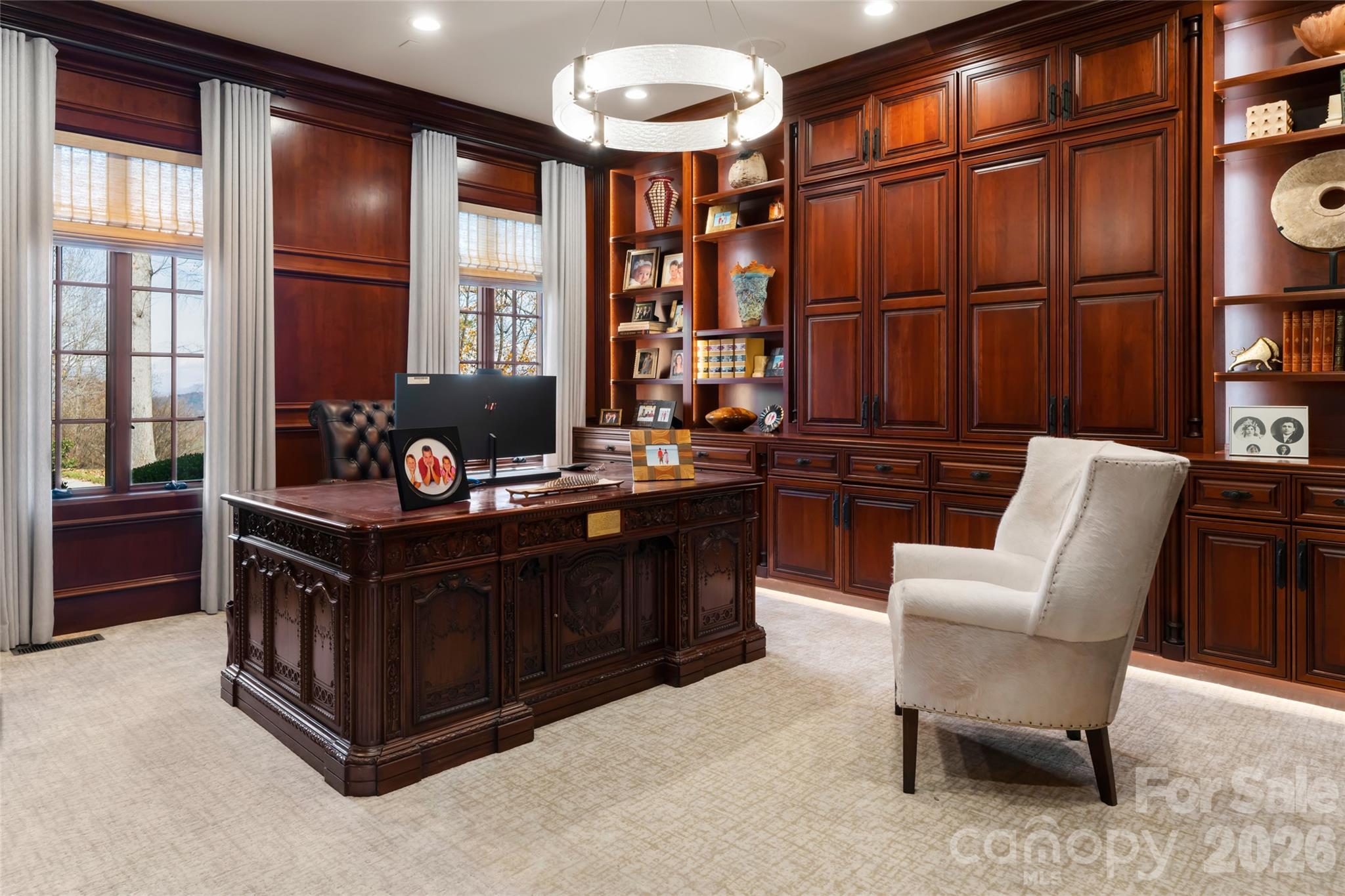 Set atop a private ridge in Biltmore Park, this French château–inspired estate offers 2.51 acres of level, professionally landscaped grounds with seasonal Blue Ridge Mountain views. Combining timeless design with modern luxury, the residence is located within one of Asheville’s most sought-after neighborhoods known for its walk-ability, community amenities and access to top-rated schools. The grand two-story foyer introduces refined interiors, anchored by a spiral staircase, floor-to-ceiling fireplace and expansive windows that maximize natural light. Designed for seamless indoor-outdoor living, the main gathering area opens to a private poolside retreat with a newly refinished swimming pool, spa, pool house, covered porch and hard-scaped entertaining areas. The main-level owner’s wing features newly installed black walnut hardwood floors, a sitting parlor with marble fireplace, and a spa-style bath complete with backlit Cristallo quartzite, whirlpool tub, heated floors, marble walk-in shower, dual vanities, dual closets and a discreet in-suite laundry. The re-imagined kitchen blends custom cabinetry with new appliances, a tower wine refrigerator, statement range hood and a mix of granite and quartzite surfaces. A nearby keeping room with fireplace offers direct access to the outdoor entertaining space. The upper level includes four en-suite bedrooms, a bonus room and a second laundry area. A cobblestone circular drive leads to a three-car attached garage and a detached two-car garage with an additional finished flex space above. Offering both privacy and proximity, this residence is minutes from Biltmore Park Town Square, the Blue Ridge Parkway, Asheville Regional Airport and premier Asheville shopping and dining. For those seeking a luxury estate with mountain views and architectural distinction, this Biltmore Park residence delivers elegance, scale and lifestyle integration.