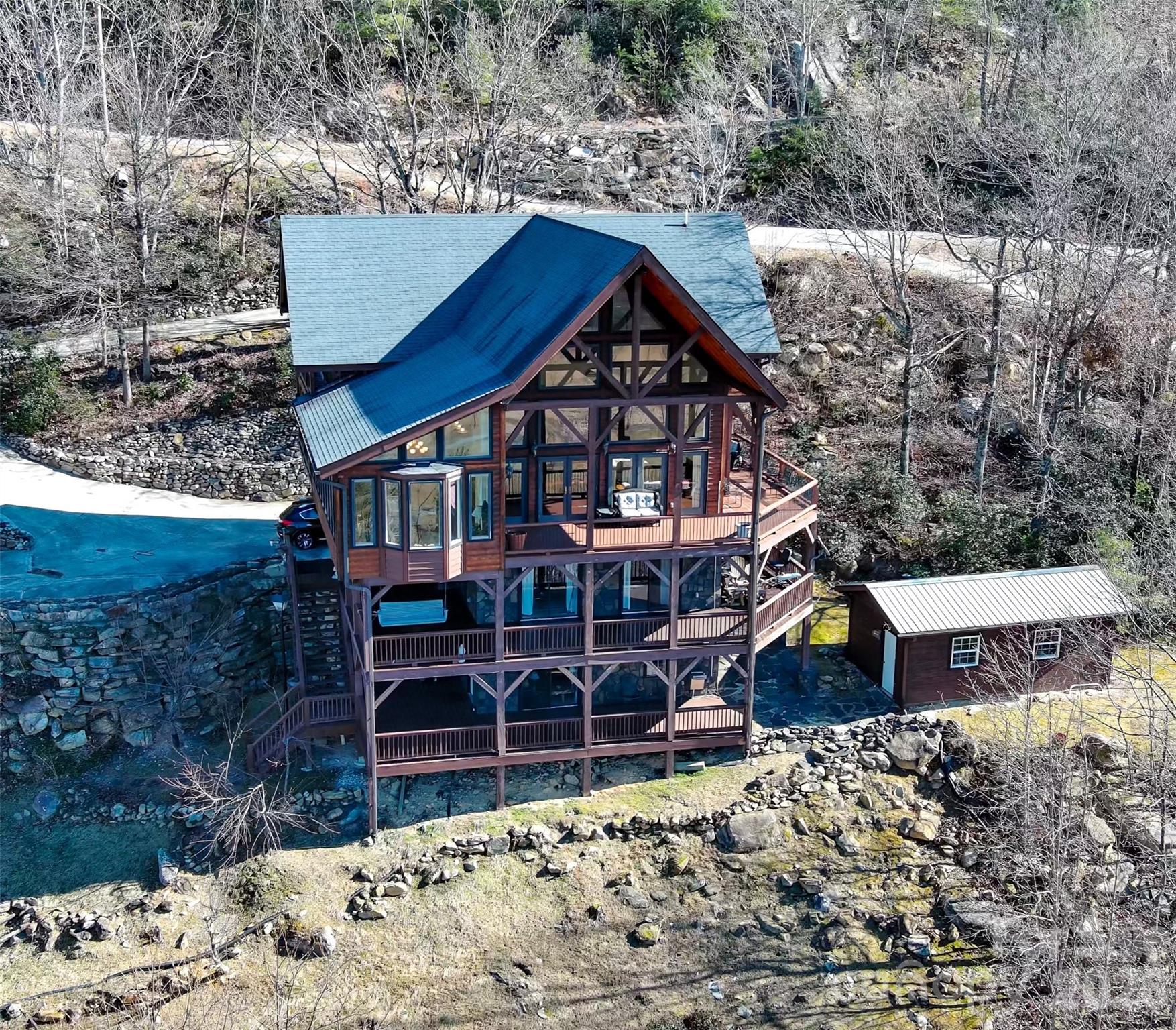 ABSOLUTELY STUNNING mountain home with EXTRAORDINARY long-range mountain views! This remarkable retreat offers four levels of living space, each with expansive covered porches designed to take full advantage of the breathtaking Blue Ridge Mountain scenery. Located in Linville Mountain Acres, this 4BR/4.5BA home blends rustic mountain charm with elegant design and spacious living. The main level features a large great room ideal for entertaining, where expansive windows frame the incredible mountain views at every turn. This level also includes a bedroom suite, walk-in pantry, and half bath, all opening to multiple covered porch areas perfect for relaxing and enjoying the cool mountain air. The upper level loft serves as another private bedroom suite with a large laundry room/closet and its own covered porch overlooking the mountains, creating a peaceful retreat. The daylight basement level offers two additional bedrooms, a full bath, and a comfortable den, all opening to another covered porch where the views continue to impress. A fourth lower level adds even more flexibility with an additional kitchen, bonus/rec room, and full bath, also featuring its own covered porch—ideal for guests, entertaining, or multi-generational living. Perfectly located to enjoy the very best of the Blue Ridge Mountains, the home is just 15 minutes to Linville Gorge access, Linville Falls, and the Blue Ridge Parkway, and within 30–40 minutes of Banner Elk, Boone, Grandfather Mountain, skiing, hiking, and countless outdoor adventures. Furnishings negotiable.