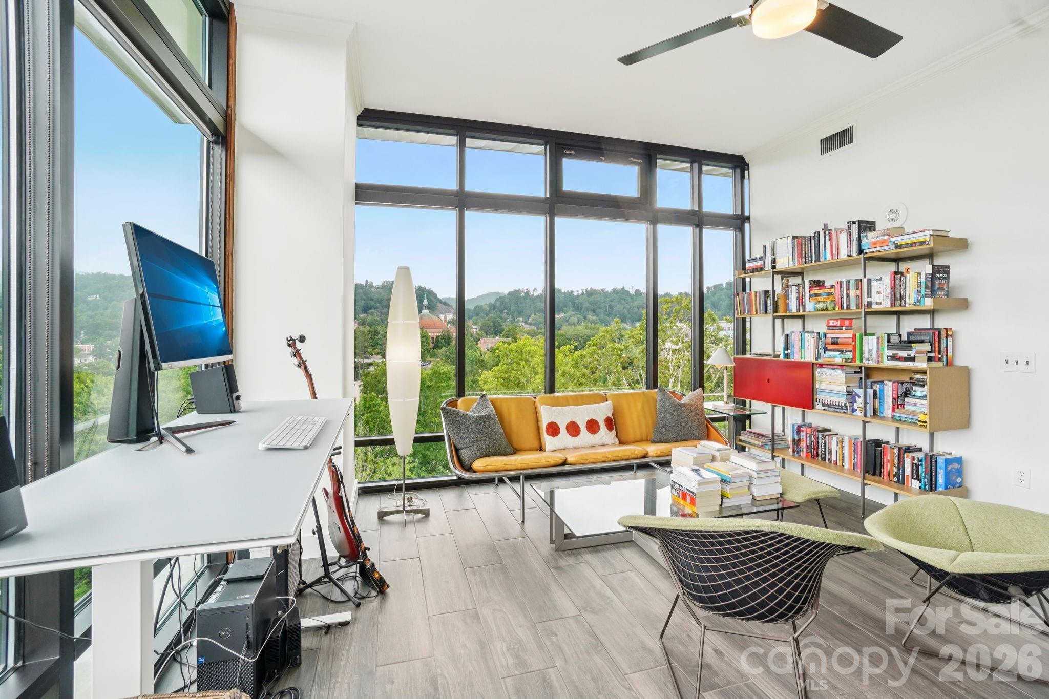 Looking for a condo that lives like a house but with all the benefits of a condo? This stunning two-story gem in the heart of Asheville offers the perfect balance of together spaces and sanctuary. Completely repainted throughout (including the trim) + new lighting and plumbing fixtures, it feels sleek, fresh, and move-in ready. Exceptional in both design and location, this unit boasts floor-to-ceiling, super-insulated windows framing sweeping views of the mountains and Asheville’s iconic church dome adorned with both sunrise and sunset skies. Enjoy private access to the rooftop patio, stylish clubroom, and state-of-the-art fitness center—all just steps from your door! This community is known for its friendly, warm and welcoming residents who provide a rich schedule of cultural, artistic and social events. Two deeded spaces in the secure garage make parking effortless. No need to drive downtown: Asheville’s best dining, shopping, and cultural attractions are but one block away. Furnishings negotiable!