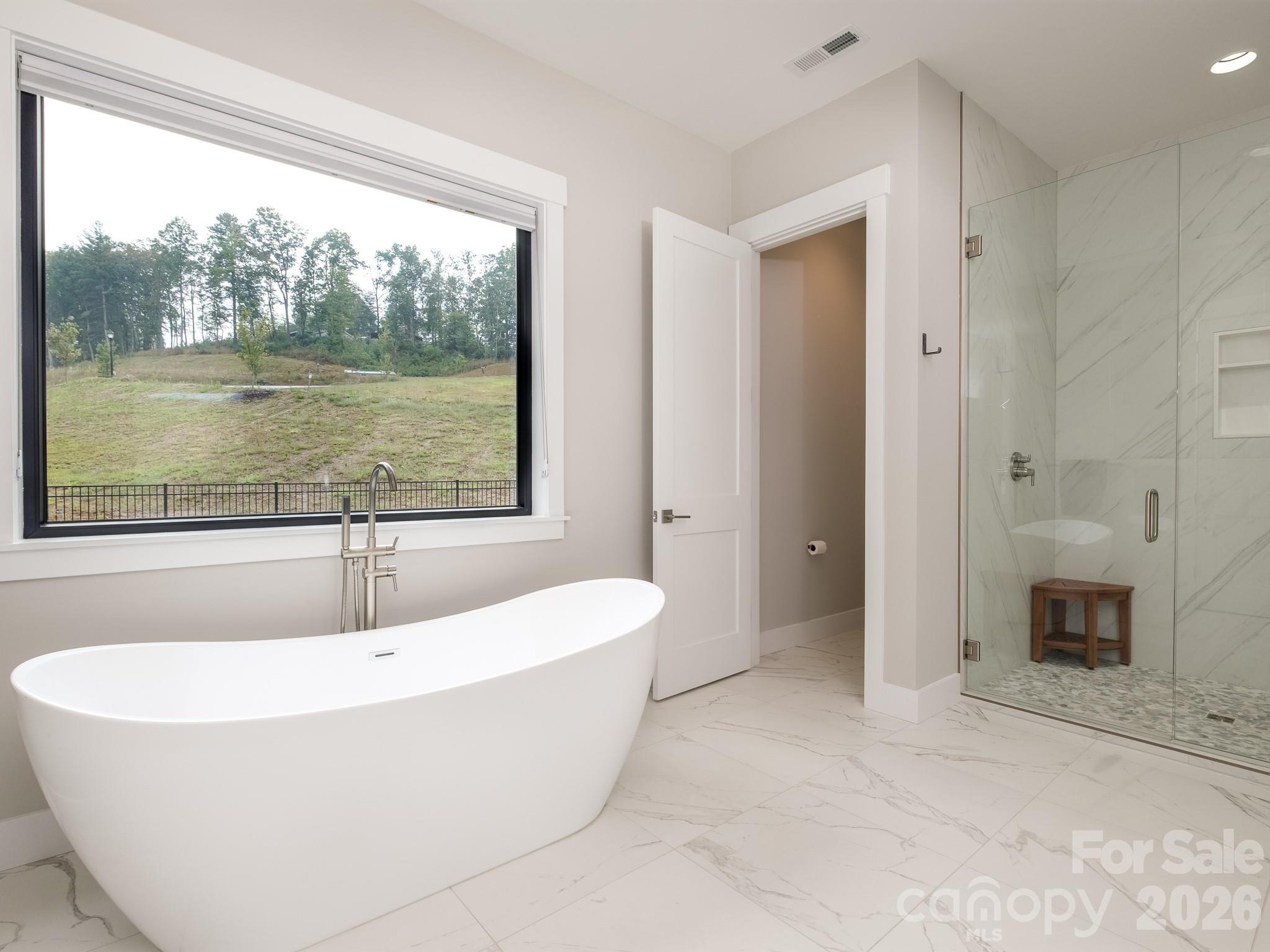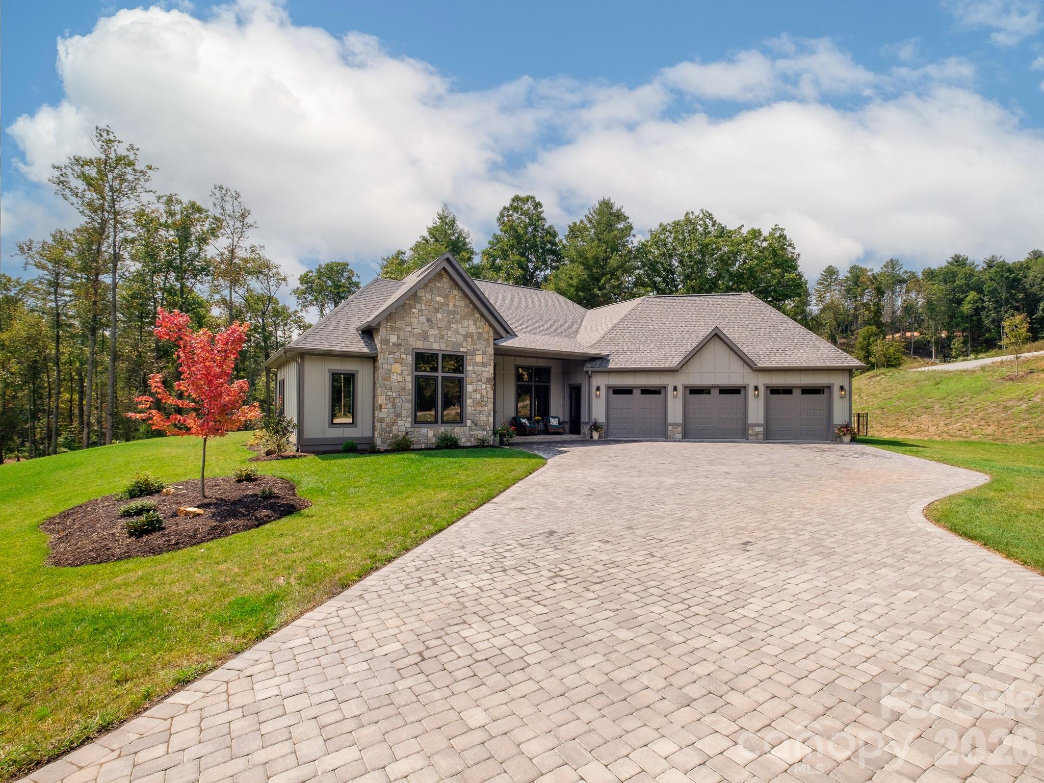 Introducing an unrivaled opportunity within the exclusive, gated Horse Shoe Cove community. At 2.7 acres, this stunning modern retreat commands the largest and most desirable lot in the entire development, offering a level of privacy and ease of use that is a often sought, yet rarely found. A distant advantage of this property is its topography: a remarkable, perfectly level full acre of manicured lawn. This flat, usable terrain is a true unicorn in our mountainous region, providing immediate, ready-to-use space for gardening, play, or a future pool, perfectly complemented by the balance of wooded privacy. The architecture and design brilliantly capitalize on the enchanting setting. This home is a testament to thoughtful design and coveted true one-level living, offering a seamless flow between the elegant interior and the flat, expansive grounds. Soaring 12-foot ceilings, 8-foot doors, and walls of windows flood the open floor plan with light and draw the eye toward the surrounding tranquility. The great room is centered around a remarkable floor-to-ceiling custom stone fireplace flanked by elegant floating shelves, making the space ideal for both quiet nights and lively gatherings. The gourmet kitchen is a chef's dream, appointed with top-of-the-line Thermador appliances and anchored by a walk-in butler's pantry to keep the main space clutter-free for effortless entertaining. The luxurious primary suite offers a private escape with an oversized walk-in closet and a spa-like shower and grand soaking tub. For supreme comfort, all bathrooms feature heated floors. The home's greatest extension is the expansive screened-in patio, which acts as a second living room complete with its own stone fireplace, a built-in grilling station, and dining area. This outdoor sanctuary directly overlooks the level, fenced-in yard, confirming that the usable acreage is a natural, effortless extension of the living space. The attached three-car garage goes beyond the standard, offering impressive storage. The location is unparalleled: a short drive to the vibrant scenes of Asheville, Hendersonville, and Brevard; minutes from the acclaimed Ecusta Trail; convenient proximity to Asheville Regional Airport (AVL) as well as a local hospital system recognized as One of America's 100 Best Hospitals for 2025. This is more than a home—it is an invitation to secure a premier, luxurious estate in beautiful Western North Carolina.