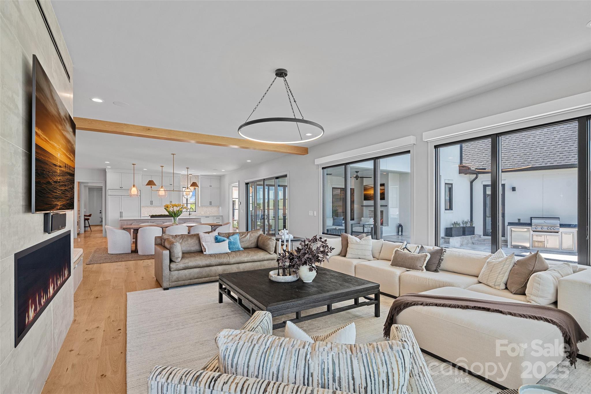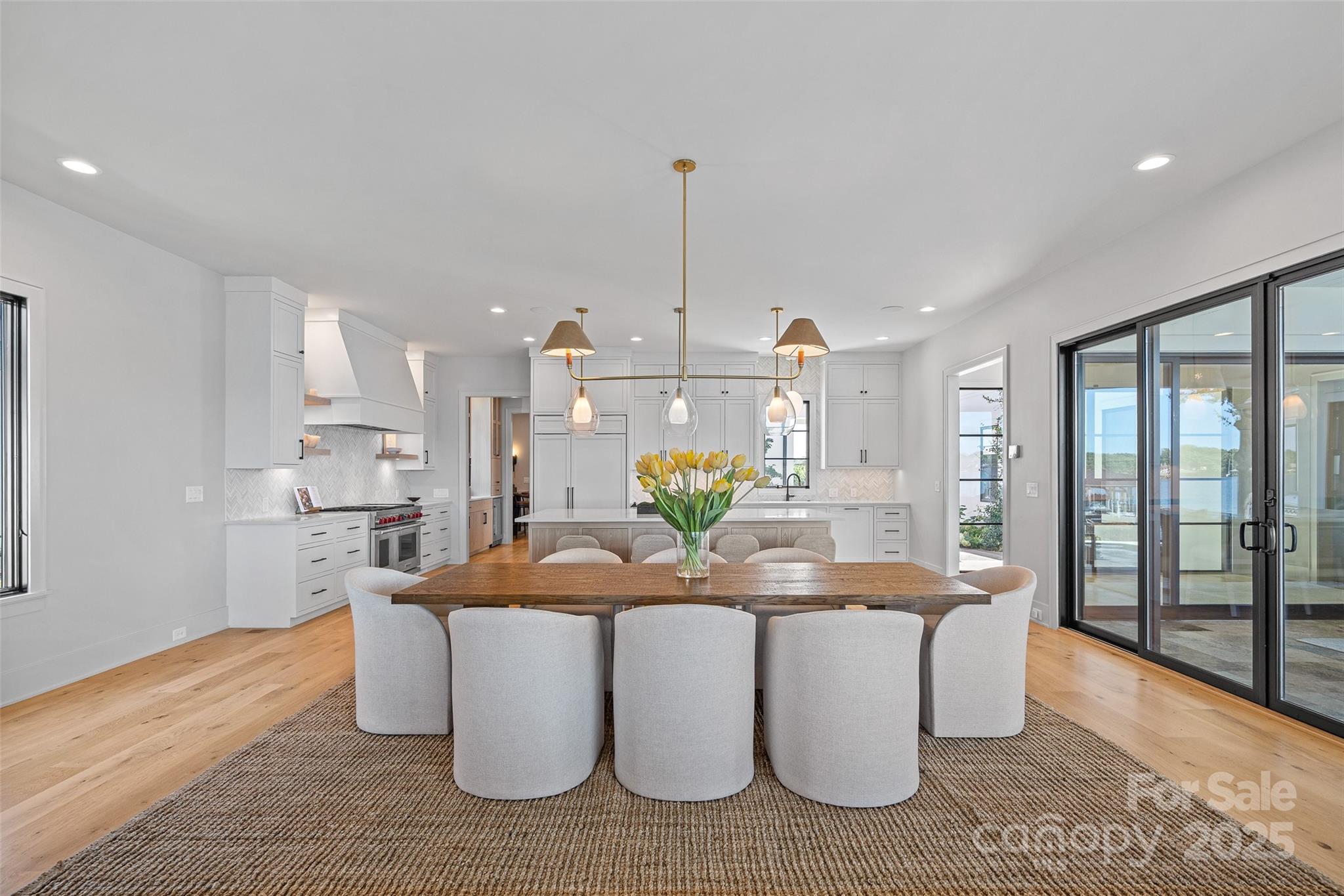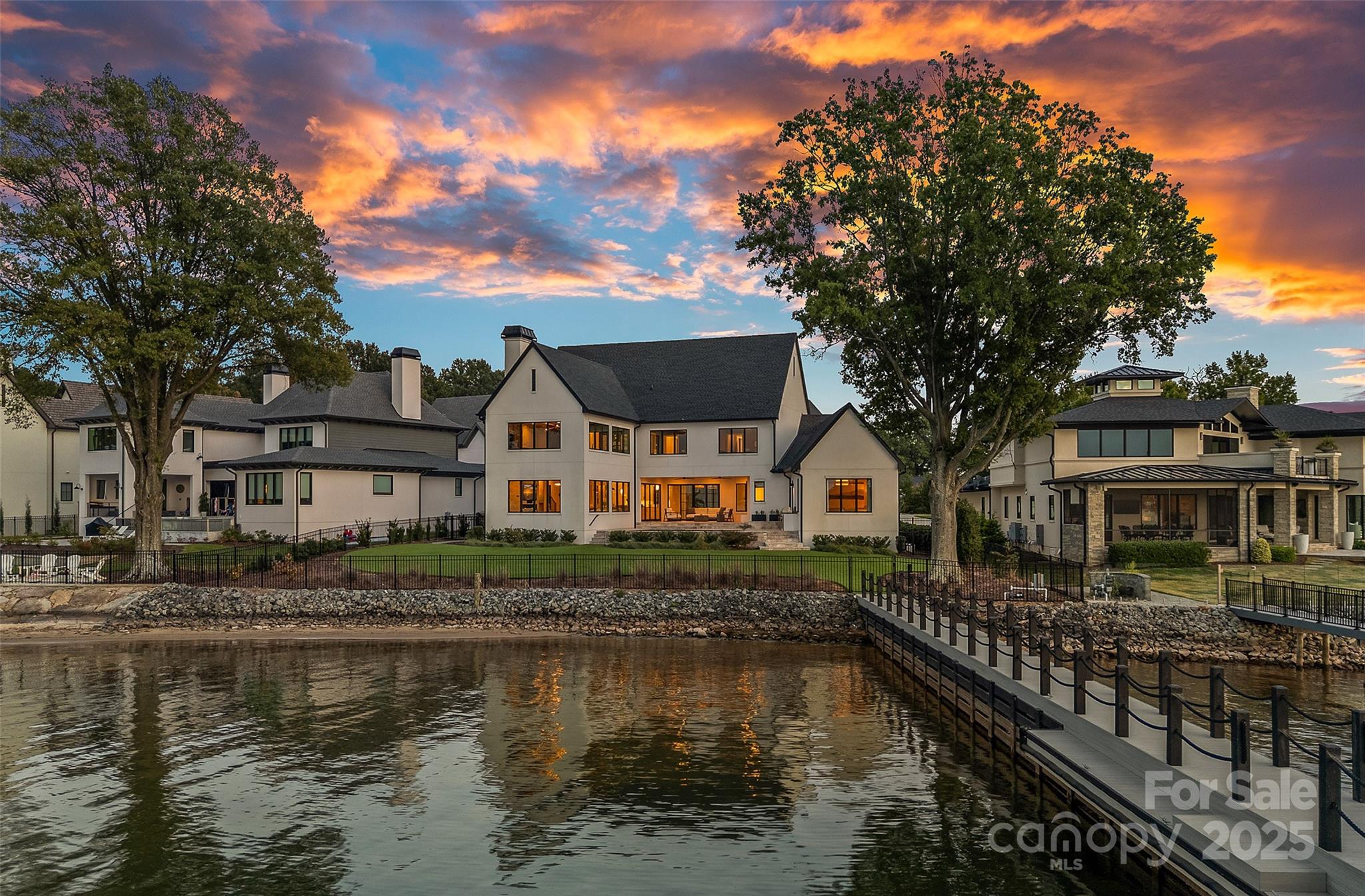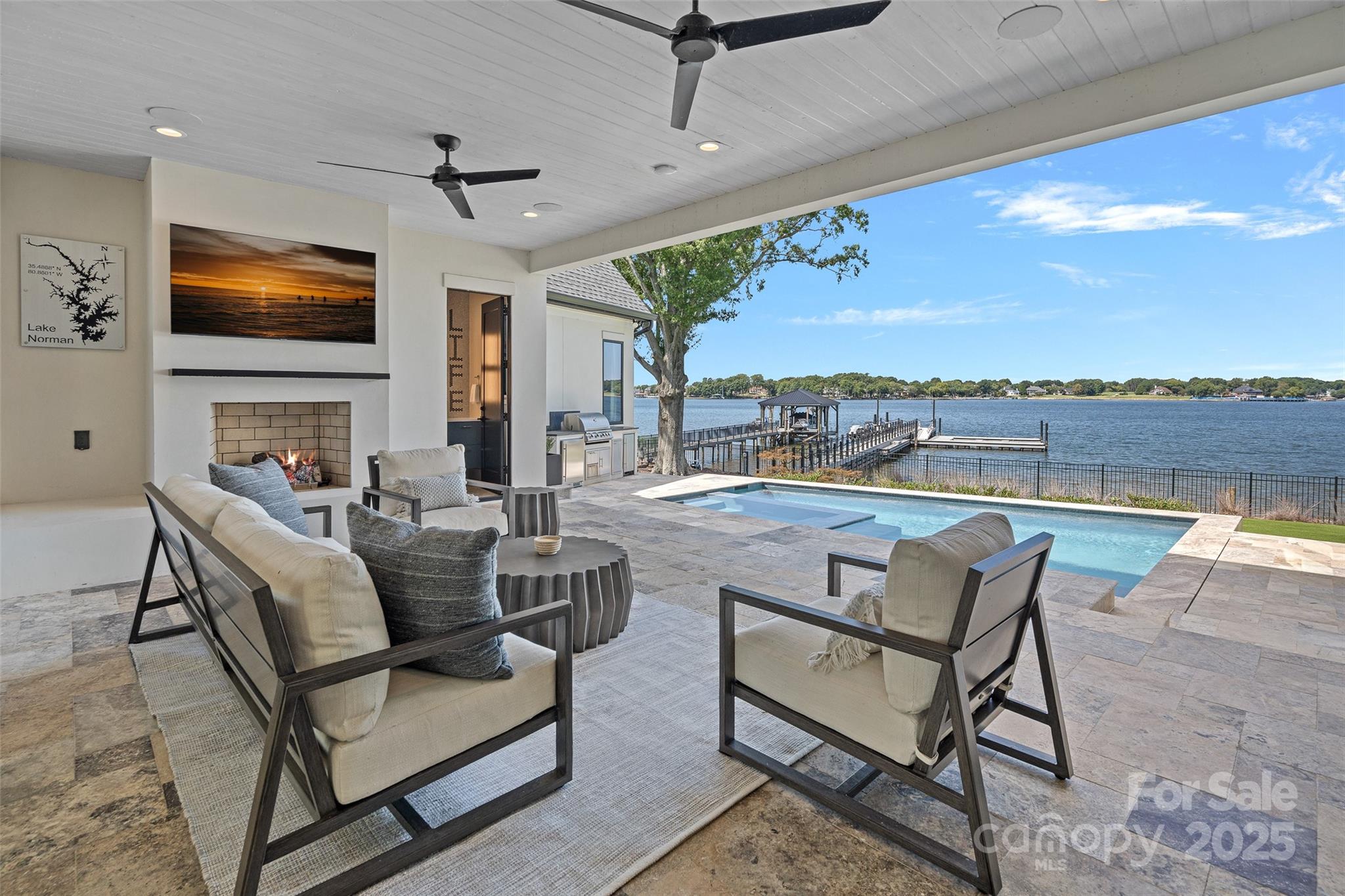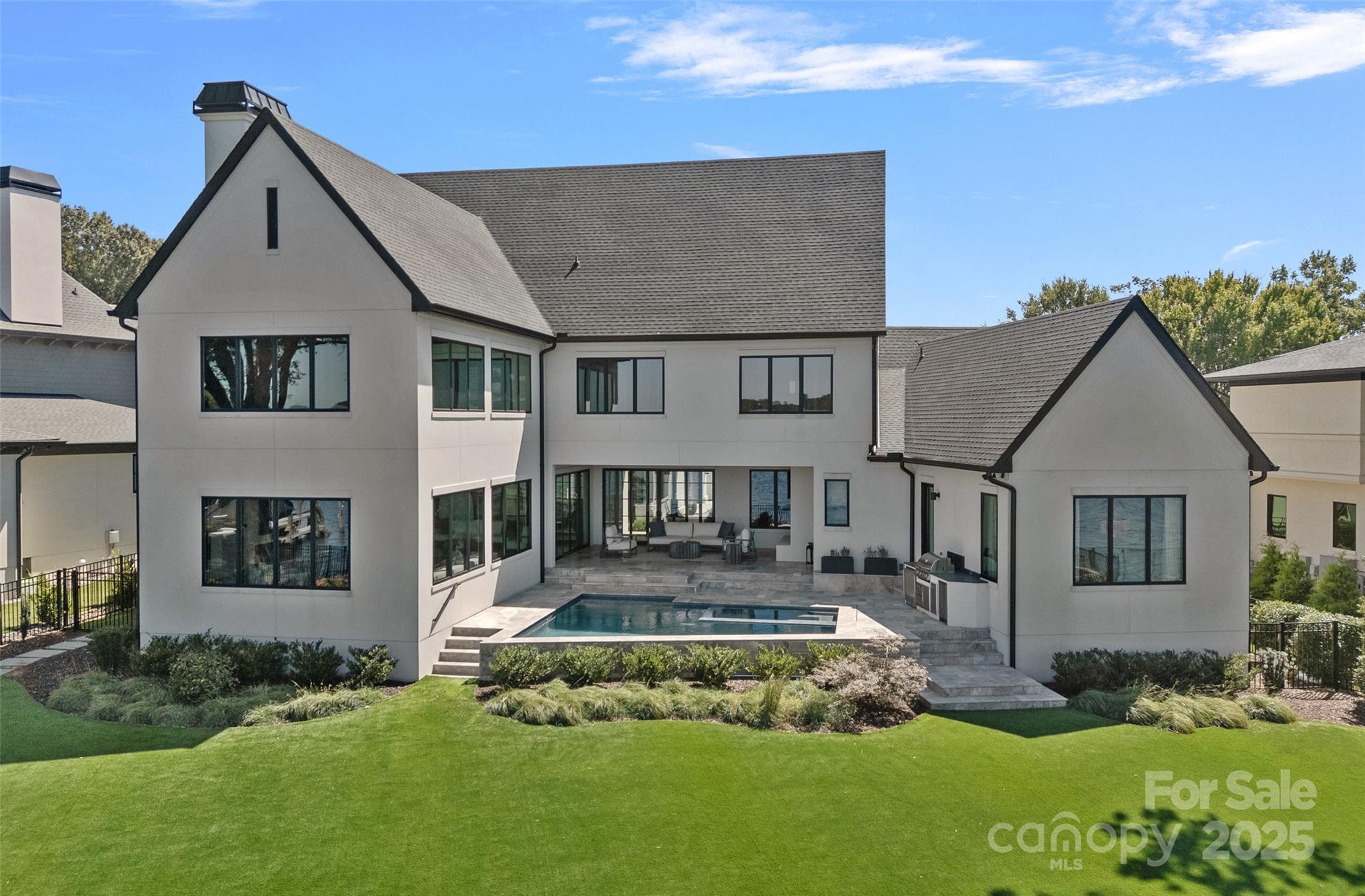 A rare offering on Lake Norman, this gated luxury waterfront estate redefines resort-style living in the heart of Cornelius. Perfectly situated to capture the breathtaking long-range views, this home blends architectural elegance with modern luxury, creating a private retreat designed for elevated yet effortless entertaining. Beyond your secluded courtyard adorned with gas lanterns, a world of refinement unfolds from soaring 10’ ceilings, wide plank white oak floors, and walls of glass that frame the water from nearly every room. The gourmet chef's kitchen is anchored by a grand island, 8-burner Wolf range with double oven, scullery, wine room, planning center, and bespoke coffee bar. Seamless transitions connect the dining and living spaces to an expansive veranda with gas fireplace, separate pool bath and built-in grilling area, all overlooking the heated pool & spa, and stunning lake views. The main-level primary retreat is a sanctuary unto itself with exceptional finishes, spa style bath, his-and-hers closets with private laundry, and tranquil water views. Upstairs, a sizable family lounge, flex room, built-in homework station, and three generously sized ensuite bedrooms provide comfort and privacy, while a breezeway leads to a private second living quarters, complete with kitchenette, full bath, and balcony. Outdoors, a private pier with sundeck and floating dock extends the living space onto the lake, offering the ultimate backdrop for boating, entertaining, or simply watching the sun set in seclusion. With no HOA, a premier Cornelius location, and every modern luxury thoughtfully curated, this residence stands among the most exclusive lakefront properties on Lake Norman. Offered fully furnished with every piece and accessory intentionally selected and professionally designed.