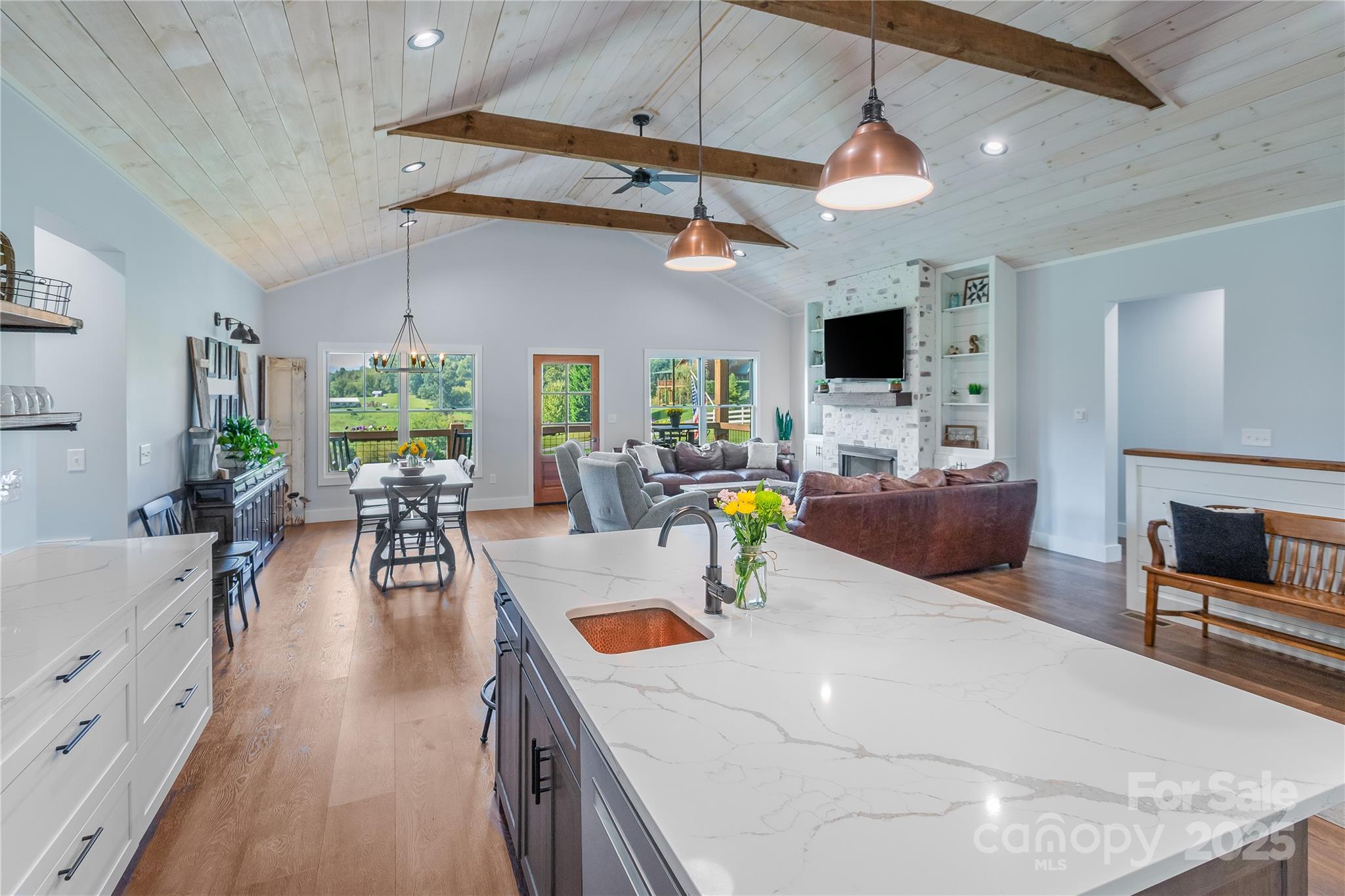Welcome to this stunning newer-construction retreat in the heart of Haywood County. Built in 2021, this 4-bedroom, 3-bathroom home offers 2,858 square feet of thoughtfully designed living space that perfectly balances comfort, style, and functionality. From the moment you arrive, you’ll feel the peace and privacy of the countryside—yet enjoy the convenience of being only minutes from downtown Waynesville and a quick connection to I-40 for Asheville, Knoxville, or beyond. Step inside to a bright, open floor plan that instantly impresses. The vaulted ceilings with exposed beams, wide-plank hardwood floors, and walls of windows bring in abundant natural light and highlight the home’s modern farmhouse charm. At the heart of the home, the gourmet kitchen is a true showstopper: quartz countertops, a copper farmhouse sink, stainless steel appliances, custom cabinetry, and a large island with seating for four—perfect for gathering with family and friends. A walk-in pantry with a rustic sliding door adds both function and character. The kitchen flows seamlessly into the spacious family room, where a stone fireplace with a reclaimed wood mantel creates the perfect centerpiece. Whether you’re hosting holiday gatherings or enjoying quiet evenings by the fire, this space is warm and inviting. The adjacent dining area offers plenty of room for entertaining, with direct access to the covered porch where you can soak in expansive mountain views. The main-level primary suite is a private sanctuary, complete with a spa-inspired en-suite bath and generous closet space. Three additional bedrooms and well-appointed baths ensure plenty of room for family, guests, or a home office. Downstairs, the finished lower level provides a versatile bonus space—ideal as a media room, game room, or second living area. With direct outdoor access, it’s perfect for both entertaining and everyday living. Outdoor living is just as special here. A covered porch invites you to relax and take in the sweeping views of the mountains and rolling countryside, while the landscaped yard provides space to garden, play, or simply breathe in the fresh mountain air. Additional highlights include a two-car garage, energy-efficient construction, and timeless finishes that make this home move-in ready. This is more than a house—it’s a lifestyle. A place where every detail has been crafted to create comfort, beauty, and connection to the surrounding mountains. Whether you’re seeking a full-time residence or a luxurious getaway, this Haywood County gem offers the perfect blend of modern luxury and Appalachian charm. Don’t miss your chance to make it yours. Showings begin Friday September 26th