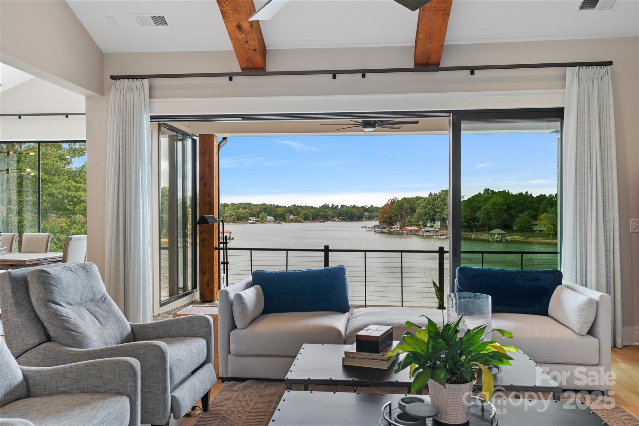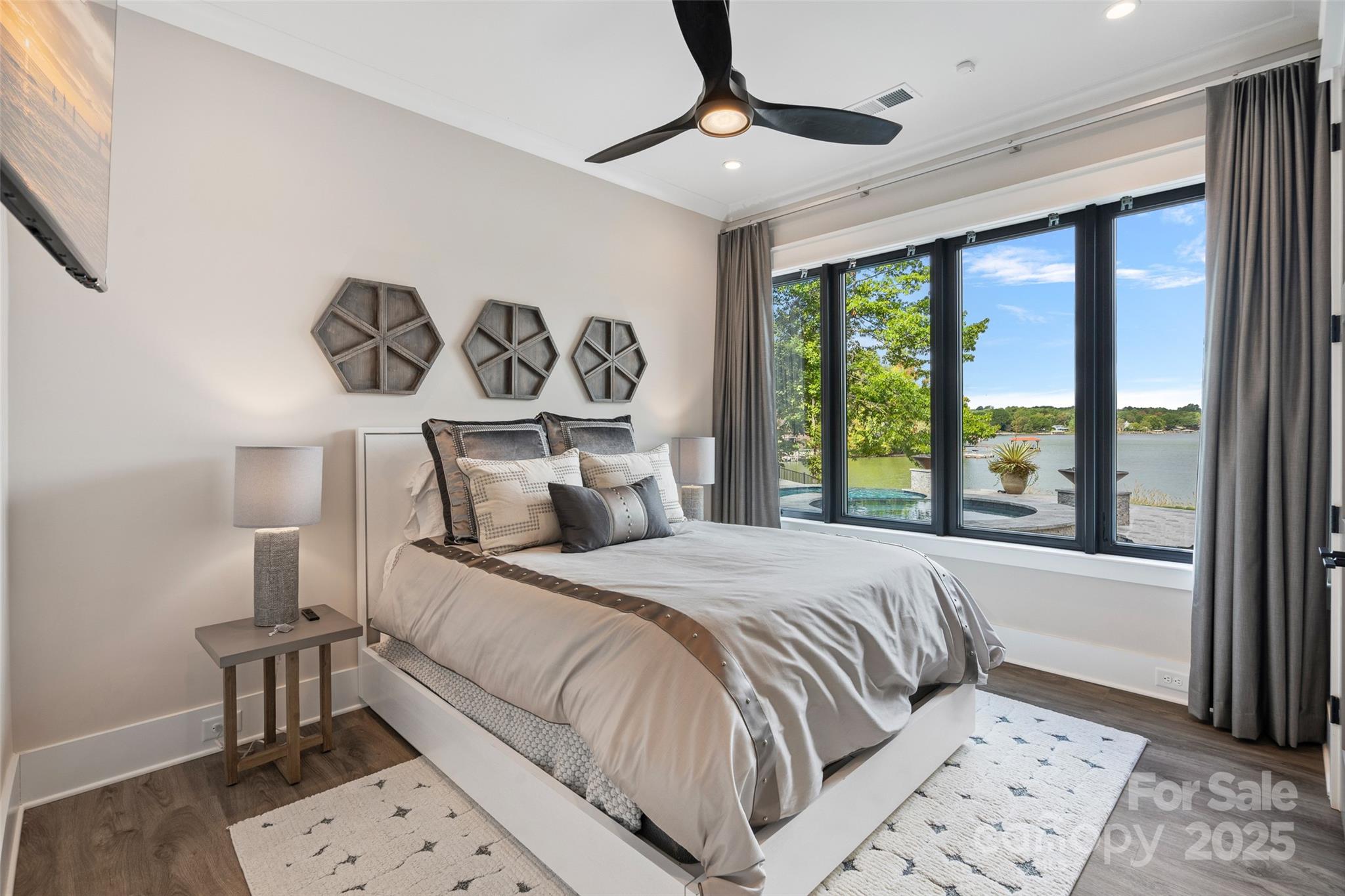 Stunning Custom Ranch with Basement on Waterfront Lot — No HOA! This custom-built home offers exceptional craftsmanship and thoughtful design throughout. Enjoy lake living with your own private dock and the freedom of no HOA restrictions. The main level features an open floor plan ideal for entertaining, showcasing a gourmet kitchen with custom cabinetry, quartz countertops, and top-of-the-line appliances including a 48" smart commercial-style gas range with 6 burners, electric griddle, true convection oven, a 30" side-by-side refrigerator, and a 30" side-by-side freezer. The spacious primary suite includes a luxurious bath and an oversized walk-in closet, along with a secondary bedroom conveniently located on the main level. Step out to the covered back deck overlooking the water — the perfect spot for morning coffee or evening sunsets. The lower level offers even more space with two additional bedrooms, multiple flex rooms, a large great room, and a full bar area complete with refrigerator, sink, and quartz countertops — ideal for hosting and entertaining. A total of four garage spaces — a three-car garage plus an additional side-entry one-car garage — provide ample room for vehicles, storage, or car enthusiasts. Every detail has been carefully curated by a professional designer with selections that are truly too numerous to list. This home blends elegance, functionality, and comfort in a serene waterfront setting.