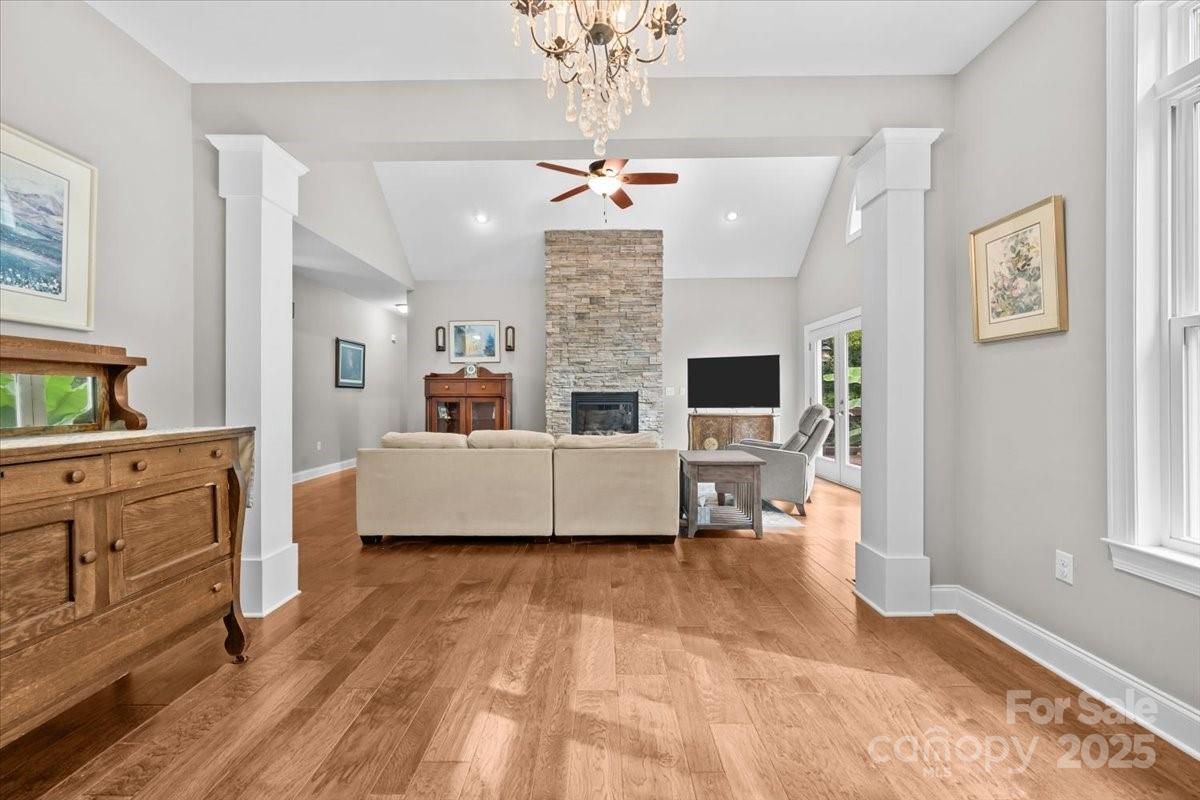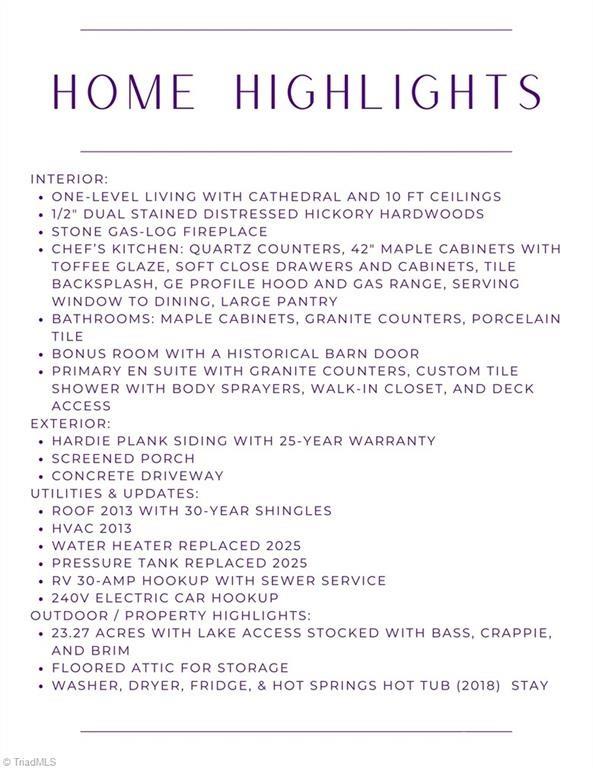 Discover a rare lakeside retreat on 23+ acres, where privacy and elegance meet in one-level living. Soaring ceilings, hickory hardwoods, and natural light create a welcoming flow from the grand living room with stone fireplace to the formal dining area and chef’s kitchen. Designed for both function and beauty, the kitchen offers custom cabinetry, quartz counters, a gas range, serving window, and SS appliances. A versatile bonus room with barn door entry adds flexibility for work or play. The expansive primary suite is a private haven with a custom shower, walk-in closet, and direct access to the deck with hot tub and screened porch overlooking the lake. Step outside to fish for bass, crappie, or brim, explore the rolling acreage, or enjoy the peace of the surrounding woods. With thoughtful updates, RV and EV hookups, and ample storage, this property blends modern convenience with timeless charm. An exceptional setting for entertaining, relaxing, and fully embracing country lake living!