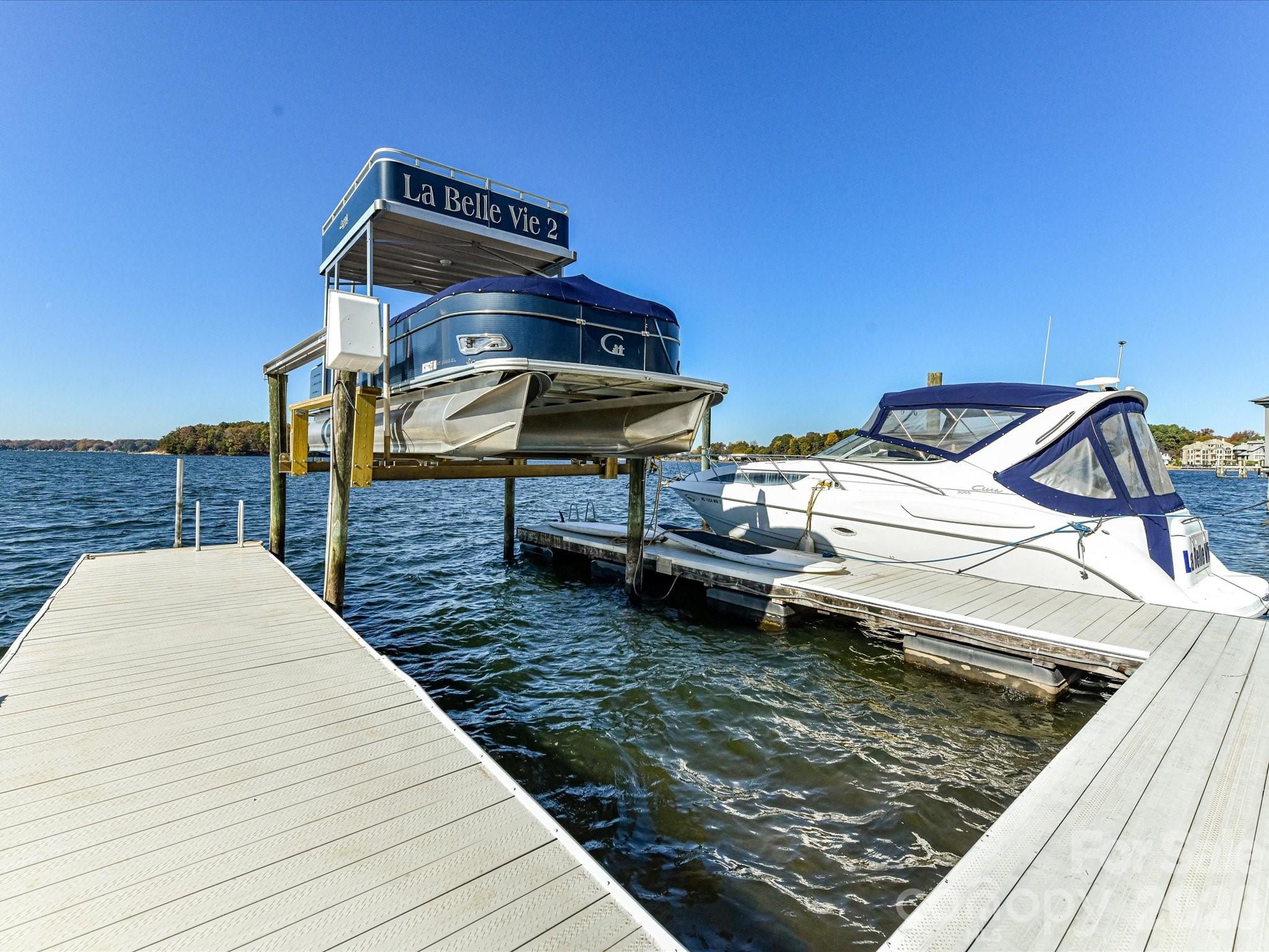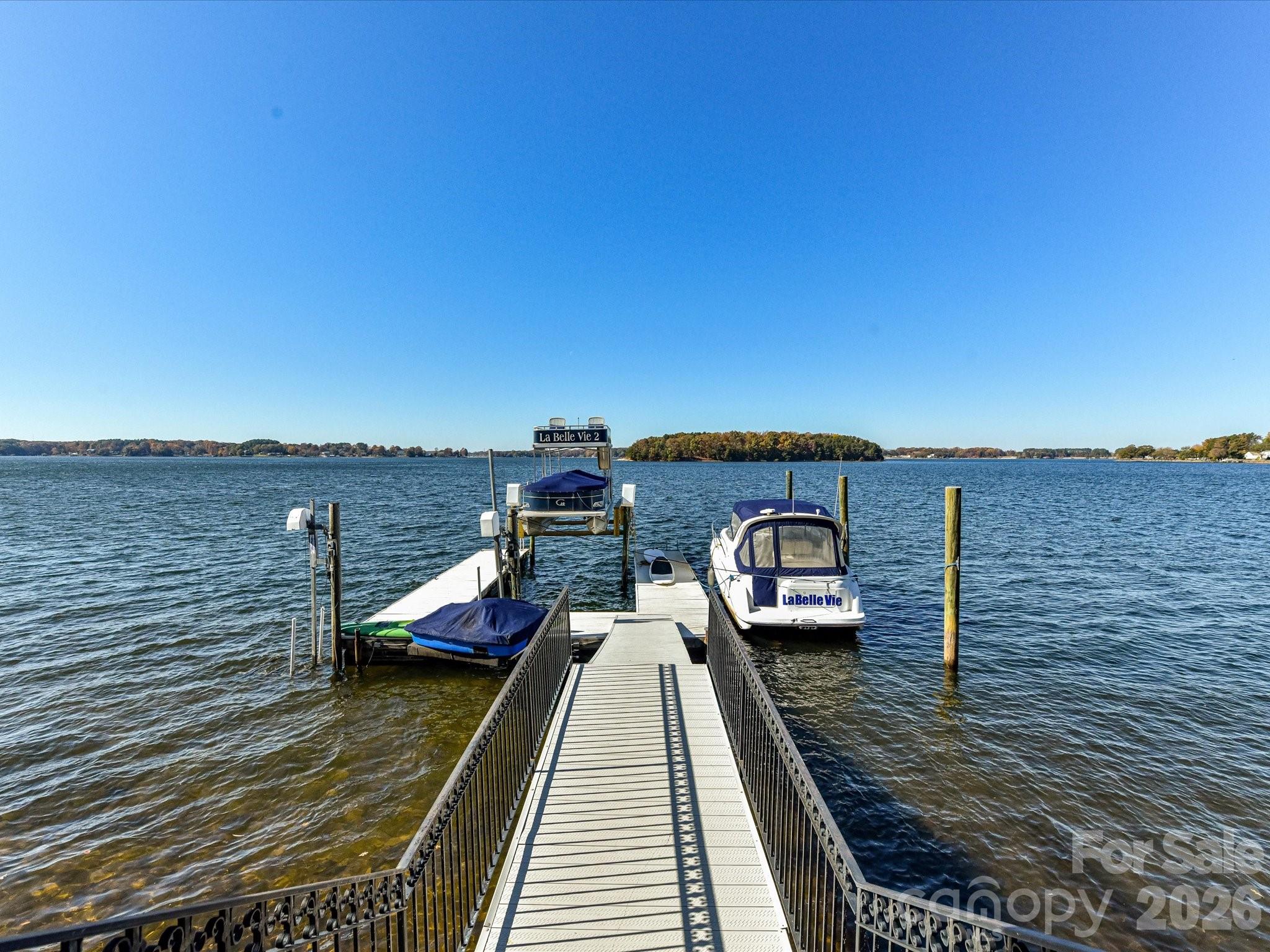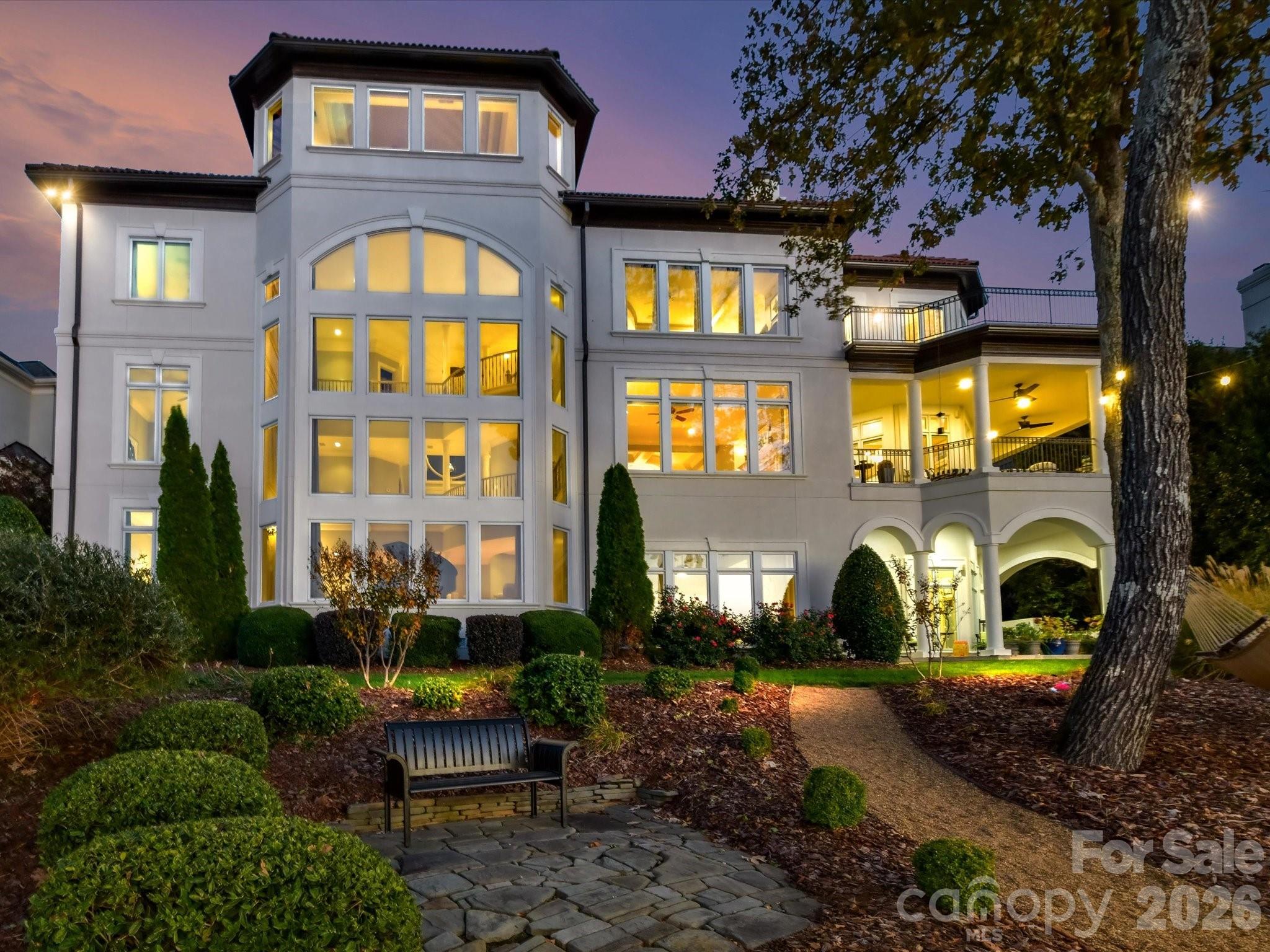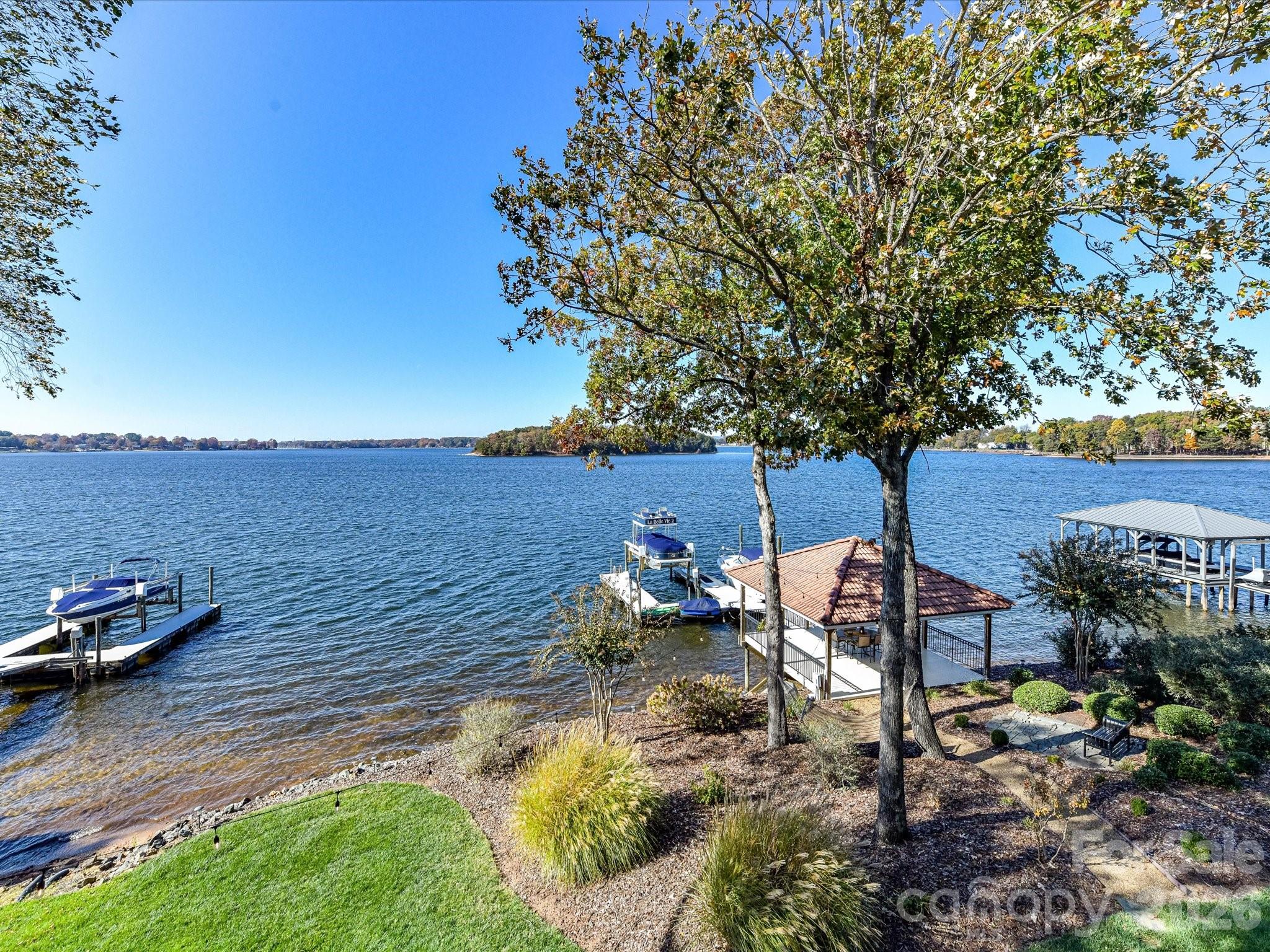 Architecturally distinctive Mediterranean-inspired waterfront estate by renowned builder G.M. Helms, designed in collaboration with architect Christopher Phelps and celebrated interior designer Dina Lowery. Featured on the cover of Charlotte Magazine as an architectural wonder, the residence was recently selected as the filming location for a television commercial, further highlighting its distinctive design. The four-story home is ideally positioned on Lake Norman’s main channel with west-facing exposure and breathtaking sunset views. Designed to be both grand and inviting, the home unfolds through a series of refined yet comfortable living spaces. A dramatic three-story great room anchors the residence, showcasing soaring ceilings, a monumental limestone fireplace, and an expansive wall of lake-facing windows that flood the home with natural light. A striking four-story self-supported circular staircase winds gracefully through all levels, serving as the home’s defining architectural centerpiece. The residence offers approximately 7,400 square feet of living space, including five bedrooms, eight baths, six fireplaces, a Brazilian cherry wood library, media room, billiards room, and an elevator serving the first three levels. Designed with entertaining in mind, the home features a chef’s kitchen on the main level and a full secondary kitchen on the lake level, along with multiple gathering and leisure spaces throughout. The fourth-floor sky lounge with bar provides elevated views of the lake and surrounding islands, creating a unique retreat for entertaining or quiet relaxation. Outdoor living is equally compelling, with three balconies, a Spanish-tiled lakeside gazebo, and a deep-water dock equipped with lifts for two jet skis, a double-decker pontoon, and pilings suitable for a 45-foot yacht. Preliminary HOA approval for a pool has been obtained, offering the opportunity to further enhance the property’s lakeside experience (subject to final Architectural Review Committee approval). Lovingly maintained by only two owners since its 1997 construction, the home has been extensively updated, including renovated kitchens and baths, four HVAC systems, two tankless water heaters, enhanced audiovisual systems, interior and exterior repainting, and refreshed landscaping. A rare offering that seamlessly blends timeless Mediterranean architecture, thoughtful craftsmanship, and premier Lake Norman waterfront living.