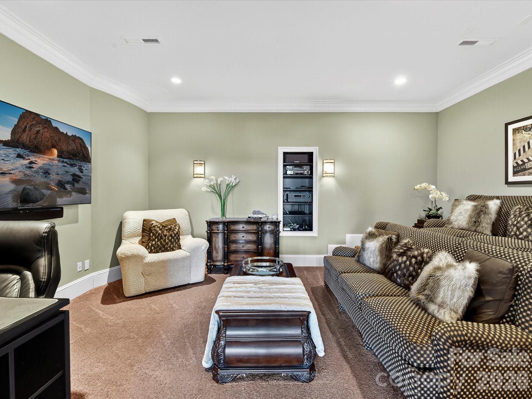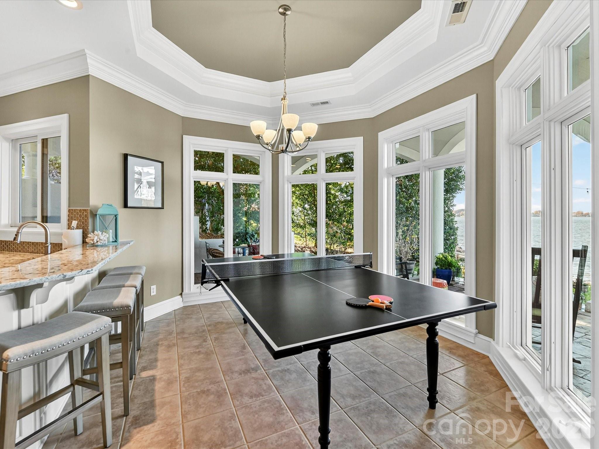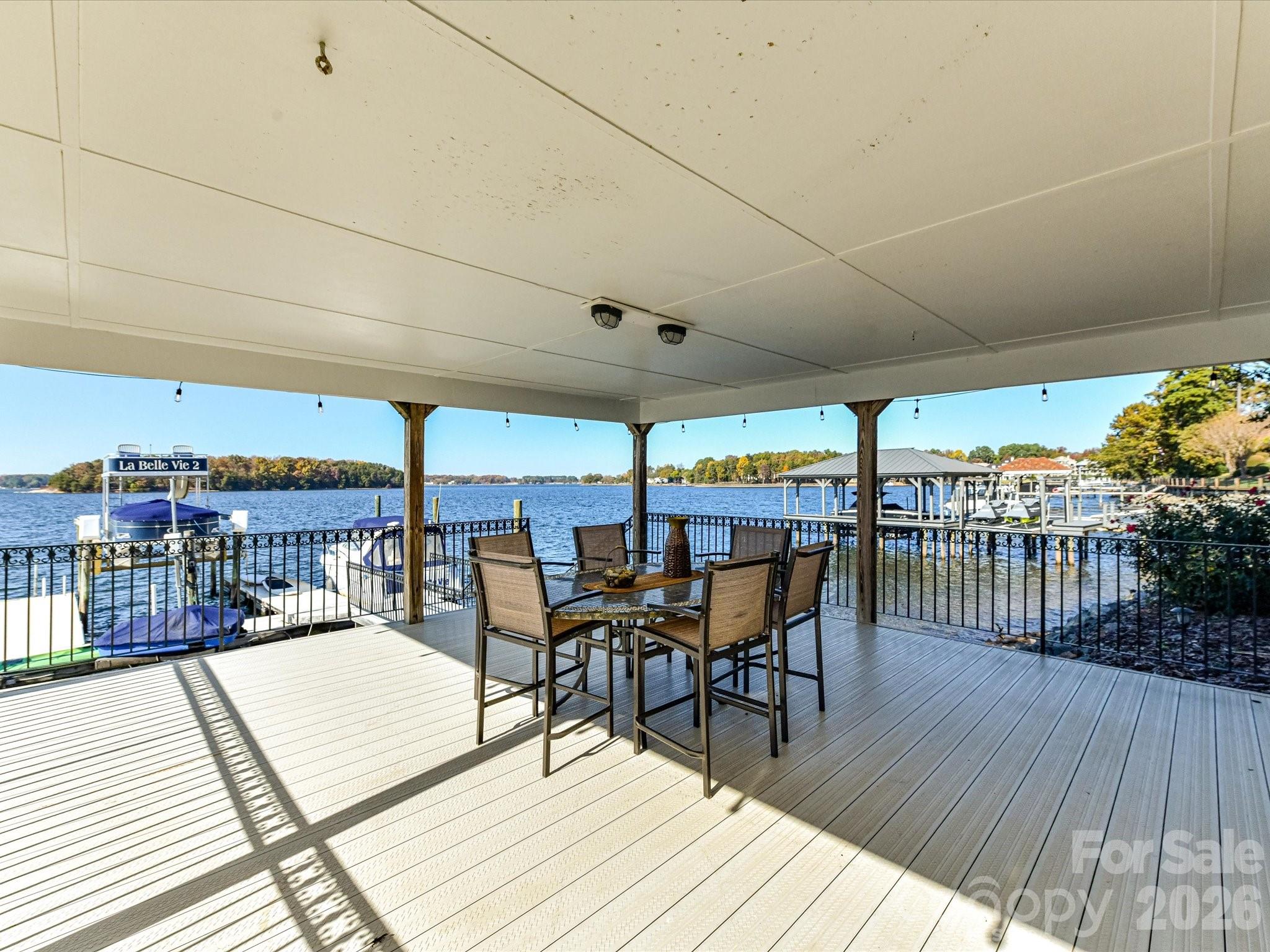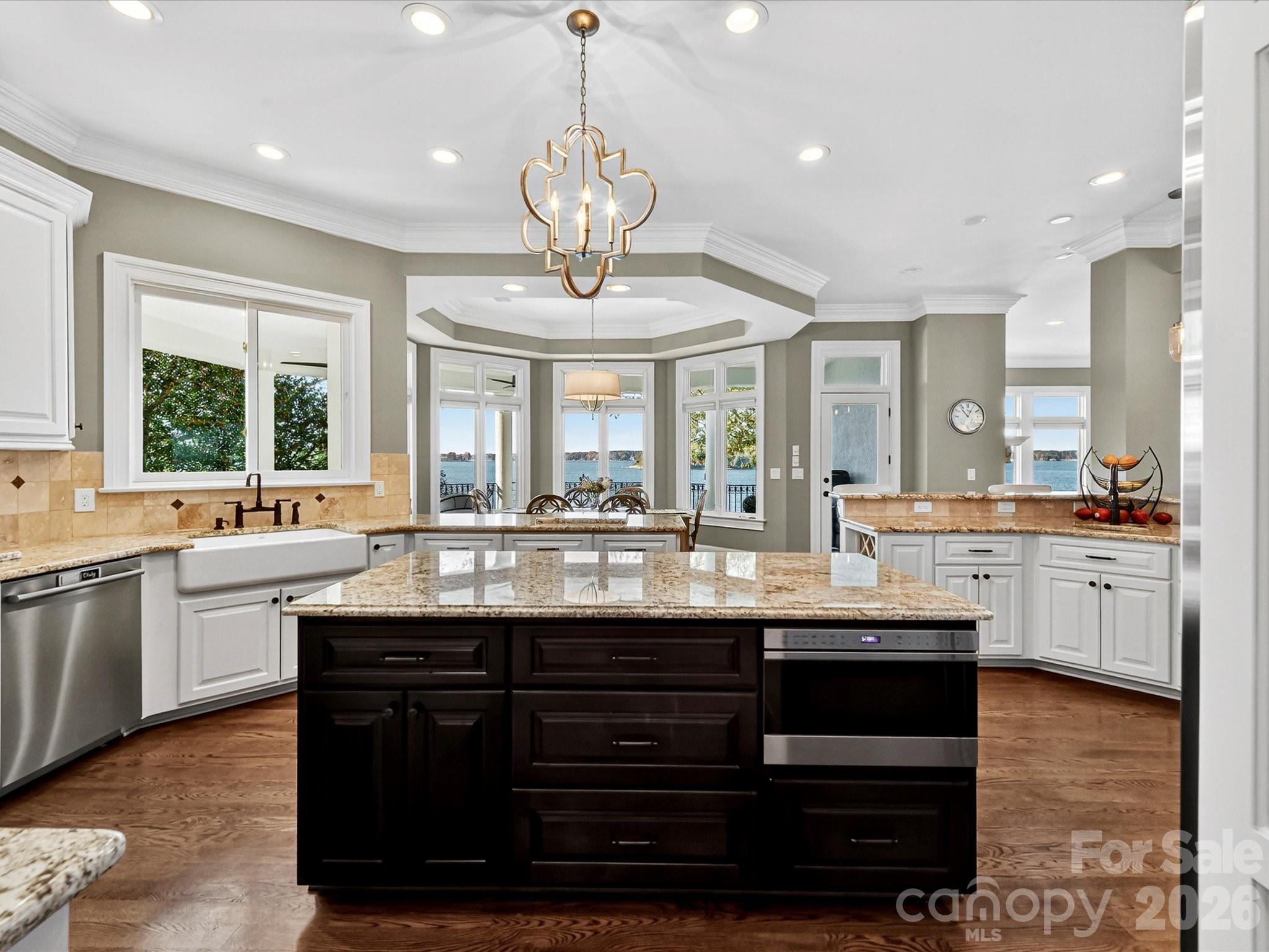 Architecturally distinctive Mediterranean-inspired waterfront estate by renowned builder G.M. Helms, designed in collaboration with architect Christopher Phelps and celebrated interior designer Dina Lowery. Featured on the cover of Charlotte Magazine as an architectural wonder, the residence was recently selected as the filming location for a television commercial, further highlighting its distinctive design. The four-story home is ideally positioned on Lake Norman’s main channel with west-facing exposure and breathtaking sunset views. Designed to be both grand and inviting, the home unfolds through a series of refined yet comfortable living spaces. A dramatic three-story great room anchors the residence, showcasing soaring ceilings, a monumental limestone fireplace, and an expansive wall of lake-facing windows that flood the home with natural light. A striking four-story self-supported circular staircase winds gracefully through all levels, serving as the home’s defining architectural centerpiece. The residence offers approximately 7,400 square feet of living space, including five bedrooms, eight baths, six fireplaces, a Brazilian cherry wood library, media room, billiards room, and an elevator serving the first three levels. Designed with entertaining in mind, the home features a chef’s kitchen on the main level and a full secondary kitchen on the lake level, along with multiple gathering and leisure spaces throughout. The fourth-floor sky lounge with bar provides elevated views of the lake and surrounding islands, creating a unique retreat for entertaining or quiet relaxation. Outdoor living is equally compelling, with three balconies, a Spanish-tiled lakeside gazebo, and a deep-water dock equipped with lifts for two jet skis, a double-decker pontoon, and pilings suitable for a 45-foot yacht. Preliminary HOA approval for a pool has been obtained, offering the opportunity to further enhance the property’s lakeside experience (subject to final Architectural Review Committee approval). Lovingly maintained by only two owners since its 1997 construction, the home has been extensively updated, including renovated kitchens and baths, four HVAC systems, two tankless water heaters, enhanced audiovisual systems, interior and exterior repainting, and refreshed landscaping. A rare offering that seamlessly blends timeless Mediterranean architecture, thoughtful craftsmanship, and premier Lake Norman waterfront living.