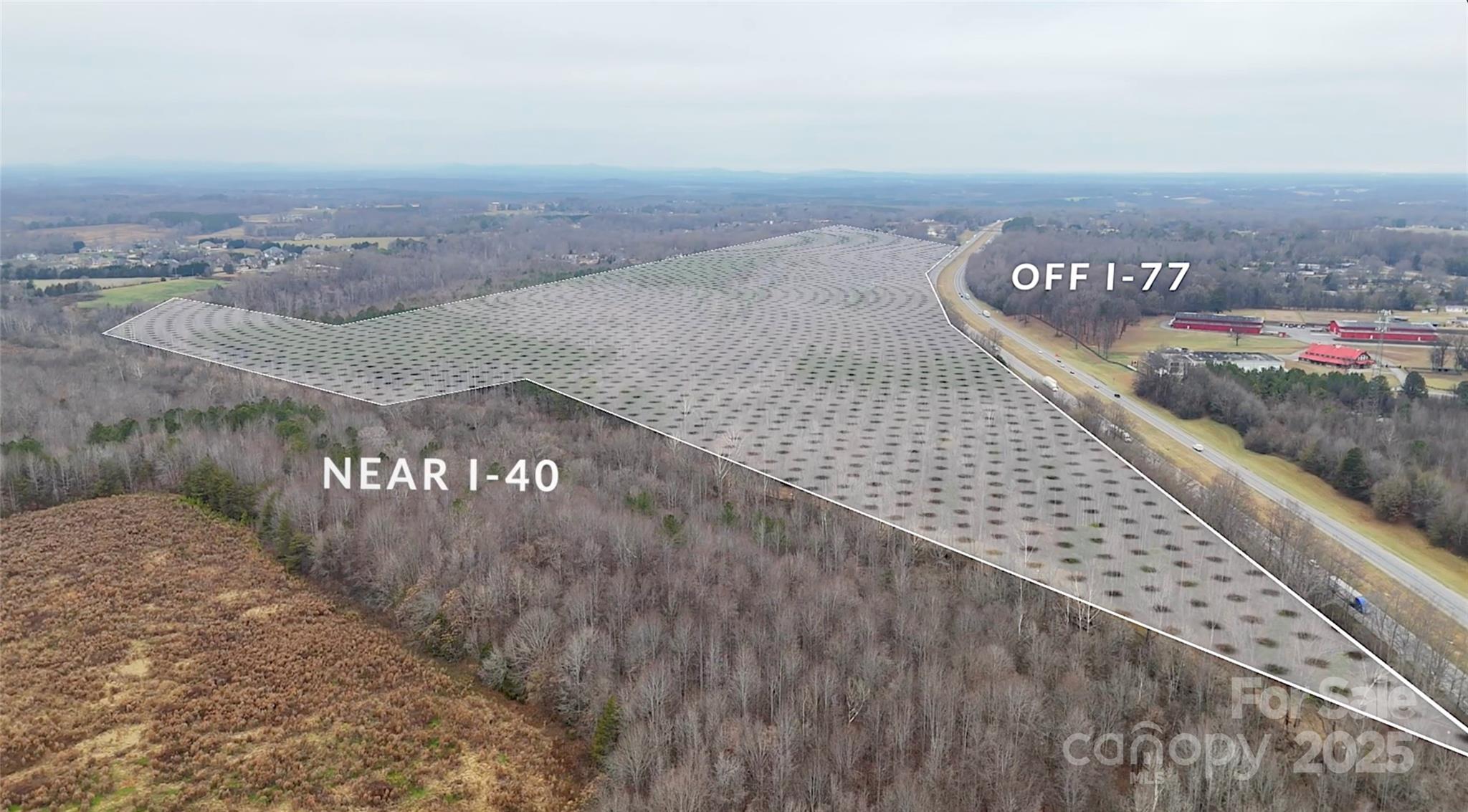 This offering is two separate parcels totaling 96.84 acres. The first track is 94.2 acres (PIN# 34747-72-3118) and the second track is 2.64 acres (PIN# 4747-54-9364). Both tracks are part of a marital trust. There is approximately 4,175 feet of road frontage of I-77 South. The property is just outside Statesville City limits. The lower boundary is through the center of 5th Creek. The track also has a 60 foot access on Whites Farm Rd. The property has the ability to meet a wide variety of needs. Please see our drone footage. Thank you.