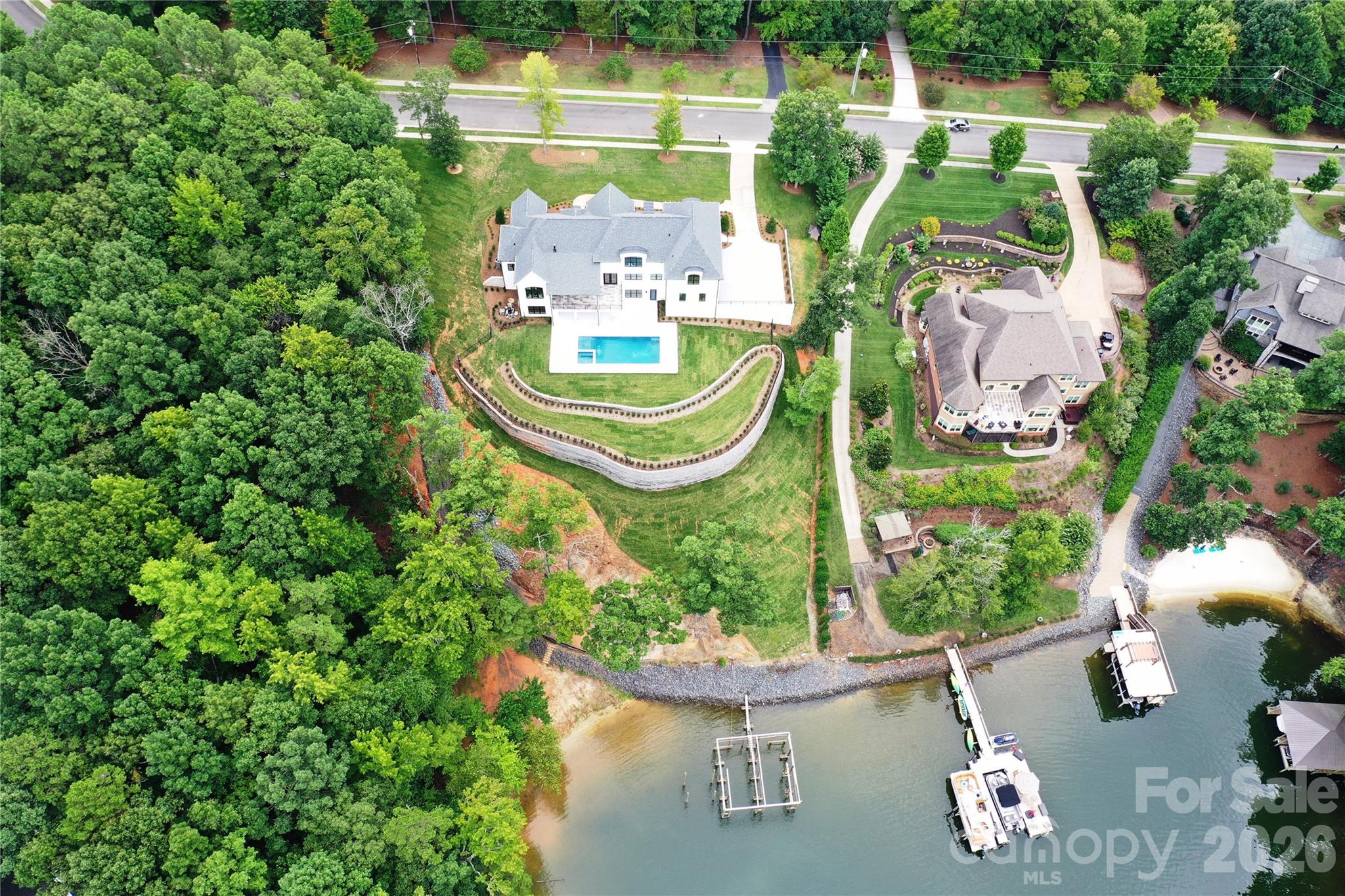 This is an absolutely stunning 6000 sq. ft. new construction home offering everything you would want when in a waterfront oasis. With a premiere location on the Charlotte city side of Lake Wylie this home offers captivating views throughout with beamed and soaring cathedral ceilings and palladium windows to take one's breath away. A fabulous gourmet kitchen has a 60" refrigerator/freezer, 48" Pro series range, gorgeous quartz tops complimented by a fully equipped second chef's prep kitchen for special gatherings and parties. A finished basement offers a 5th bedroom/bathroom, plus a full pool bath, huge rec. room, wet bar and large patio doors opening to a 40 ft. pool and spa set off by the marble patio. Large terraced main level lawns lead to a natural gently slopped stone walkway to the waterfront and boat dock. The nearby Palisades Country Club offers Golf and Tennis memberships for additional recreational activities and access to the city amenities is a breeze.