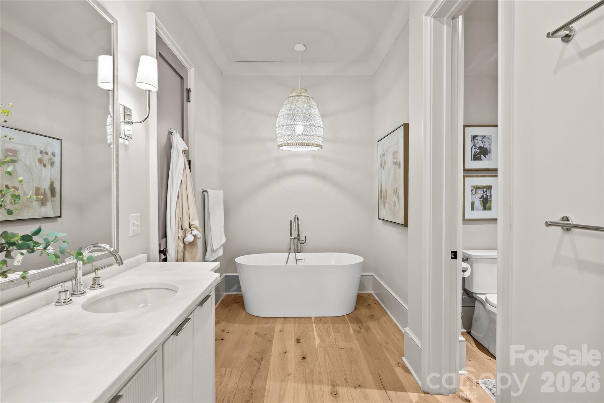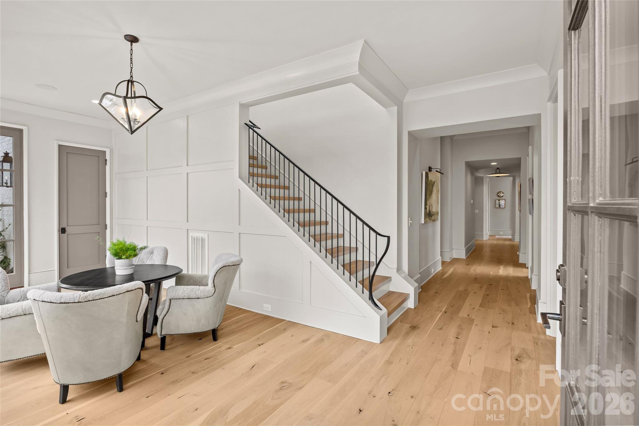Stunning custom home built in 2022 by Knight Residential Group, ideally situated in the heart of highly sought-after Eastover. Offering nearly 6,000 square feet of refined living space, this 5 bedroom, 5.5 bath residence showcases elevated designer finishes, 10’+ ceilings, white oak flooring and exceptional attention to detail throughout. The main-level primary suite features dual custom walk-in closets and a spa-like bath with soaking tub, oversized steam shower, and marble surfaces. The chef’s kitchen features custom cabinetry, quartzite countertops and backsplash, SubZero and Wolf appliances, and an adjacent scullery—perfect for entertaining. Kitchen opens seamlessly to the family room with cozy cast stone fireplace and sunny dining area. Additional highlights include the front gallery/foyer, private office, built-in bar, and functional mudroom. The second level offers 3 generous bedrooms with en-suite baths, loft workspace, playroom, and expansive laundry. The third level provides flexible bonus, fitness, and guest spaces plus a full bath. Outdoors, enjoy the covered rear patio equipped with in-ceiling heaters and wood-burning fireplace overlooking the flat, manicured yard. Detached garage provides wonderful additional storage. Just minutes to Uptown and SouthPark, this home delivers luxury, comfort, and convenience in one of Charlotte’s most coveted neighborhoods.