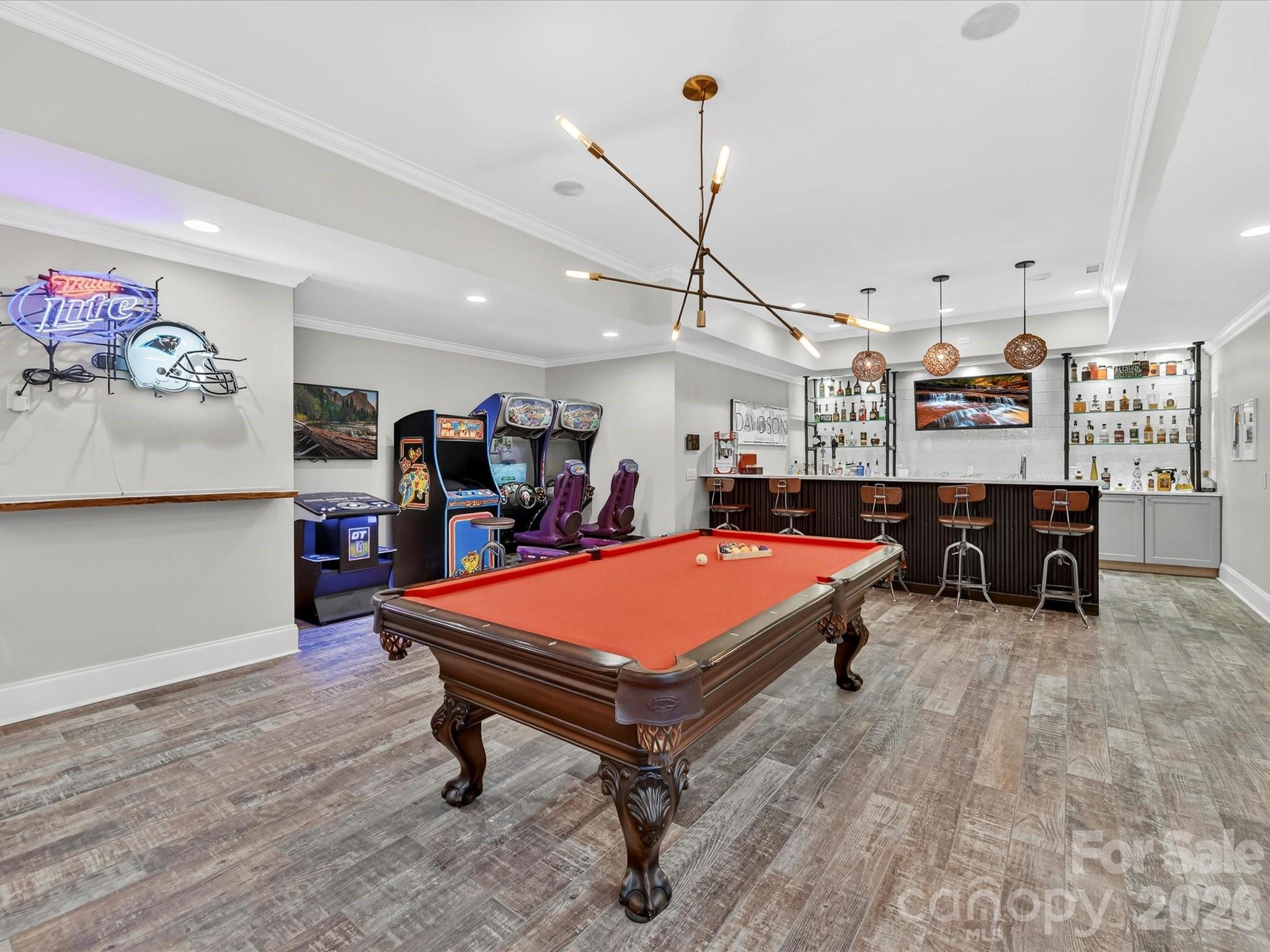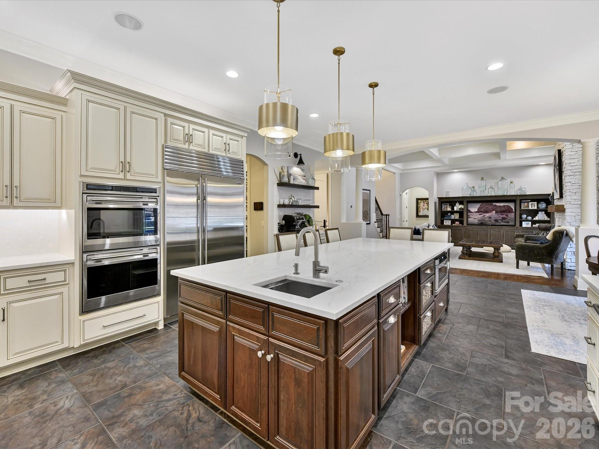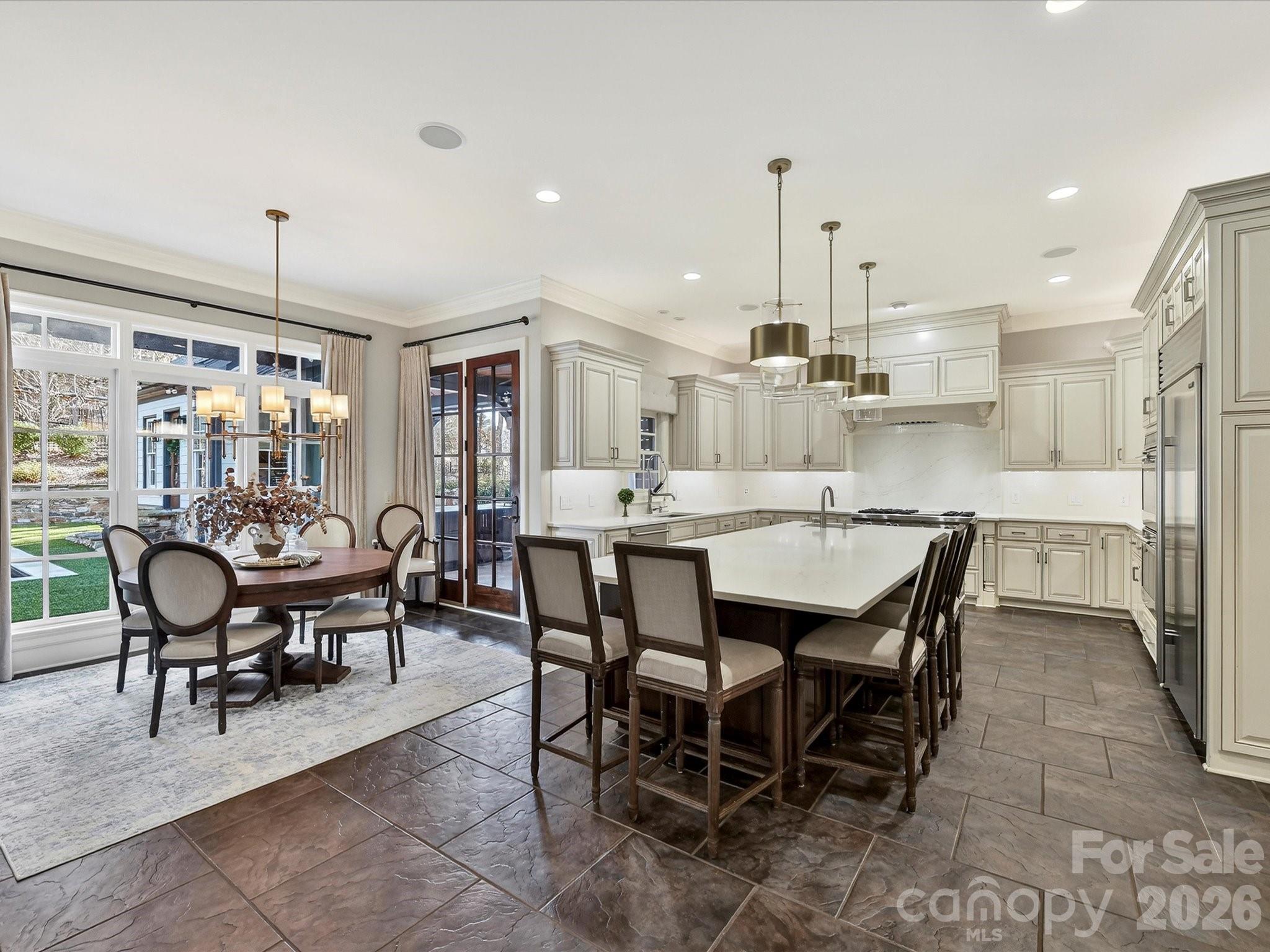 Welcome to 18624 Silent Falls Cove, a refined private estate where thoughtful design, modern technology, and resort-style living converge in quiet elegance. Set gracefully at the end of a cul-de-sac, this exceptional residence offers a rare sense of privacy while remaining effortlessly connected to everyday living and entertaining. The home unfolds with intention, offering five bedrooms, five full bathrooms, two half baths, and a beautifully appointed detached casita suite—a private one-bedroom retreat with full bath, ideal for guests, multigenerational living, or a secluded office or studio. At the heart of the home, the kitchen is both striking and highly functional, designed for those who appreciate form as much as function. Professional-grade Sub-Zero appliances, including a statement Wolf gas range with custom hood, built-in oversized refrigerator, double wall ovens, and integrated refrigeration drawers, are complemented by custom cabinetry and a substantial island topped in white quartz. Layered lighting creates a warm, inviting atmosphere as the space flows seamlessly into the great room, where deep coffered ceilings and a white stone fireplace anchor the home’s primary gathering space. A formal dining room nearby offers a timeless setting for intimate dinners and larger celebrations alike. The main-level primary suite is a serene sanctuary, defined by architectural detailing and a spa-inspired bath designed for daily indulgence. Heated floors, a generous soaking tub, an oversized fully tiled shower, and dual vanities with floor-to-ceiling custom cabinetry are crowned by a beautifully detailed tray ceiling accented with designer wallpaper and chandelier. Expansive his-and-her walk-in closets complete this exceptional retreat. Upstairs, the home continues to impress with three additional bedrooms, each with its own full bath, thoughtfully integrated study and workspaces ideal for modern living, and abundant walk-in attic storage, including a space offering future expansion potential. Designed for elevated entertaining, the lower level offers a sophisticated extension of the home’s living spaces. A custom craft cocktail bar with seating for six, complete with kegerator, ice maker, beverage cooler, and additional XO refrigerator, sets the stage for memorable evenings. A dedicated wine cellar, shuffleboard area (table conveys), theater or fitness room, private guest suite, and walk-out flex space provide exceptional versatility. Outdoors, the estate unfolds as a private sanctuary designed for both effortless entertaining and everyday retreat. The resort-style heated saltwater pool and spa anchor the setting, framed by multiple covered and open-air living areas that invite lingering conversations and relaxed afternoons. An outdoor chef’s kitchen with XO Fridge with an expansive bar for dining, entertaining, and gathering—creates a natural hub for hosting, while the adjacent covered lounge with stone fireplace and pergola seating area offers a welcoming place to unwind, all overlooking the shimmering pool below. Just beyond, the detached casita stands as a destination unto itself—a beautifully appointed one-bedroom, one-bath retreat featuring a stunning tiled shower and a warm, inviting ambiance that feels both luxurious and comfortably home. Thoughtfully layered spaces, from the turfed lawn to garden beds and greenhouse, complete an outdoor environment that feels curated, intentional, and truly exceptional. Set on approximately 0.51 acres, offering 6,288 square feet, and located within the highly sought-after "A" Rated Davidson Elementary and Hough High School district, 18624 Silent Falls Cove presents a rare opportunity to own a home defined by balance—luxury without excess, sophistication without pretense, and spaces designed to be truly lived in. Priced to sell quickly!