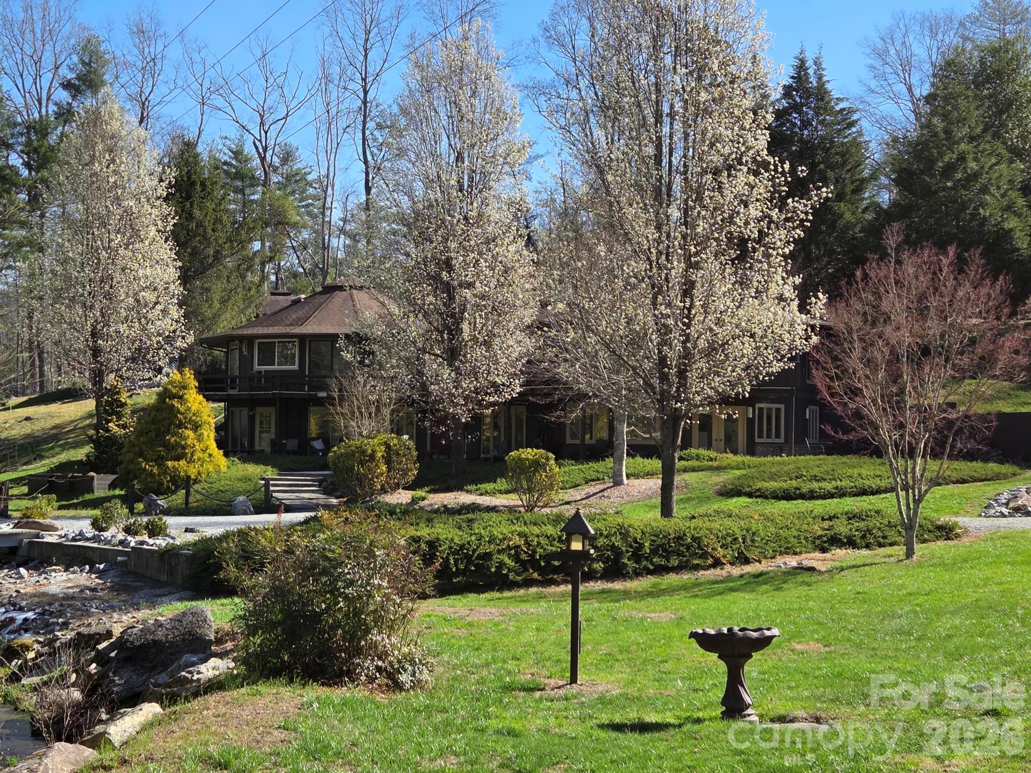 Distinctive double Deltec home featuring a custom-designed connection between the two structures, offering expansive, multifaceted views in a park-like setting on a 3+ acre lot. Featherstone Mill Creek meanders along the rear property line and is a year-round creek, providing a peaceful natural backdrop. The front entry welcomes you with a charming Japanese garden accented by decorative post-and-chain fencing. Many of the rooms are designed for flexible, multipurpose use. The main (upper) level includes the kitchen, dining area, living room, two guest bedrooms, a full bath, and a half bath. The kitchen offers generous solid-surface counter space, stainless steel appliances, and a pantry, along with ample room for both a sitting area and breakfast nook. Dining area wall are pecky fir. Living room walls are pecky cyprus. Wet bar in LR and fireplace. Skylights in dining area. Upper deck along back of house wraps partially around and has an awning over a portion. Spiral staircase to lower level off deck. The lower entrance level features a spacious primary suite with split his-and-hers walk-in closets and a well-appointed bath with double sinks, an extra-long vanity, a deep garden tub, and a separate tiled shower. The connecting area provides versatile flex space ideal for a fitness room, study, or recreation area. It has 3 closets for storage. An additional private guest suite with an en-suite bath and a den with a woodstove, utility/mechanical room is partially unfnished and not included in sq ft. Tons of parking, circle drive on upper level and large parking lot on lower. This truly one-of-a-kind home has been owned by the same family, along with the surrounding property, for over 200 years. What a charming possible Airbnb setting. Please give 24 hour notice for showings.