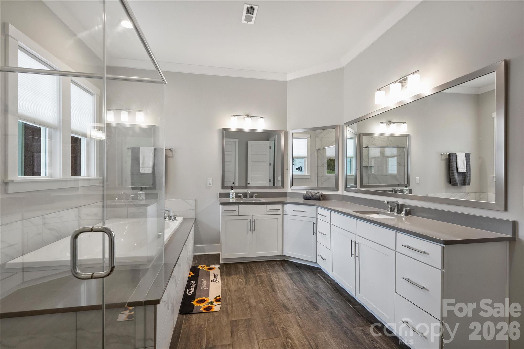 Welcome to this exceptional 2022-built residence in the serene Hollins Grove community, a quiet, tucked-away neighborhood of recently-built beautiful homes. Situated on a premium .41-acre lot backing to serene woods, this home offers a private, resort-like outdoor retreat perfect for spring and summer entertaining. Inside, soaring 10 ft ceilings on the main level and energy-efficient windows flood the home with natural light, creating an open and airy ambiance. The designer chef’s kitchen is a true showpiece, featuring a dramatic 10 ft island, soft-close cabinetry, quartz countertops, and top-of-the-line stainless steel appliances. The first-floor primary suite is a luxurious haven with dual walk-in closets and a spa-inspired en-suite showcasing upgraded finishes. Upstairs, discover 3 spacious bedrooms, 2 full bathrooms, and a versatile bonus room. Outside, your covered patio with fireplace overlooks the fenced and professionally landscaped yard with irrigation — ideal for outdoor living as the weather warms. Additional upgrades include a tankless water heater and more. Don’t miss this opportunity!